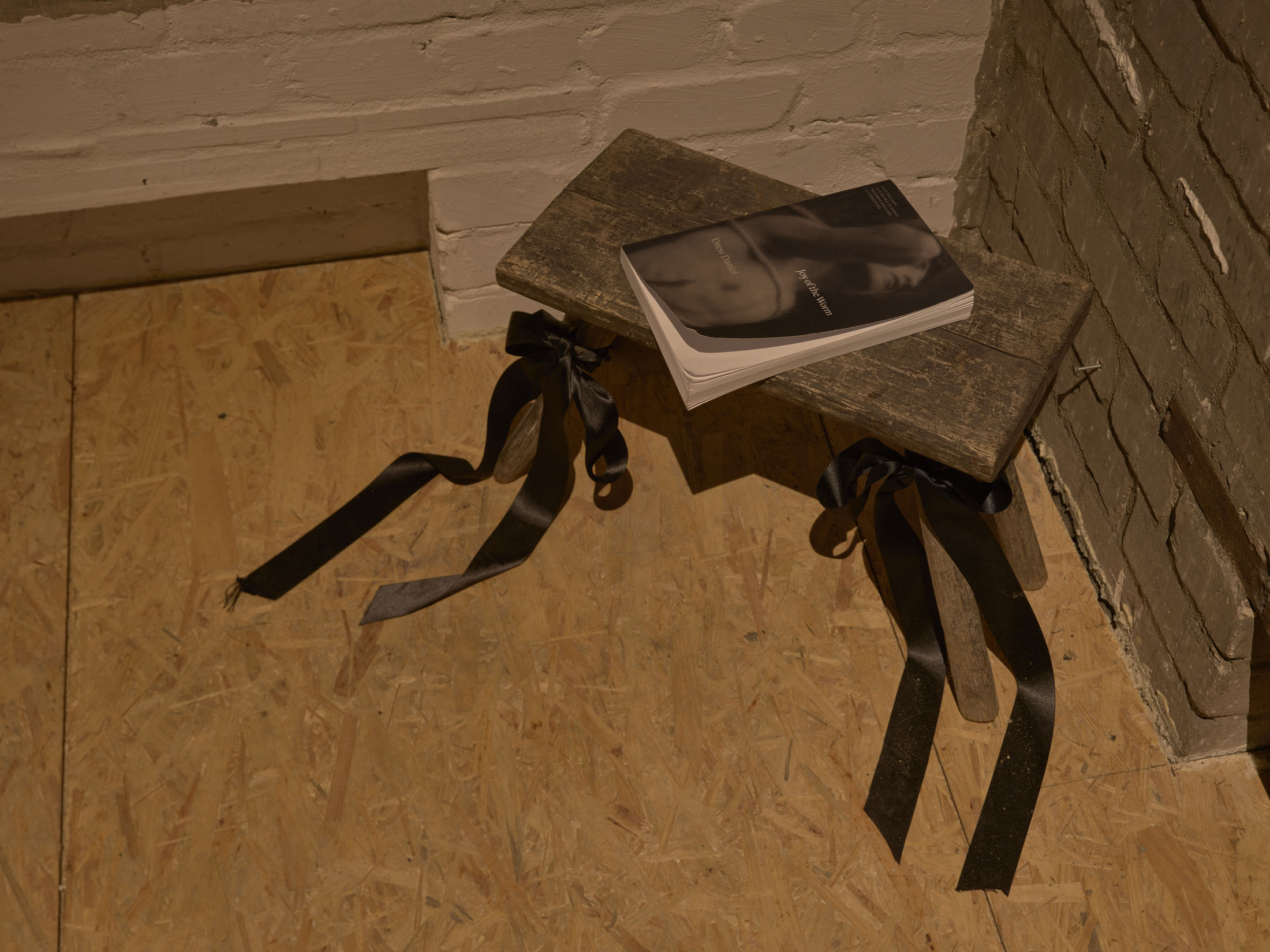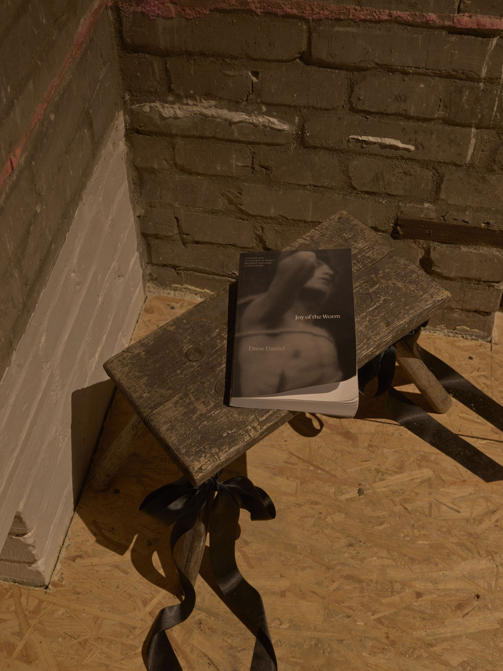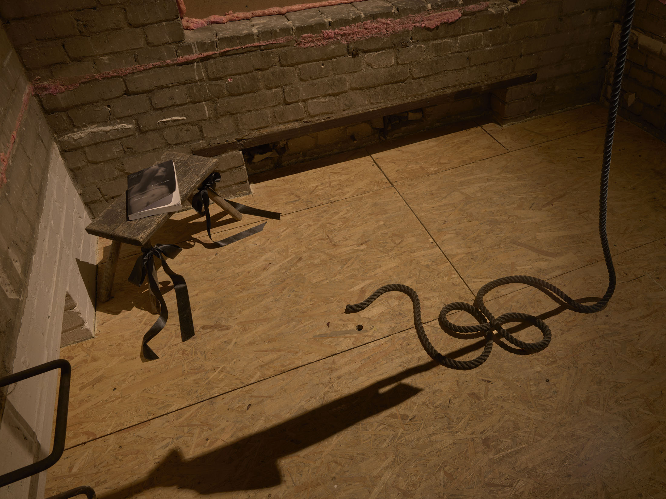 Picking up on previous works that examine the disappearance of grief and death from quotidian life, Youden has created a psychogeography of self-killing as a deliberate choice. Presented alongside a black rope adorned with pink ribbons hanging from above sits an old wooden stool with a weathered copy of Joy of the Worm, in which Drew Daniel examines modern literary approaches to suicide as self-killing that go beyond a ”generic mode of tragedy.” The author notes that positive and even comedic affects at the prospect of death might “help to ease one’s passage out of life; (…) or might function therapeutically to critique the urge to die, encouraging readers and audiences to reconsider the force of passion.” In a similar vein, Youden utilizes an endearing form of camp to reclaim the subject matter from the oppressive shame imposed on it by religious and medical moralism. Here, too, taboo is challenged with the help of cuteness, bows and all.