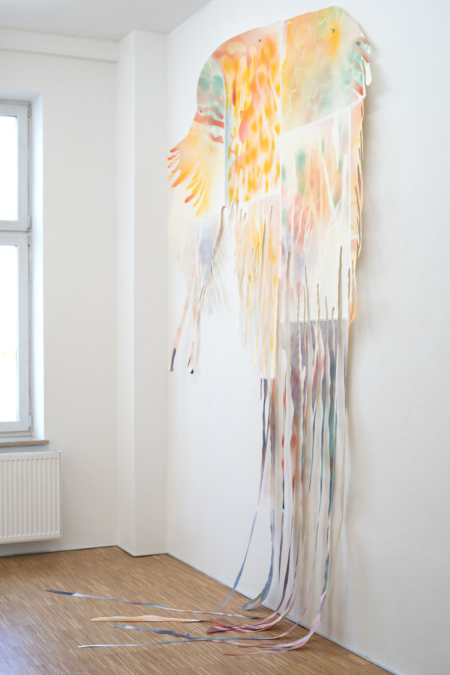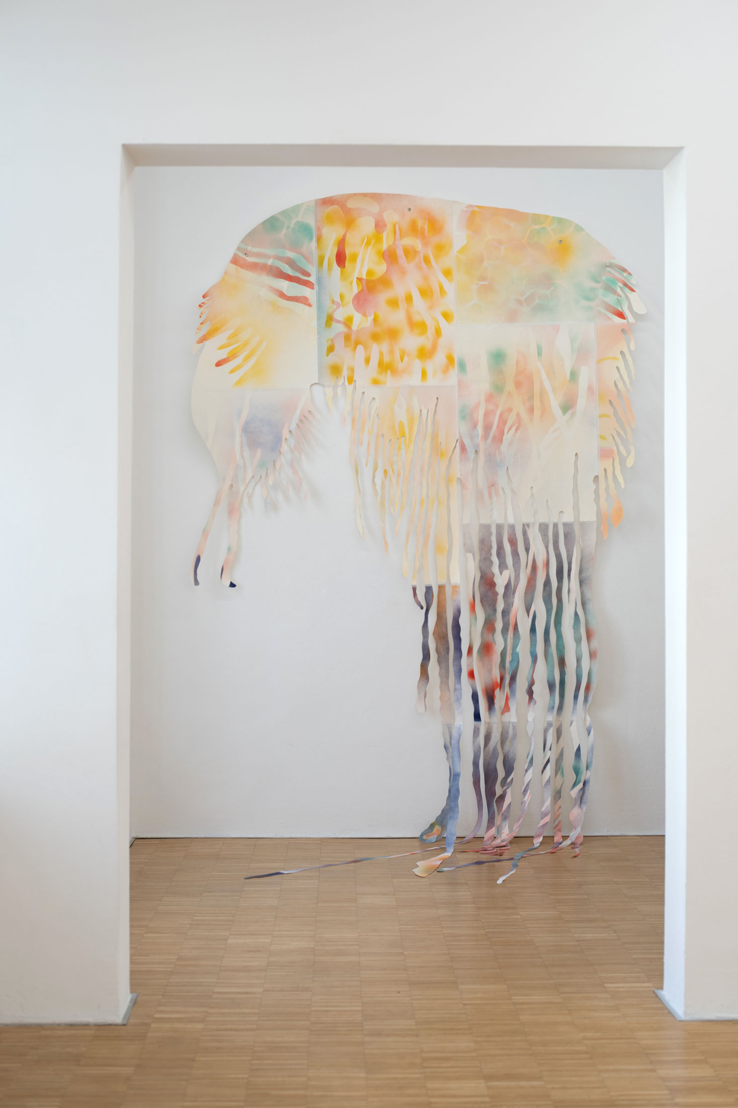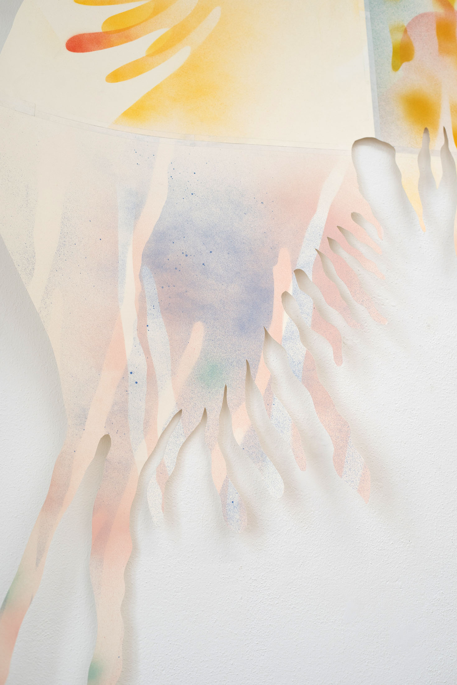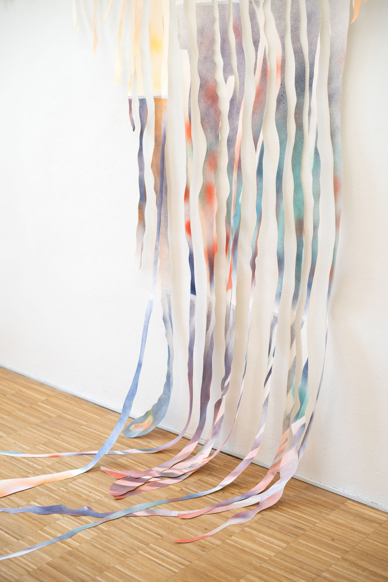 Lea Grebe, Hybrid, Paper, acryl spray, band, metall eyelets, 380 × 250 cm, 2025