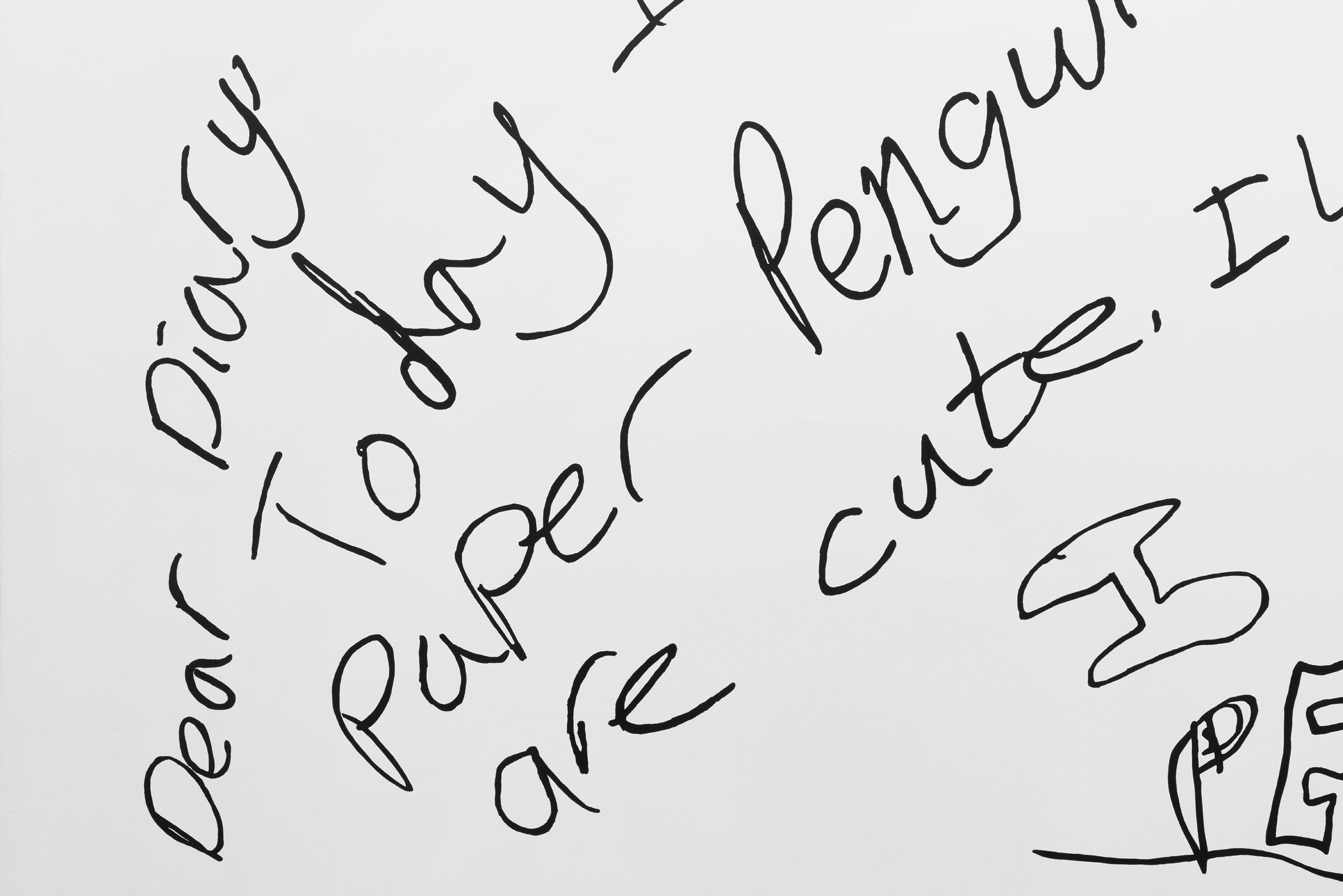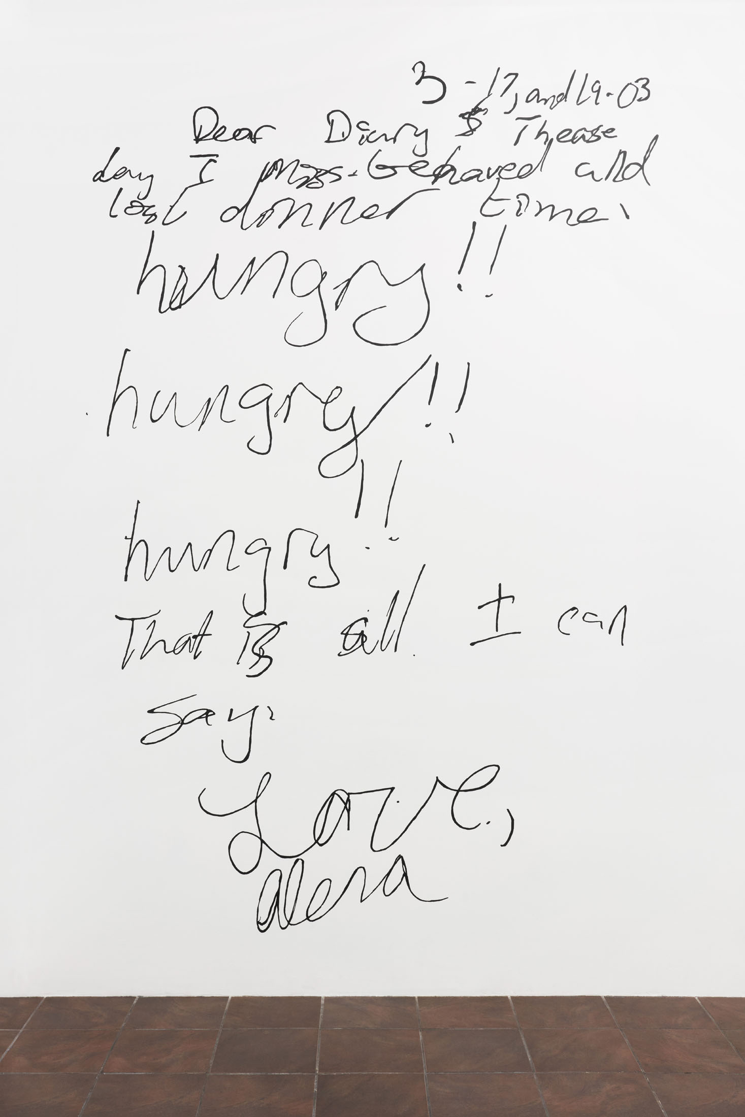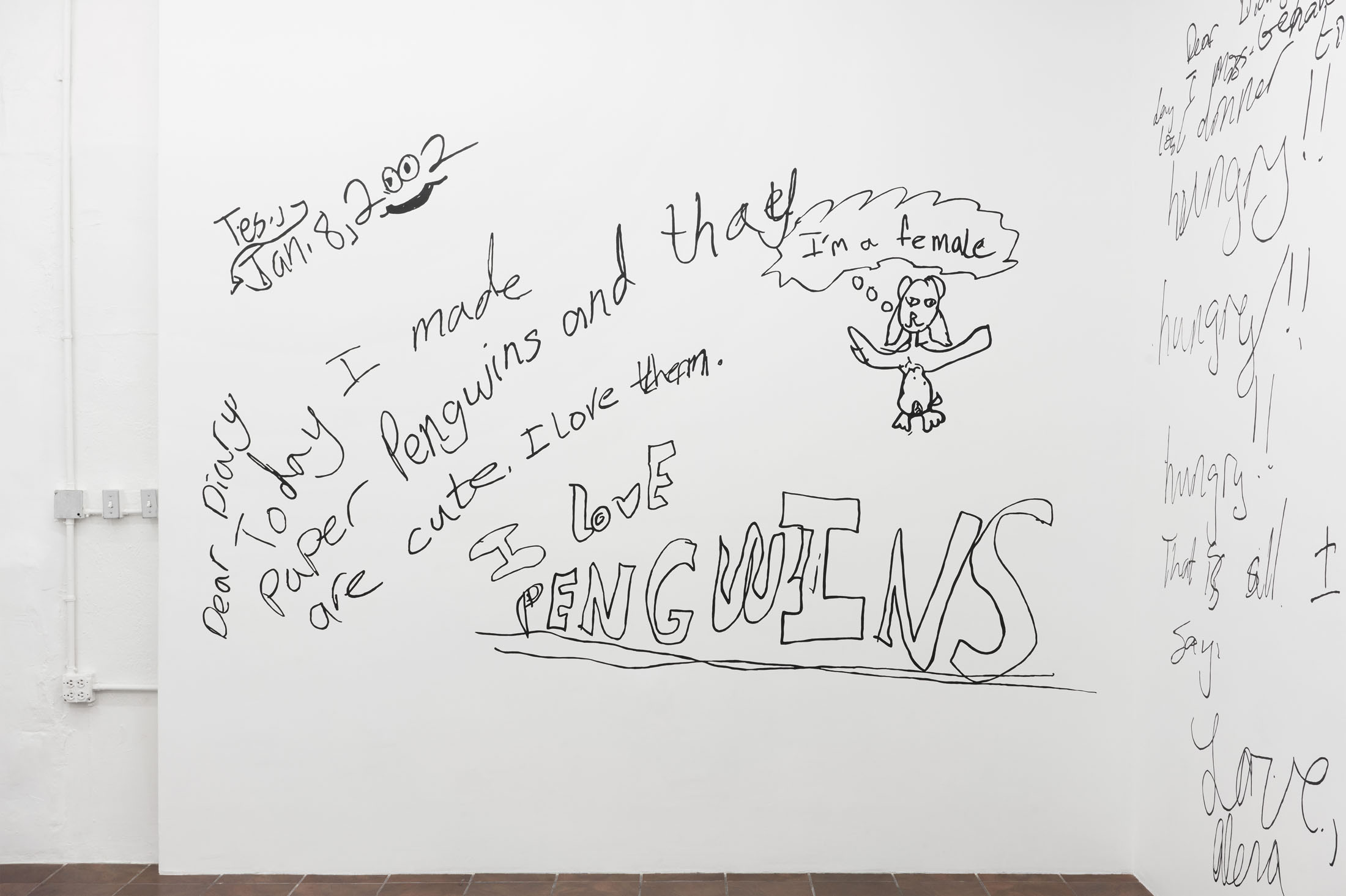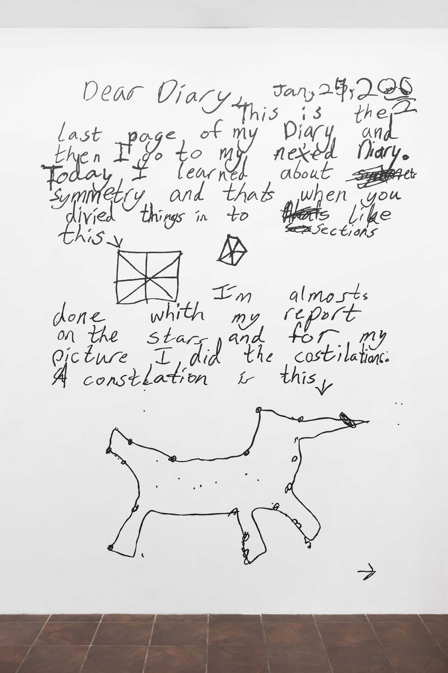 Alexa Almany’s Love, alexa is a series of wall drawings composed of the artist’s childhood diary entries between 2000 and 2003. In these works, Almany meticulously mimics her early penmanship, staying true to the immature dexterity in the original entries while scaling them up to span from floor-to-ceiling. The text itself is simultaneously sincere and humorous – reflecting on awkward childhood encounters with adult rules and categories.