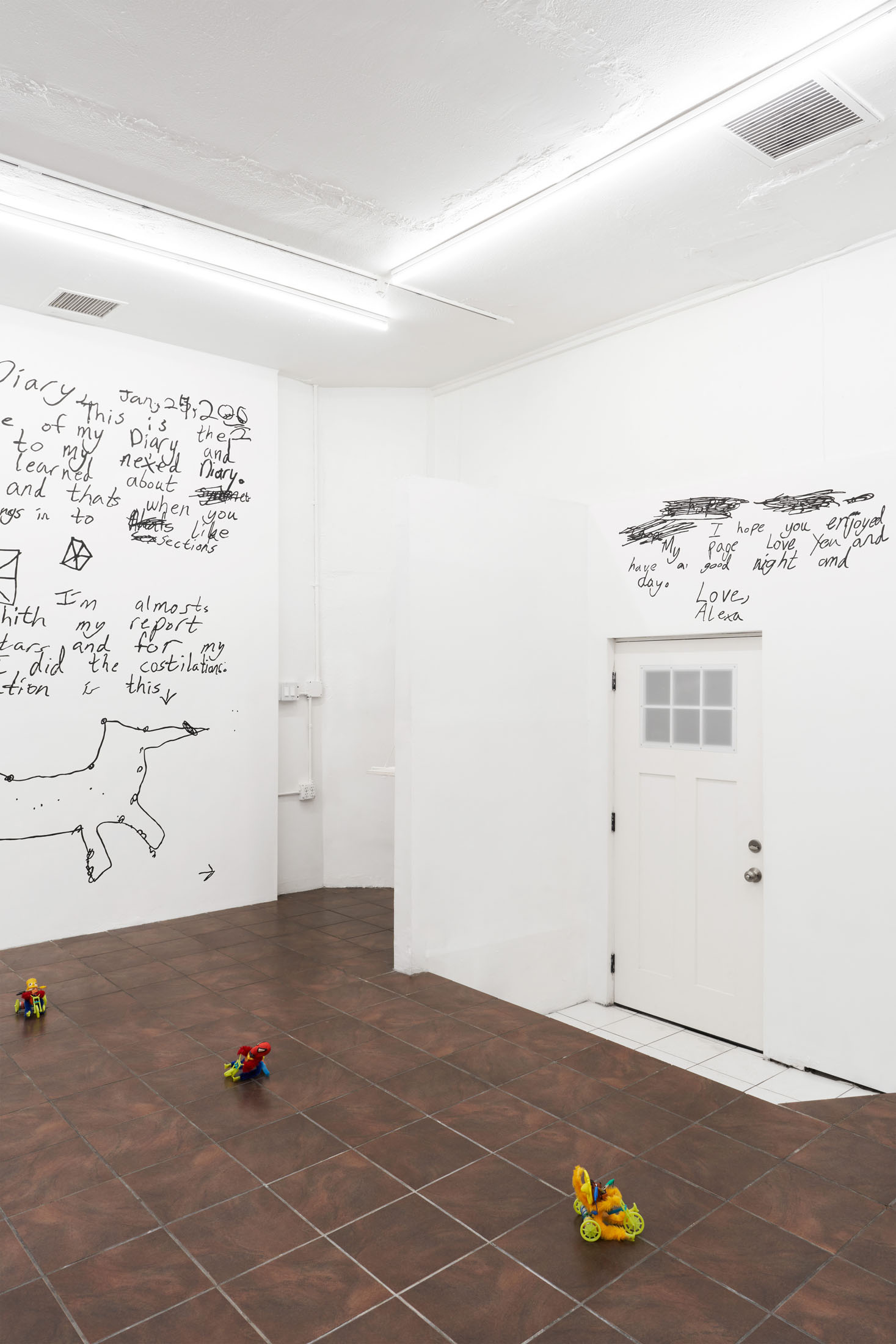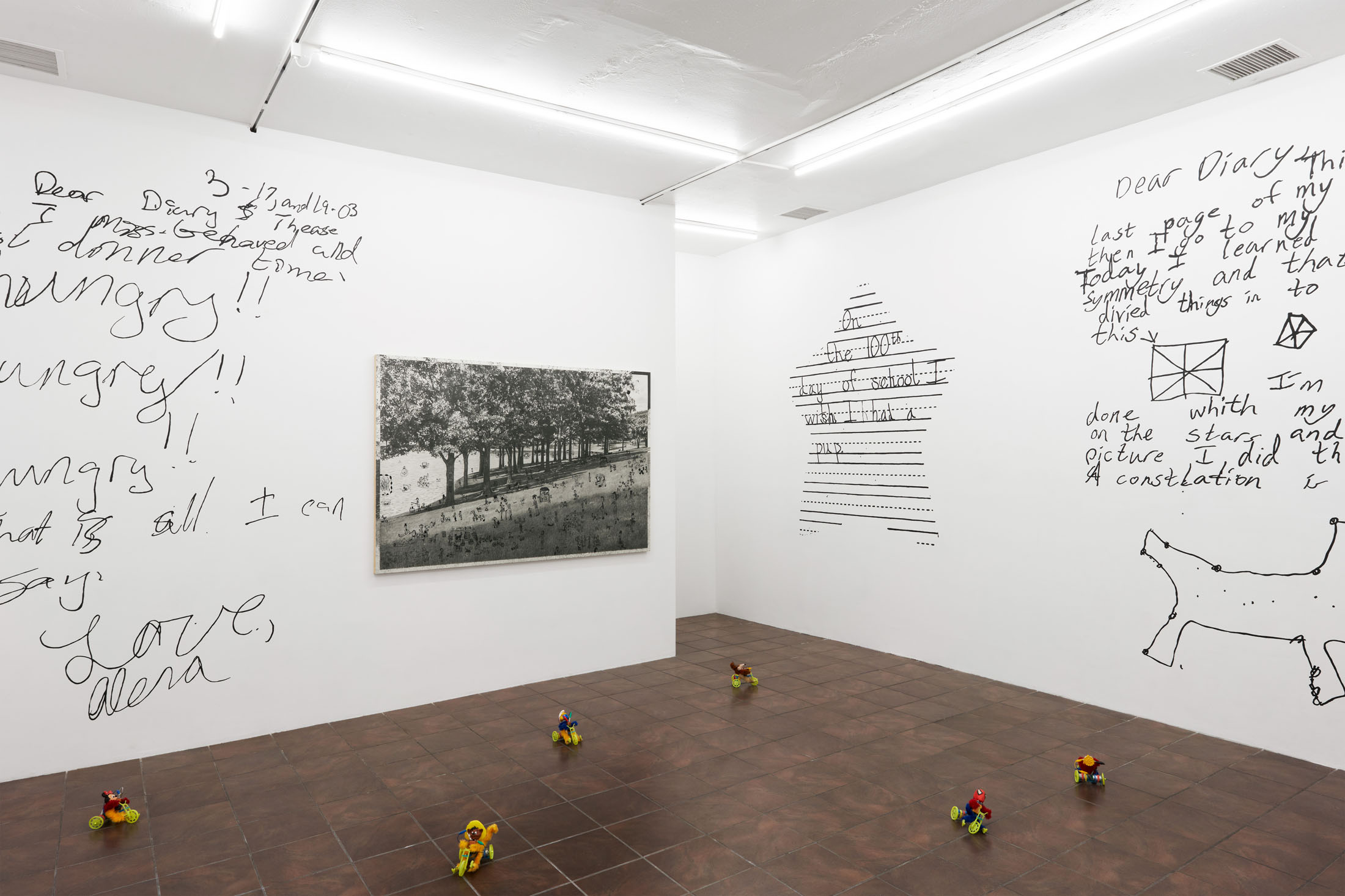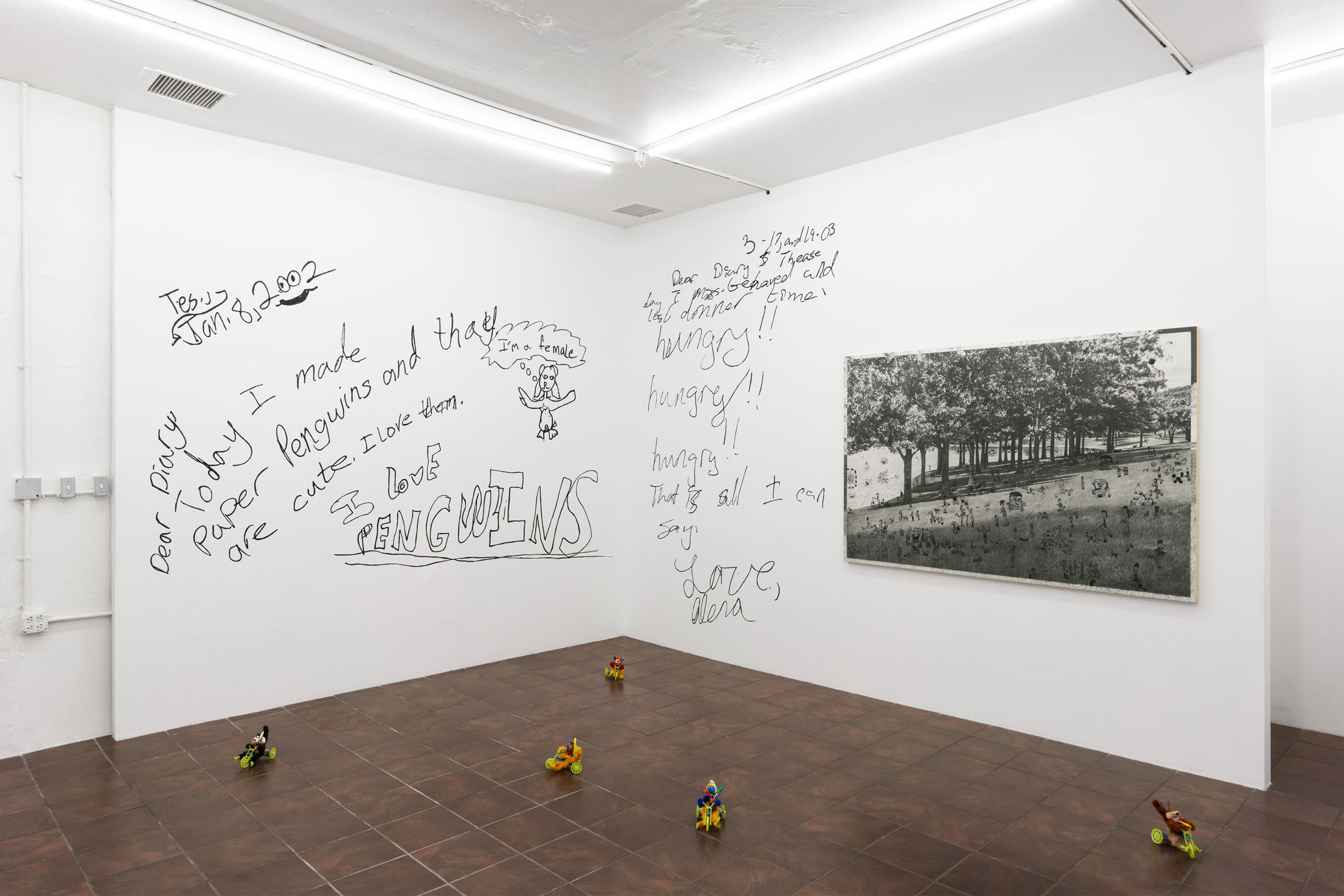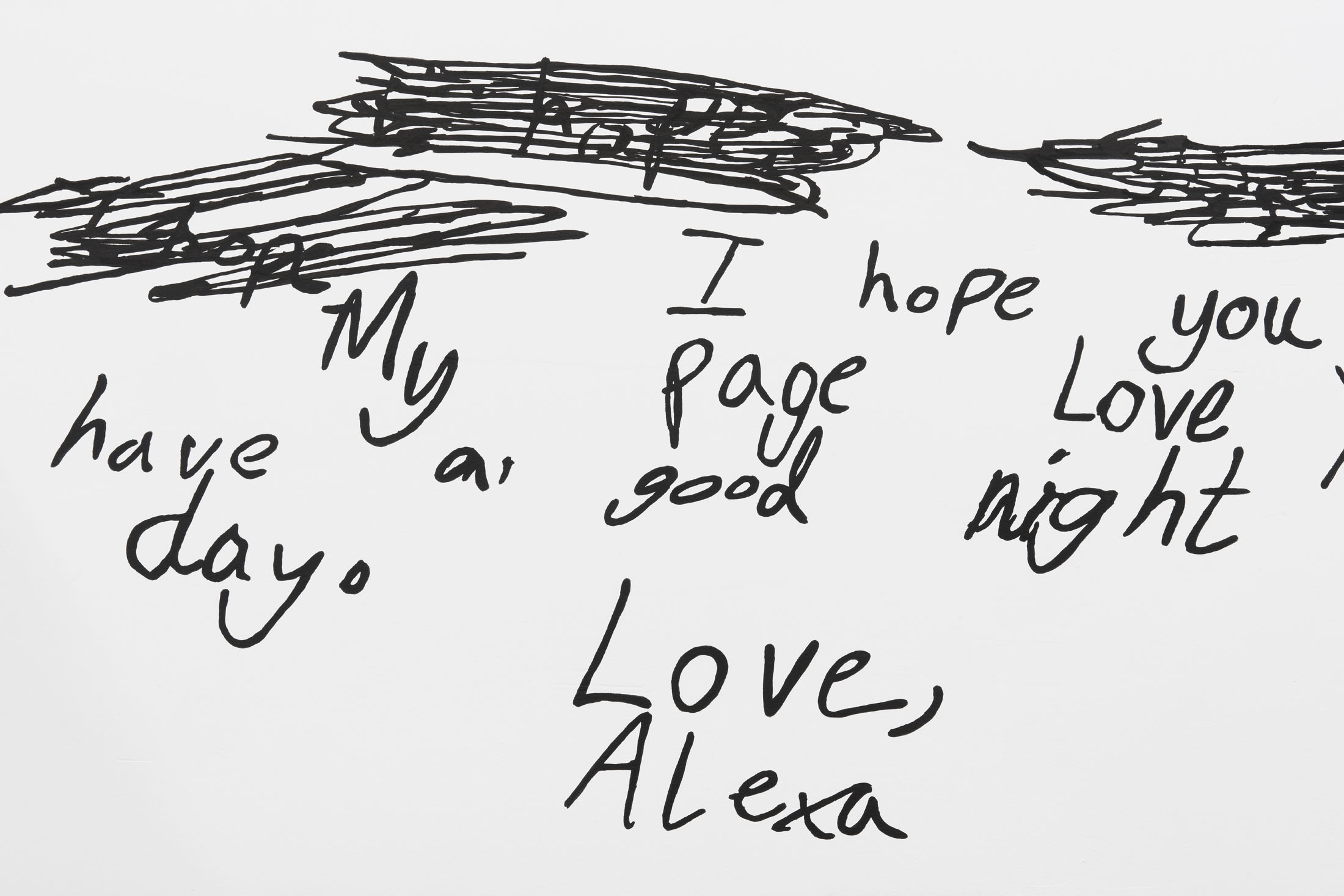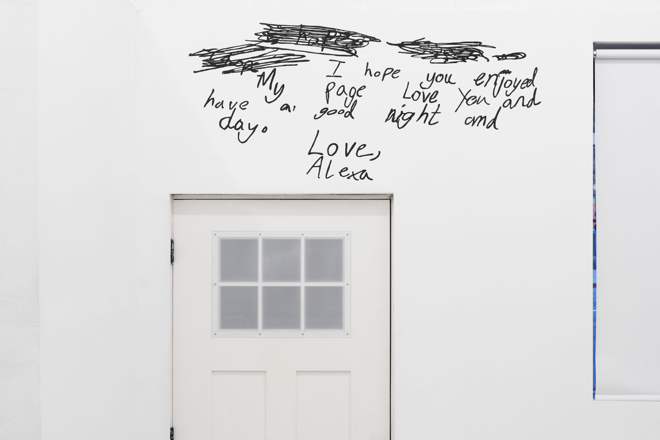 Alexa Almany’s Love, alexa is a series of wall drawings composed of the artist’s childhood diary entries between 2000 and 2003. In these works, Almany meticulously mimics her early penmanship, staying true to the immature dexterity in the original entries while scaling them up to span from floor-to-ceiling. The text itself is simultaneously sincere and humorous – reflecting on awkward childhood encounters with adult rules and categories.