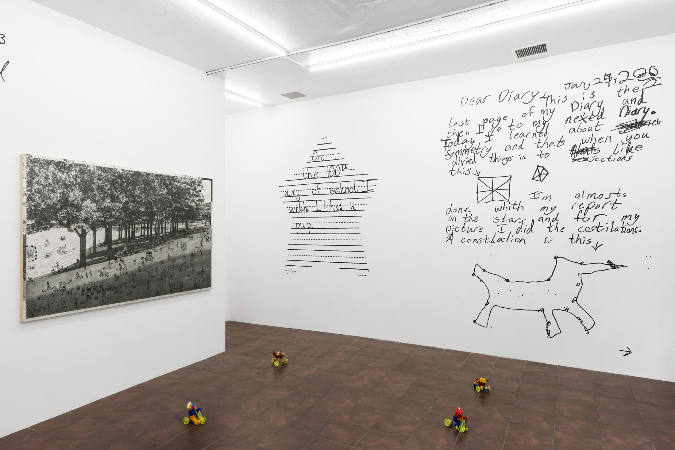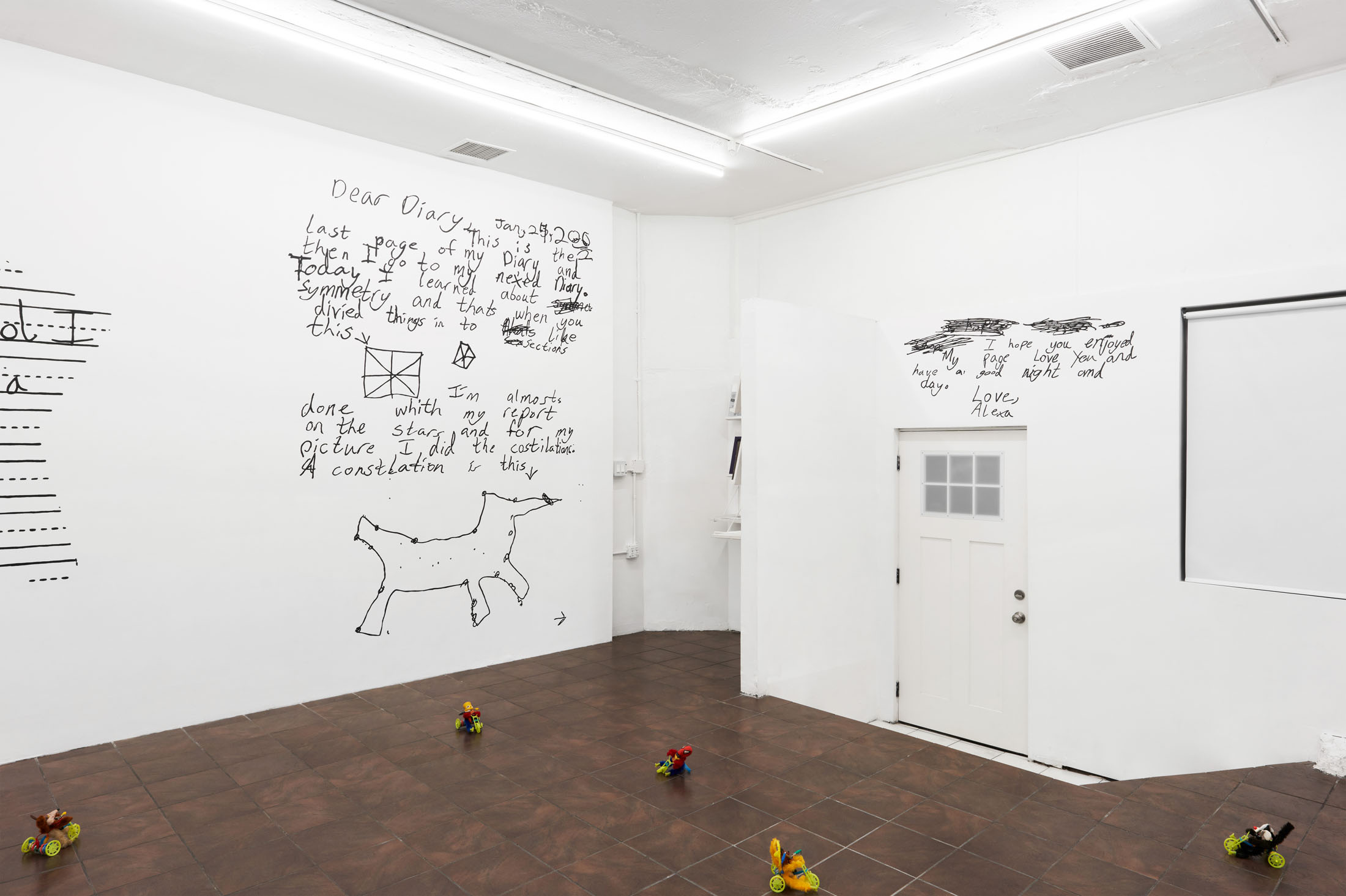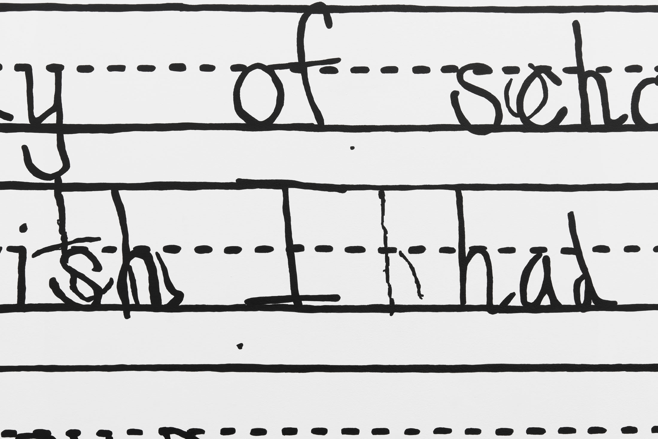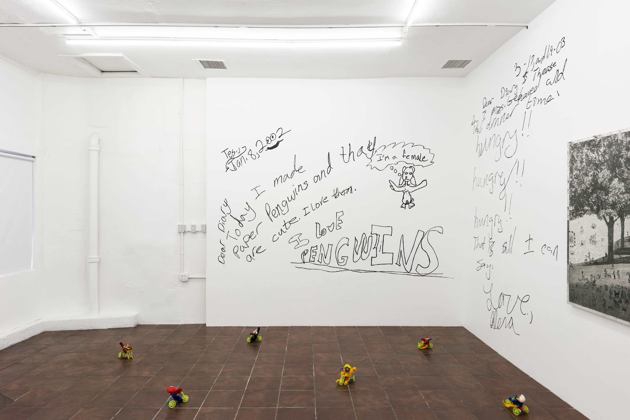 Alexa Almany’s Love, alexa is a series of wall drawings composed of the artist’s childhood diary entries between 2000 and 2003. In these works, Almany meticulously mimics her early penmanship, staying true to the immature dexterity in the original entries while scaling them up to span from floor-to-ceiling. The text itself is simultaneously sincere and humorous – reflecting on awkward childhood encounters with adult rules and categories.
