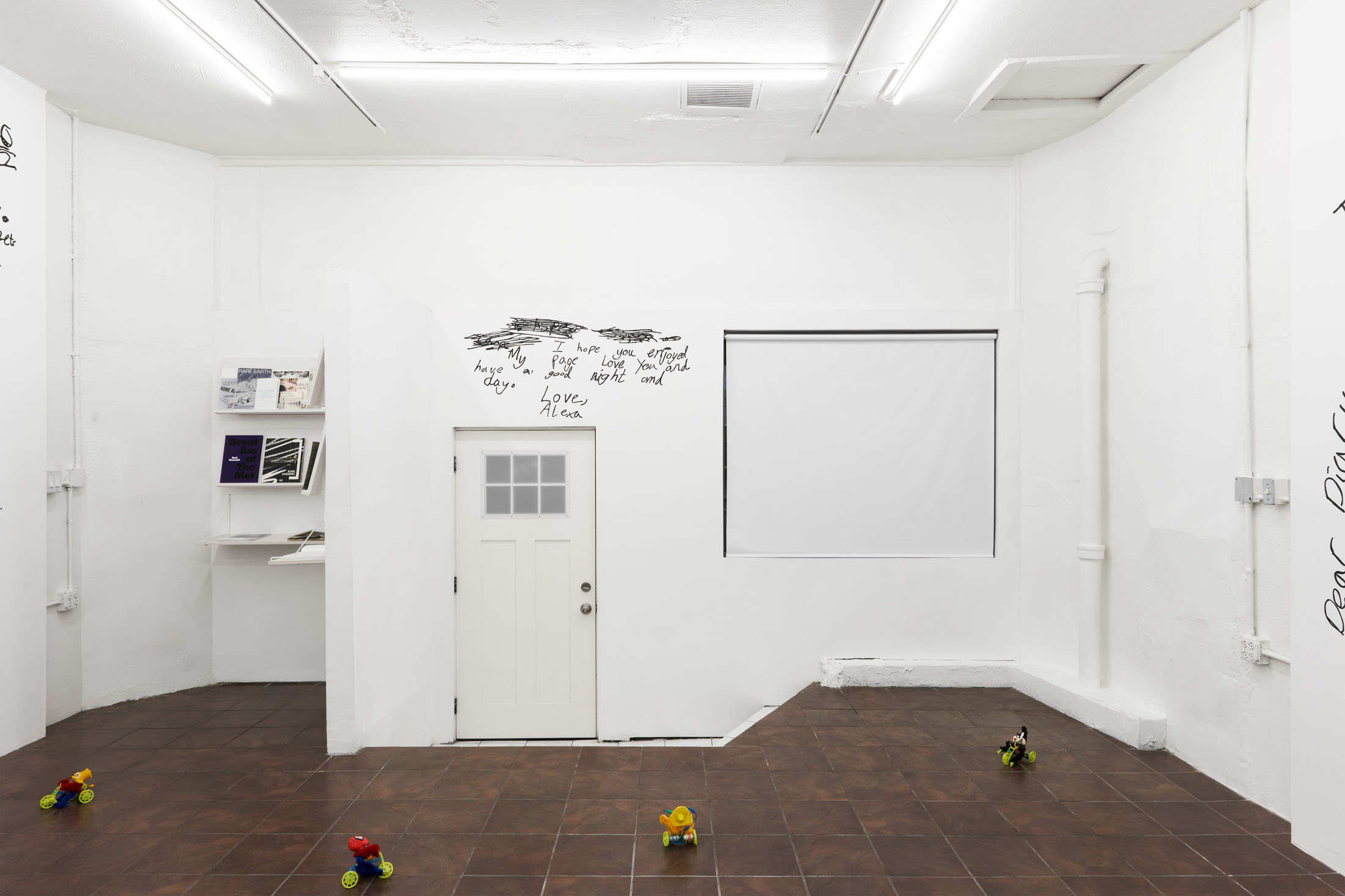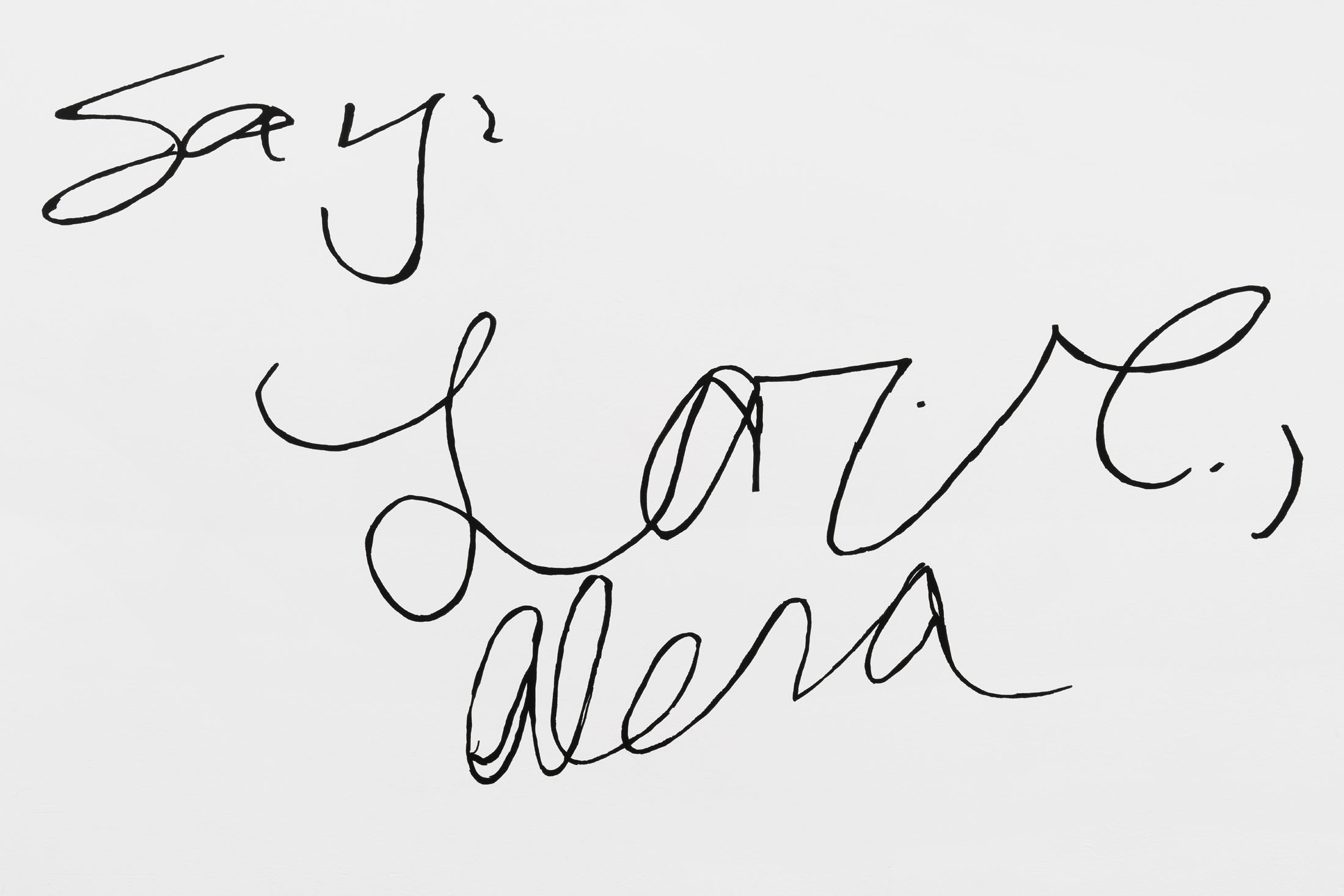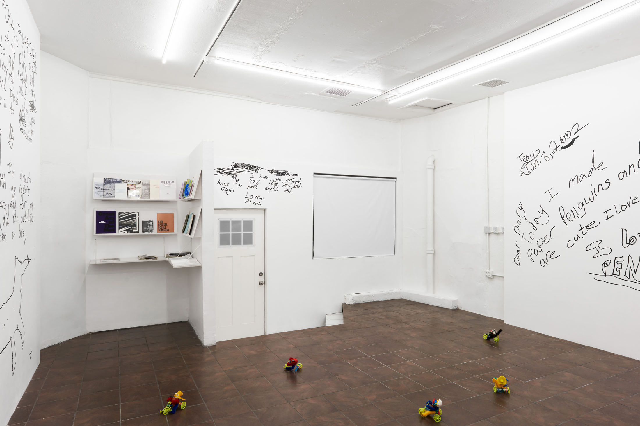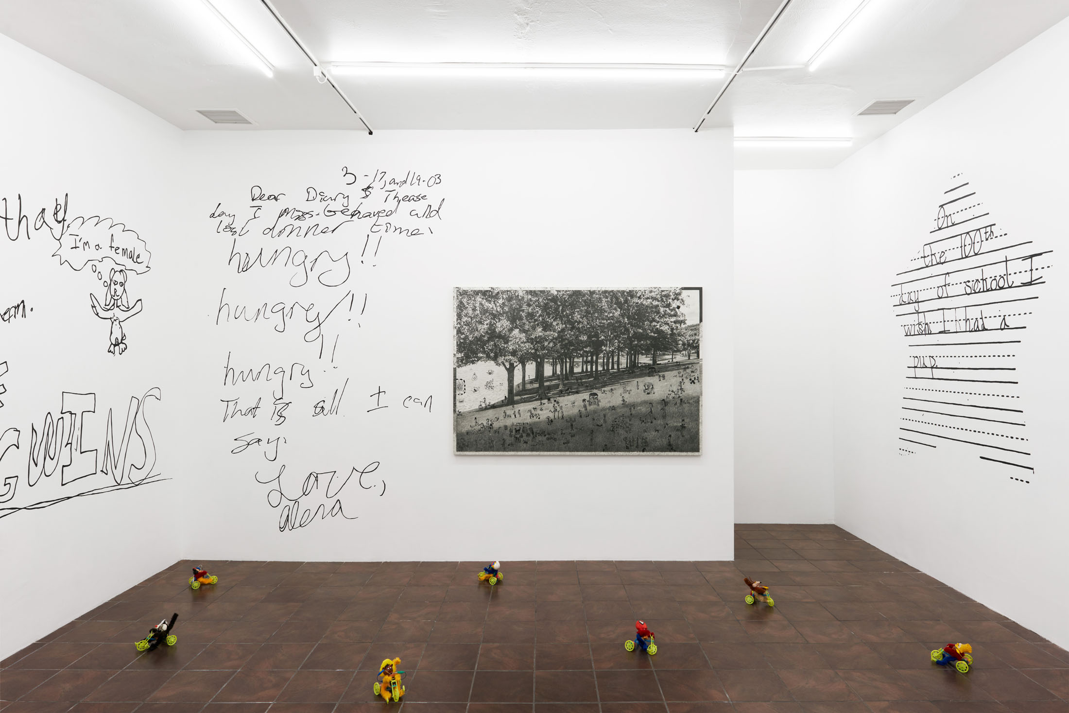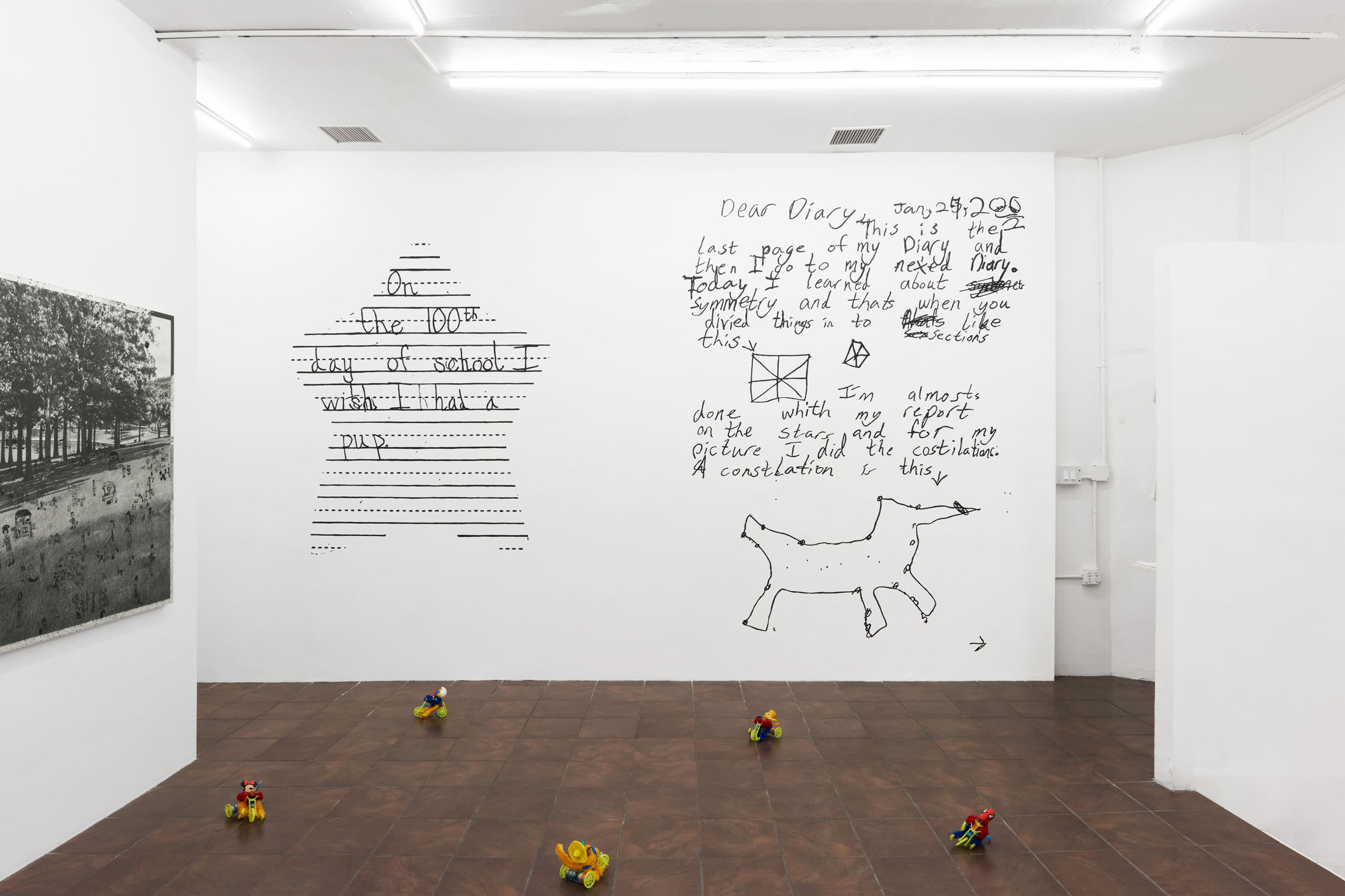 Alexa Almany’s Love, alexa is a series of wall drawings composed of the artist’s childhood diary entries between 2000 and 2003. In these works, Almany meticulously mimics her early penmanship, staying true to the immature dexterity in the original entries while scaling them up to span from floor-to-ceiling. The text itself is simultaneously sincere and humorous – reflecting on awkward childhood encounters with adult rules and categories.