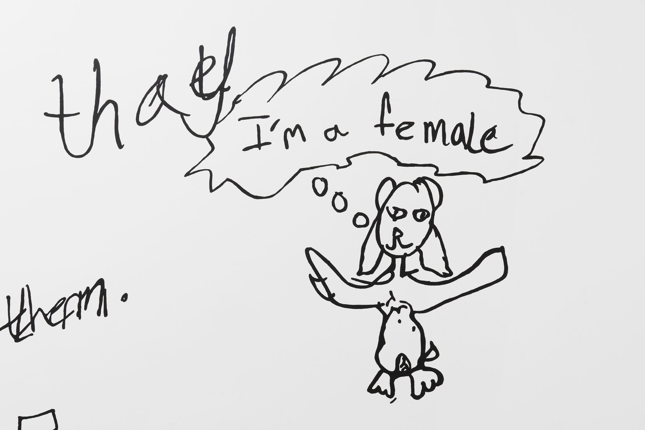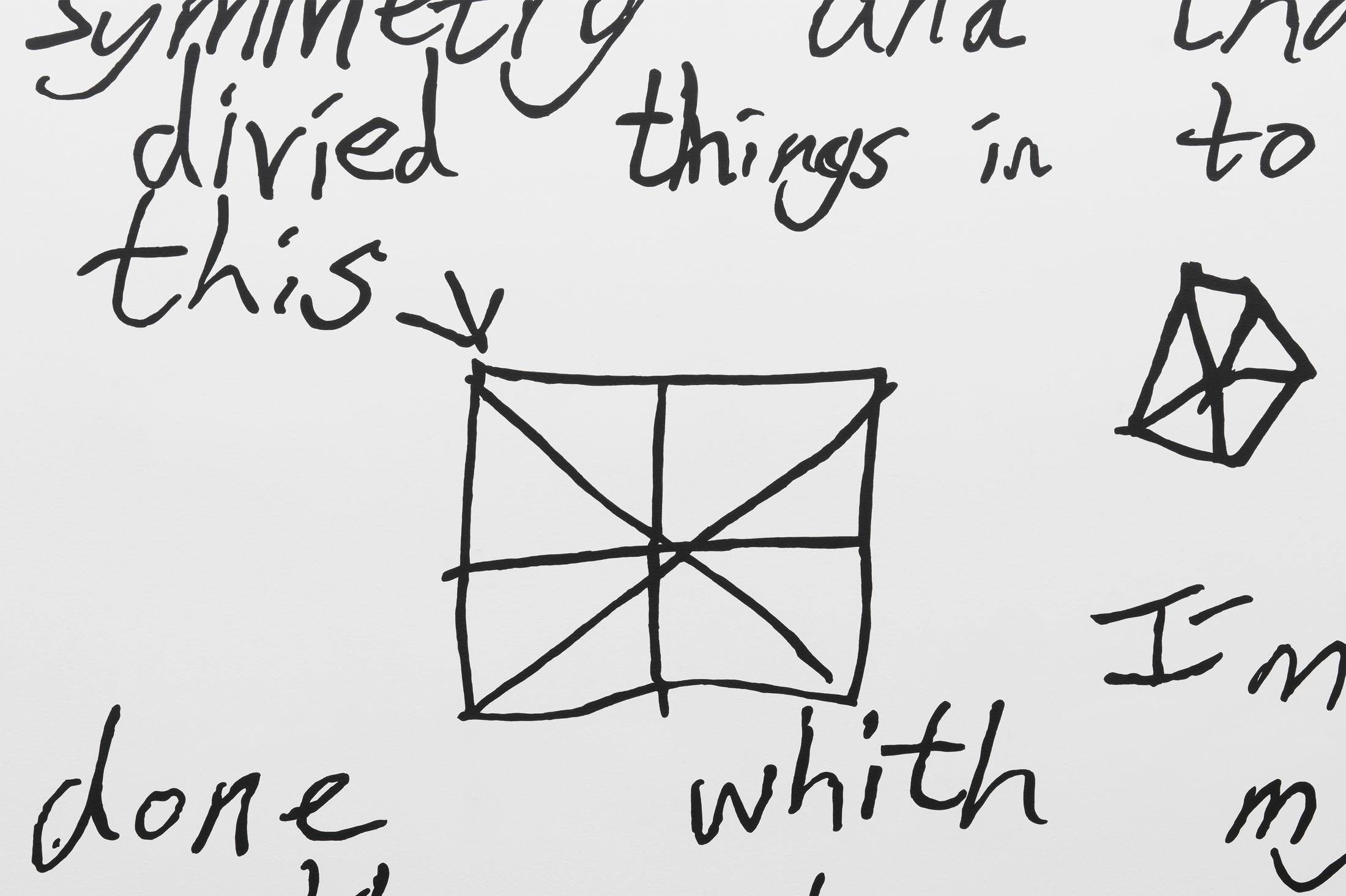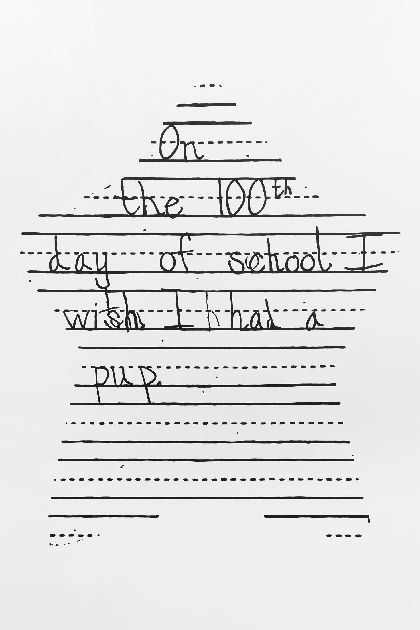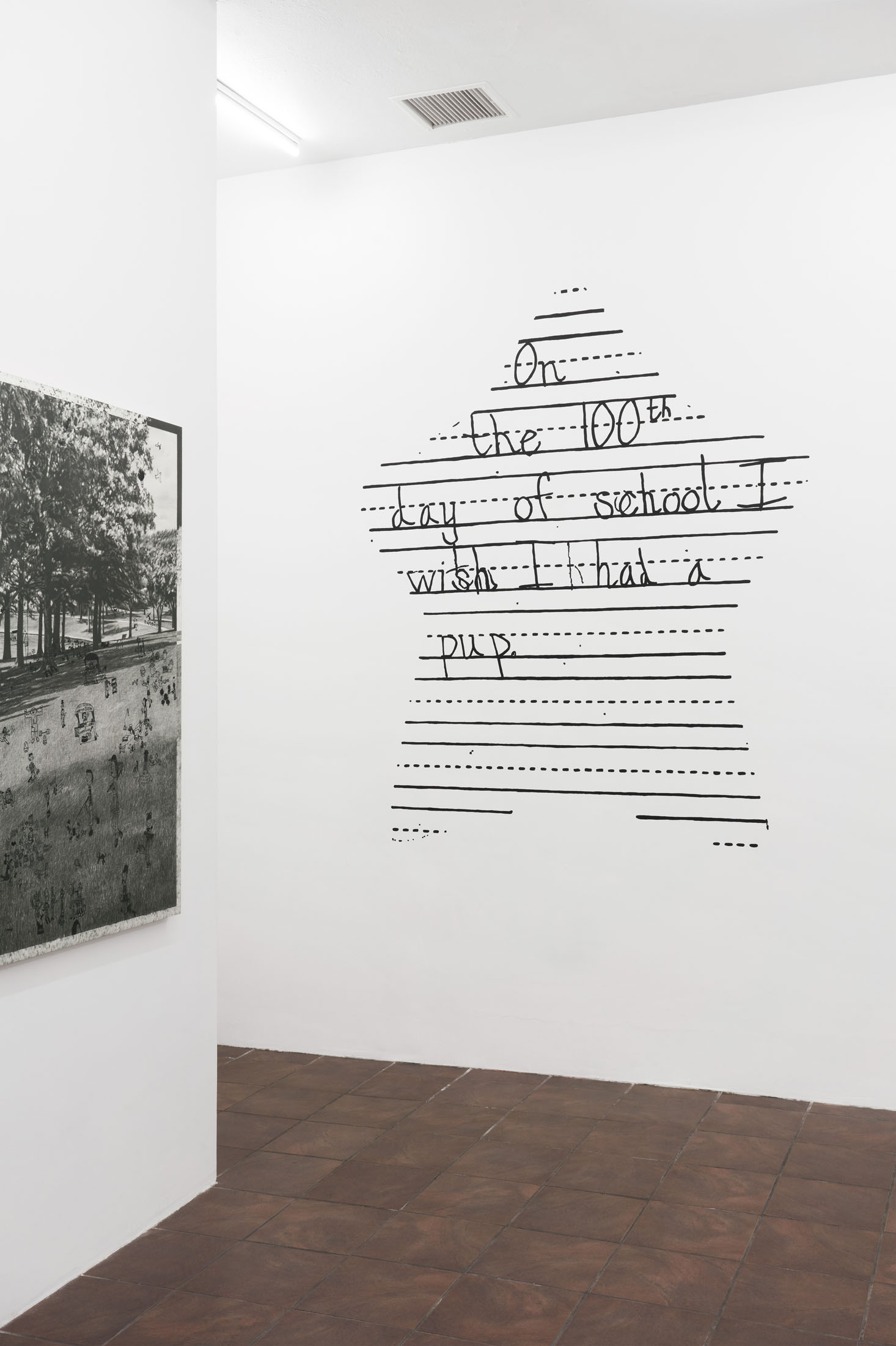 Alexa Almany’s Love, alexa is a series of wall drawings composed of the artist’s childhood diary entries between 2000 and 2003. In these works, Almany meticulously mimics her early penmanship, staying true to the immature dexterity in the original entries while scaling them up to span from floor-to-ceiling. The text itself is simultaneously sincere and humorous – reflecting on awkward childhood encounters with adult rules and categories.