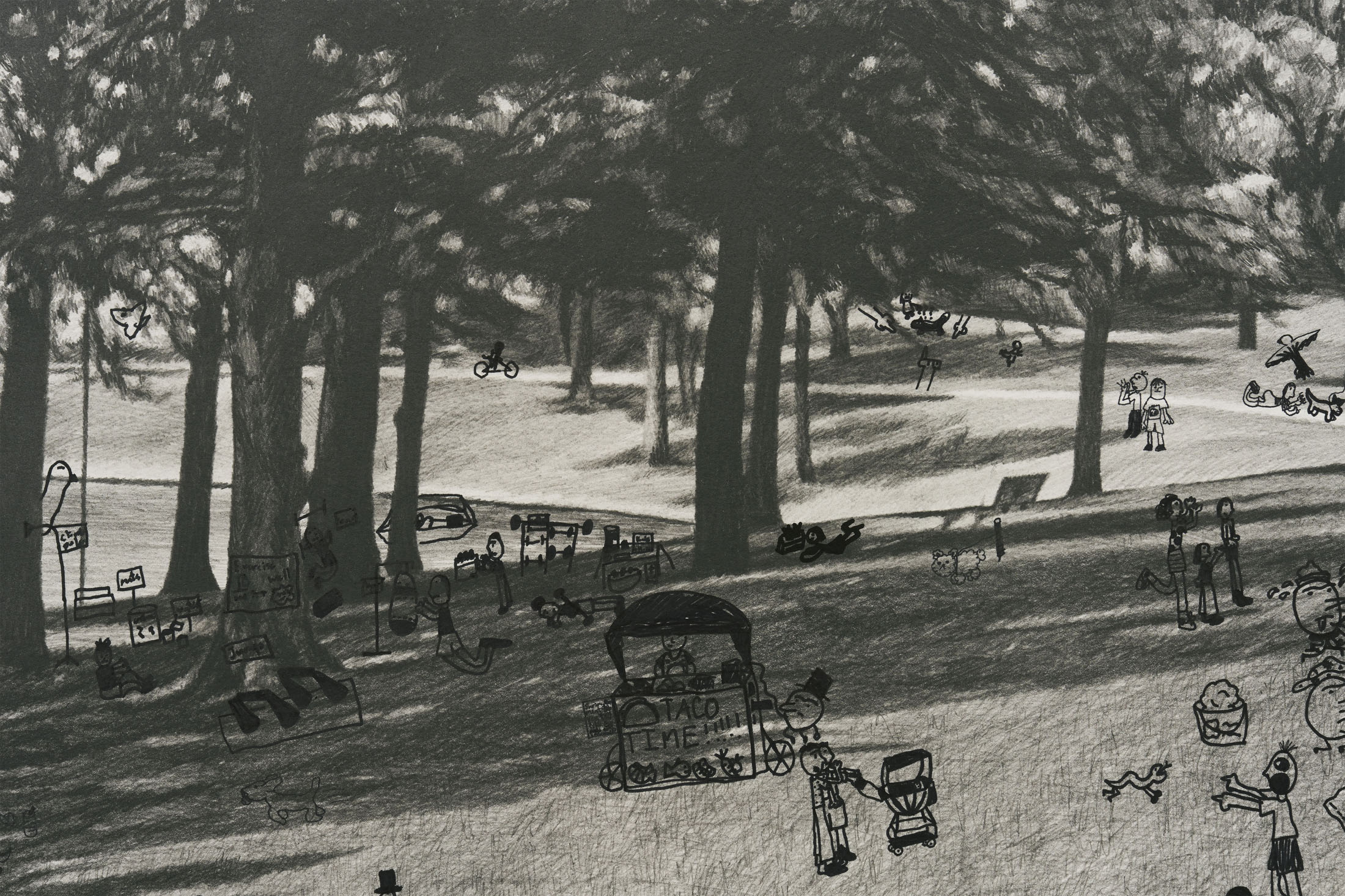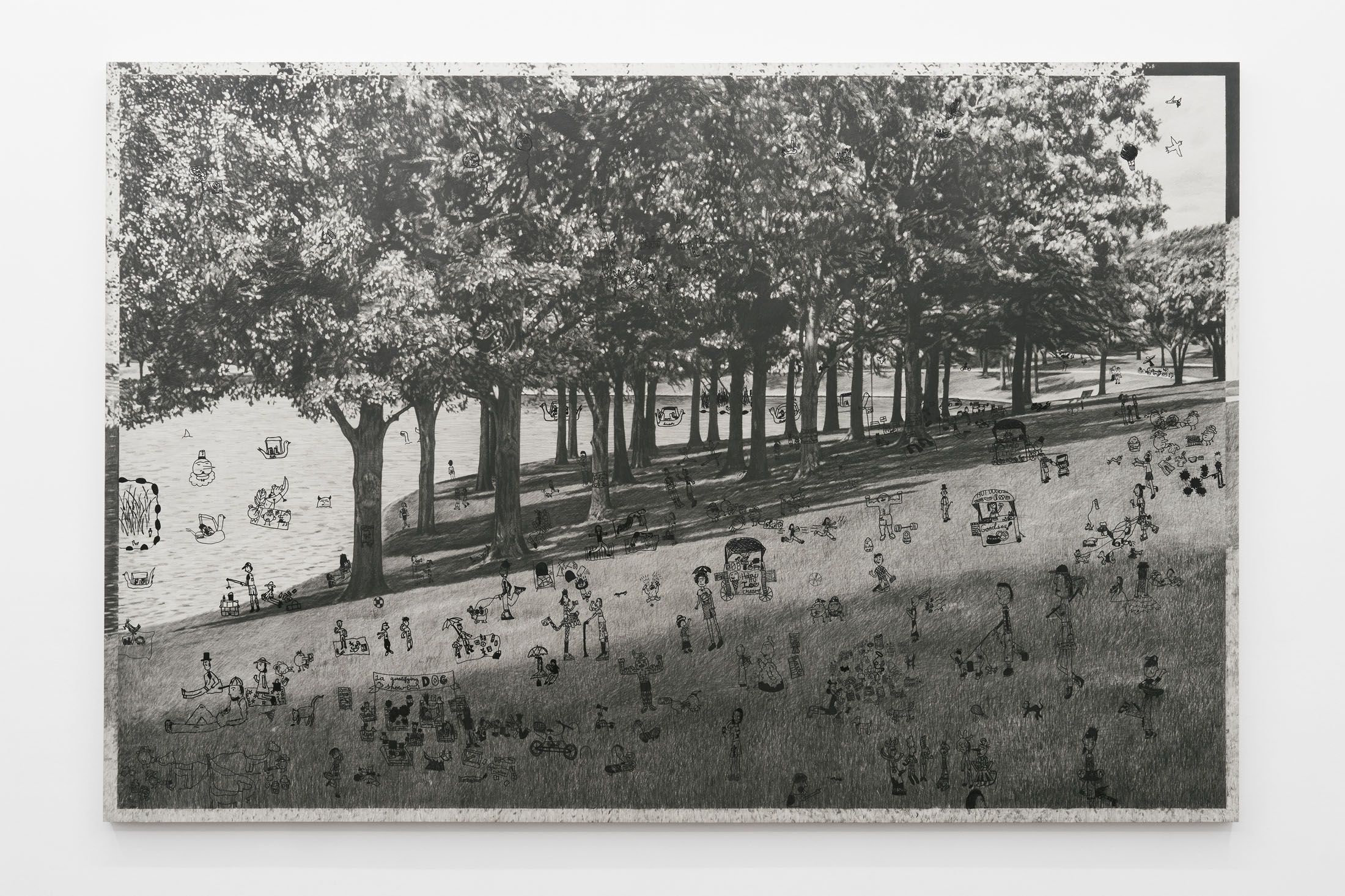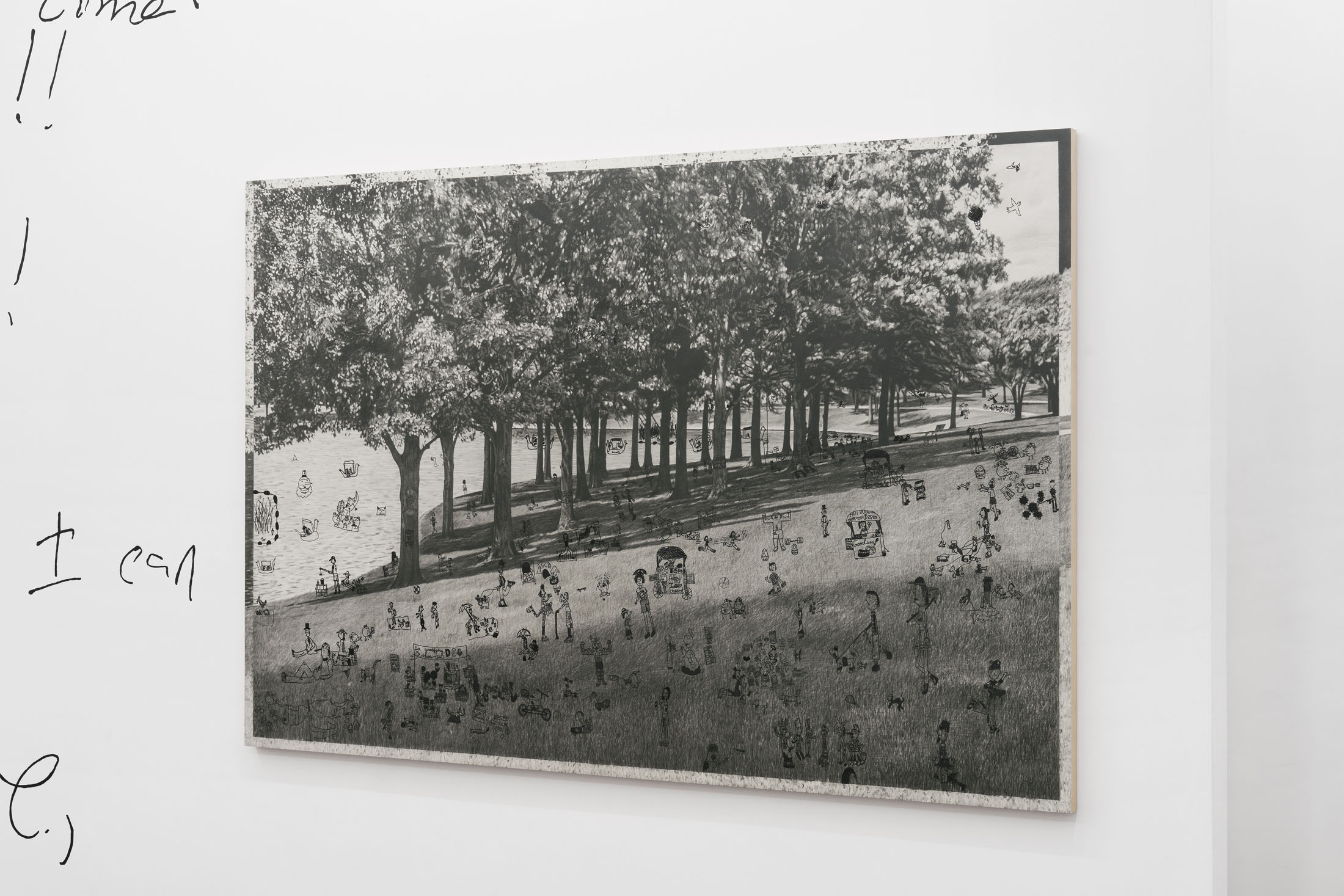 Karl Haendel’s drawing, A Sunday Afternoon on the Eastside of Los Angeles (2023), reinterprets Seurat’s historic pointillist composition A Sunday Afternoon on the Island of La Grande Jatte (1884-86). Haendel meticulously renders the landscape of the composition in graphite, while his daughter populates the scene with figures using ink. Her improvisational marks disrupt the compositional precision of Haendel’s dutiful interpretation of the original, infusing the work with a sense of spontaneity, curiosity, and intergenerational collaboration.