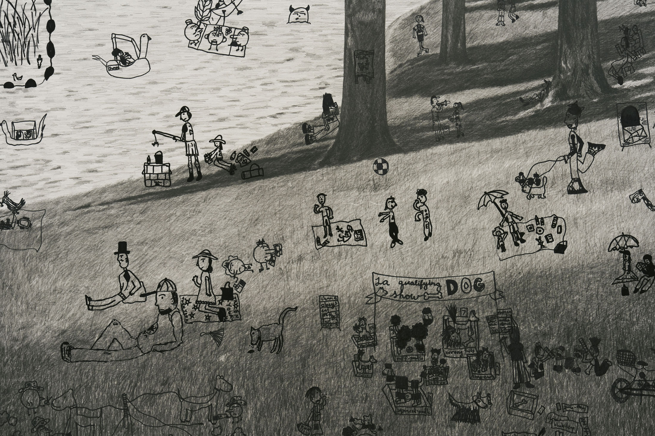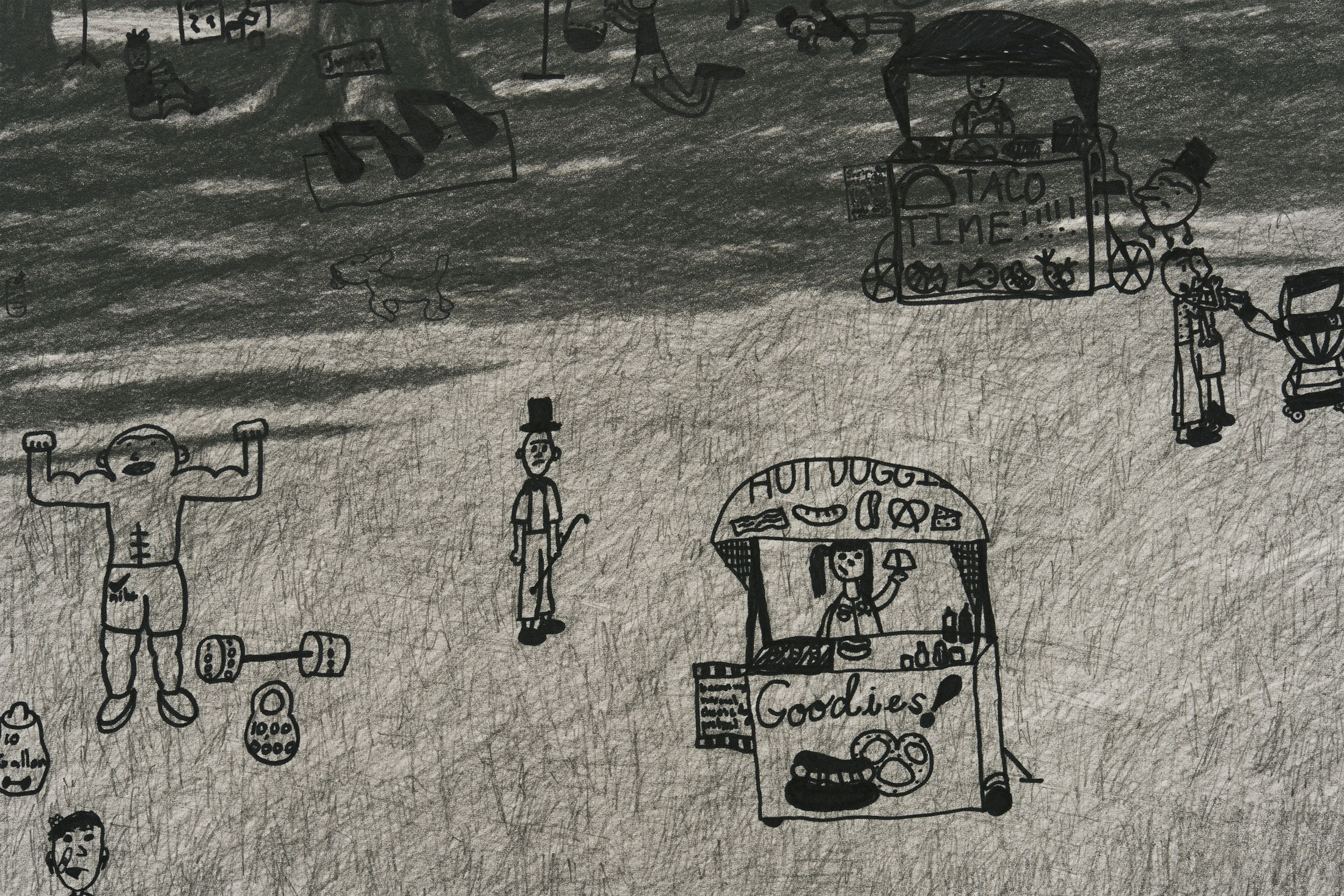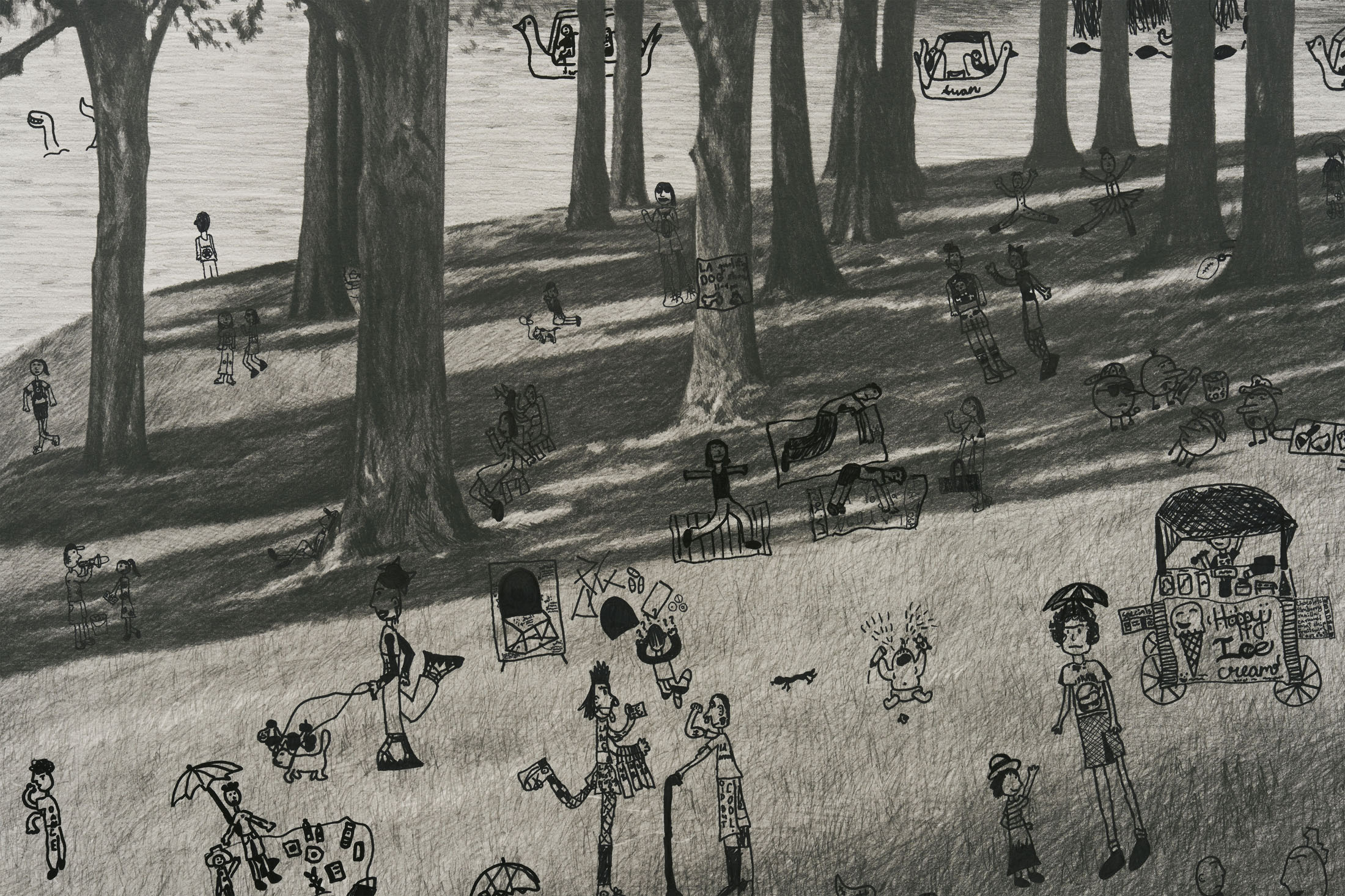 Karl Haendel’s drawing, A Sunday Afternoon on the Eastside of Los Angeles (2023), reinterprets Seurat’s historic pointillist composition A Sunday Afternoon on the Island of La Grande Jatte (1884-86). Haendel meticulously renders the landscape of the composition in graphite, while his daughter populates the scene with figures using ink. Her improvisational marks disrupt the compositional precision of Haendel’s dutiful interpretation of the original, infusing the work with a sense of spontaneity, curiosity, and intergenerational collaboration.