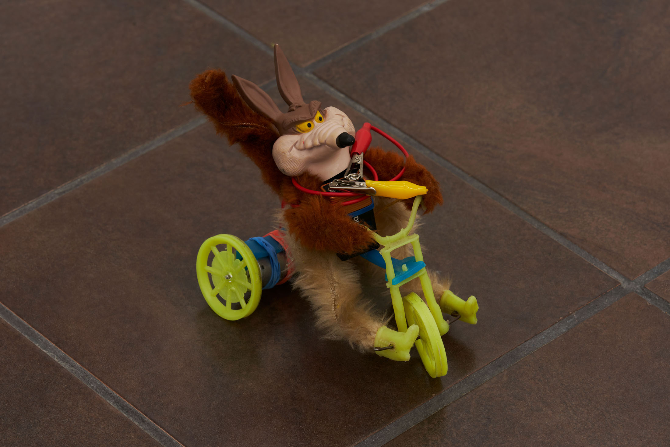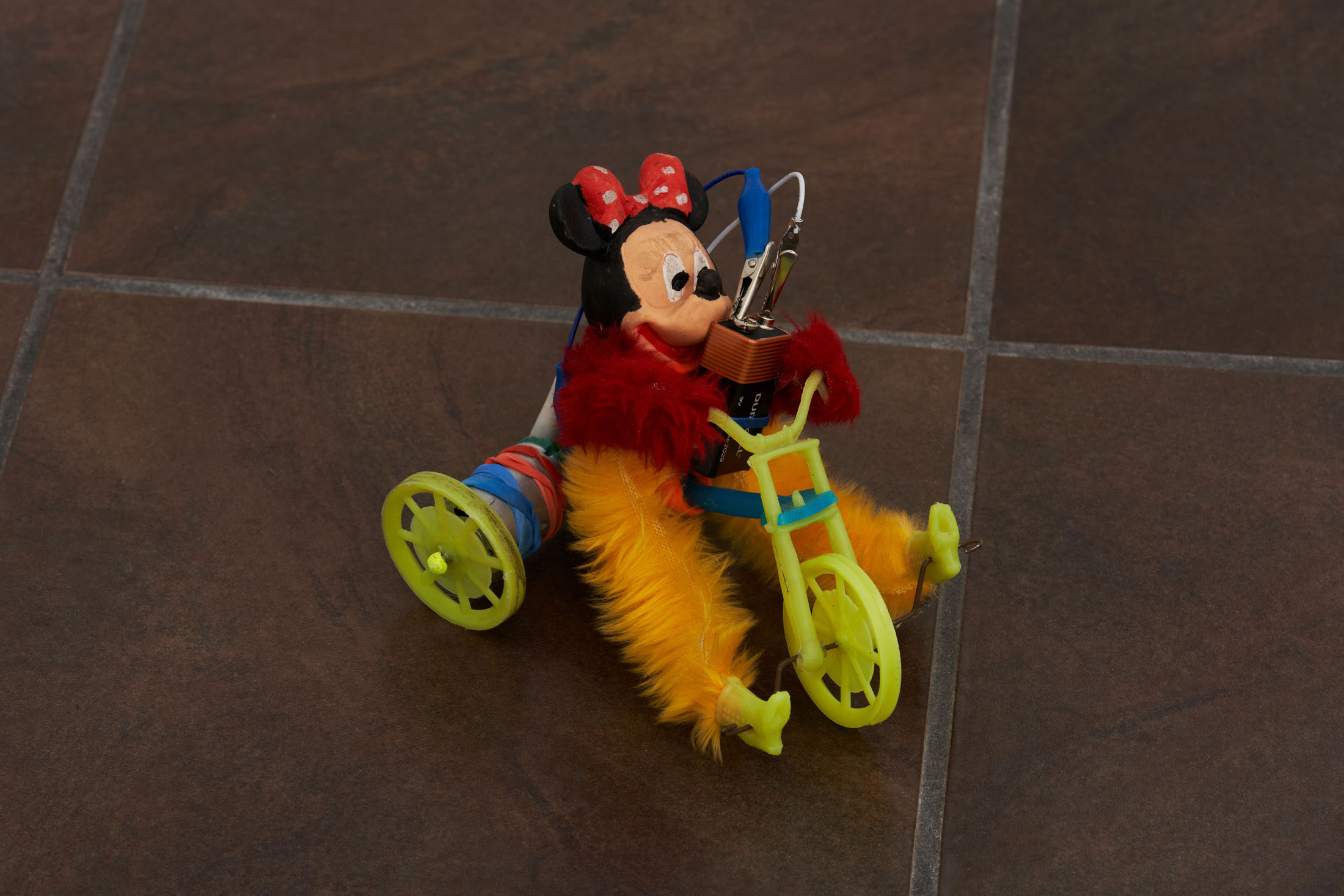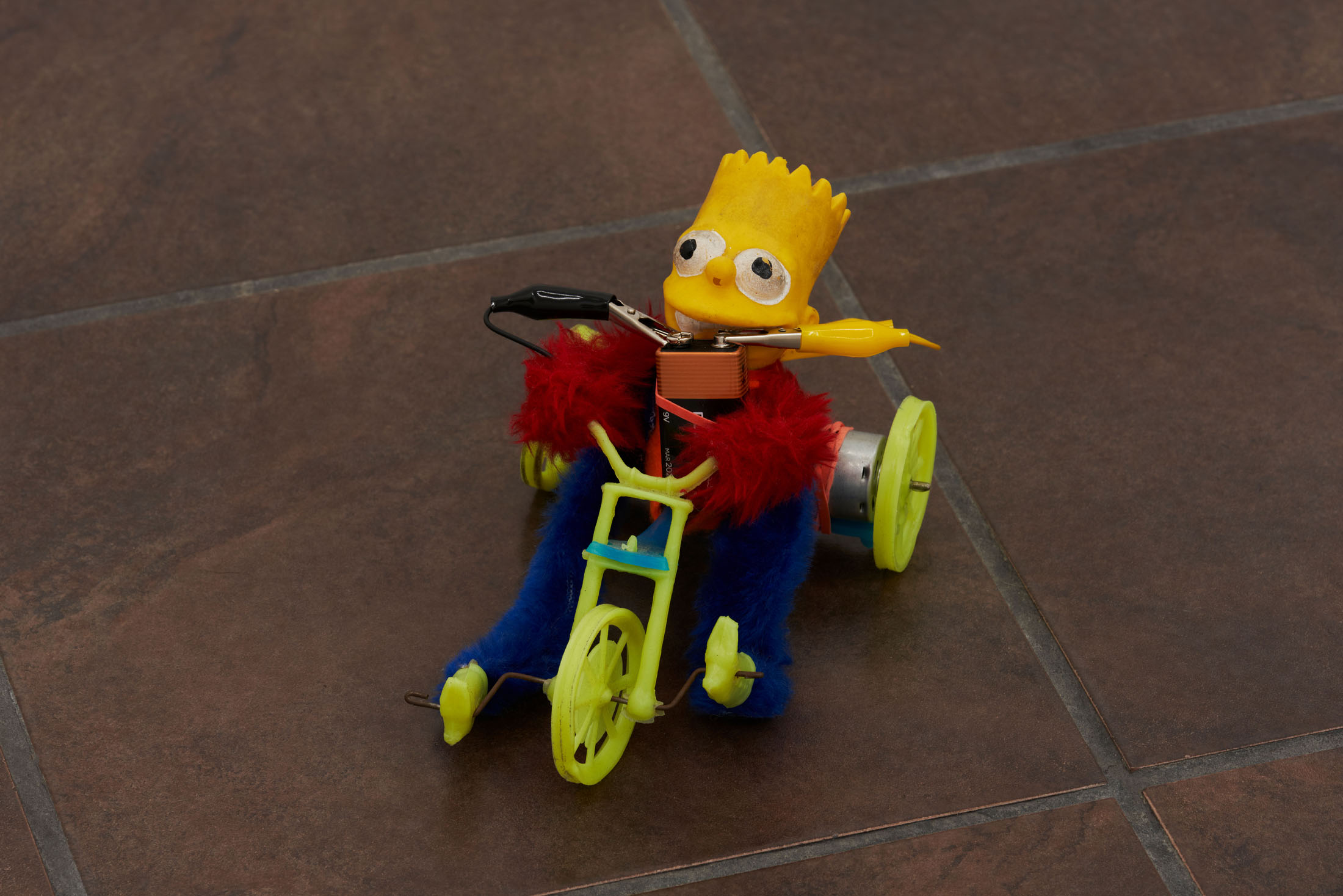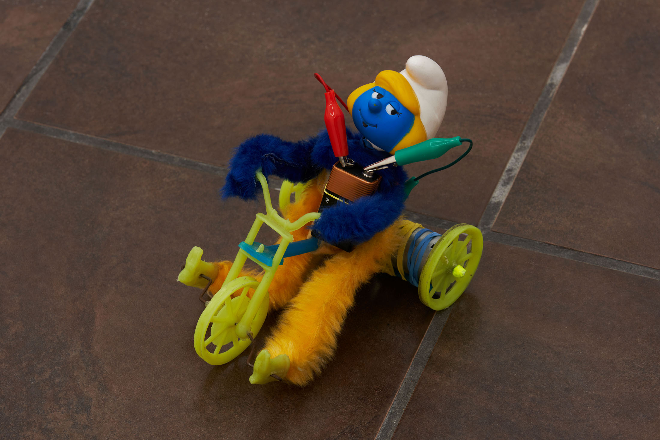 Pamela Ramos includes a group of small-scale sculptures built from found toys between 2018 and 2025. The head of Bart Simpson, Spider-Man, Smurfette, and Minnie Mouse are attached to fuzzy limbs and placed on plastic tricycles with battery packs and wire wrapped around their bodies. While their scale and material evoke toys of early childhood, their assembly produces an uncanniness. When activated, the sculptures chaotically cycle around the room or in circles until their batteries die, playfully placing themselves within the installation.