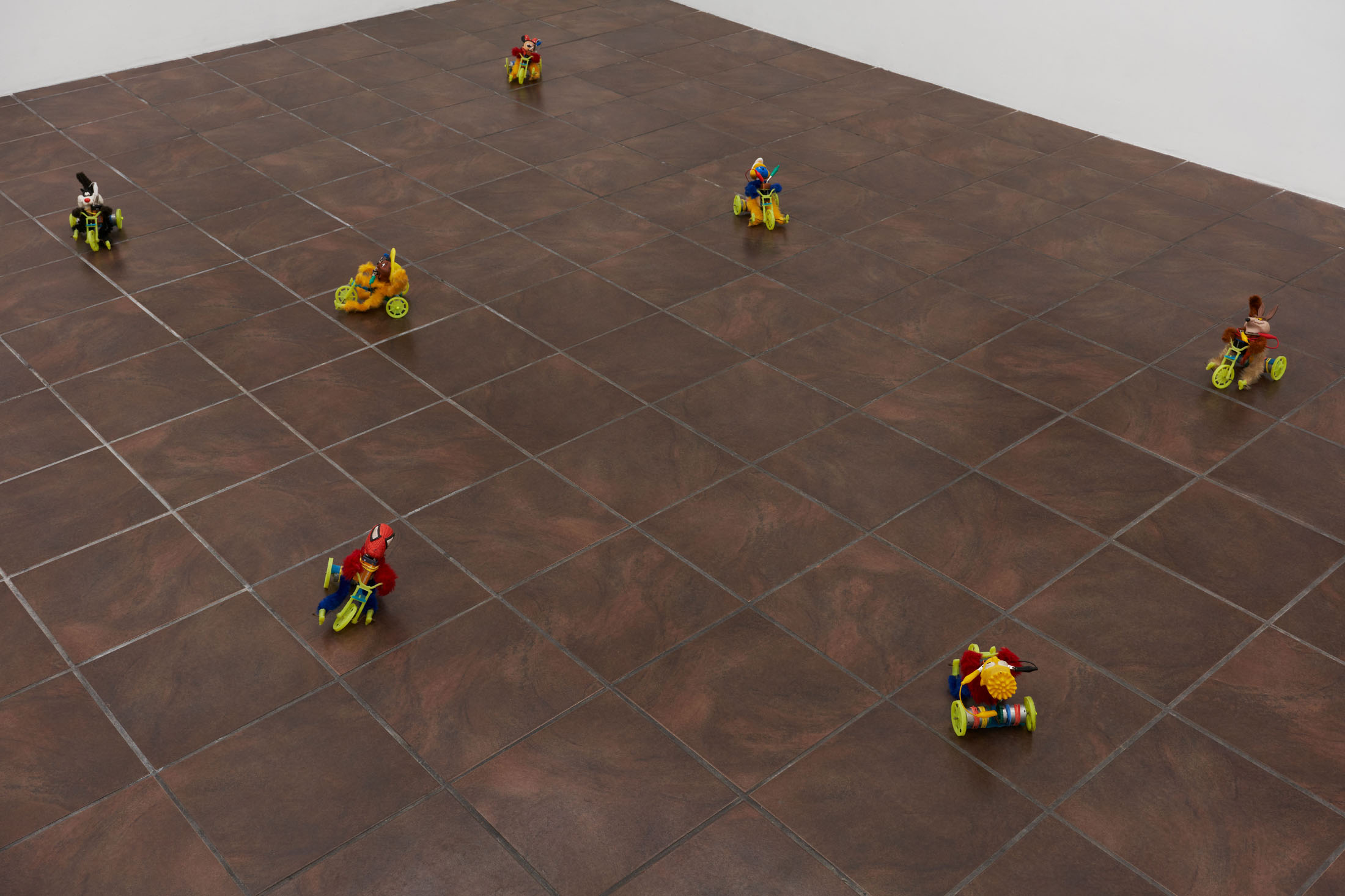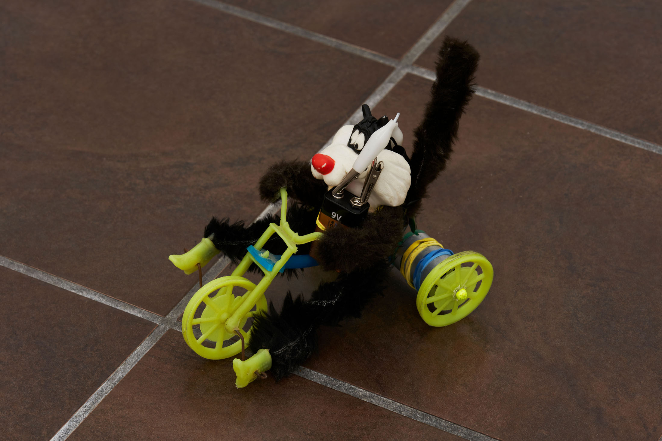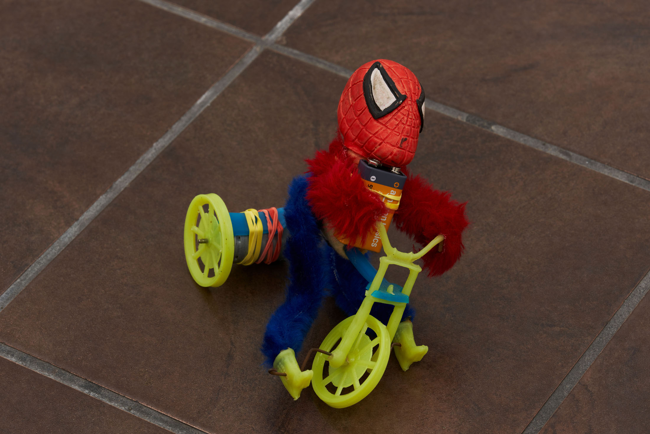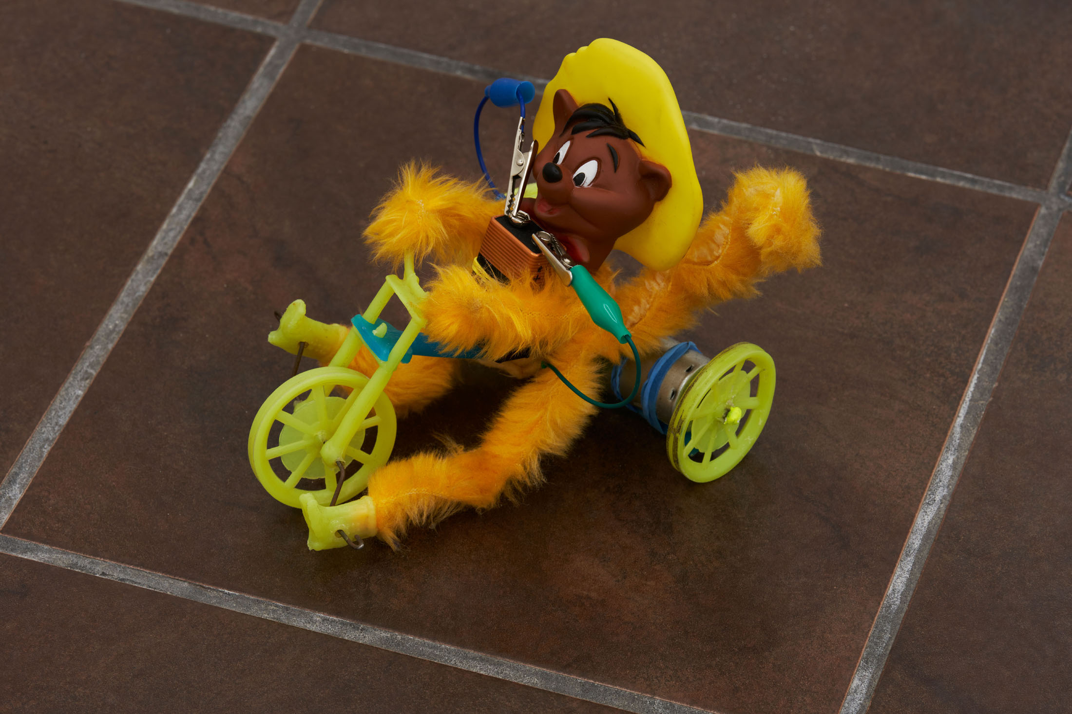 Pamela Ramos includes a group of small-scale sculptures built from found toys between 2018 and 2025. The head of Bart Simpson, Spider-Man, Smurfette, and Minnie Mouse are attached to fuzzy limbs and placed on plastic tricycles with battery packs and wire wrapped around their bodies. While their scale and material evoke toys of early childhood, their assembly produces an uncanniness. When activated, the sculptures chaotically cycle around the room or in circles until their batteries die, playfully placing themselves within the installation.