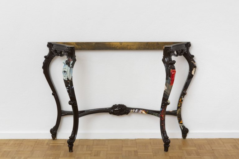 The series Geburt und Familie shown on the partition between the two exhibition spaces continues this complex reference to the history of sculpture. Eight modernist works from the collection of the Skulpturenmuseum Glaskasten Marl were used by Henke in 2014 as protagonists in a comic book. It tells of the unplanned pregnancy of a teenager who herself is an object made of bronze. Instead of ending the history of modern sculpture with patricide, the story involves these objects in a cycle of organic and ultimately feminine reproduction. The comic book mixes modernism with structures that it itself vehemently opposed: narrative, memory, psychological depth, and humor. In 2016, Henke translated the two-dimensional figures from the photomontage back into three-dimensional silicone versions. At the same time, the facial features of the sculptures were superimposed with those of her own family members. The narrative was thus fictionally interwoven with Henke’s own biography. Henke has now integrated these pieces into a new family for the exhibition at the Kunsthalle Zürich: a prosthesis body from a painting by Giorgio de Chirico formed out of architectural elements that now serve as shelfs on which the sculptures—which, like parasites, continually find new hosts—can show themselves again. Thus, the poison administered by Henke does not simply destroy the ideologies of modernism: it induces a new, polymorphically perverse afterlife for sculpture.