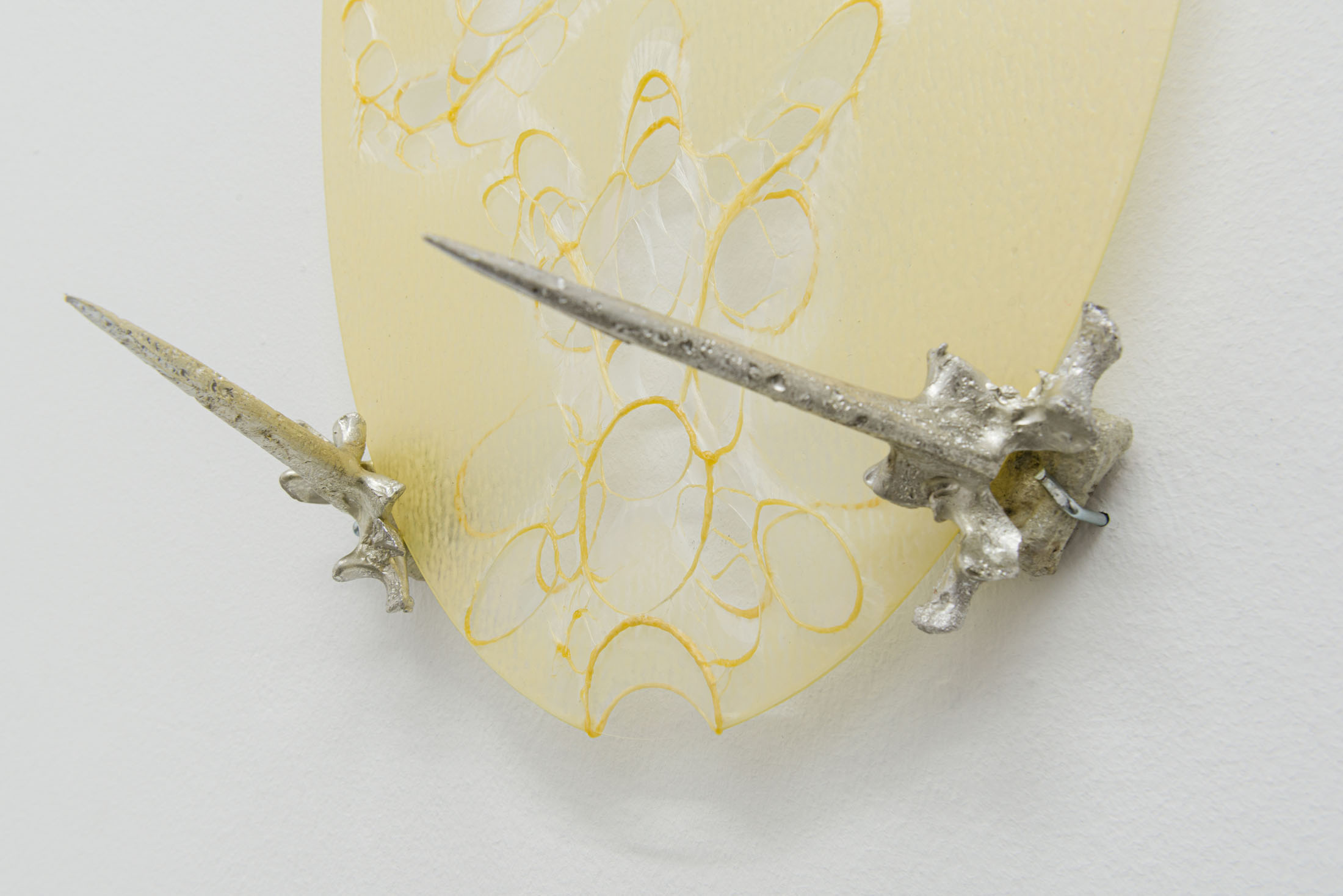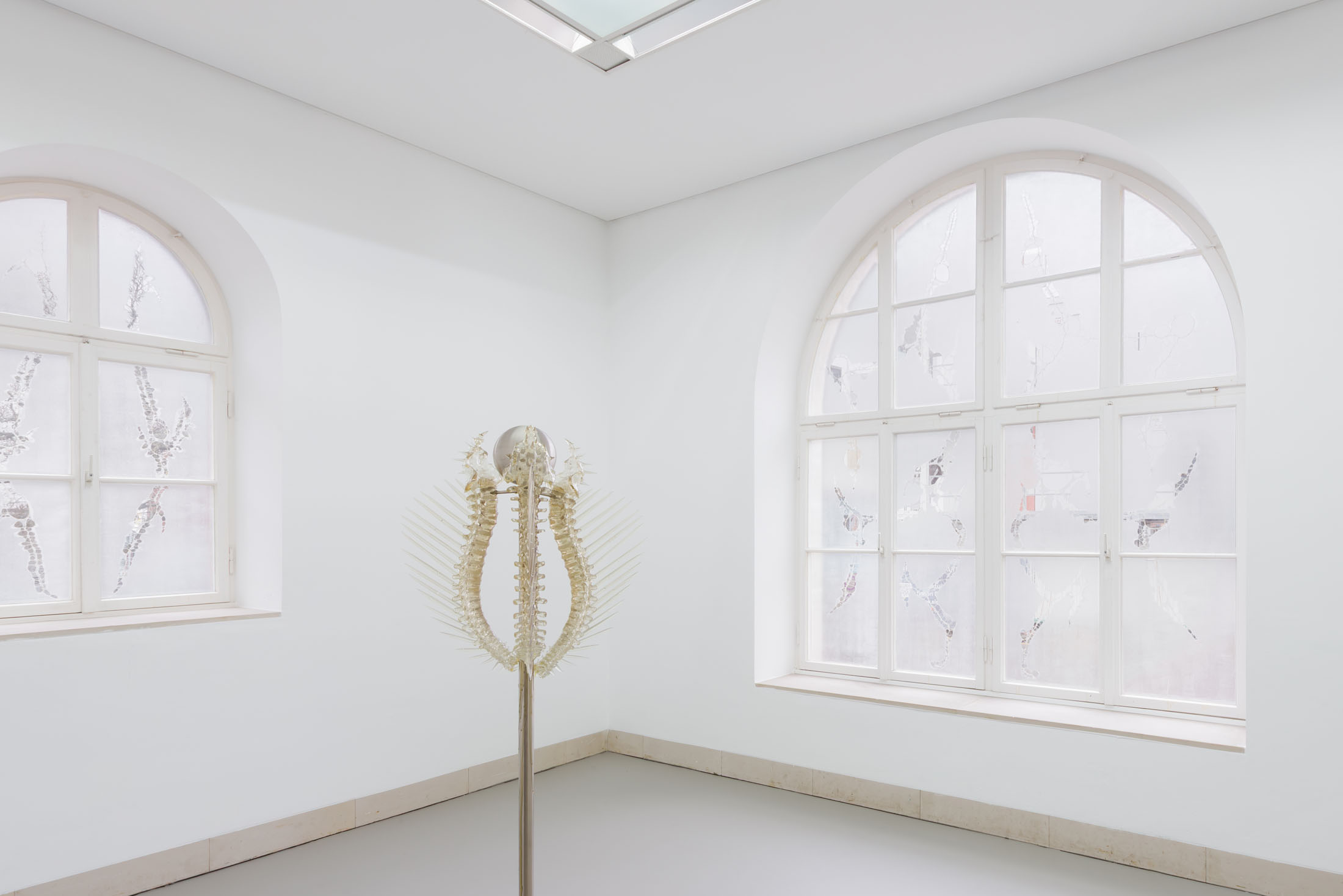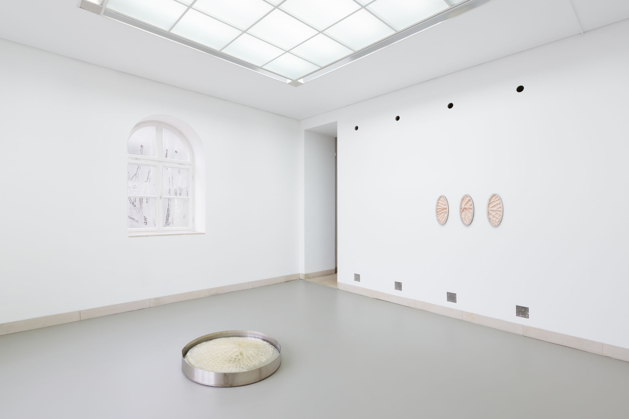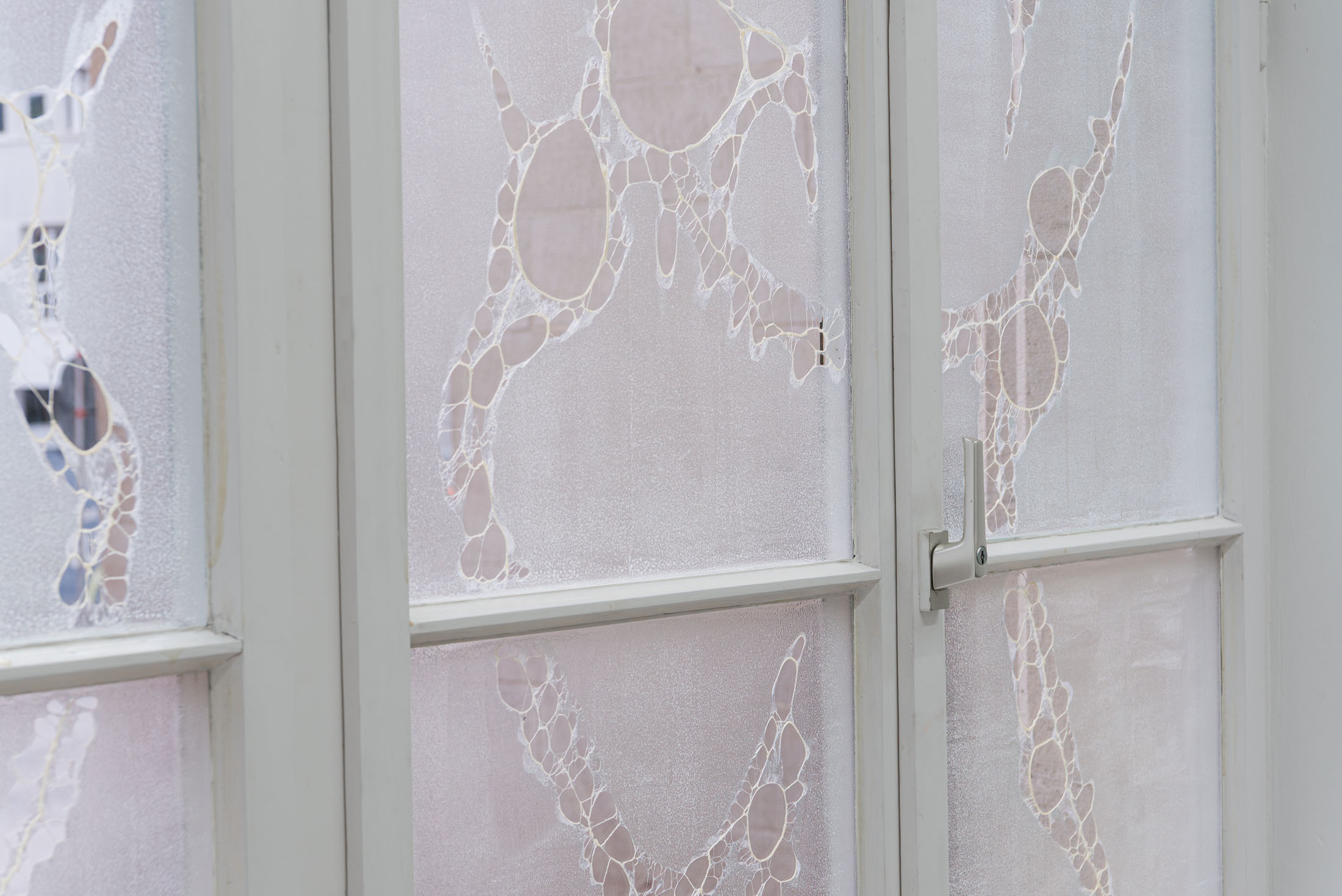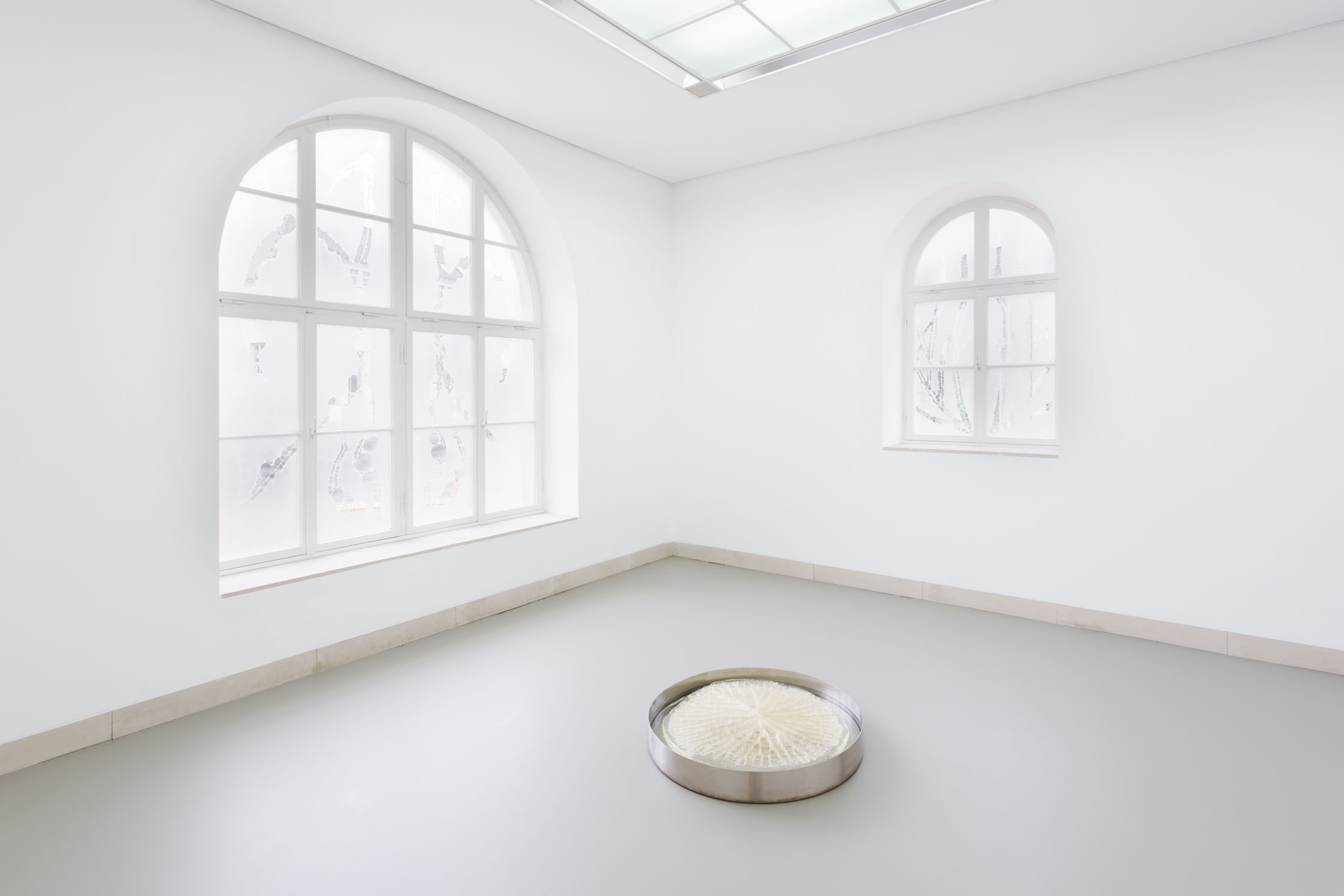 The windows of the exhibition spaces are covered by the fragile latex work Veil (2024–ongoing), which covers the glass surfaces like organically grown intertwining strands. The work depicts the process of sclerotization, a biochemical process through which the chitinous exoskeleton of insects is formed. Initially soft and vulnerable, it becomes a hard protective shell that promises stability while still allowing movement. Like stained glass windows, they refract light, tell stories, and give the exhibition its outer form. Continued as a wall installation on elliptical museum glass, they function as veils through which we perceive the world.