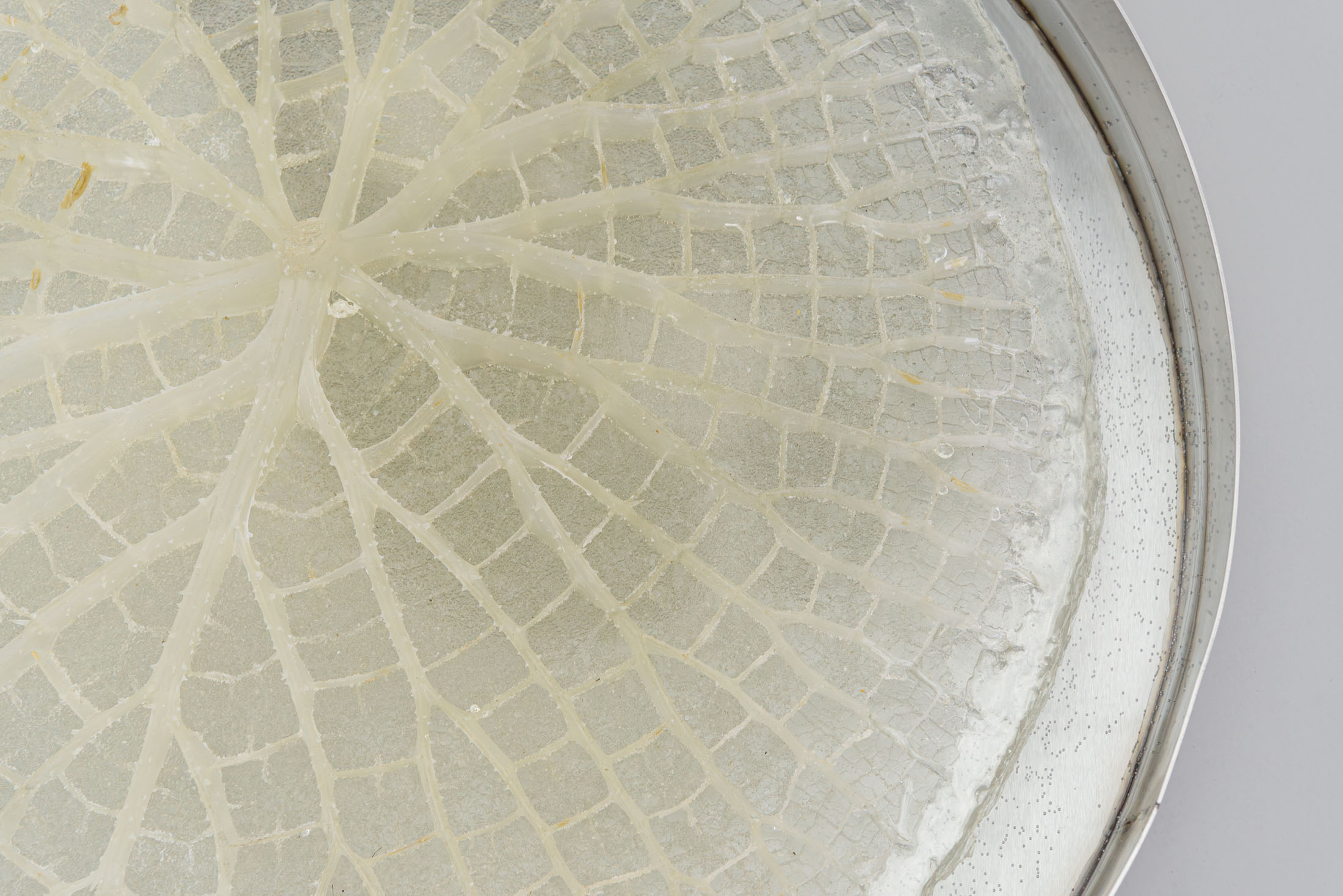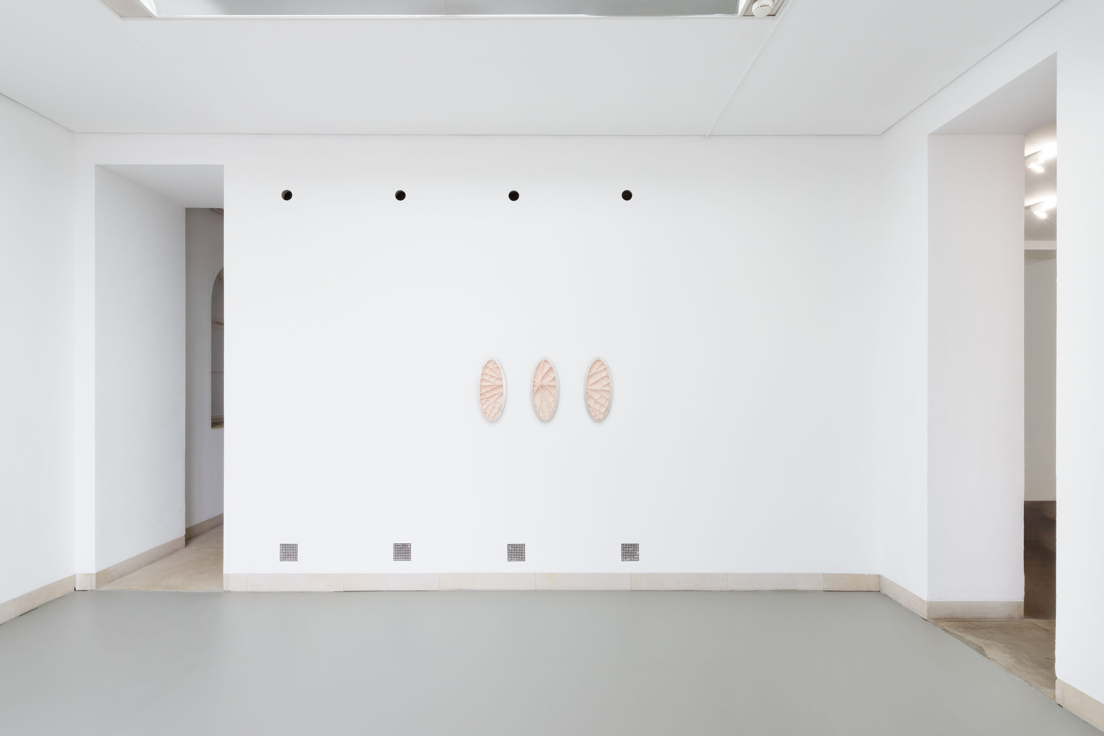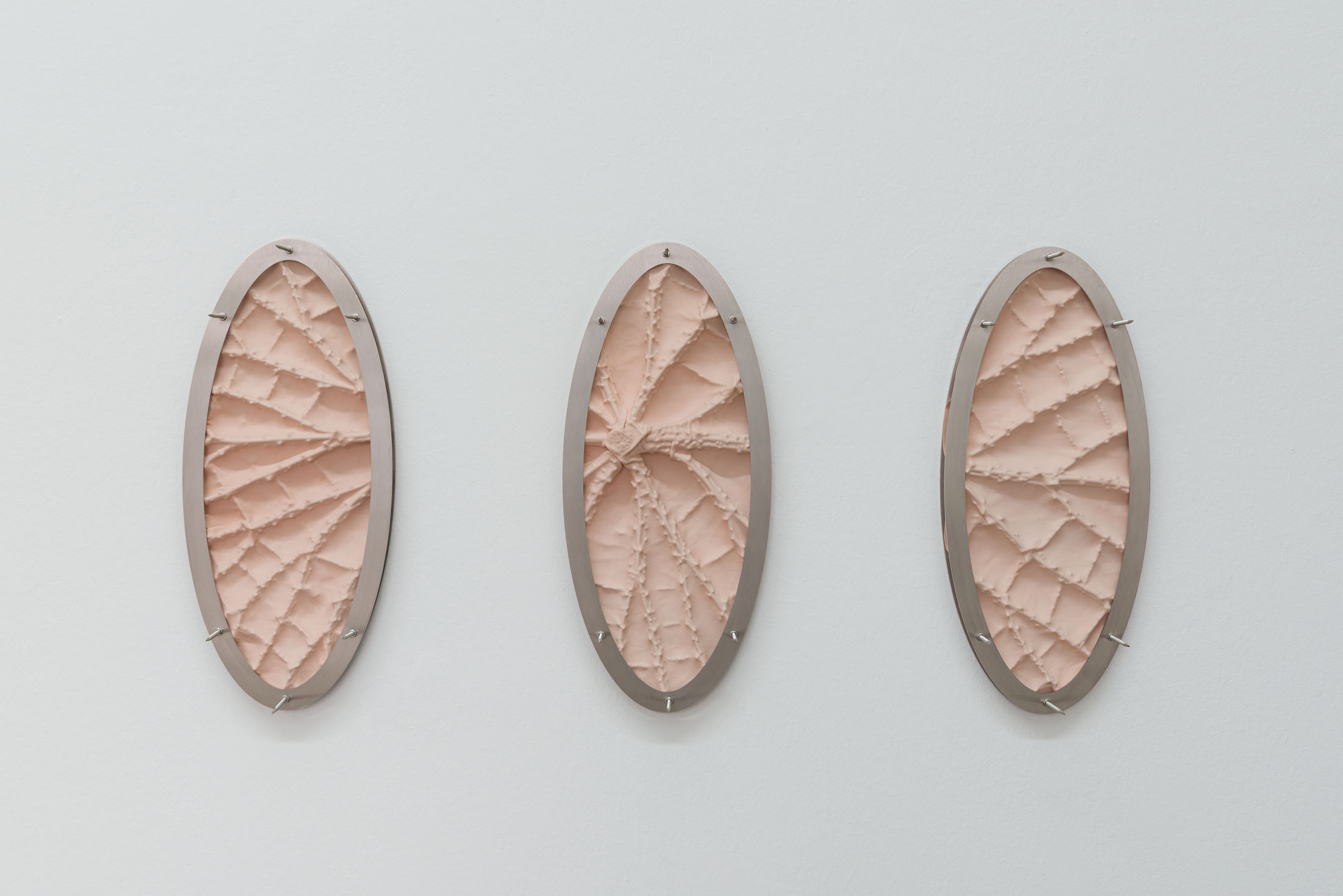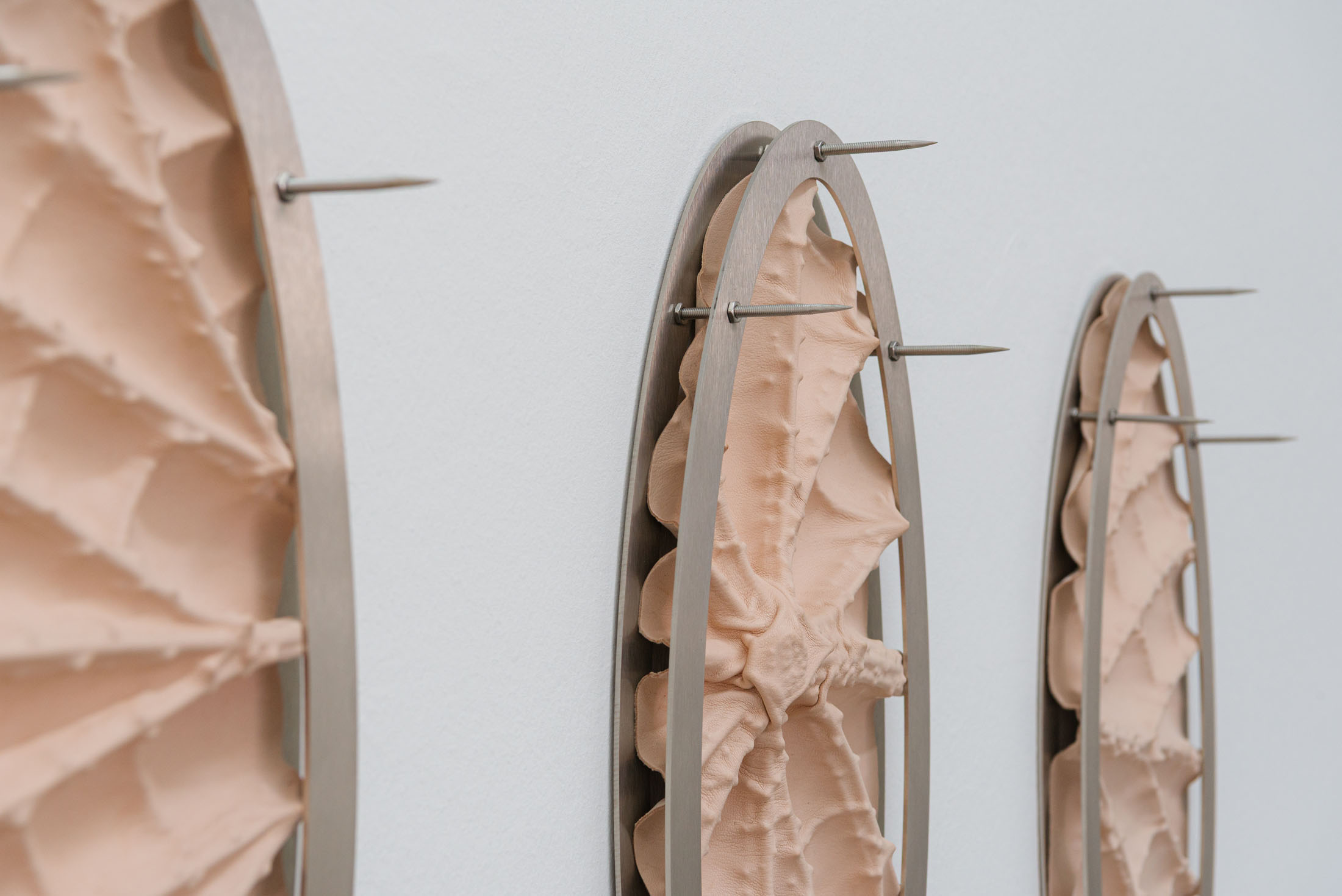 In the second room, the epoxy resin mold of a leaf from a Victoria amazonica, the giant water lily from the Amazon, floats in a round stainless-steel basin. Monumental and powerful, Victoria: The Becoming of a Beast (2025) is not shown from its familiar top view, but from the perspective usually hidden beneath the surface of the water. The underside appears sinewy, fleshy, and almost animalistic. As an almost monstrous presence, the boundary between animal and plant becomes blurred. The sculpture is inspired by a folk tale in which a girl, in love with the moon, mistakes its reflection in the water for the celestial body itself and drowns while trying to touch it. Out of compassion, the moon transforms the girl into a plant. The upward gaze from below evokes the perspective of the drowning body, of a body in transition, where death and becoming intertwine. Loss becomes a prerequisite for transformation. Like a baptismal font, the water marks initiation and renewal. Baptism appears as the symbolic death of the old self and the entry into another state of being. Victoria: The Becoming of a Beast negotiates transformation not as a gentle process, but as a hybrid becoming in which death and metamorphosis are inseparably intertwined. Hanging on the walls are the works Becoming of a Beast (triptych) (2025), in which parts of the water lily have been molded in goatskin. The elliptical shape symbolizes infinity and cyclical renewal. The surface appears soft and yet resilient. It cannot be clearly assigned to humans, animals, or plants, thus reminding us of our kinship and the common structures of all living beings.
