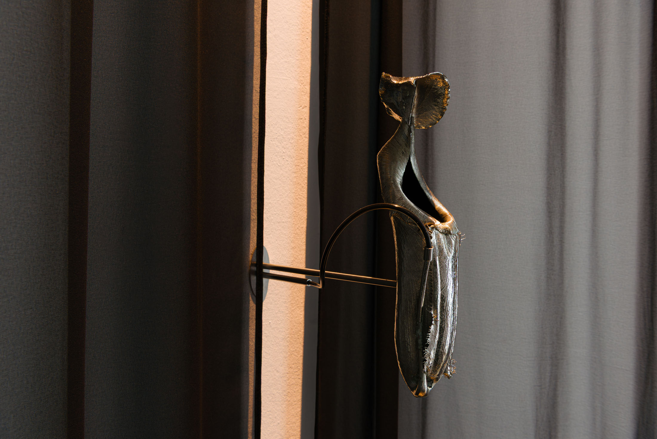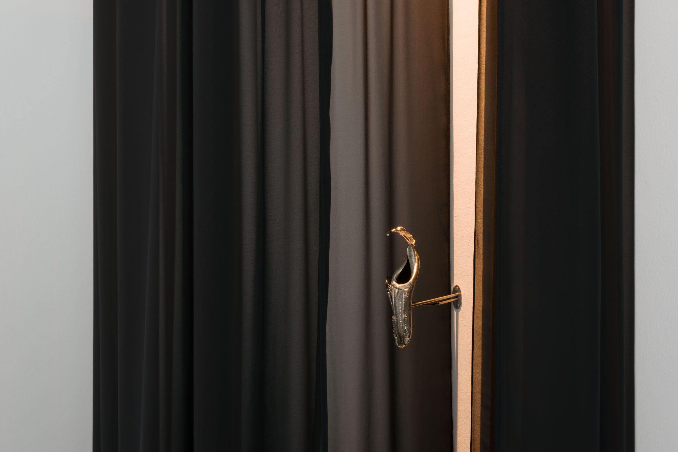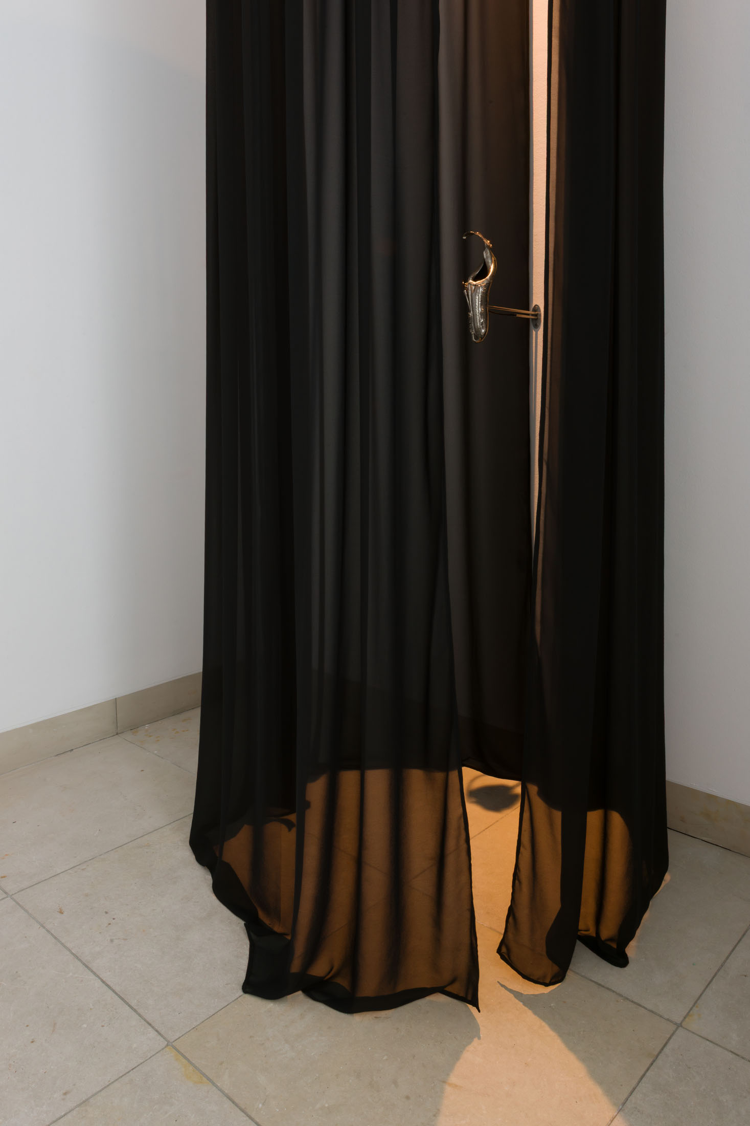 Behind a black chiffon curtain, a cabinet opens, in which the fabric panels envelop the body like a mourning veil, creating an intimate, almost sacred atmosphere. At its center hangs a Nepenthes, a pitcher plant whose gaping funnel generates a powerful pull. The interior of the plant is coated with a deep black, light-absorbing pigment that directs our gaze inward, silencing all distractions. The Nepenthes becomes a confessor, into whose throat we symbolically throw our sins. Seductive and threatening at the same time, it embodies an ambivalent figure: a deadly trap in which insects perish and simultaneously become part of a new body. Nepenthes: Through Matter (2025) refers to the perpetual transformation of matter and to the inseparable entanglement of death and growth.