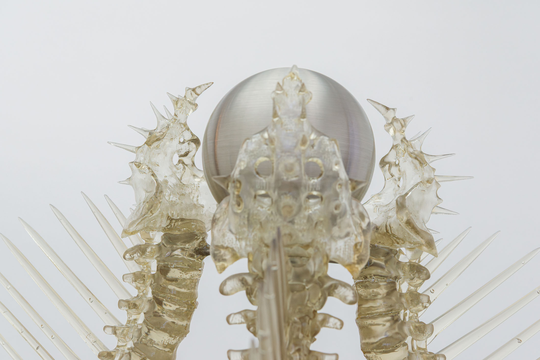 At the center of the first room stands A Manifesto of Unbecoming (2026). The sculpture appears like an object of devotion, a relic from an imagined time, situated at the intersection of science, ritual, and speculative mythology. Three spinal columns orbit the spherical tip of a scepter. Instead of showing the body as a whole, like in a crucifix, a dissected, fragmented part of the body is revealed that usually remains hidden beneath the skin. The outward-facing vertebrae simultaneously evokes associations with fish bones and suggests an approach to the animalistic as well as the maritime origins of life. The classic Trinity composition of Christian iconography is expanded and disrupted by queer theory: the number three becomes a destabilizing factor here and opens up a space of possibility beyond binary orders. The sculpture does not assert a singular truth; instead, it holds contradictions and multiple readings at once. It understands the body as part of an affective network in which human and non-human elements mutually influence one another. A Manifesto of Unbecoming is not a monument, but a manifesto of non-becoming, of permanent shift.