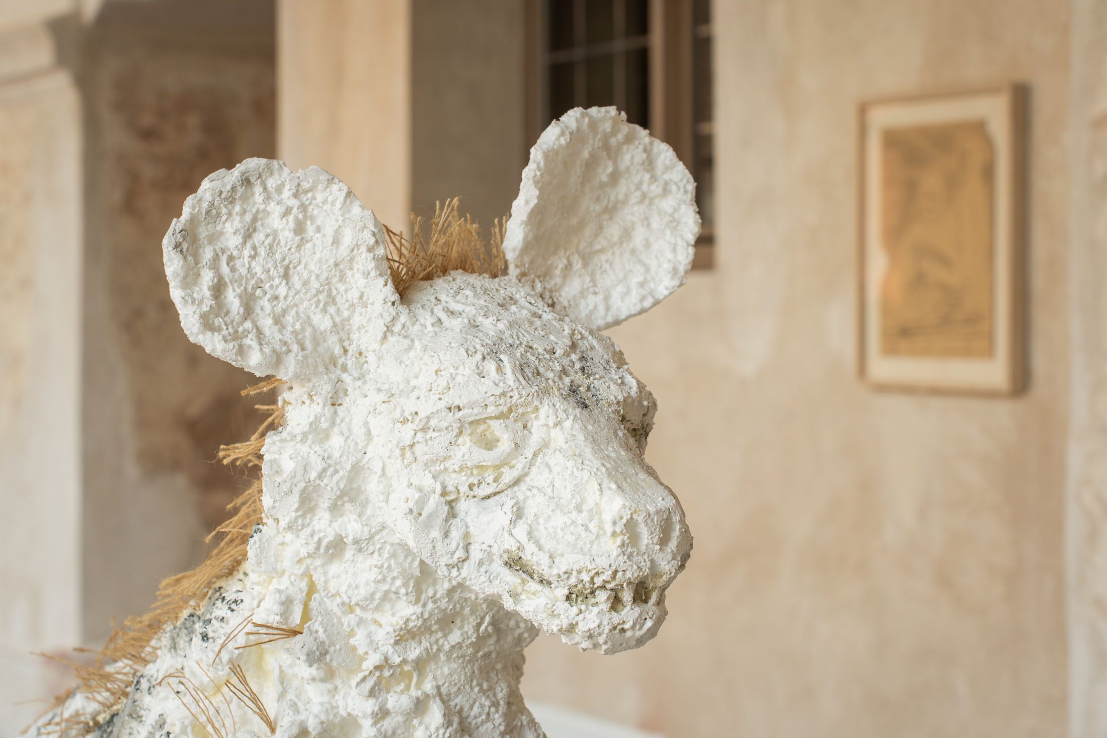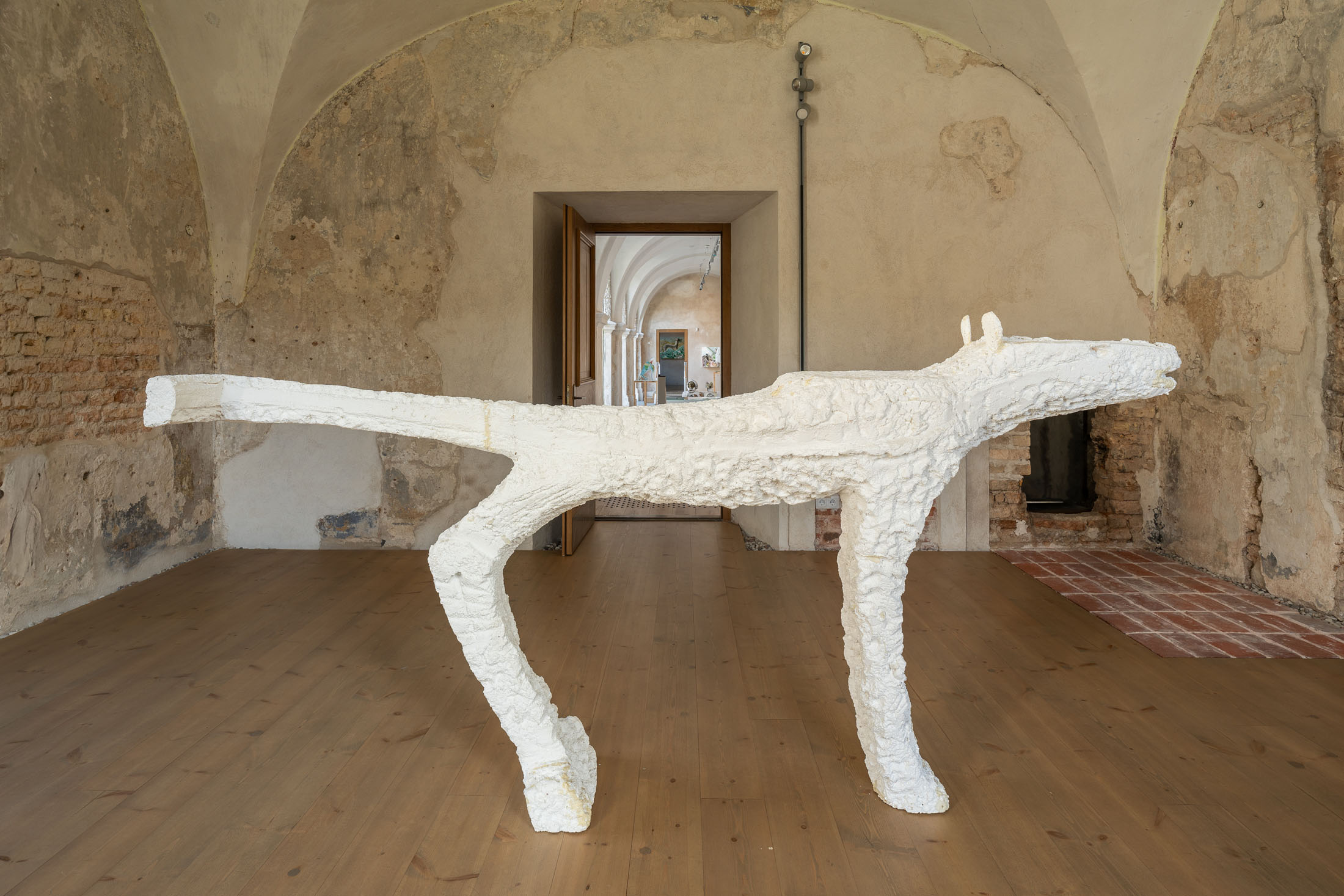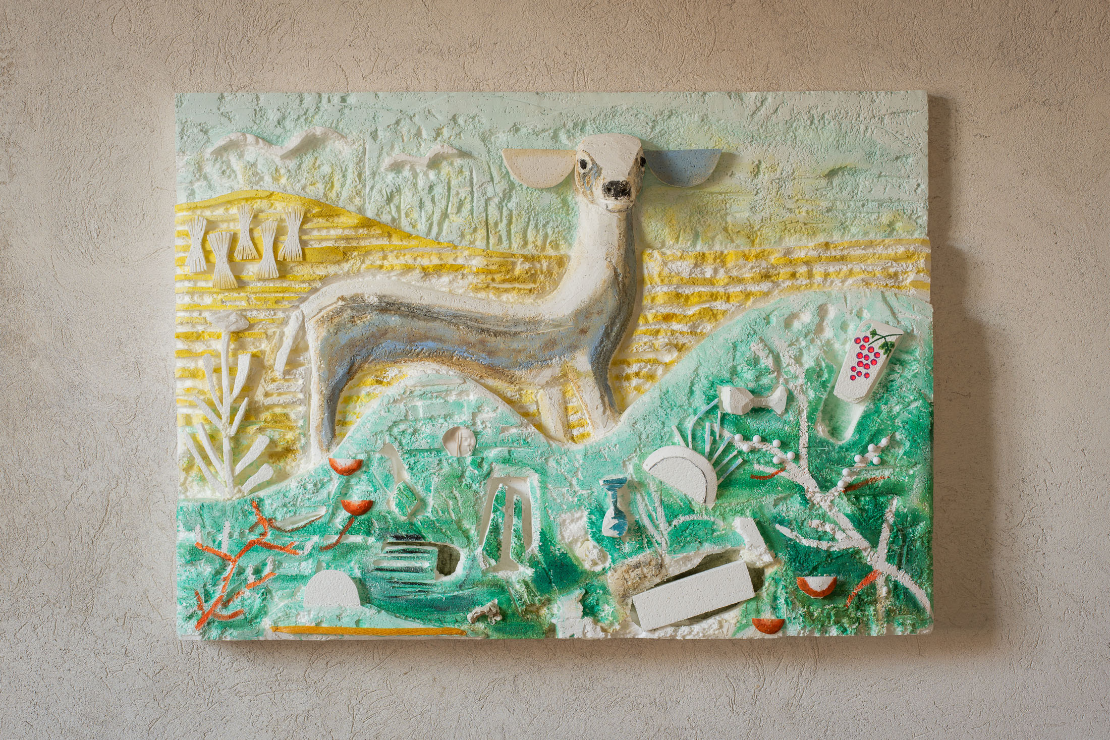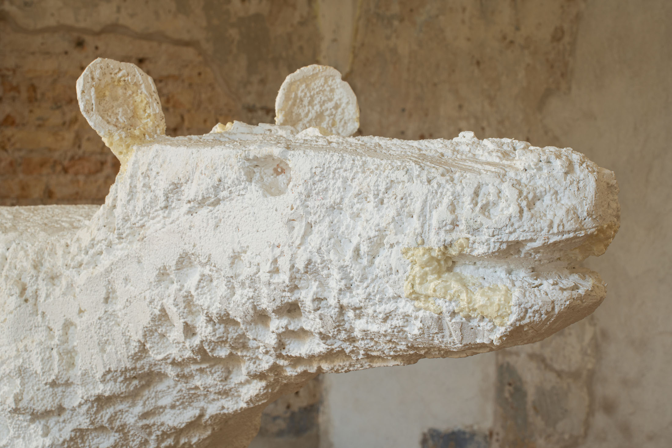 Without shying away from these contradictions, the artist mobilises polystyrene as a marker of contemporaneity, speaking openly of our time and of the ambivalent nature of technological progress. The surfaces of her sculptures and reliefs, furrowed with recesses and protrusions, testify to a cautious touch and a meticulous working process that responds to the fragility of the material while disregarding its repellent qualities – its roughness, harshness, and electrostatic cling. Through creative reworking, the material is endowed with aesthetic value and unfolds across a broad temporal spectrum: from reflections on the present to references to Mesopotamian legacies – a scene from Epic of Gilgamesh represented in Enkidu and Jackal (2007), or relief traditions recalling the Ishtar Gate that once encircled Babylon, as well as the massive Lamassu figures that stood guard over the Sumerians. It also gestures towards Antiquity and the Renaissance, evoking both the polychromy intrinsic to classical marble sculpture and the whiteness retrospectively idealised by later traditions. At the same time, the animals poised on hollow wooden constructions – a symbolic gesture of species liberation – echo the modernist critique of monumental sculpture, which rejected the hierarchy of the pedestal and the cult of the idol. The chain of time culminates in the future: in utopian visions of interspecies solidarity and empathy, or in post-dystopian alternative realities in which animals, left without humans, live on with their legacy.