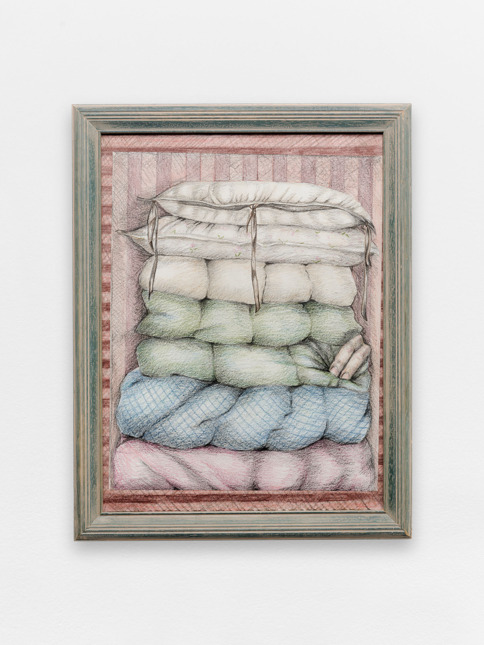 At the moment of drawing, however, something escapes simple reconstruction.The interiors do not remain intact. Hands appear at a scale that no longer corresponds to that of the room. They overflow the frame of a bathroom, slip between stacked cushions, or emerge inside a wardrobe. Within these reduced spaces, a fragment of reality remains at life size. The miniature thus ceases to be a closed world; it is crossed by a presence that exceeds it. These hands introduce a sensitive tension, at once bodily and mnemonic, as if memory itself refused to remain contained.