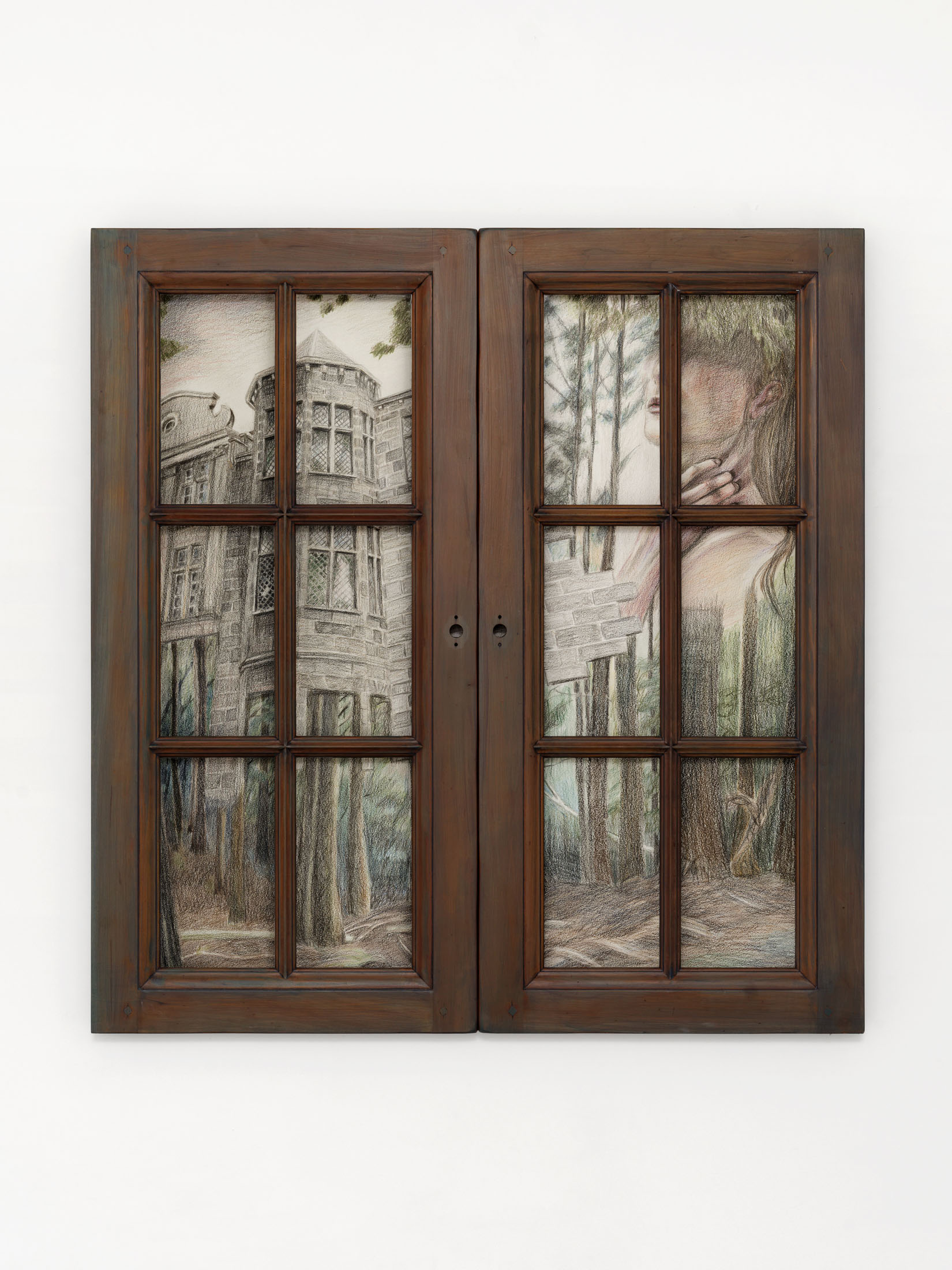 In the second room, a life size doll rests high above, placed on a shelf. Its body, sculpted in veneer wood, follows the logic of furniture. Its stomach forms a miniature cupboard, closed by small doors. It is both figure and piece of furniture, presence and storage. Facing it, a drawing depicts a building taking the form of a castle, blending into a forest and revealing a barely discernible face. The scene resembles a melancholic tableau, somewhere between reverie and nightmare. It could be what she sees, what she imagines, or what she has left behind. These two works establish a silent exchange, a barely suggested fiction charged with emotional tension. The doll is literally stored away, and its enforced stillness, its distance from the floor and from the viewer, reactivates relations of power linked to childhood, gender and social control.