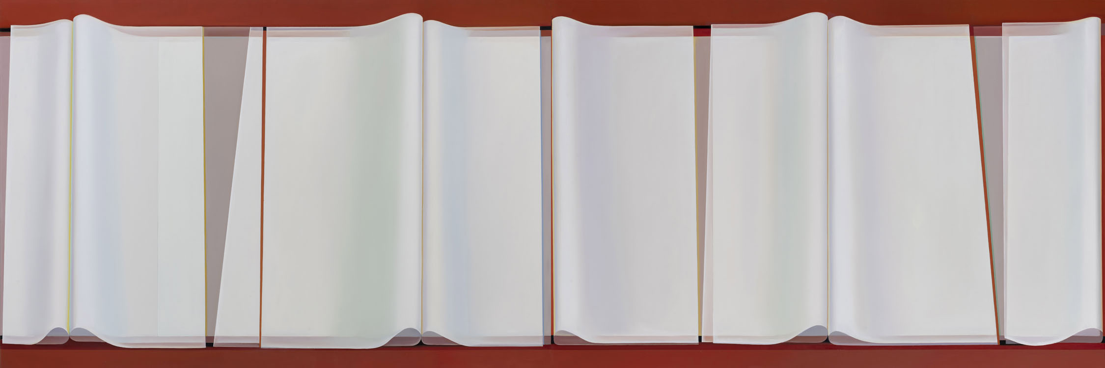 The gaze crosses the surface in a properly smooth fashion, without being too sharp. Lightsome reflections and subtle sense of light swing between reality and illusion. Limited geometric vocabulary builds a rigorous visual structure, while the fluctuating rhythm of colors serves as an aesthetic measure that is nearly precise. The fold 1 extends infinitely in the gallery space, “folds, unfolds, refolds” 2. In this space, the weight of gesture and mind fails stealthily. It is the One, it is also the Multiple. It is the phenomenal world of the current moment and location, the infinite iteration, the elimination of boundaries.