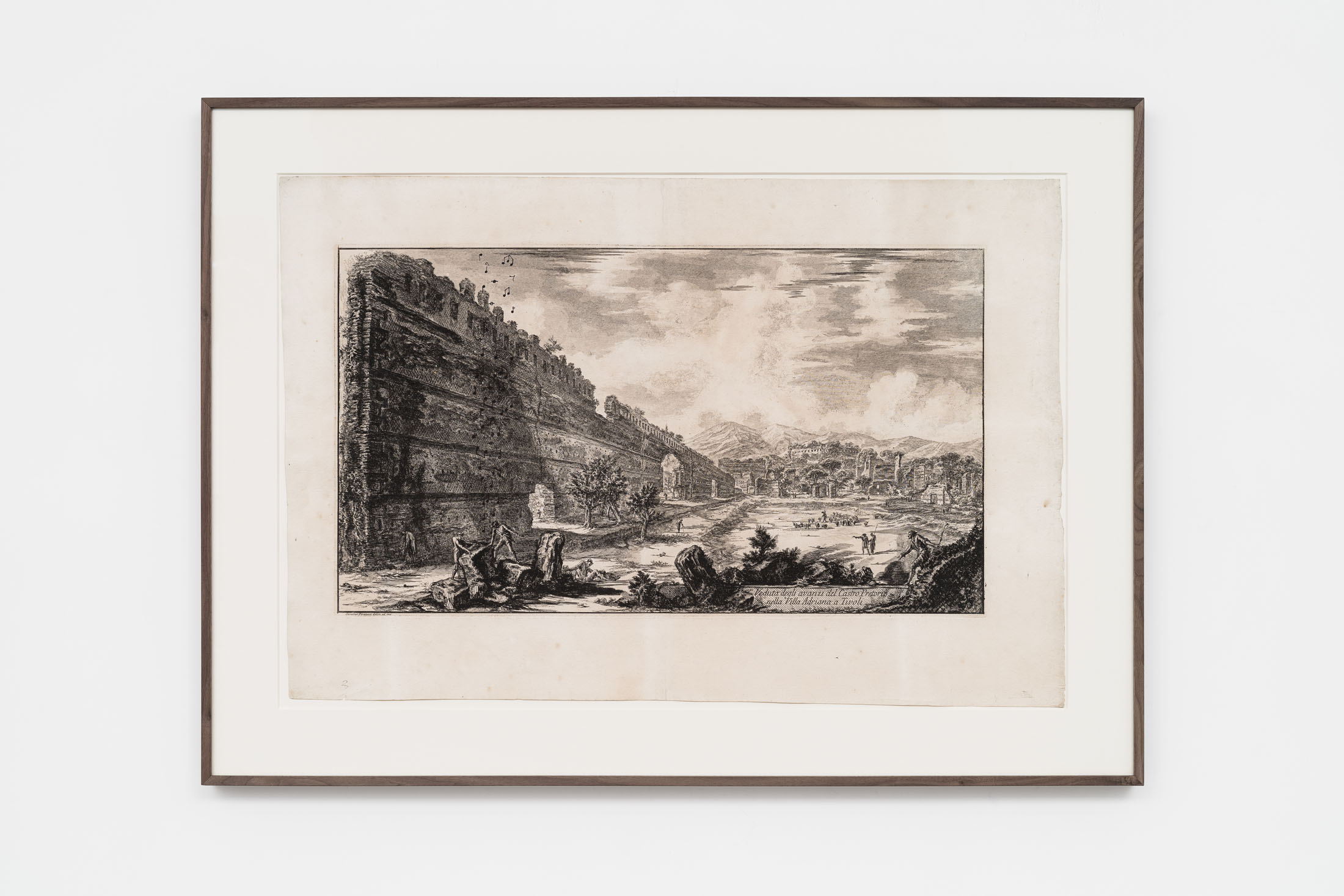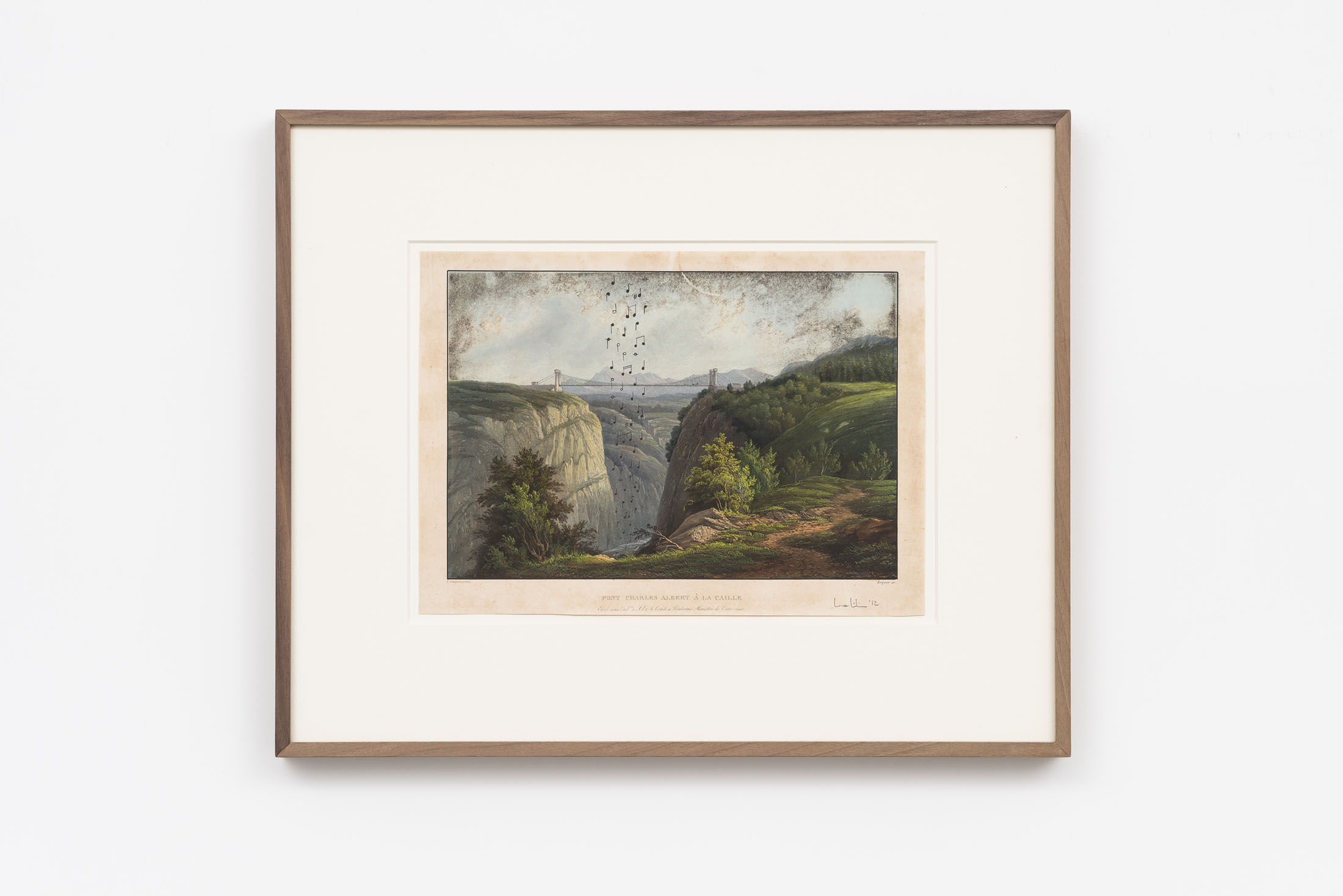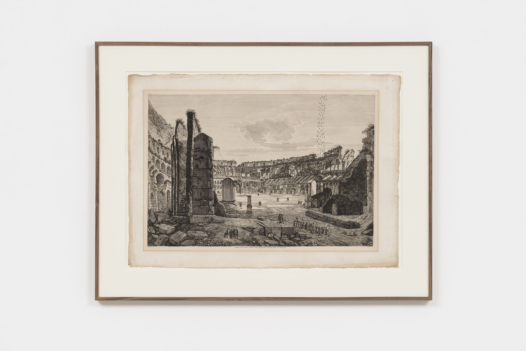 Since the late 1980s, Luca Vitone’s artistic practice has investigated the layered identity of places, exploring their geographical, political, social, and poetic dimensions. His works often take the form of conceptual portraits of places, constructed with site-specific materials, dust, pigments, maps, sounds, that embody memory, tensions, and transformations. The Capricci series, initiated in 2005, continues along this trajectory, unfolding around prints, engravings, lithographs, and period postcards by various authors – from Giovanni Battista Piranesi to Alexandre Calame, Félix Benoist, Giovanni Volpato, Giuseppe Vasi, Pierre Mortier, and other anonymous artists – which Vitone transforms through the addition of musical notes drawn in ink.