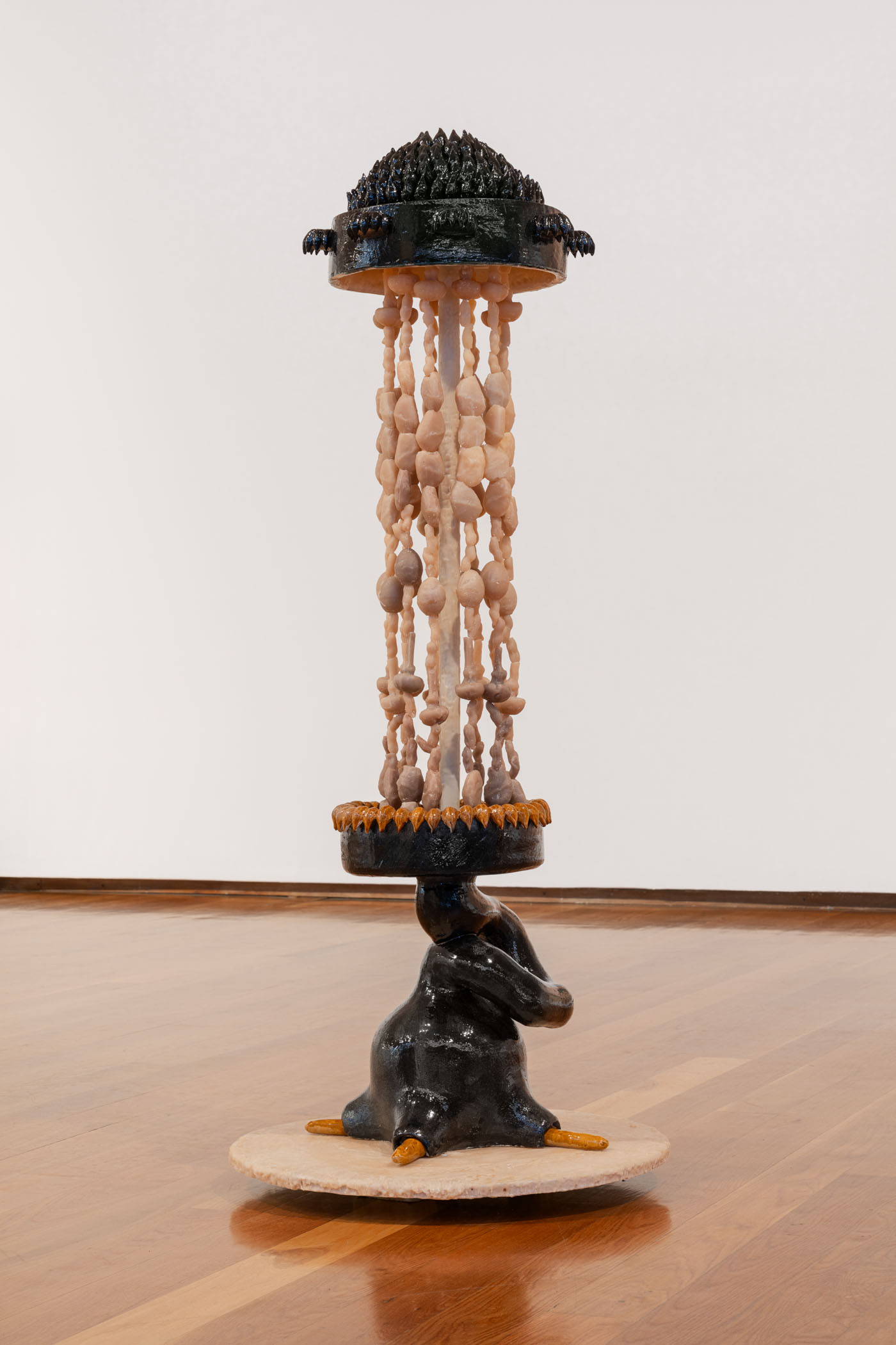 Sara Bichão’s (Lisbon, 1986) practice is infused empathy and care. Made with found and repurposed materials, her sculptures are lovingly assembled to form new relationships between objects that transcend time, as well as social and cultural constructs. Each piece is a patchwork of assorted materials, interwoven with a layering of their varied histories, which are strengthened by their togetherness. Although the objects and forms in her sculptures may at times be recognizable, their thoughtful reworking conjures otherworldly imaginaries, transporting us to a mythical realm where hierarchies dissolve and new characters and energies emerge.