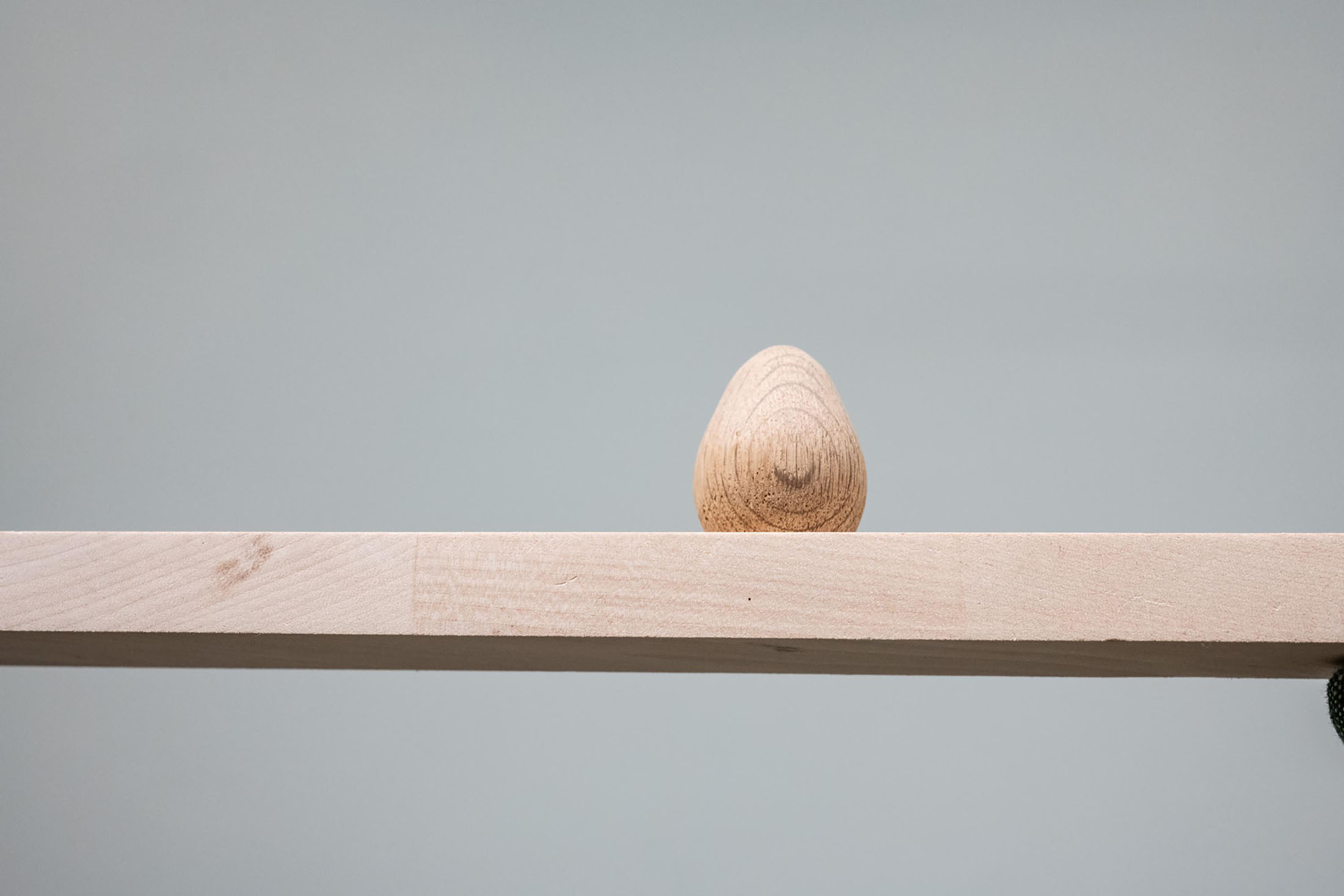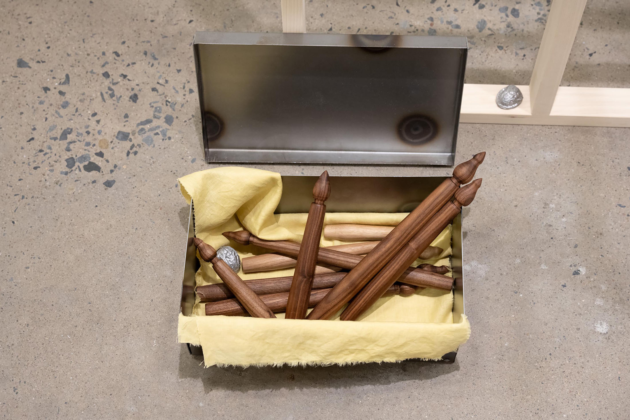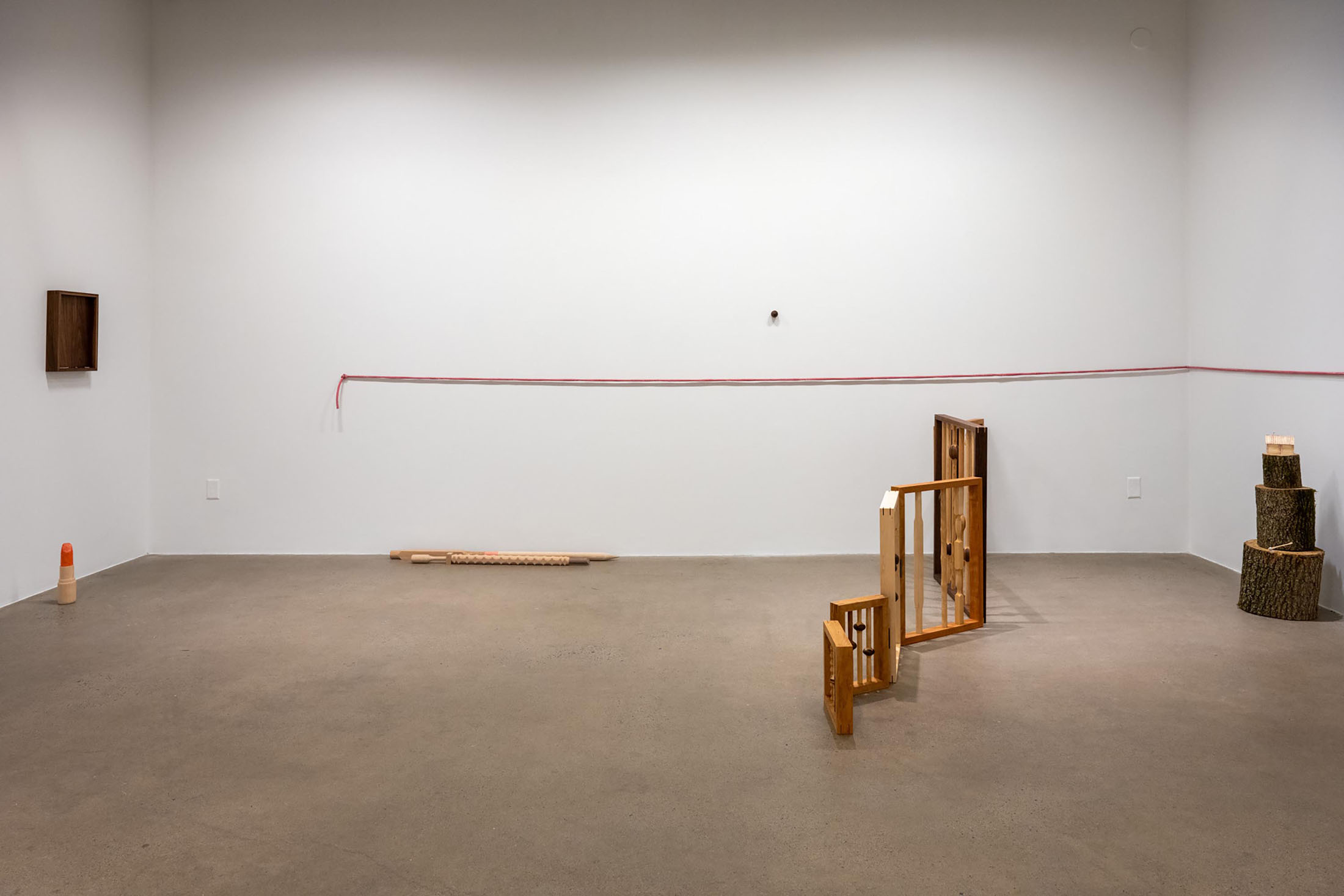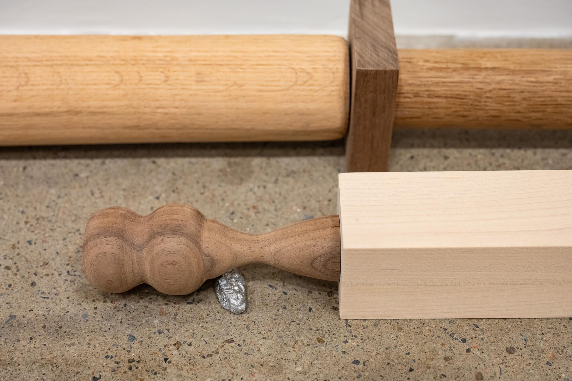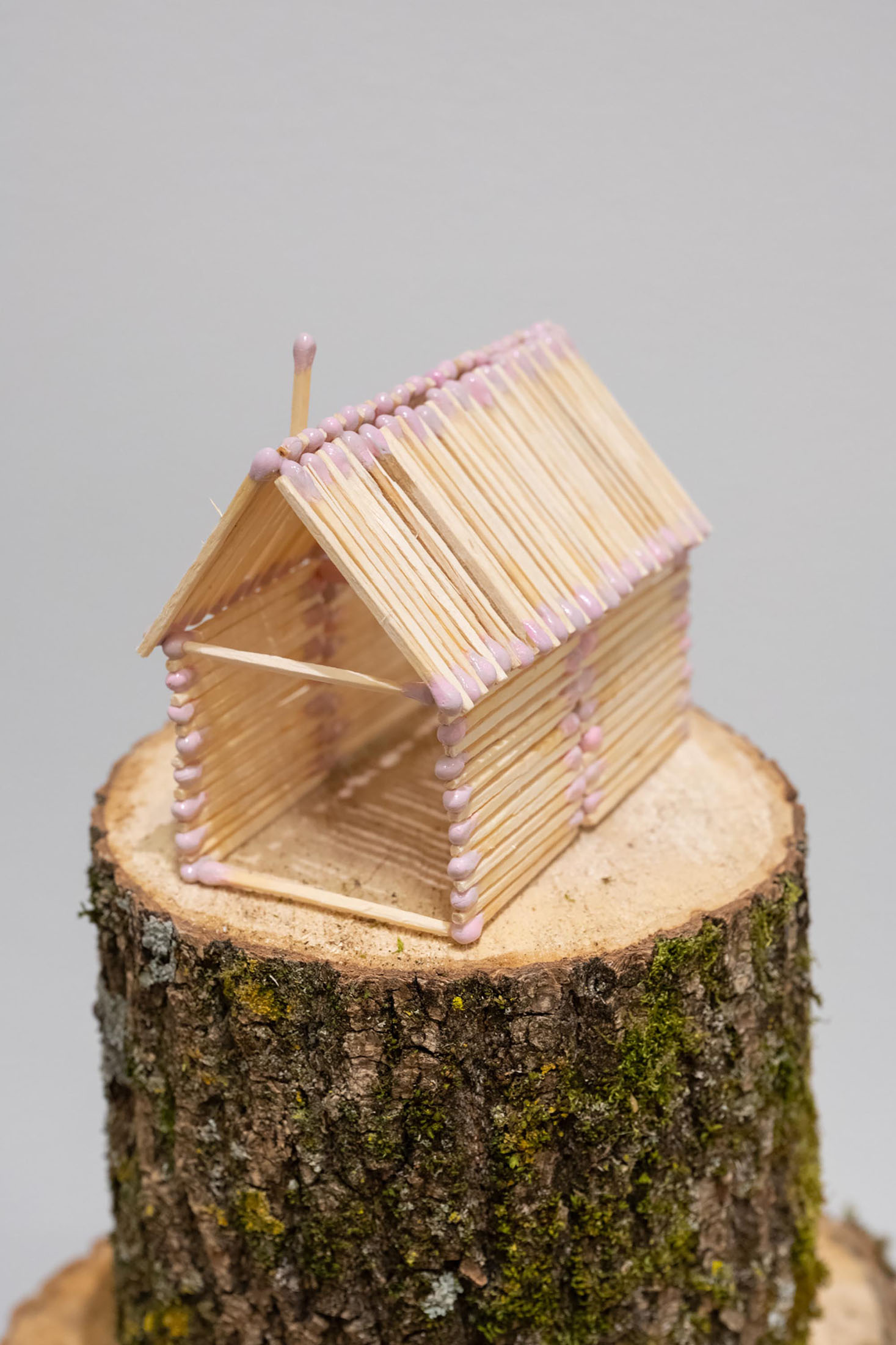 From this intimacy with wood emerges mimesis. The artist conjures up several familiar shapes: nut, axle, lipstick, pencils, matches, emergency ladder. Some faithful to their proportions, others exaggerated or reduced, these replicas destabilize our bearings and sway our sense of reality. Inspired by her children, who learn by imitating, McNeely reveals our ability to reproduce, but also warp the world around us. In a universe skewered by ecogrief, her sculptures become attempts at making connections and inventing anchor points in the midst of instability.