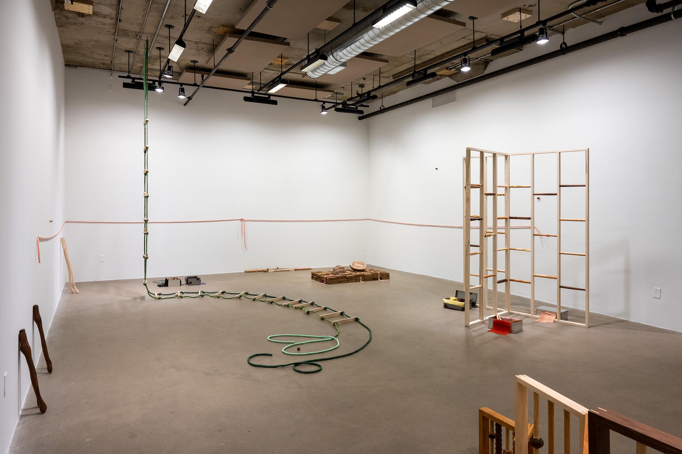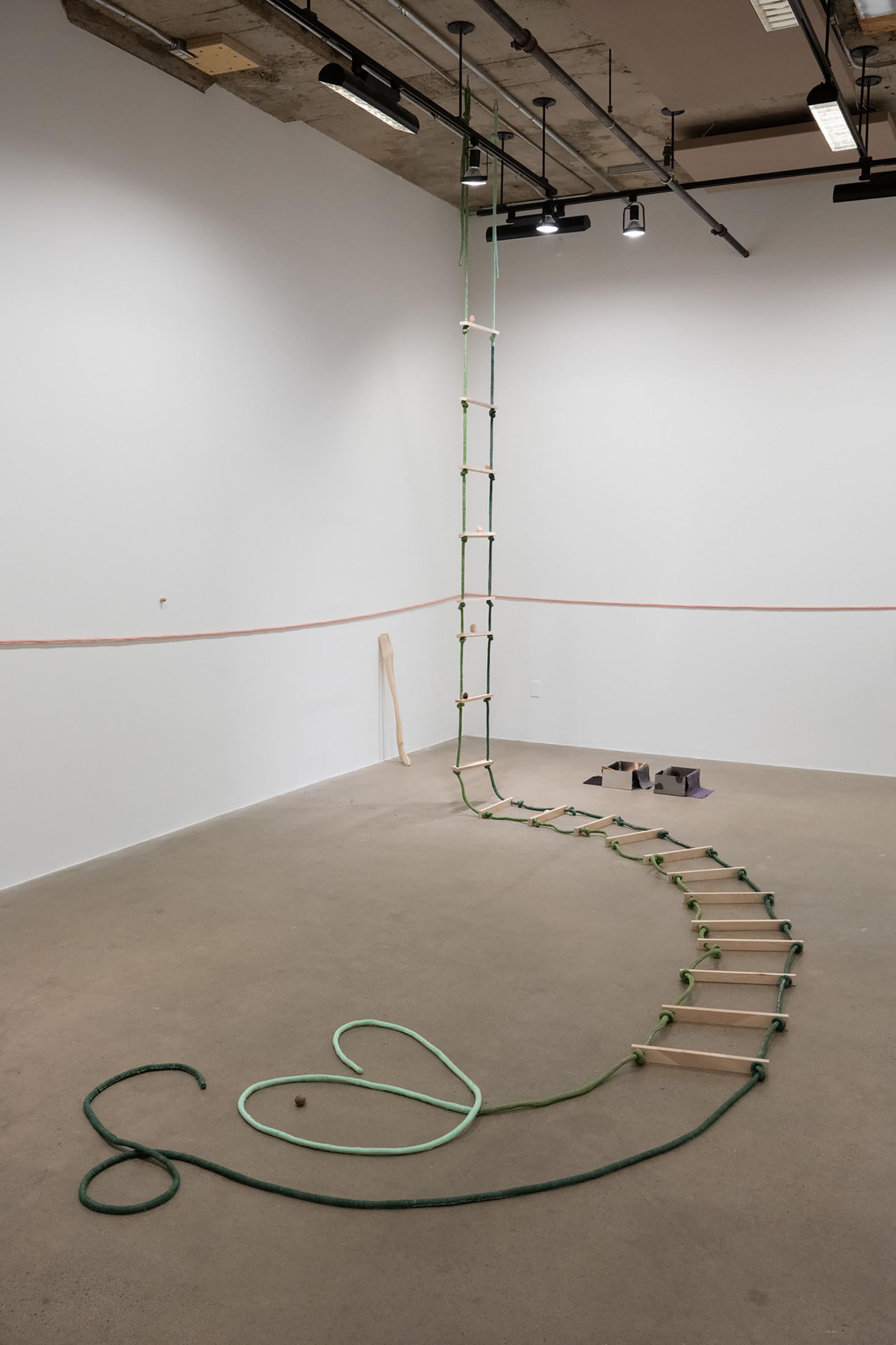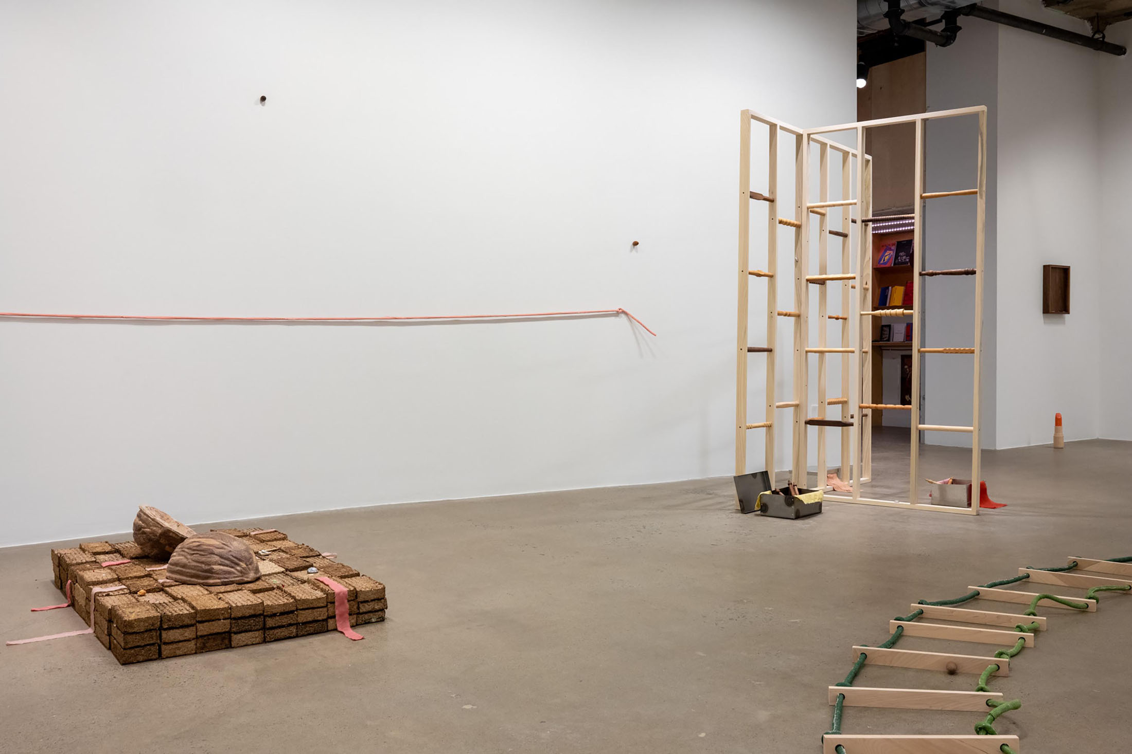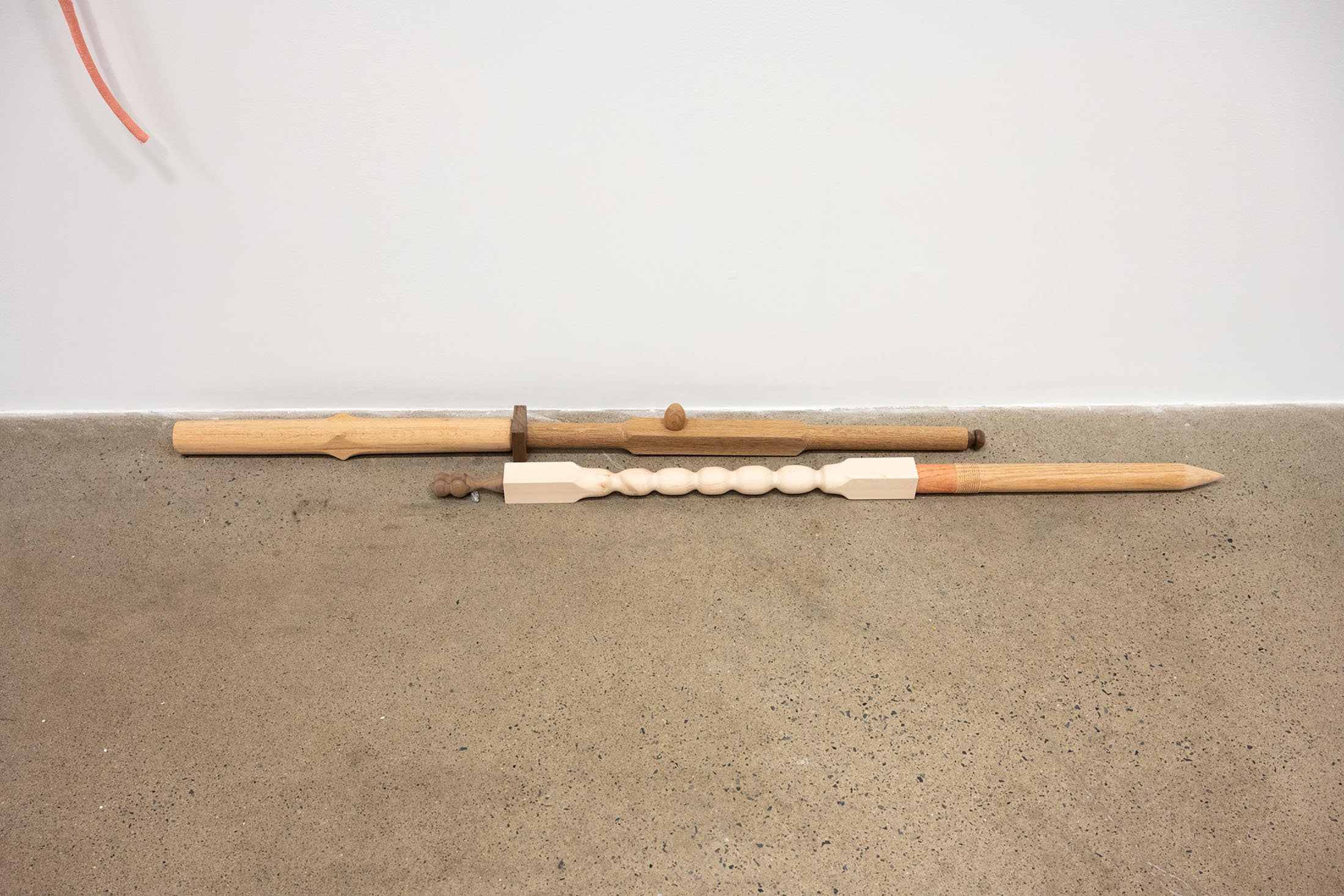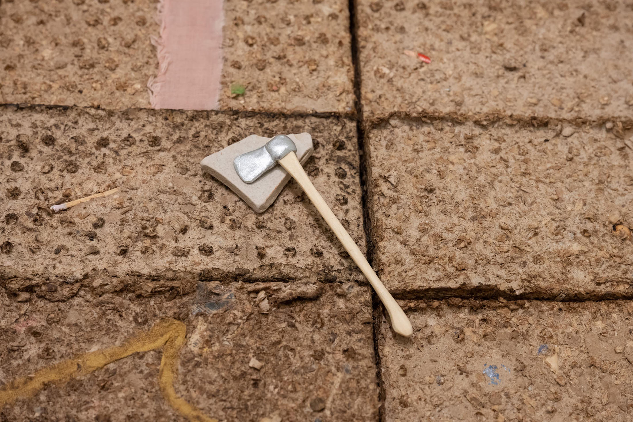 From this intimacy with wood emerges mimesis. The artist conjures up several familiar shapes: nut, axle, lipstick, pencils, matches, emergency ladder. Some faithful to their proportions, others exaggerated or reduced, these replicas destabilize our bearings and sway our sense of reality. Inspired by her children, who learn by imitating, McNeely reveals our ability to reproduce, but also warp the world around us. In a universe skewered by ecogrief, her sculptures become attempts at making connections and inventing anchor points in the midst of instability.