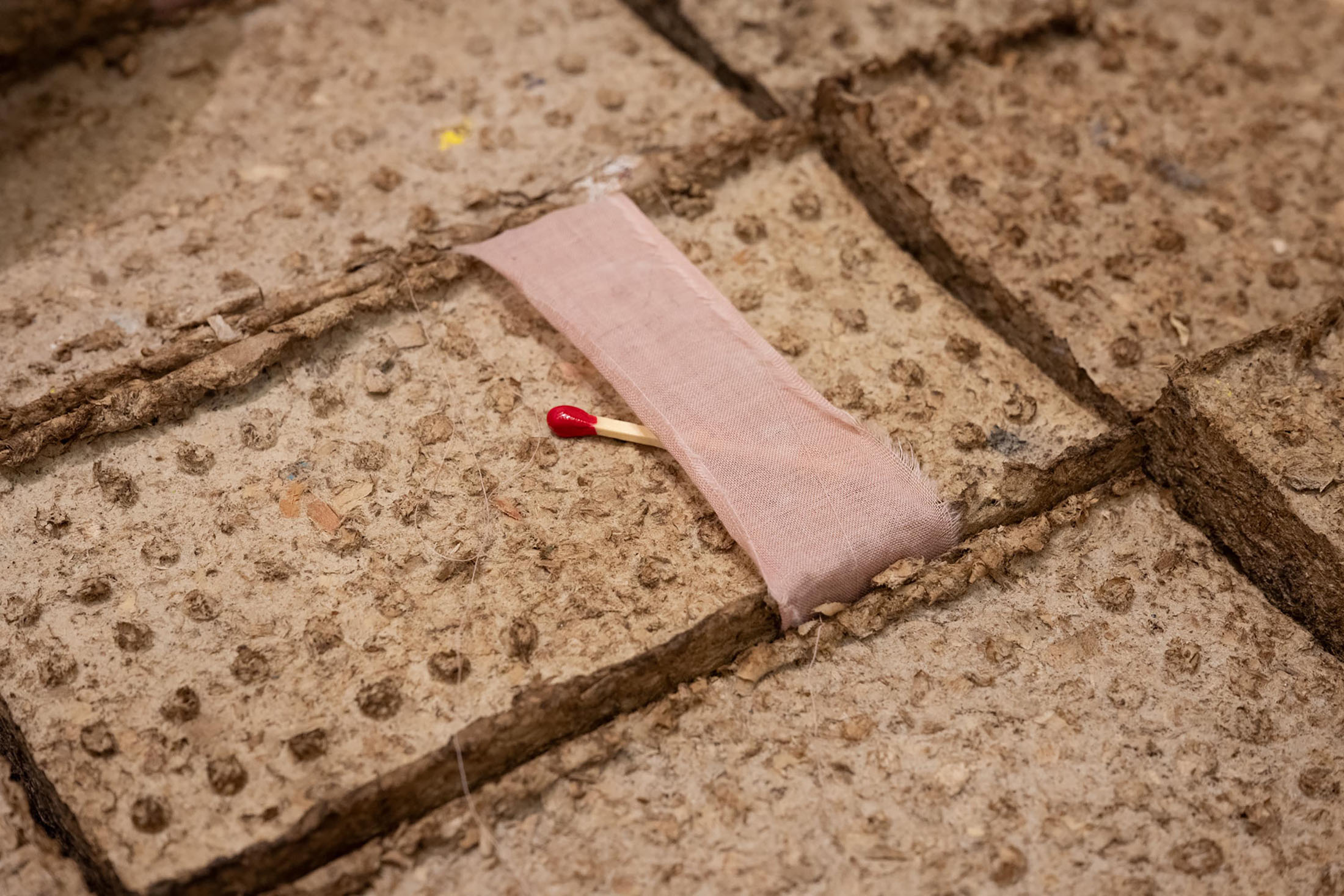 The evocation of shelter is further summoned by the brick motif. The artist has crafted over a hundred briquettes from the debris of her sculptures and found materials. Each fragment collected participates in a cycle of continuous circulation and transformation, where resources are renewed and generate abundance. These bricks then become time capsules: they preserve traces of her life shared with her family and friends playing, sculpting, eating, exchanging – simple acts of survival and support. Assembled, these memories archived in the material lay the foundations for a comforting nest.