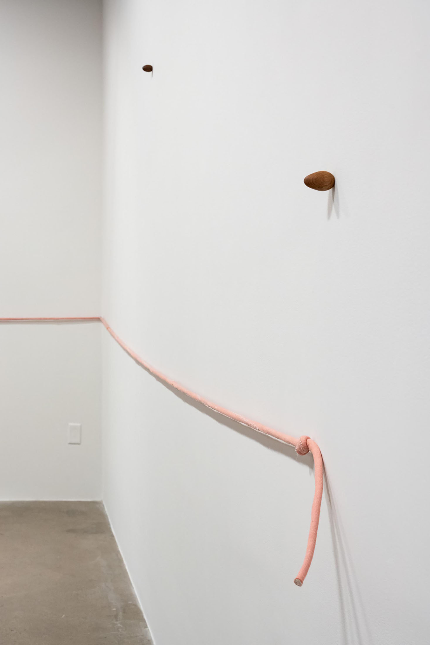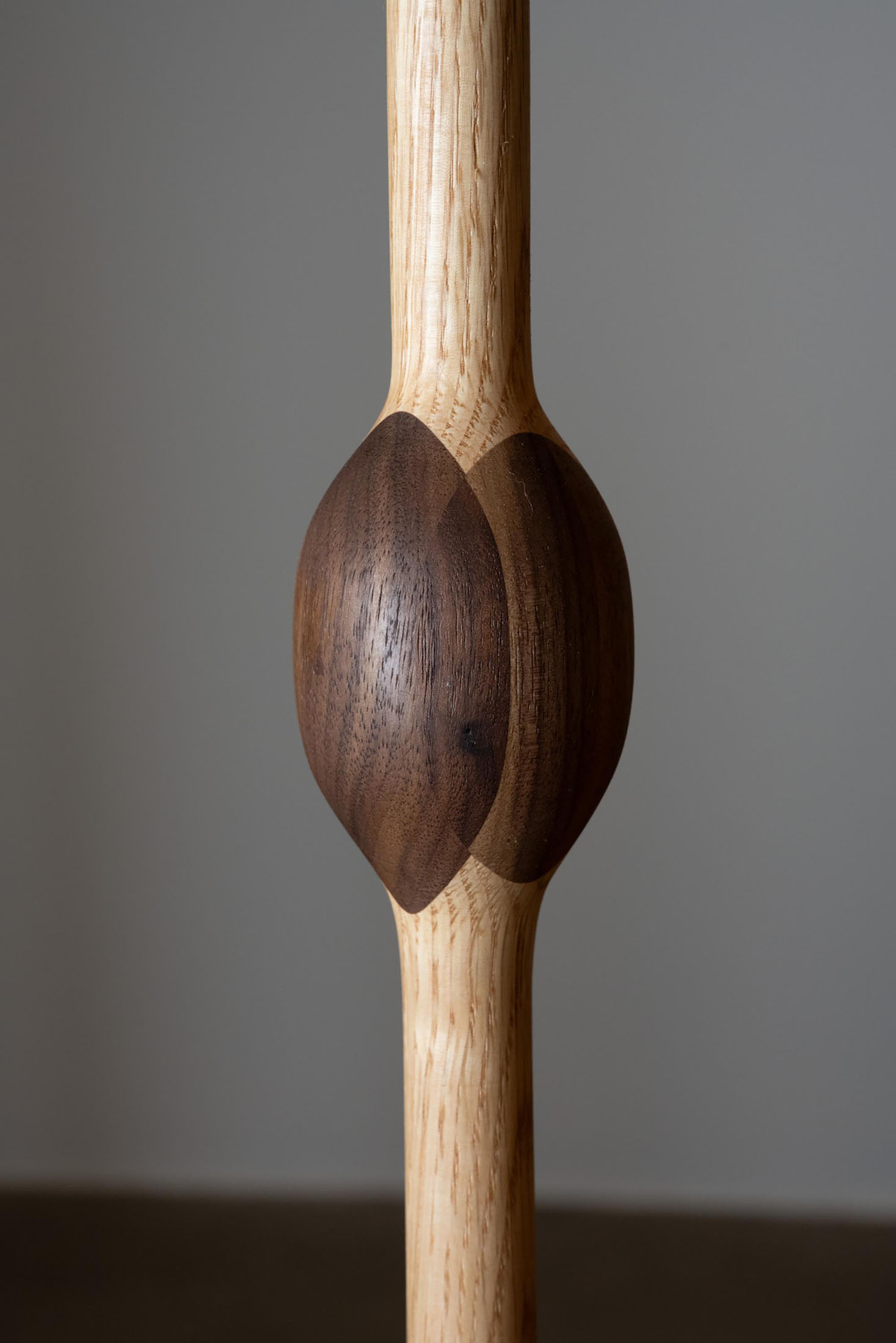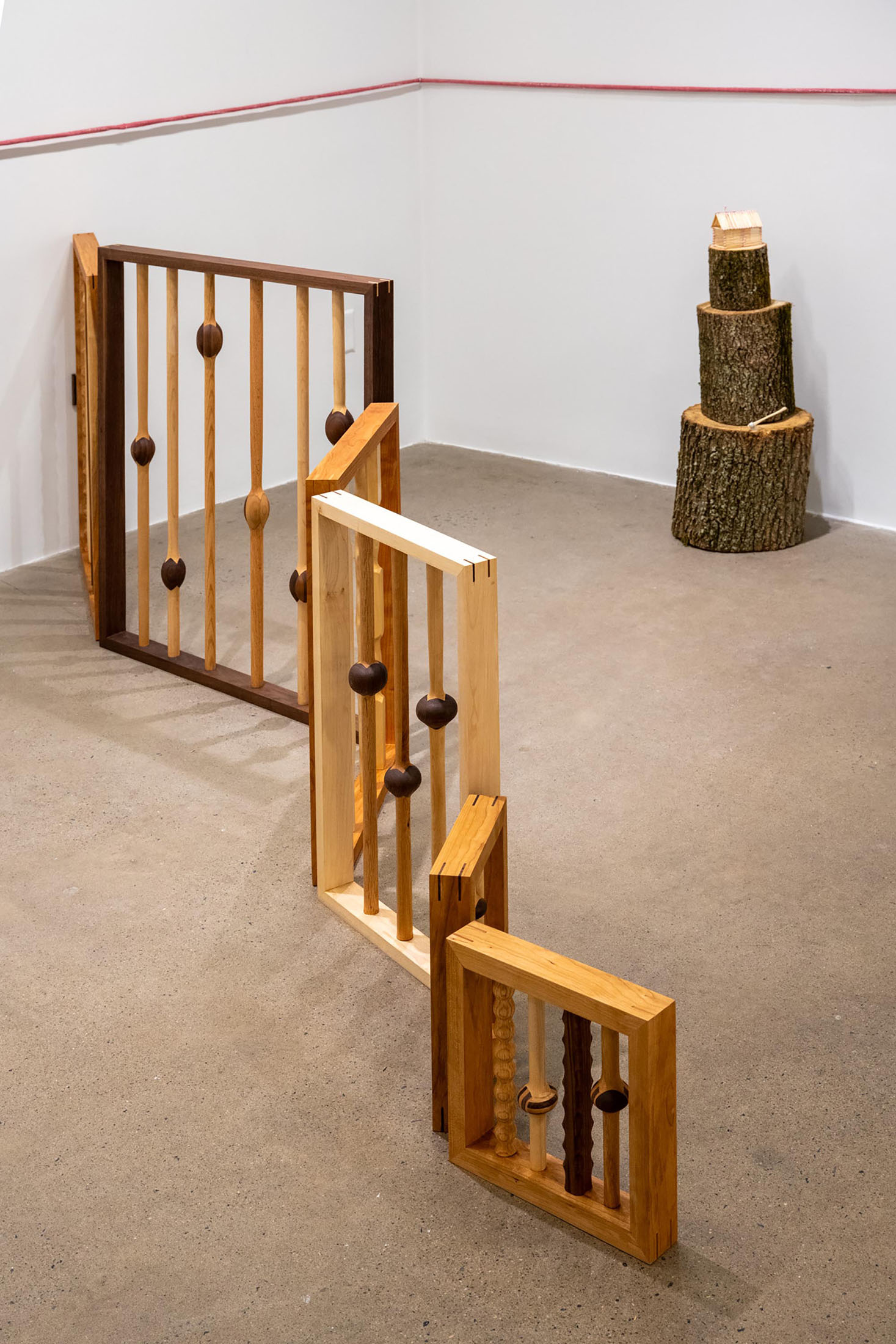 By observing our homes, we can notice the link between our dwellings and the forest. Behind our walls, hidden trees turned into beams – separating the interior from the exterior – create a structure that is both secure and constraining. Maddie McNeely brings these contradictions between architectural and natural environments into dialogue in her column sculptures, tracing lines in the wood that are equally straight and organic.