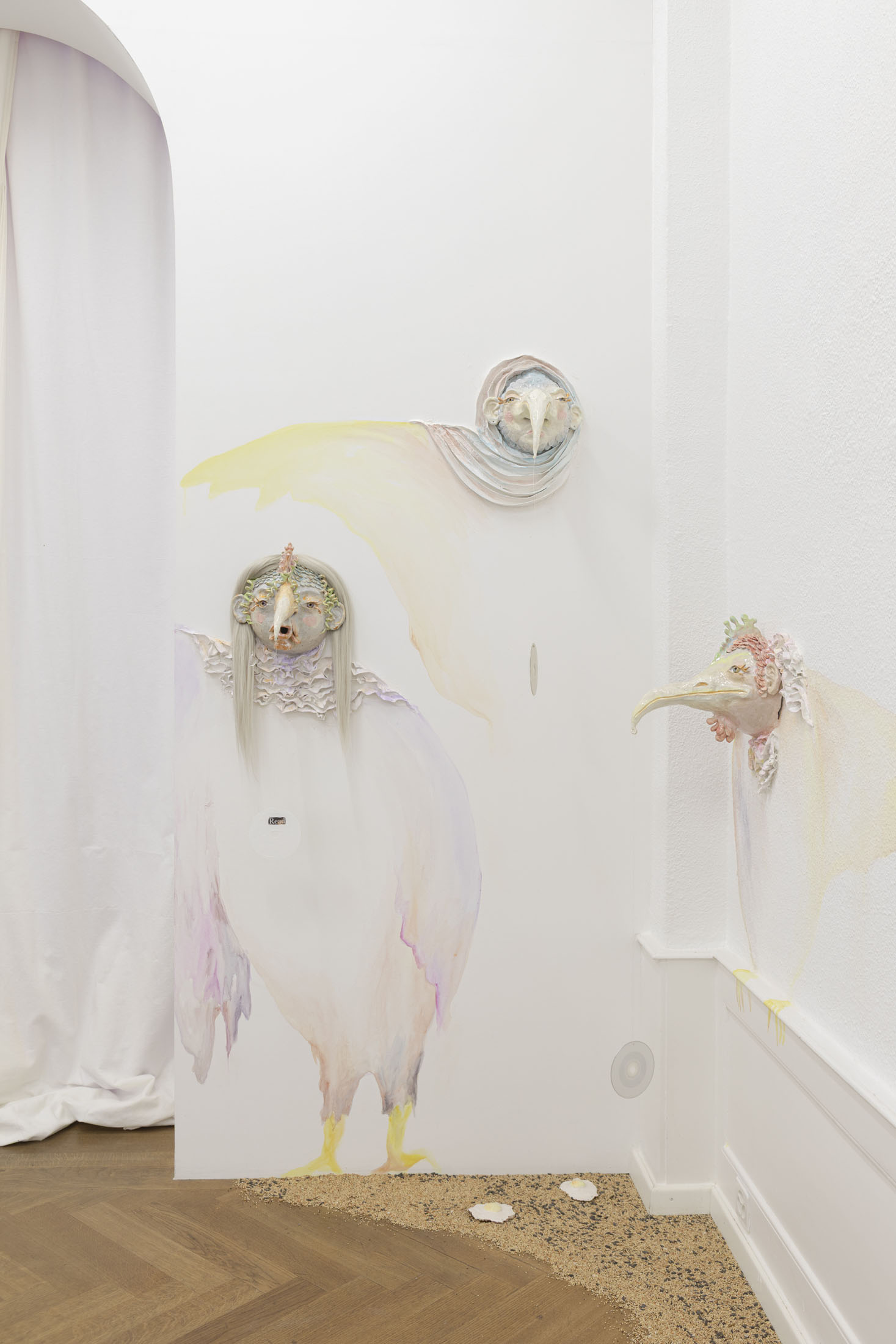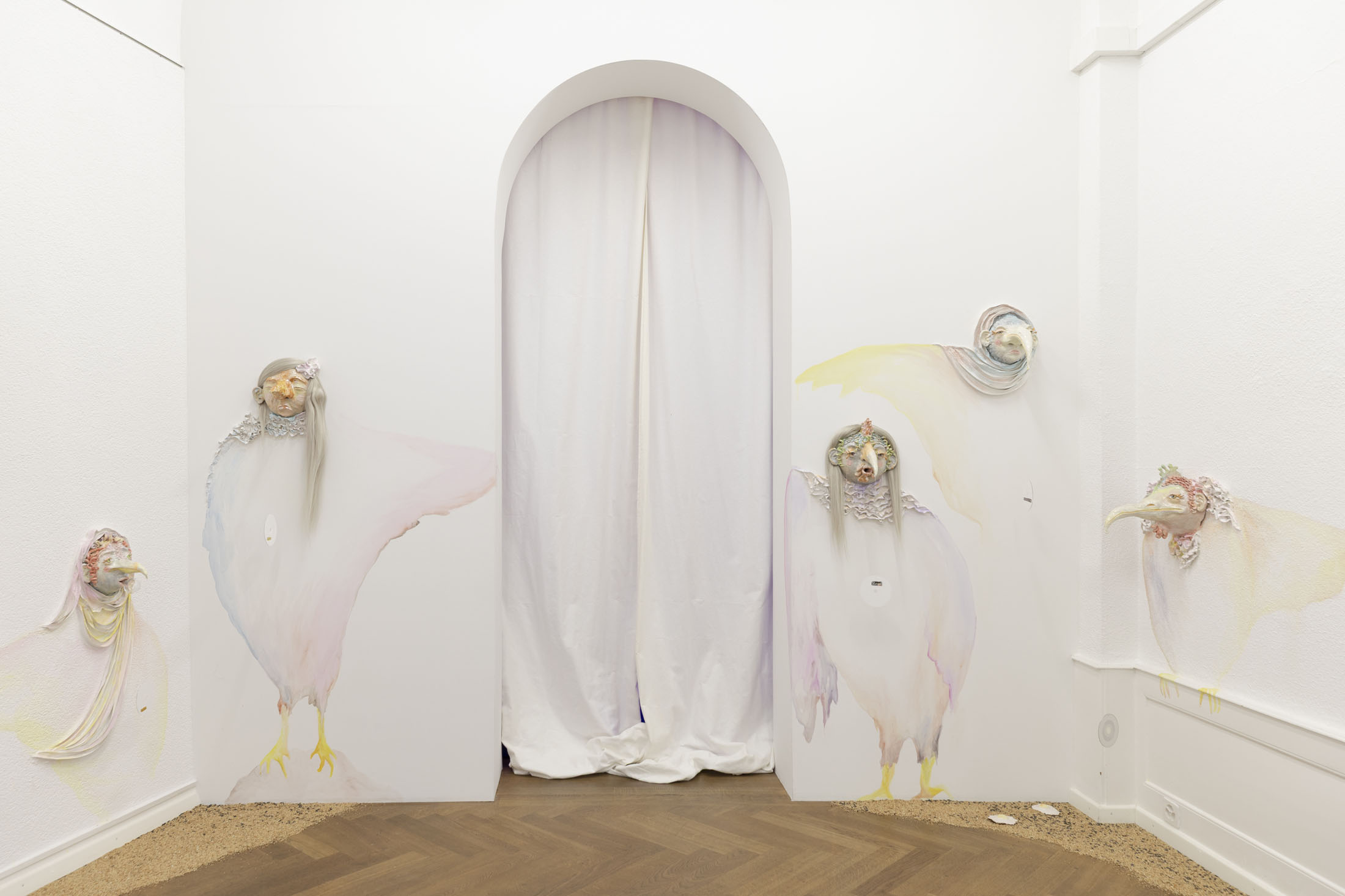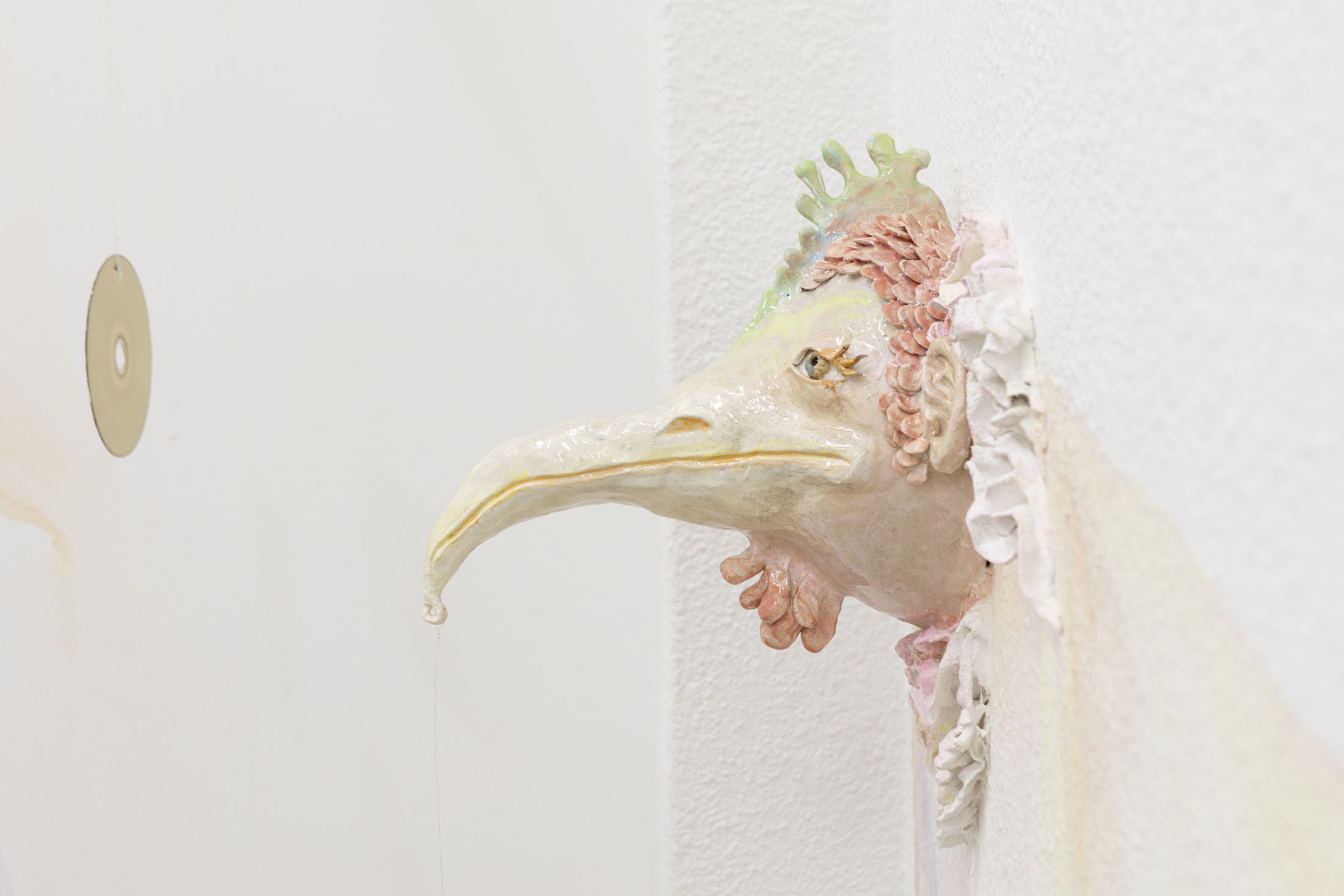 Between birds, gargoyles and (non)recognisable beings, Bycroft’s figures appear hybrid and unfixed. Birds are particularly central to their work: known to be sensitive to environmental and meteorological changes, they are also historically linked to prophecy and close to the gods. The film The Sauce of All Order (2024), made during a residency at the Villa Medici in Rome, operates between myth and fantasy. Unfolding during a sumptuous banquet, the film celebrates the inauguration of character Felix Culpa into the circle of ancient Roman augurs and priests who interpret natural phenomena brought by the flight of birds.