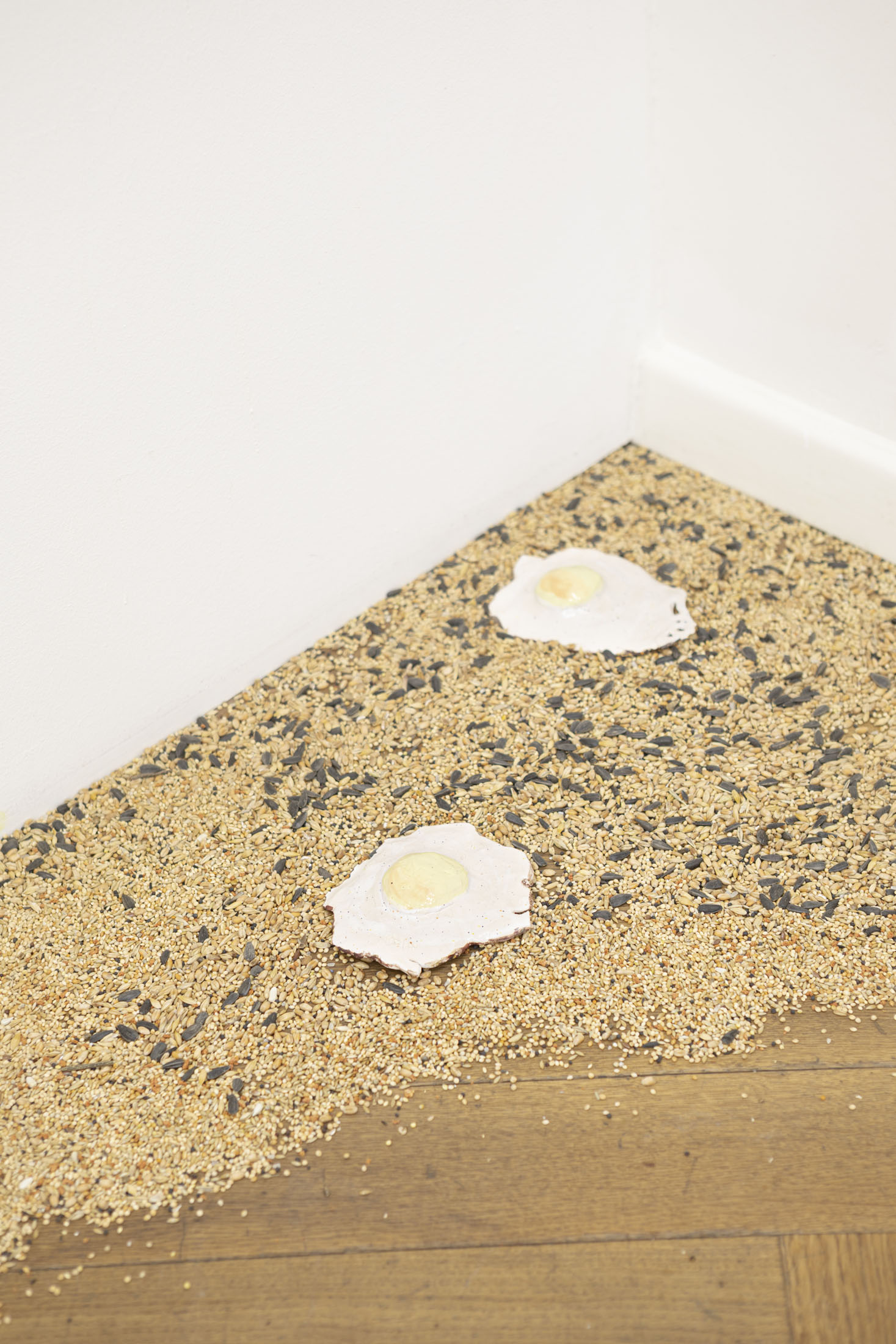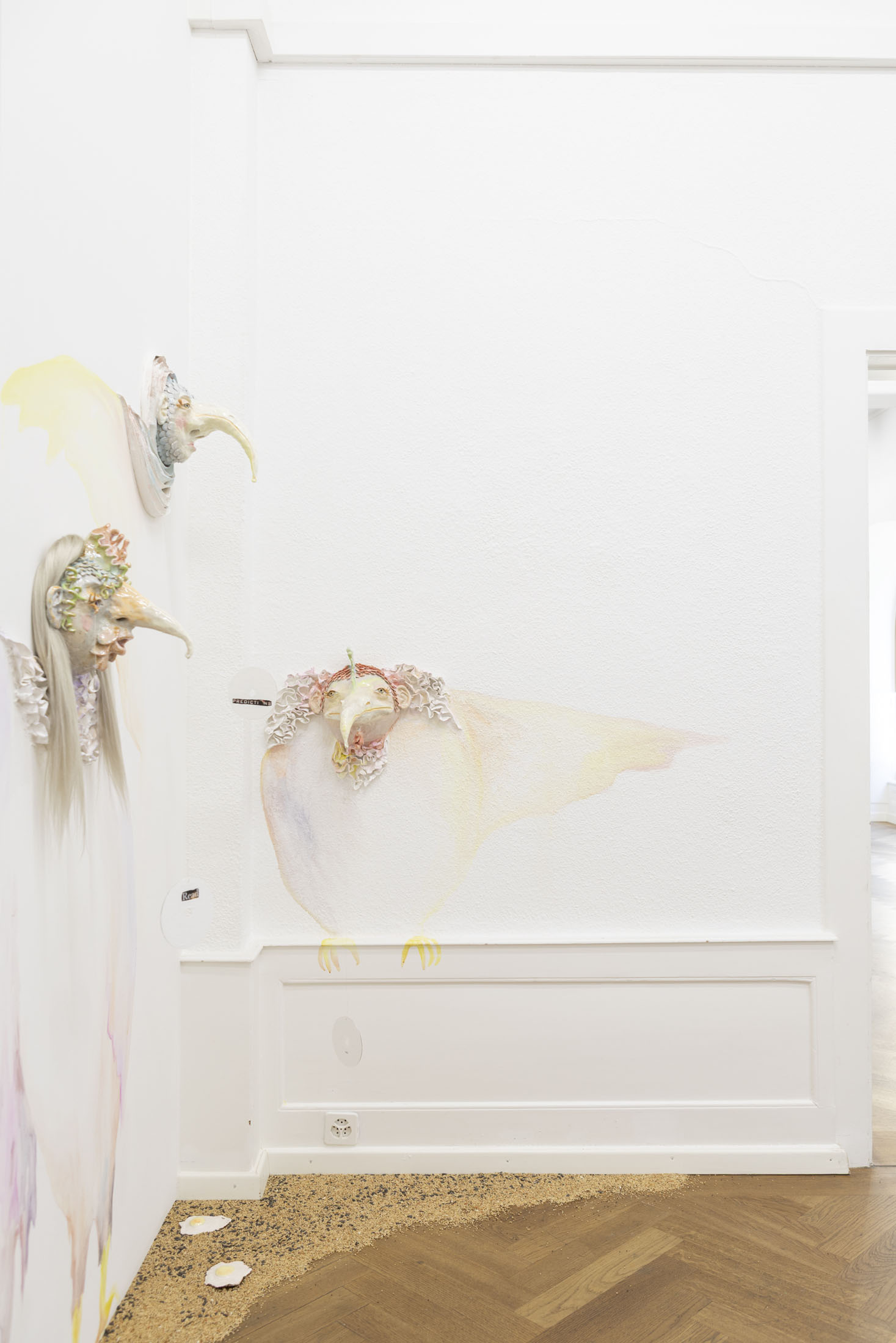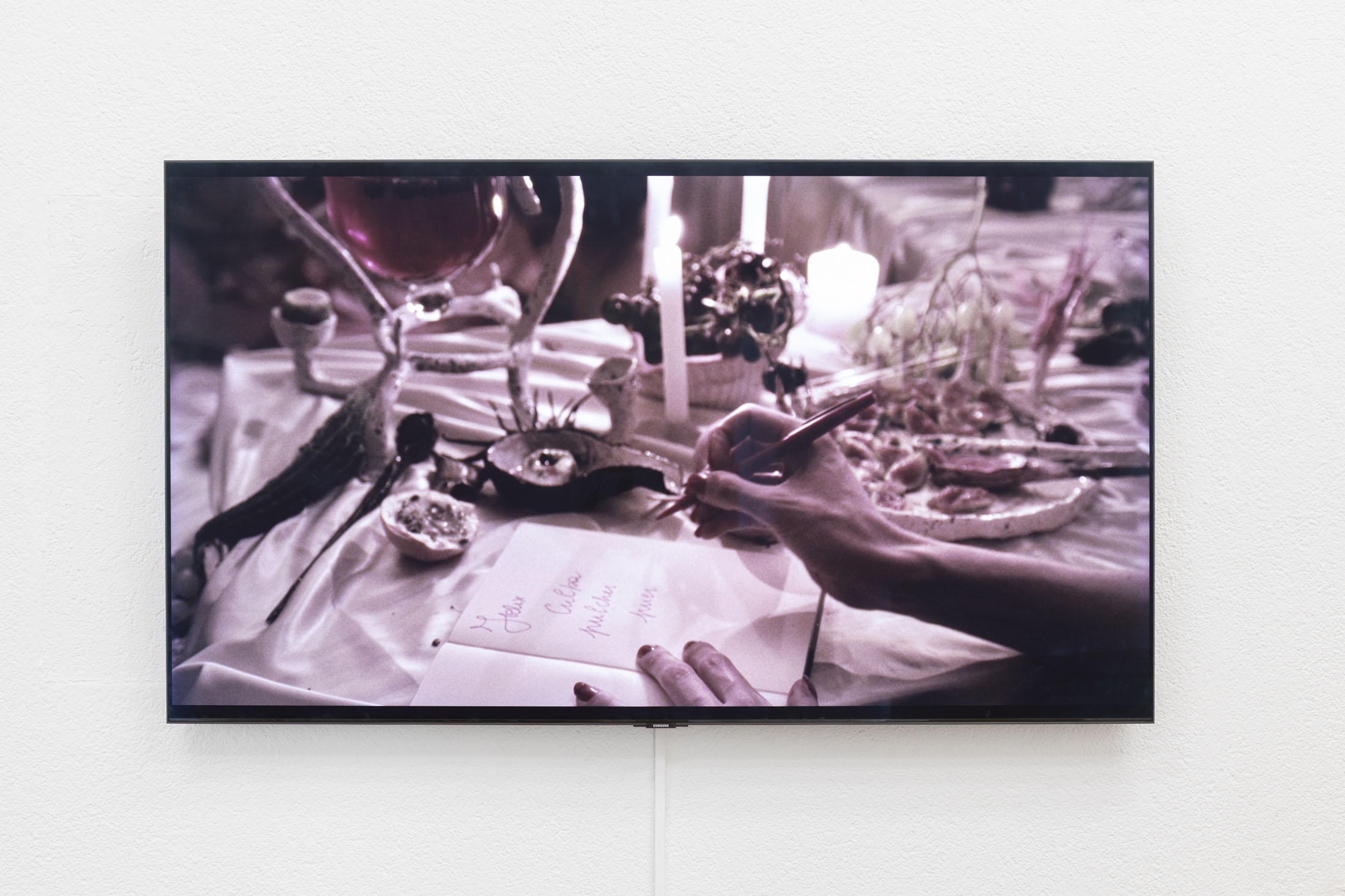 Between birds, gargoyles and (non)recognisable beings, Bycroft’s figures appear hybrid and unfixed. Birds are particularly central to their work: known to be sensitive to environmental and meteorological changes, they are also historically linked to prophecy and close to the gods. The film The Sauce of All Order (2024), made during a residency at the Villa Medici in Rome, operates between myth and fantasy. Unfolding during a sumptuous banquet, the film celebrates the inauguration of character Felix Culpa into the circle of ancient Roman augurs and priests who interpret natural phenomena brought by the flight of birds.