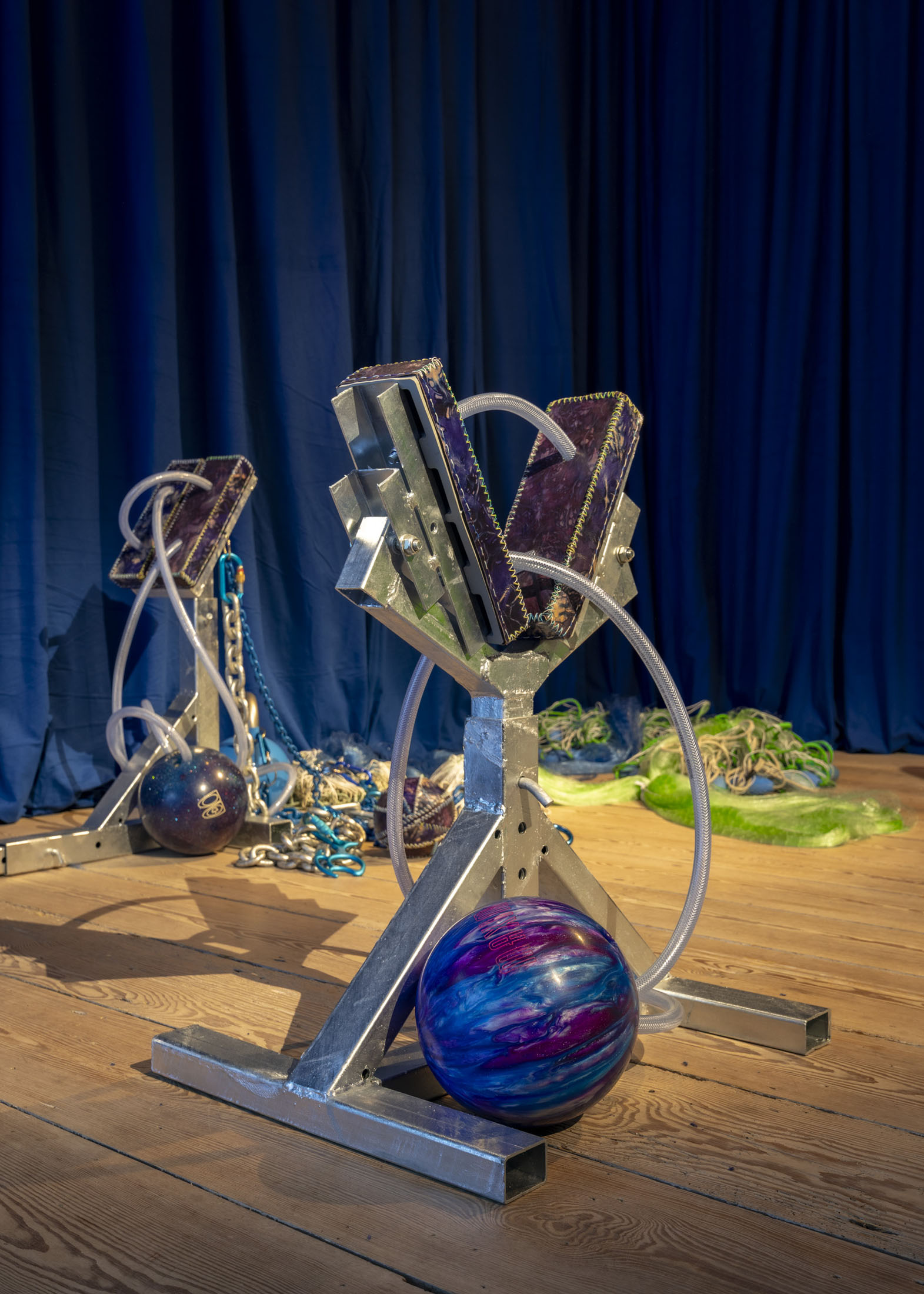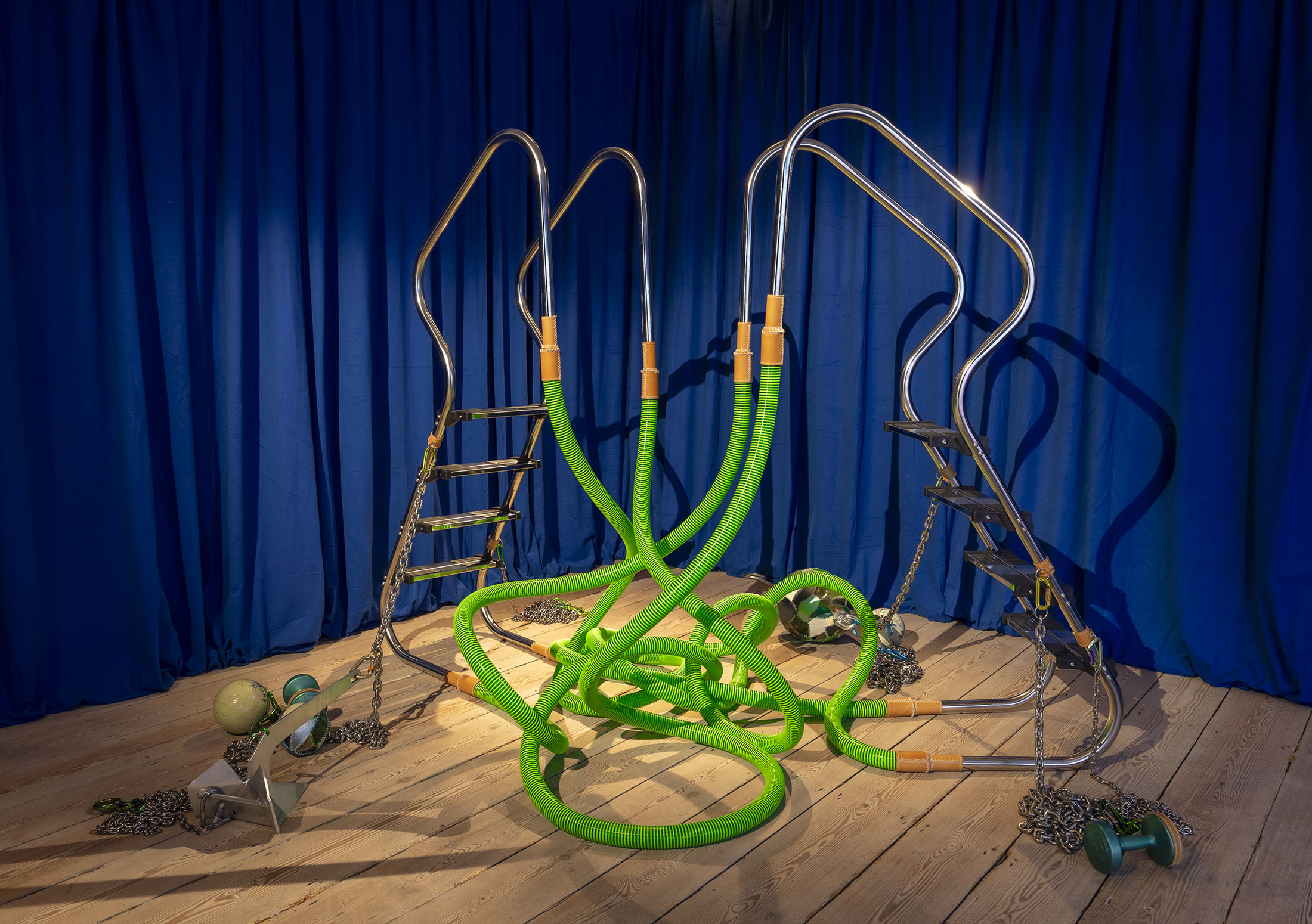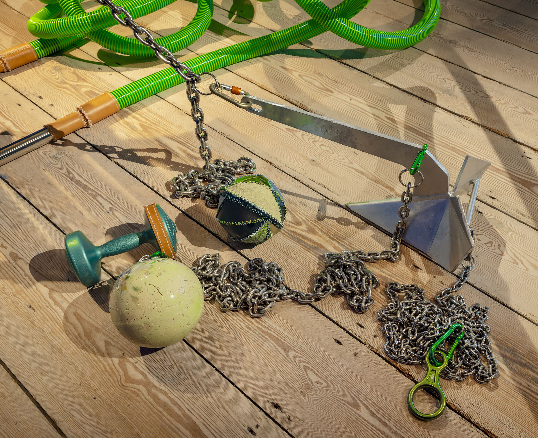 In all the works, different parts are connected by hoses and chains that simultaneously form solid circuits and nervous entanglements. Each sculpture maintains a quiet yet dramatic tension between something upward-striving and buoyant, and something heavy and anchoring – with weights, carabiners, and unbreakable chains – precisely capturing the ambiguous zone around the surface of the water. The symmetrical, psychosomatic sculptural bodies lean into and away from each other, simultaneously dependent and independent. They can scream “No, I DON’T WANNA FALL IN LOVE!!!” as much as they want.