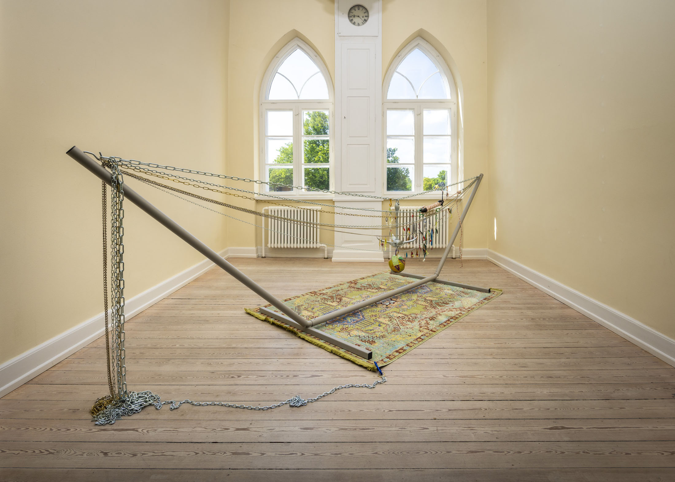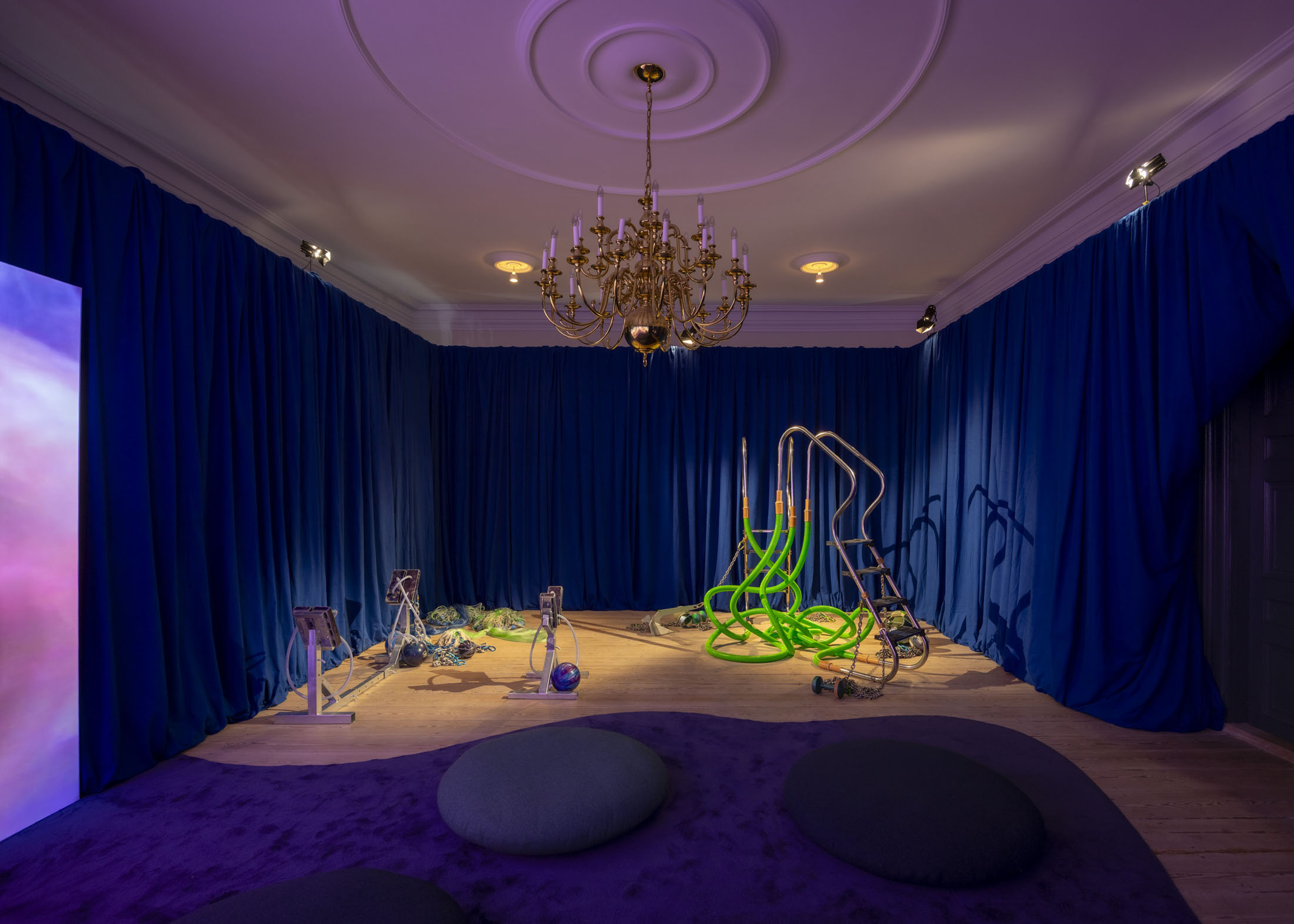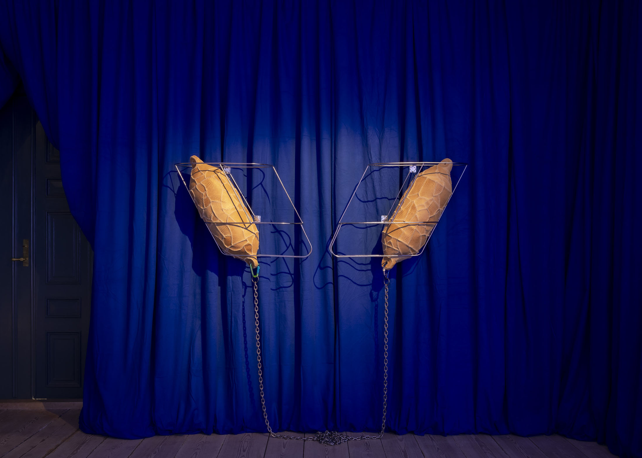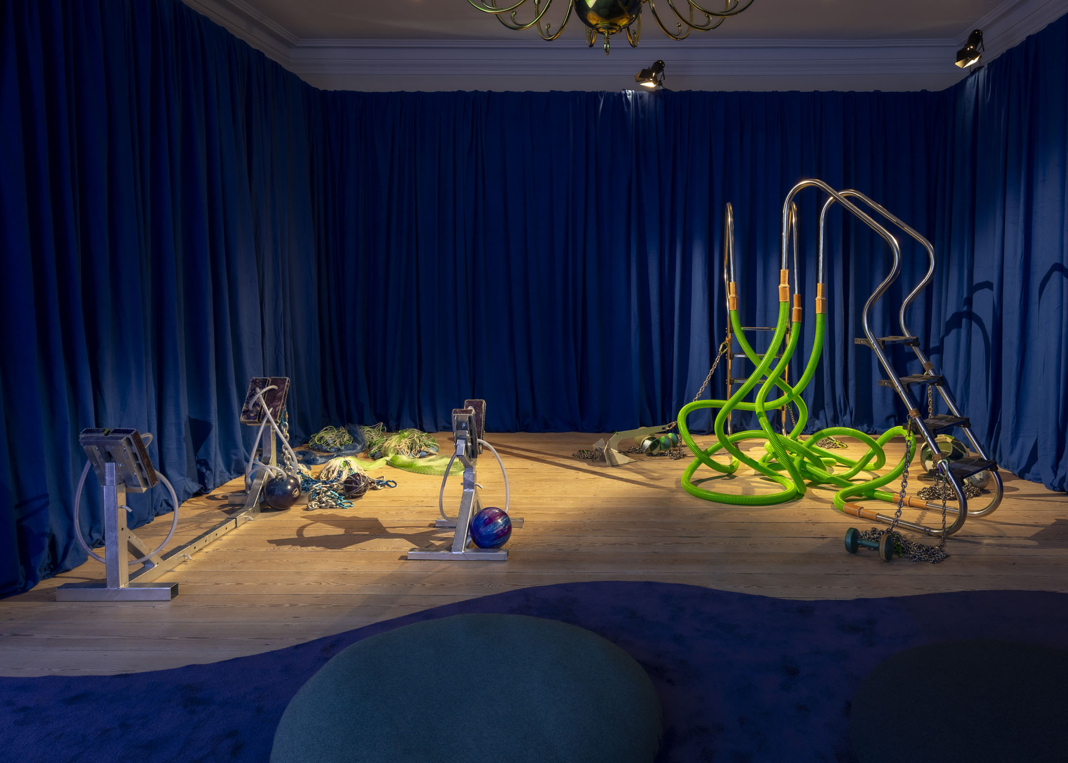 In all the works, different parts are connected by hoses and chains that simultaneously form solid circuits and nervous entanglements. Each sculpture maintains a quiet yet dramatic tension between something upward-striving and buoyant, and something heavy and anchoring – with weights, carabiners, and unbreakable chains – precisely capturing the ambiguous zone around the surface of the water. The symmetrical, psychosomatic sculptural bodies lean into and away from each other, simultaneously dependent and independent. They can scream “No, I DON’T WANNA FALL IN LOVE!!!” as much as they want.