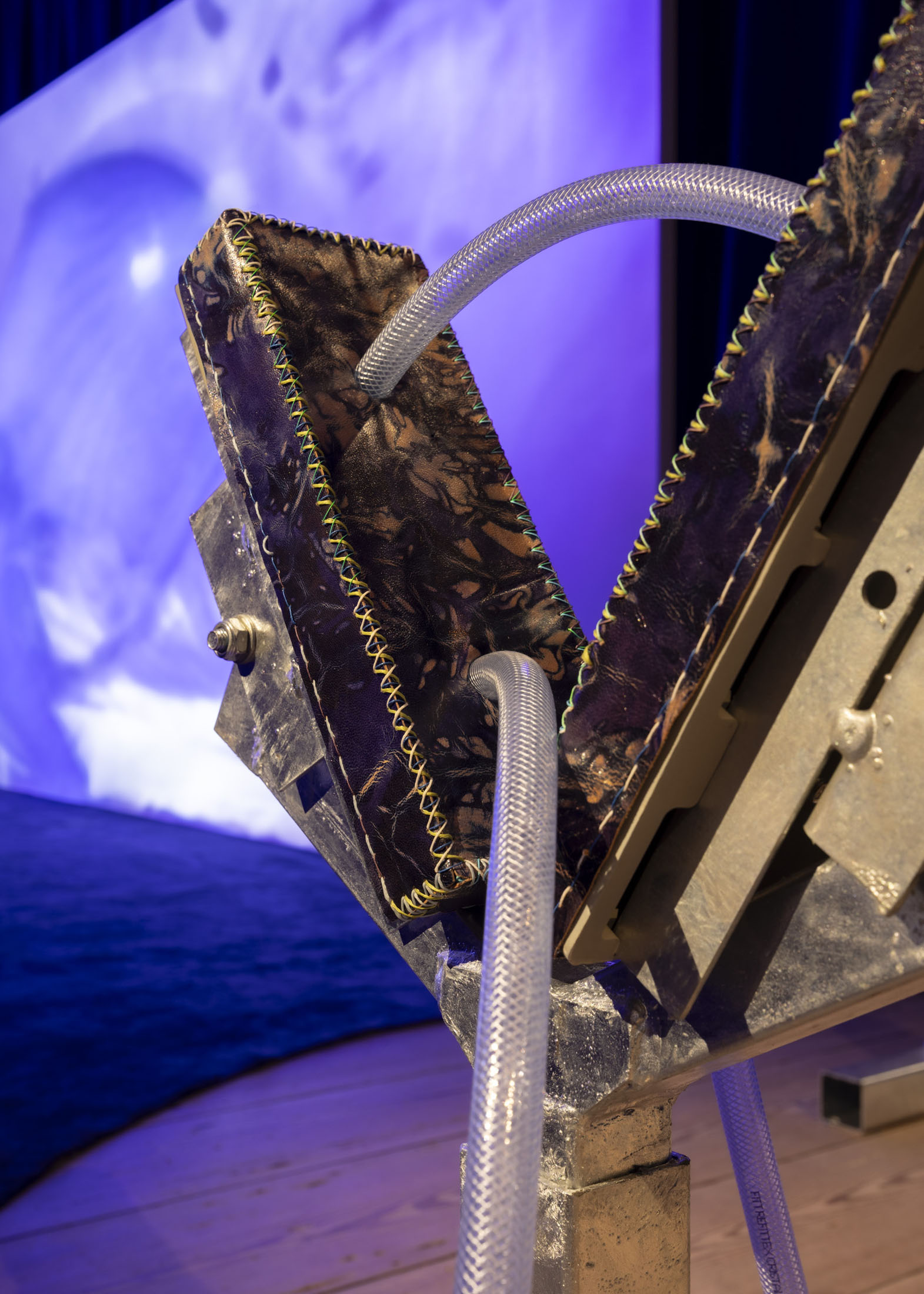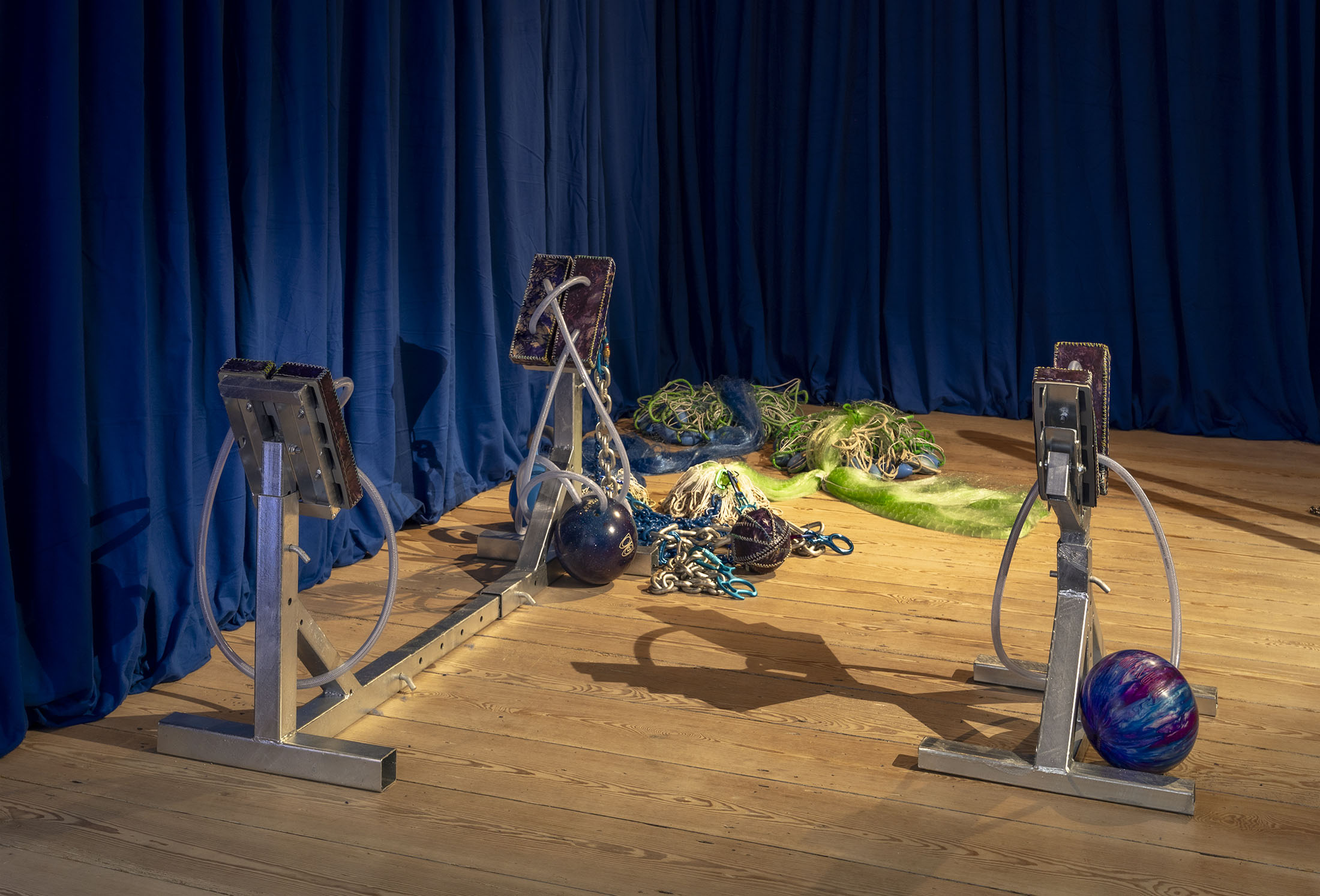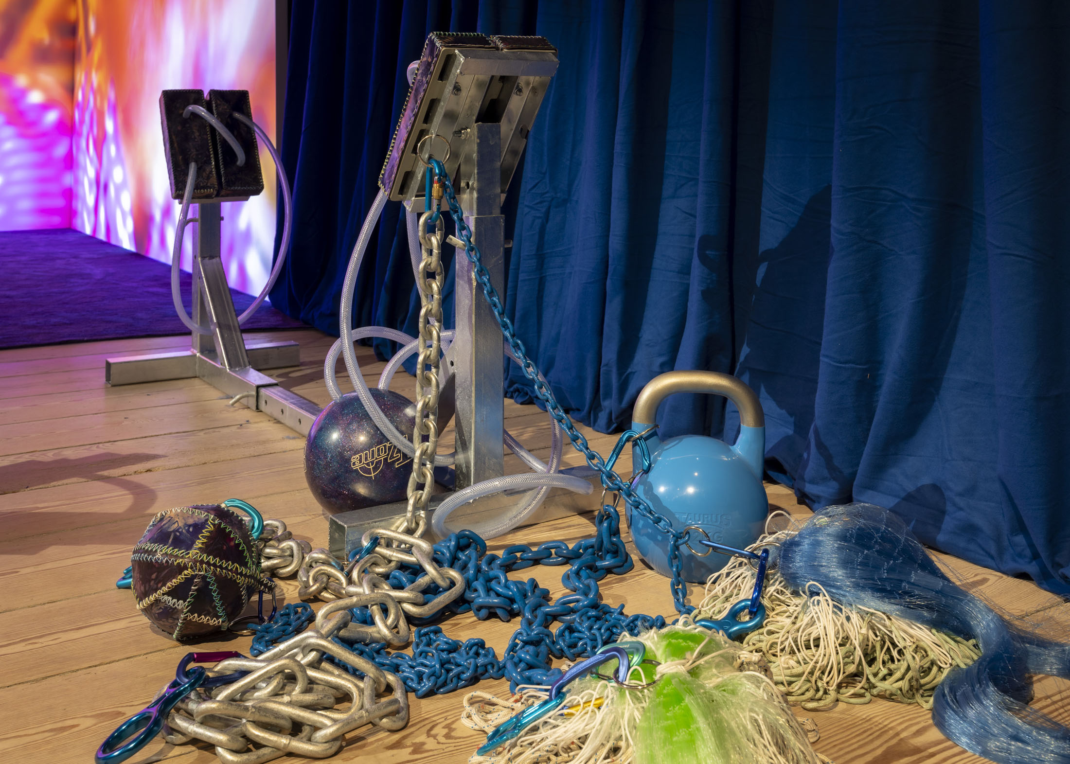 In Sip My Ocean, two identical video sequences are mirrored in a corner, creating the effect of a colourful Rorschach plate in motion. Mirroring is also a fundamental principle and leitmotif in the exhibition’s three new works by Maiken Bent, all of which are based on familiar objects connected to water. Water-related objects and their broad symbolic scope are a consistent feature throughout Bent’s practice, where the sculptural starting point is always pre-existing objects sourced from hardware stores, sports shops, or marine equipment stores. The emotional potential of the everyday objects is analysed and released through subsequent adaptations and combinations with other objects, resulting in condensed statements where objects familiar to us and our bodies approach us anew with surprising psychological depth.