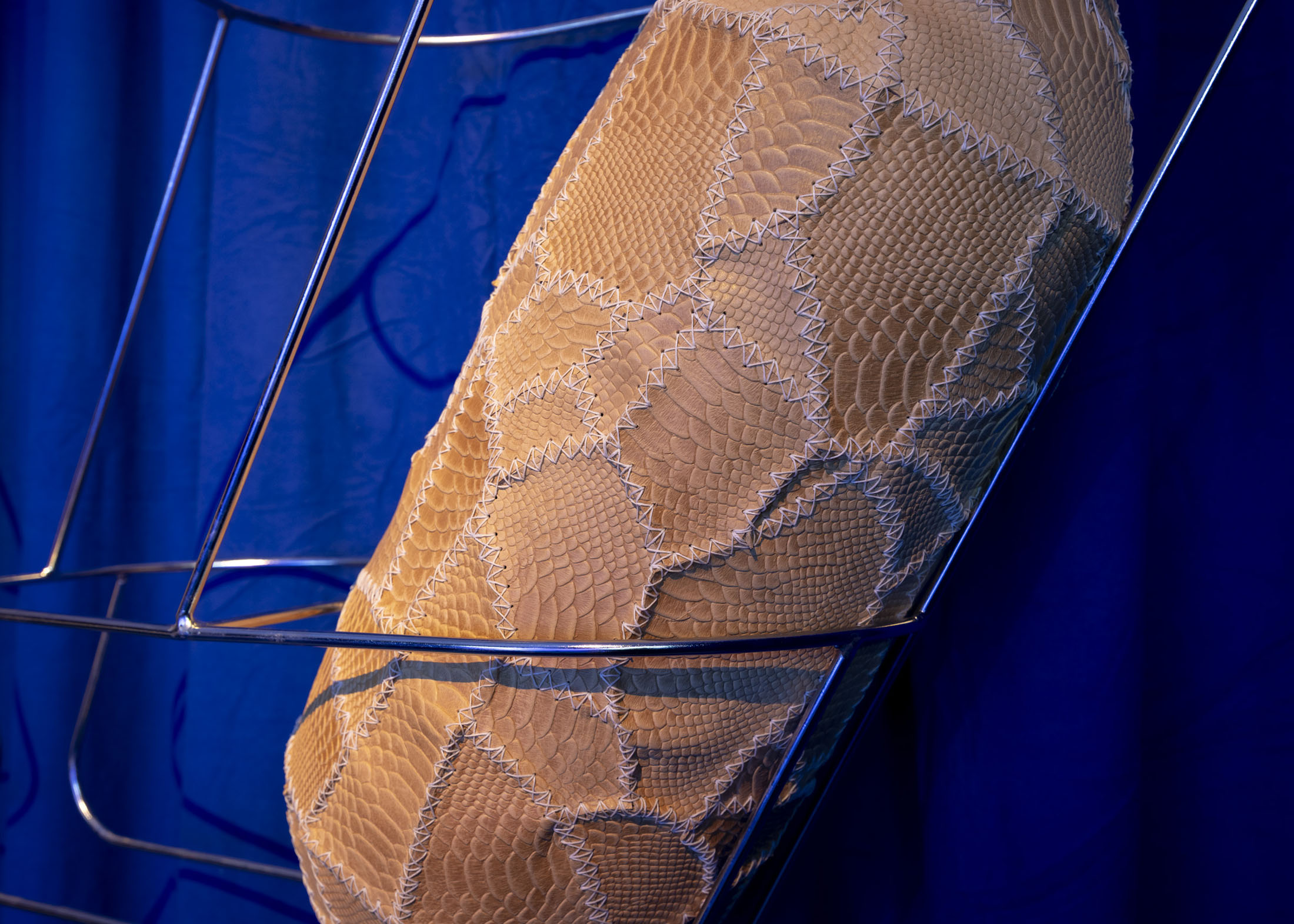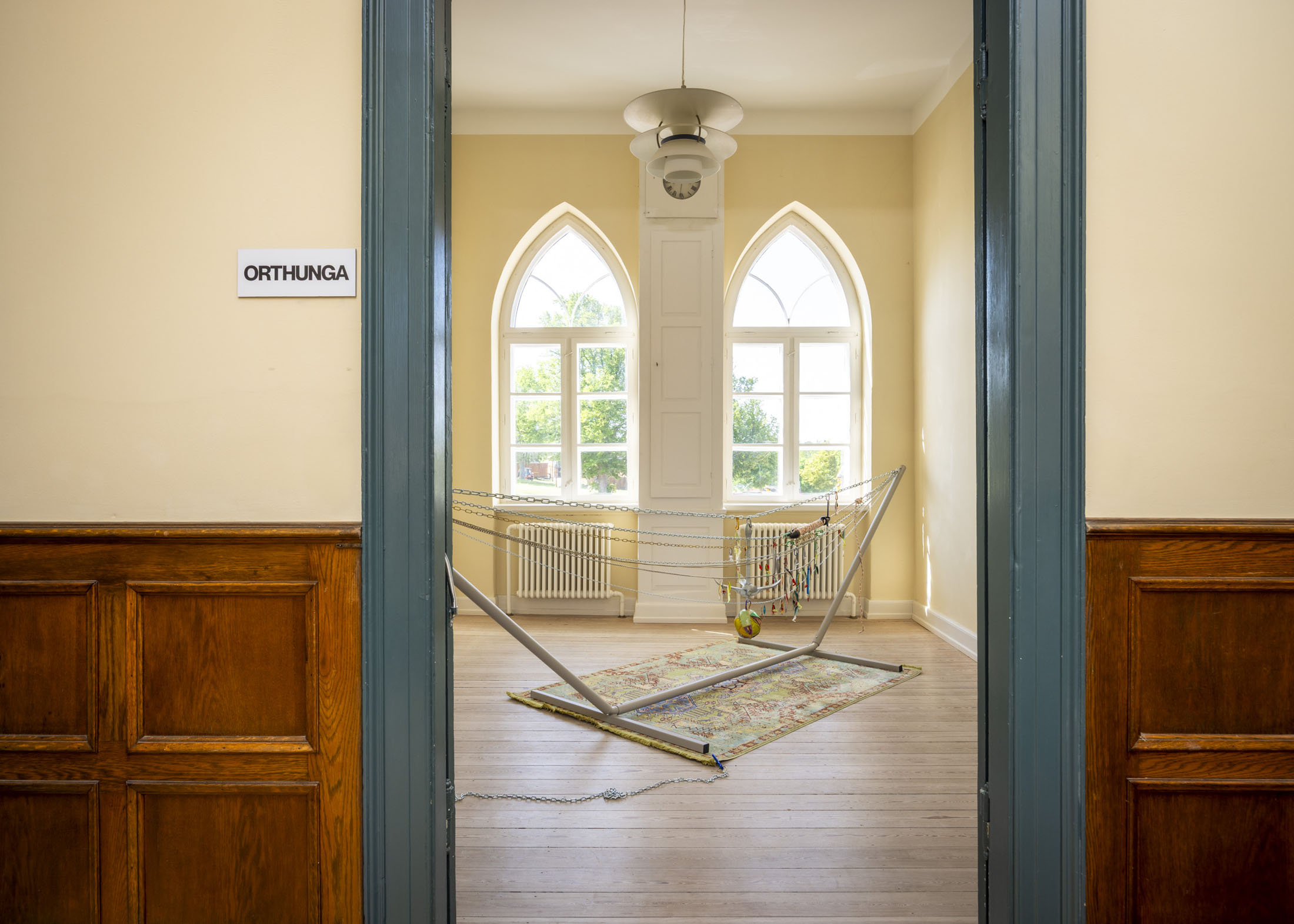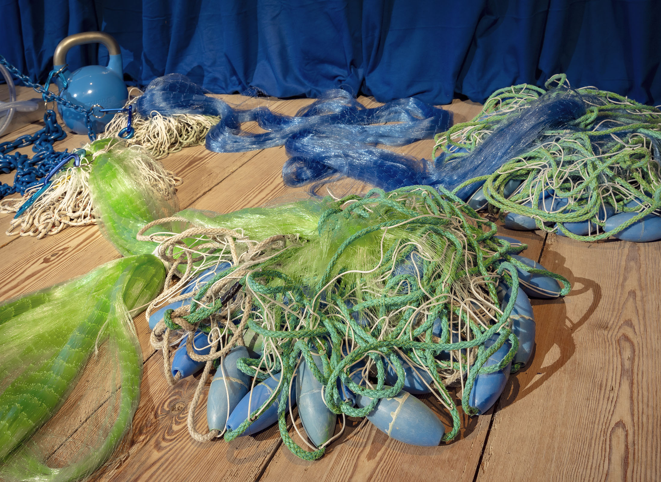 In Sip My Ocean, two identical video sequences are mirrored in a corner, creating the effect of a colourful Rorschach plate in motion. Mirroring is also a fundamental principle and leitmotif in the exhibition’s three new works by Maiken Bent, all of which are based on familiar objects connected to water. Water-related objects and their broad symbolic scope are a consistent feature throughout Bent’s practice, where the sculptural starting point is always pre-existing objects sourced from hardware stores, sports shops, or marine equipment stores. The emotional potential of the everyday objects is analysed and released through subsequent adaptations and combinations with other objects, resulting in condensed statements where objects familiar to us and our bodies approach us anew with surprising psychological depth.