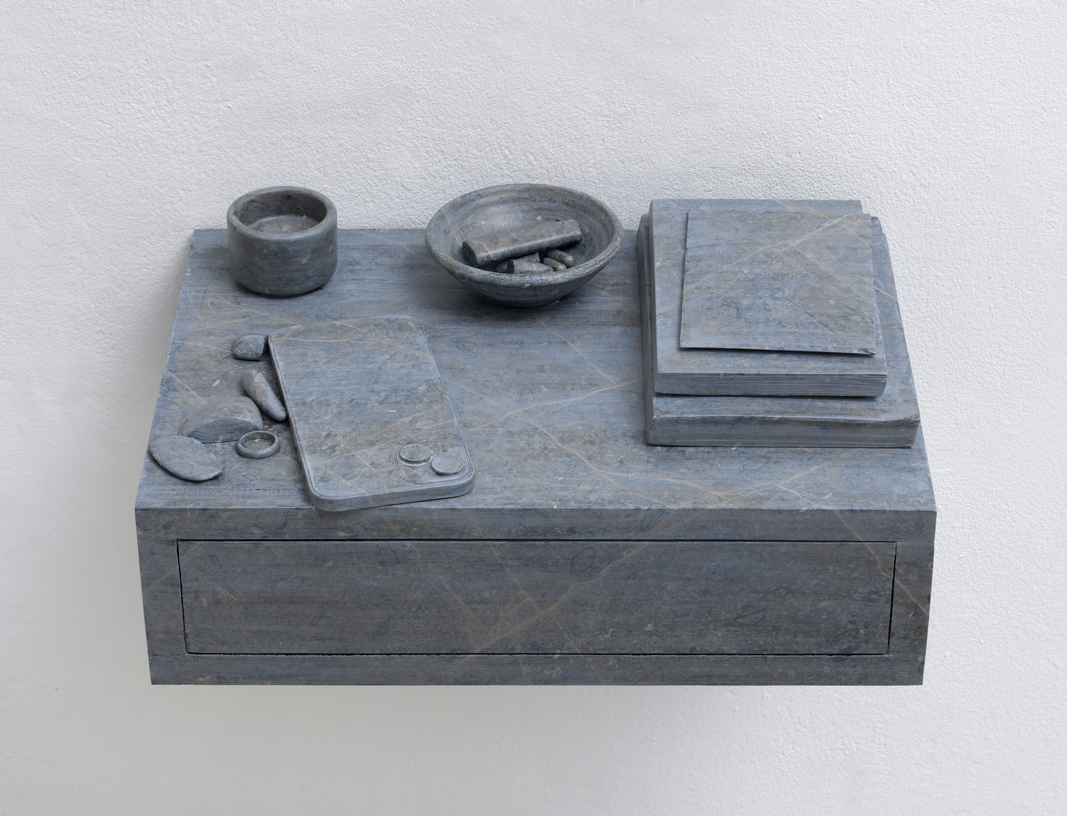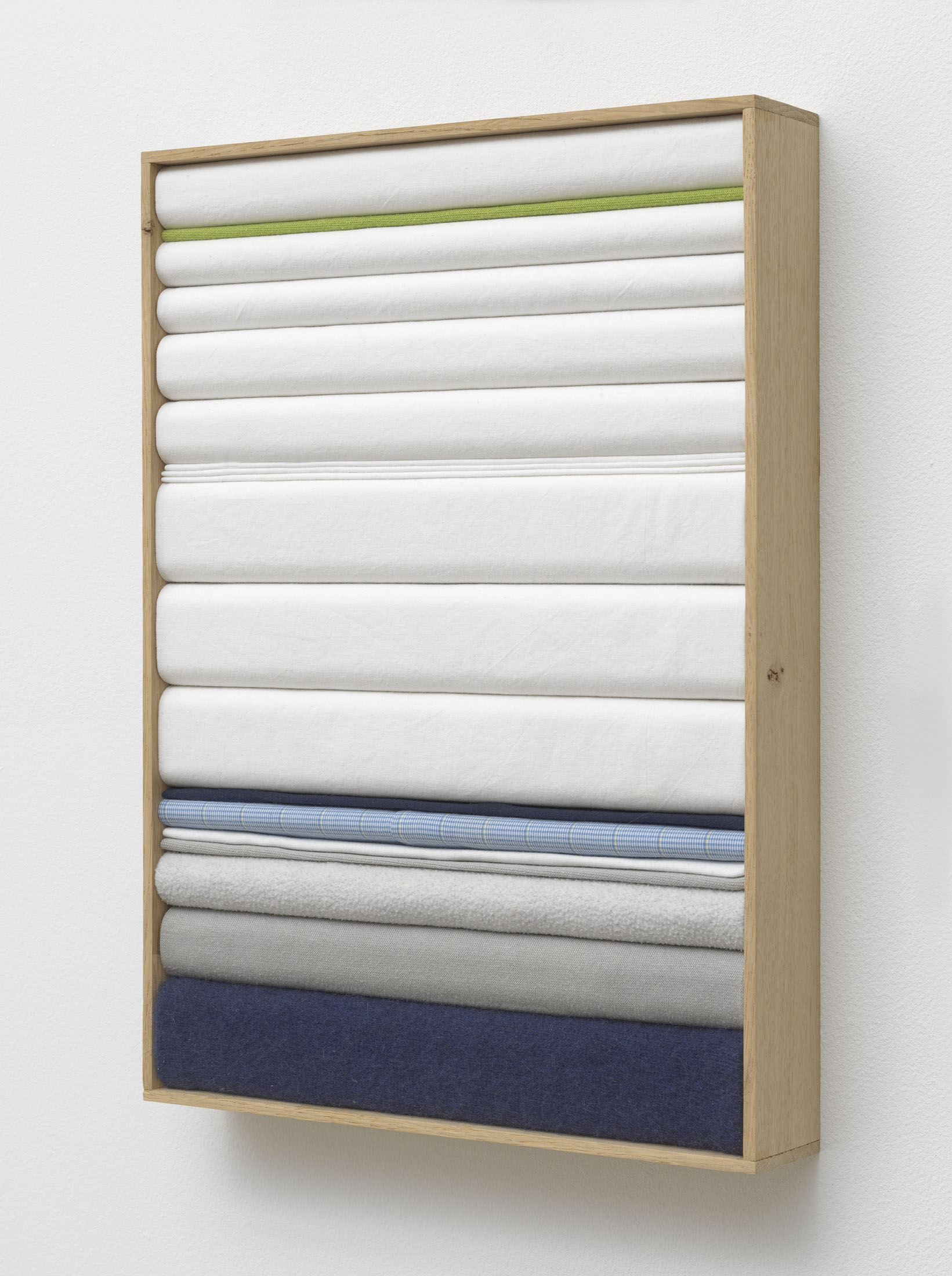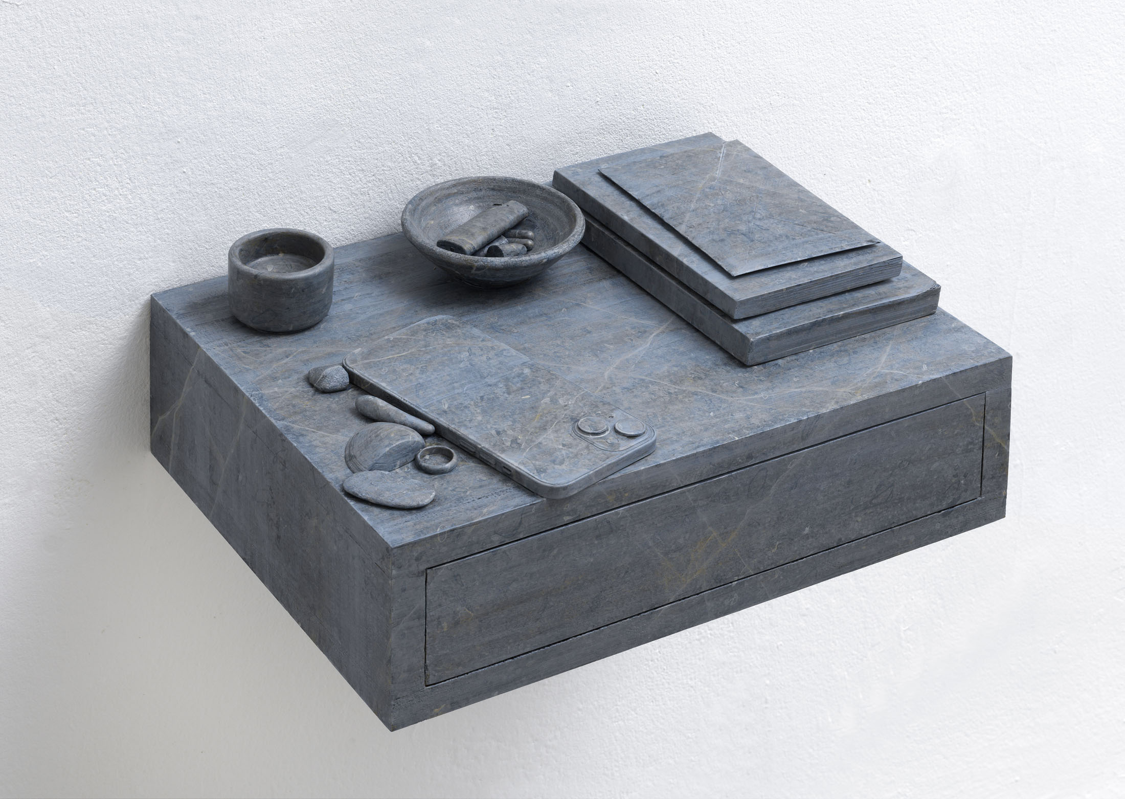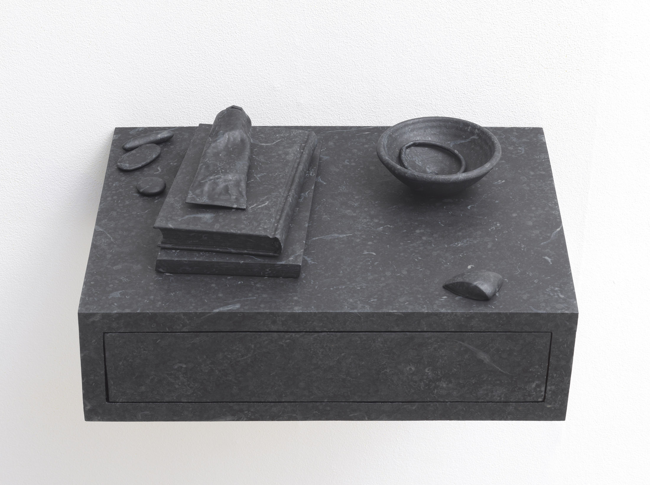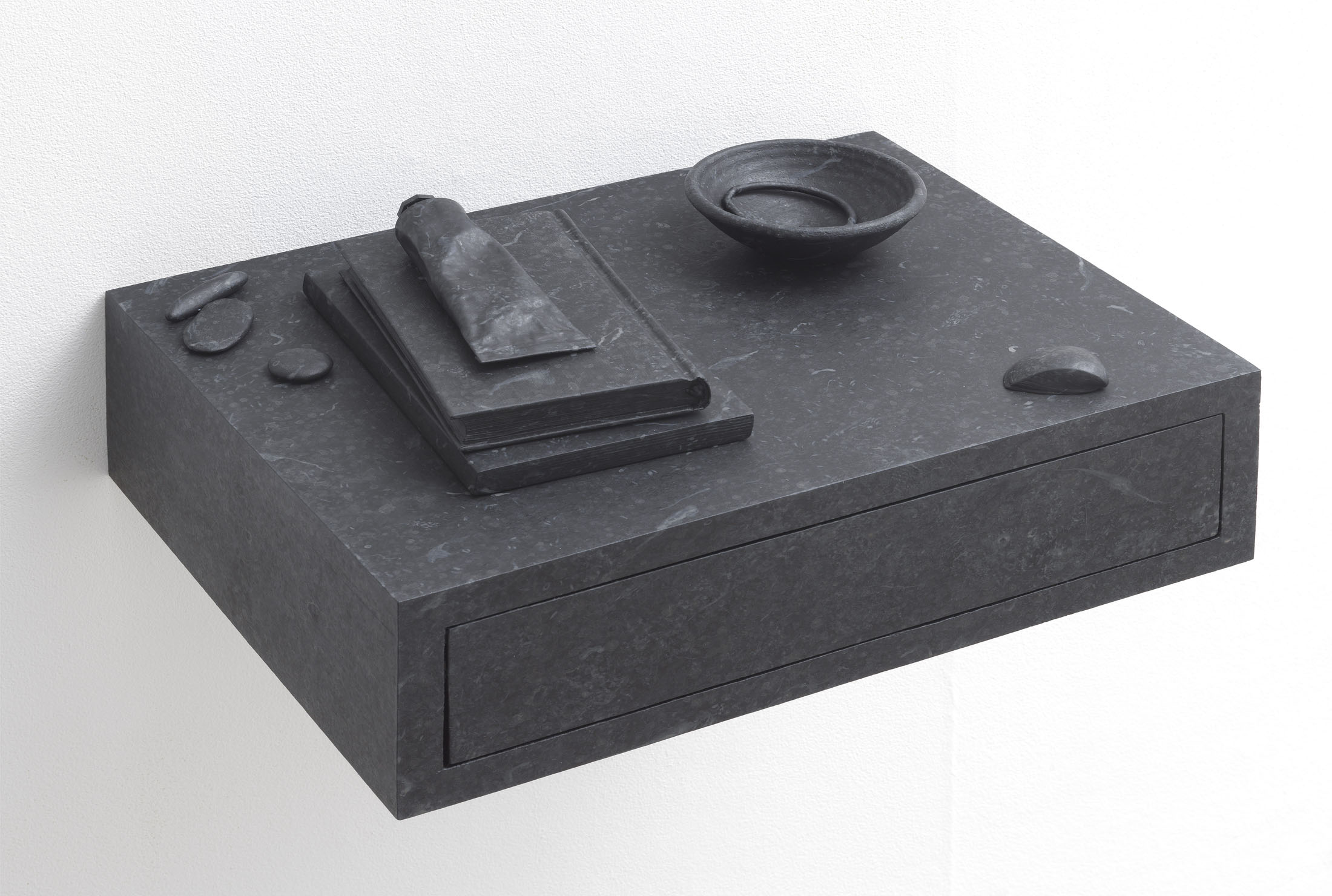 Two distinct series of works will be on show. ‘Washing’ consists of personal and found textiles, which are meticulously folded into rectangular wooden boxes. ‘Nightstand’ is a series of seven lifelike nightstands, filled with objects, and completely constructed as if carved from stone. These two series of works are partnered with ‘A Line of Stones’, Klaassens’ new video work, which is a mesmerising mix of roadmovie, poetic narrative and soundscape.