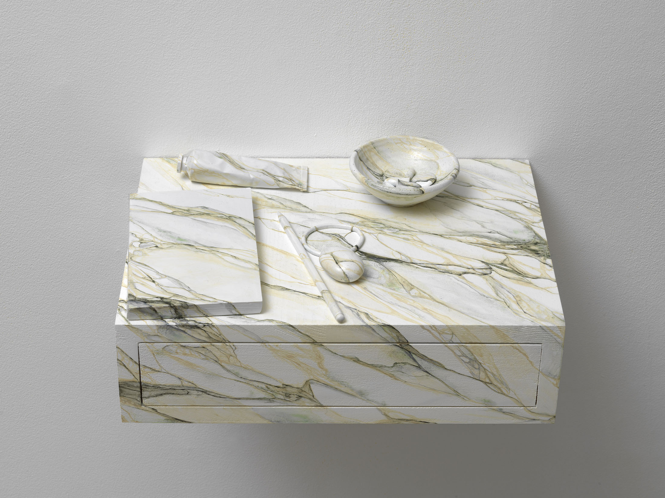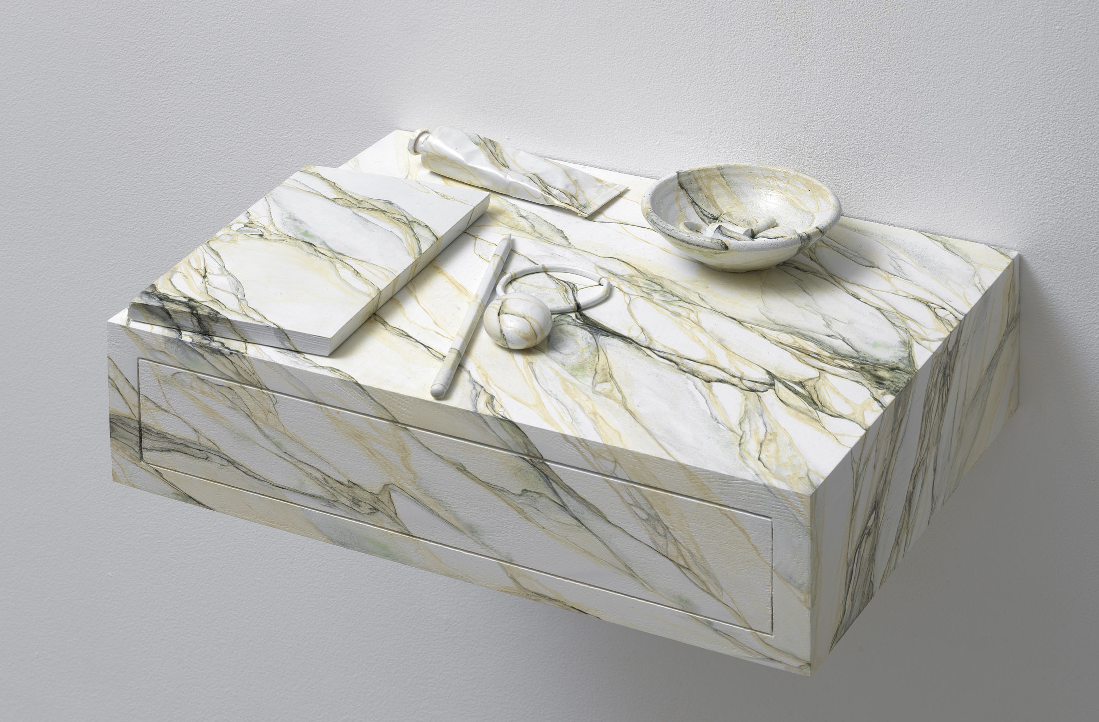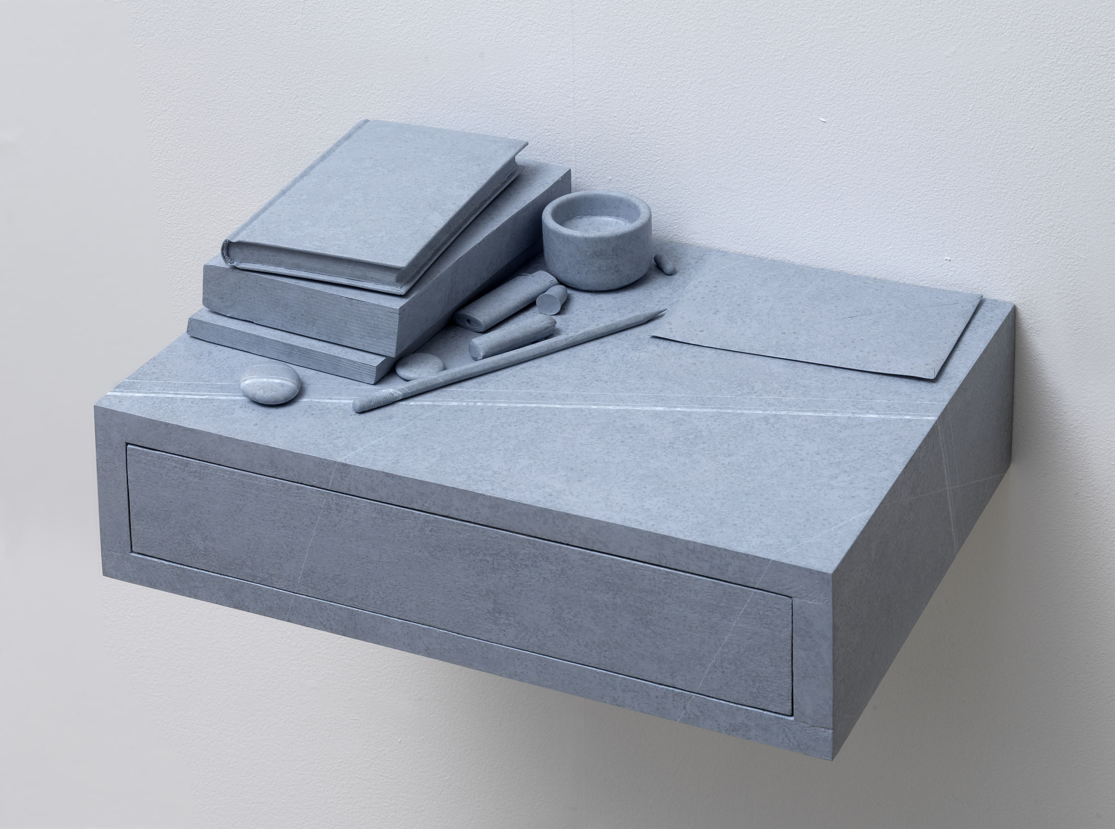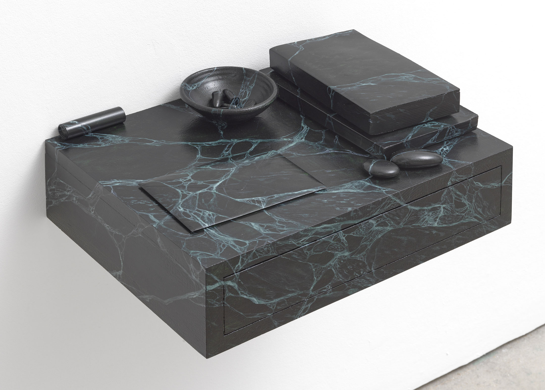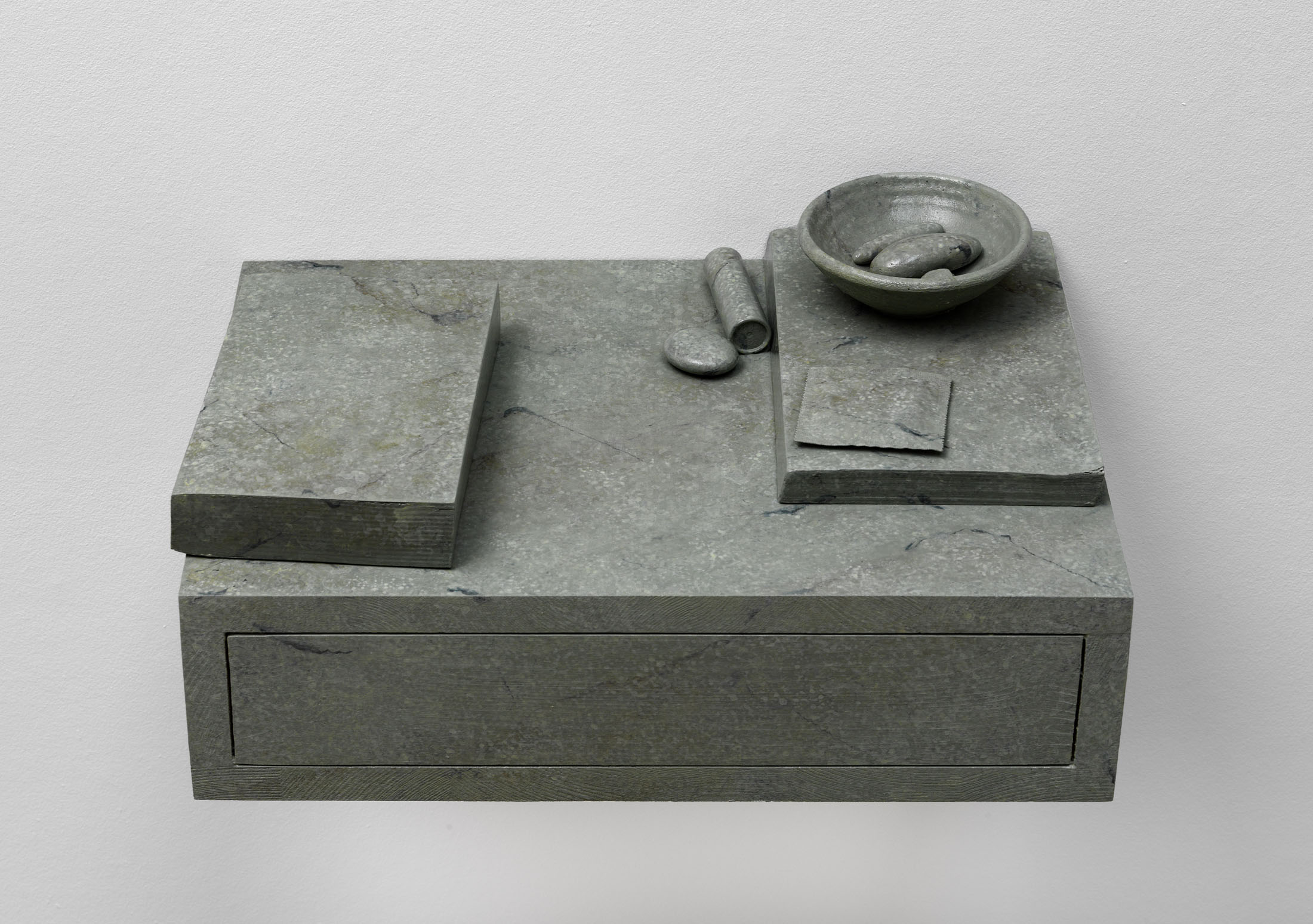 Two distinct series of works will be on show. ‘Washing’ consists of personal and found textiles, which are meticulously folded into rectangular wooden boxes. ‘Nightstand’ is a series of seven lifelike nightstands, filled with objects, and completely constructed as if carved from stone. These two series of works are partnered with ‘A Line of Stones’, Klaassens’ new video work, which is a mesmerising mix of roadmovie, poetic narrative and soundscape.