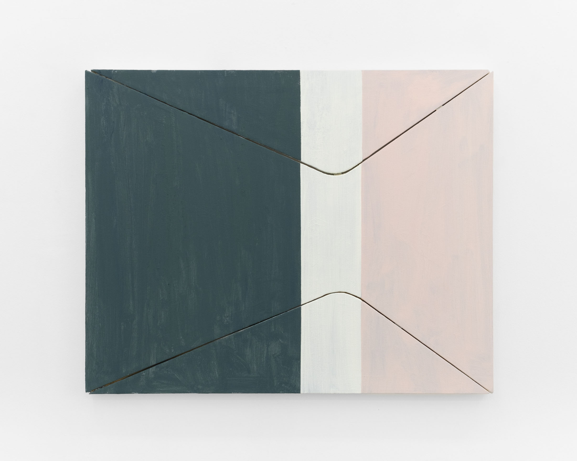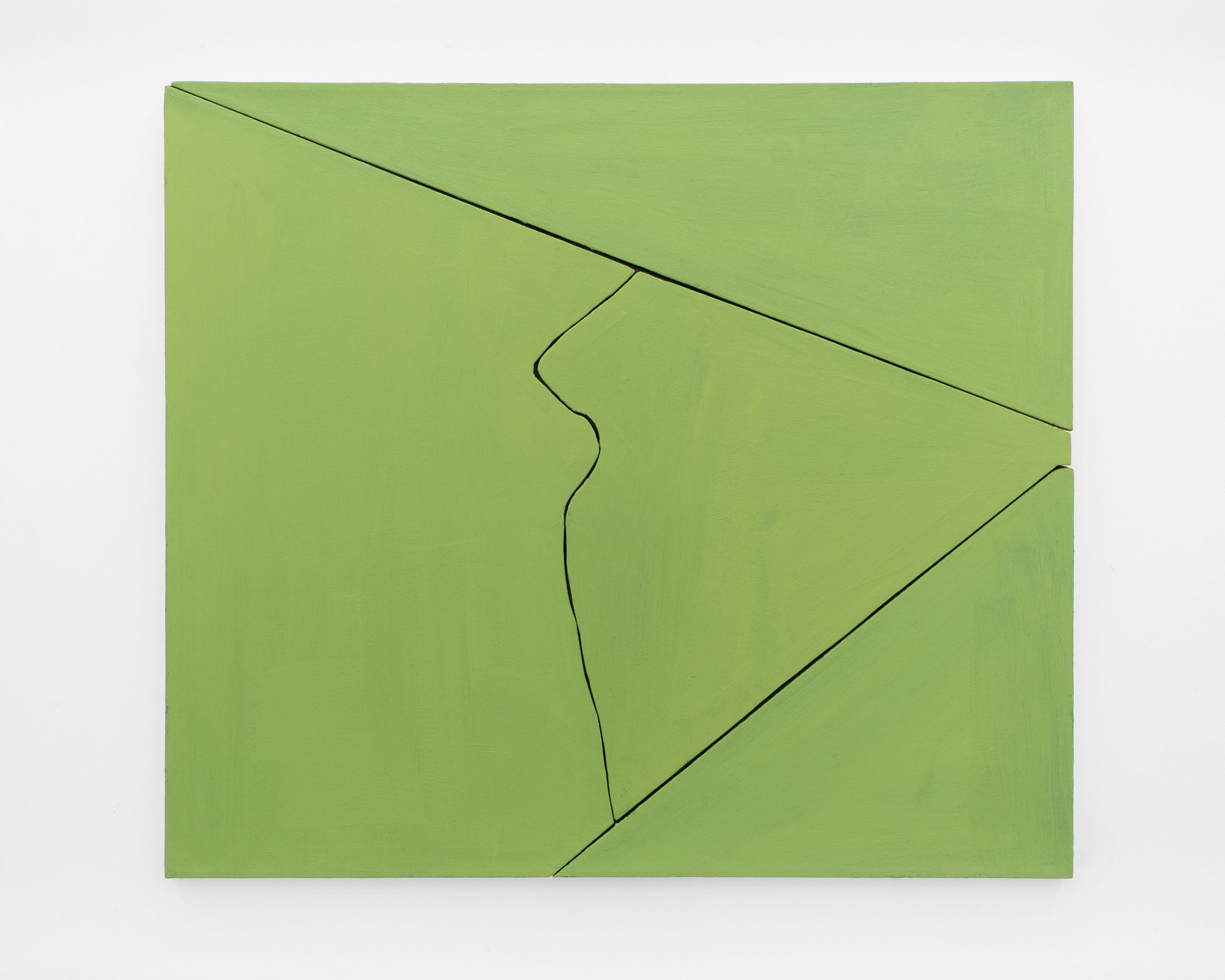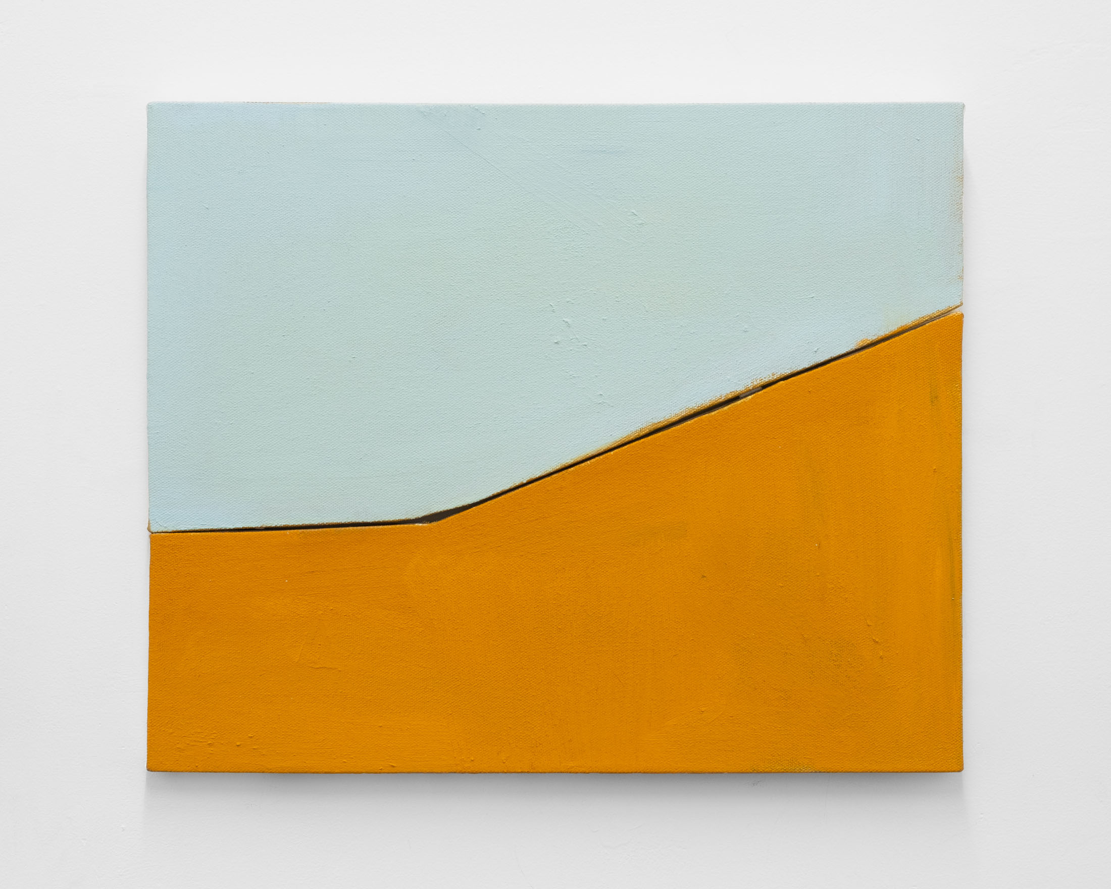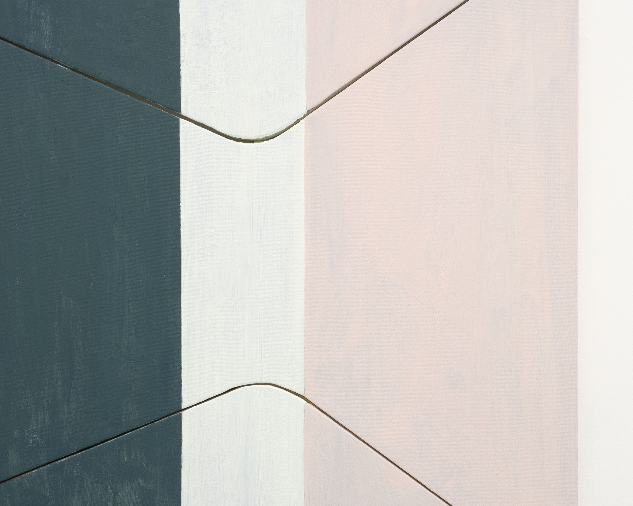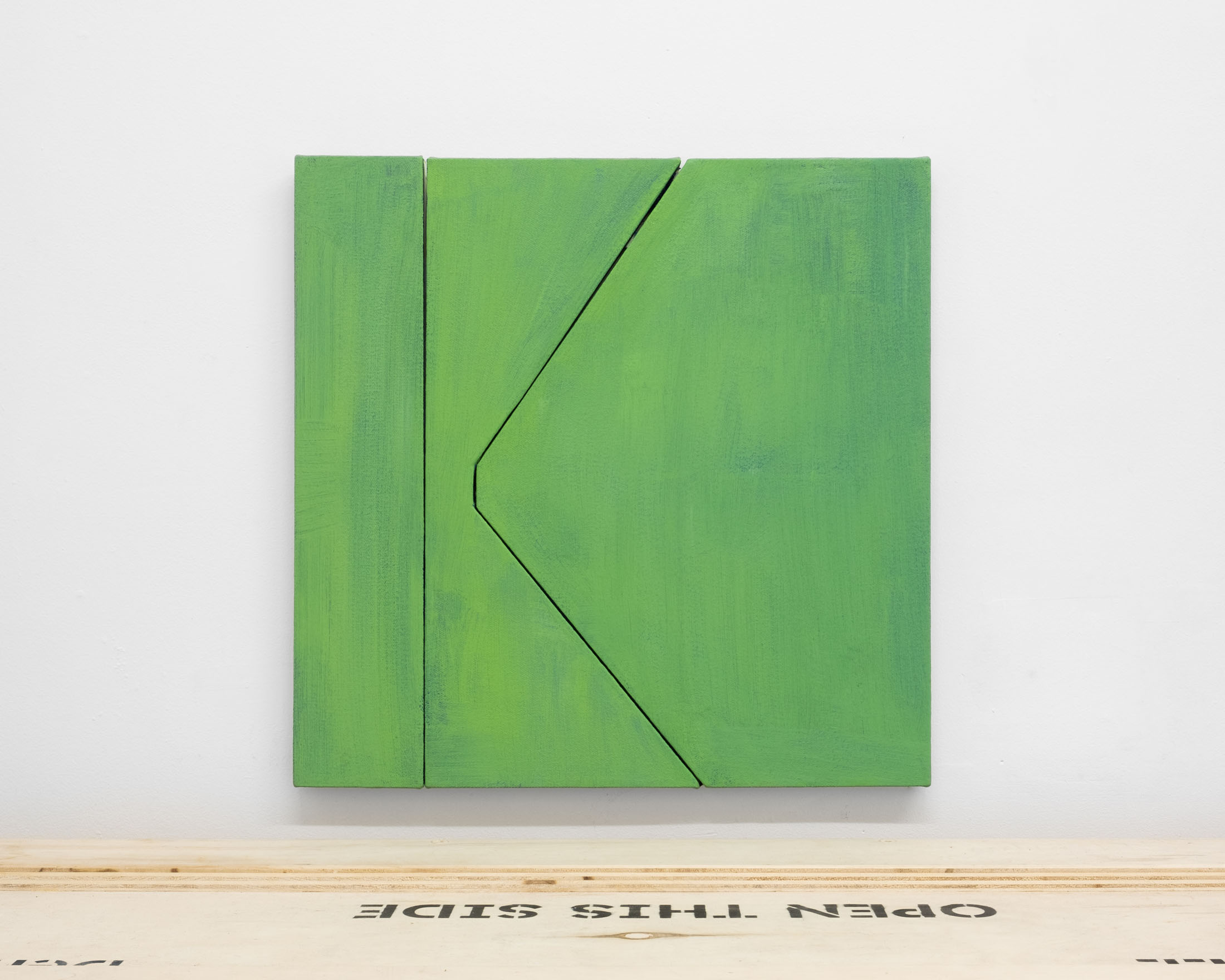 Doubt is a productive force in Montréal-based artist Malcolm McCormick’s practice, moving the process forward rather than halting it. One step forward, two steps forward, in built-up layers of abandoned iterations. The final simplicity of each painting is underlined by a history of marks and colours, sometimes visible through a fog of glazed-on paint, at other times invisibly informing the successive layers. As McCormick often builds his painting stretchers in separate interlocking ‘panels’, the layered surfaces are disrupted by constructed marks like hairlines, scarring and dividing the image plane. Visual space in the works is implied through these diagonals and arching curves, rather than through their painted surfaces; a paradox that further complicates painting’s status as both image and object. The permanent compositional lines serve as a guardrail against the artist’s desire to endlessly rework the surface, a countermeasure for the consuming doubt that drives the work. This process results in the storied, sculptural paintings present in ‘Protection Spells.’