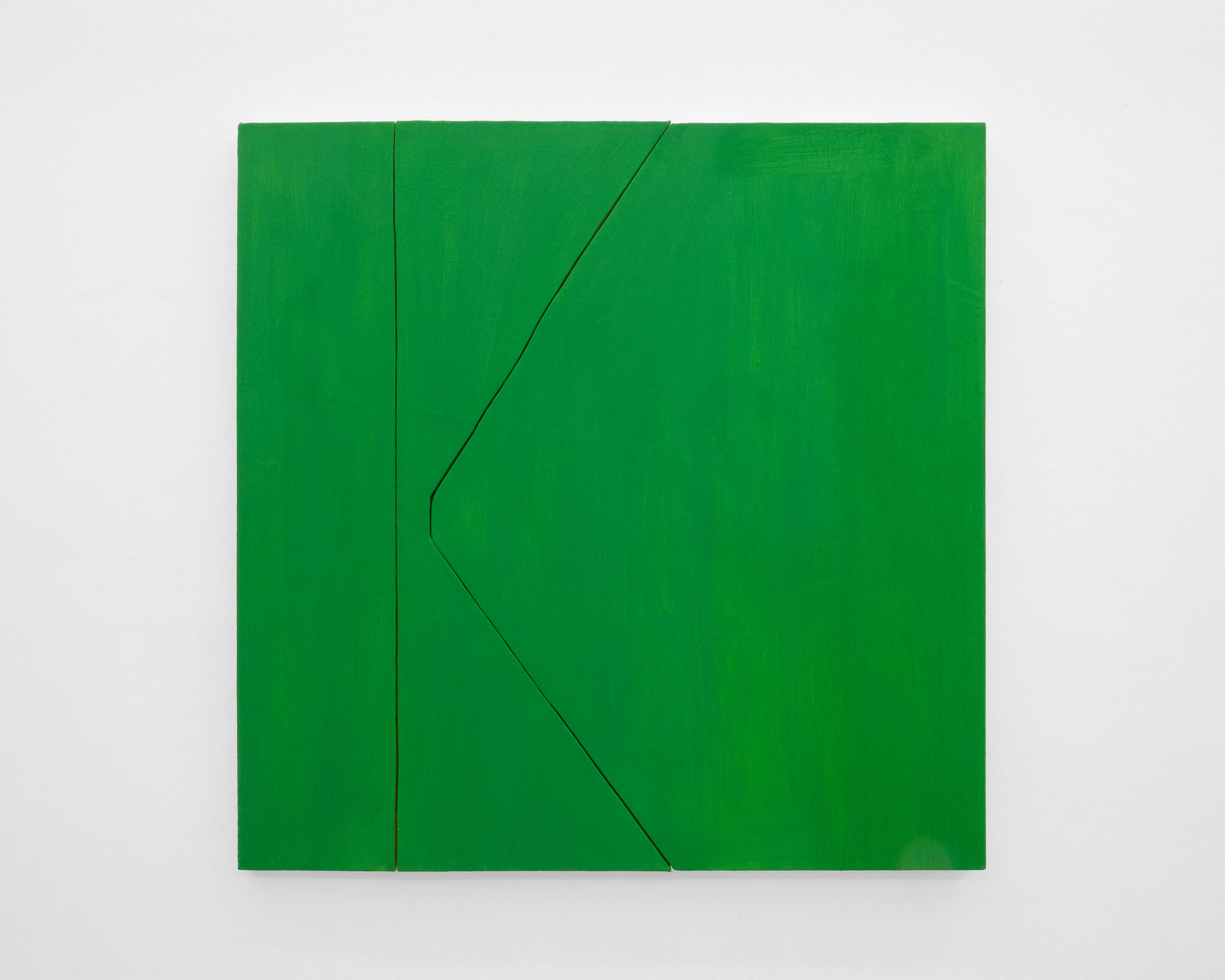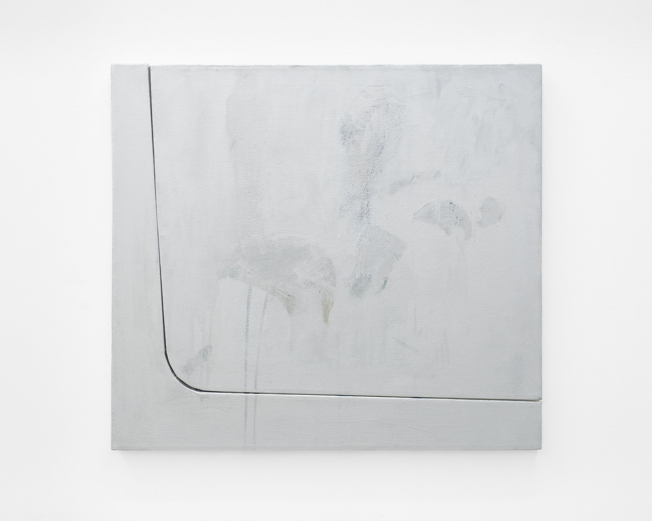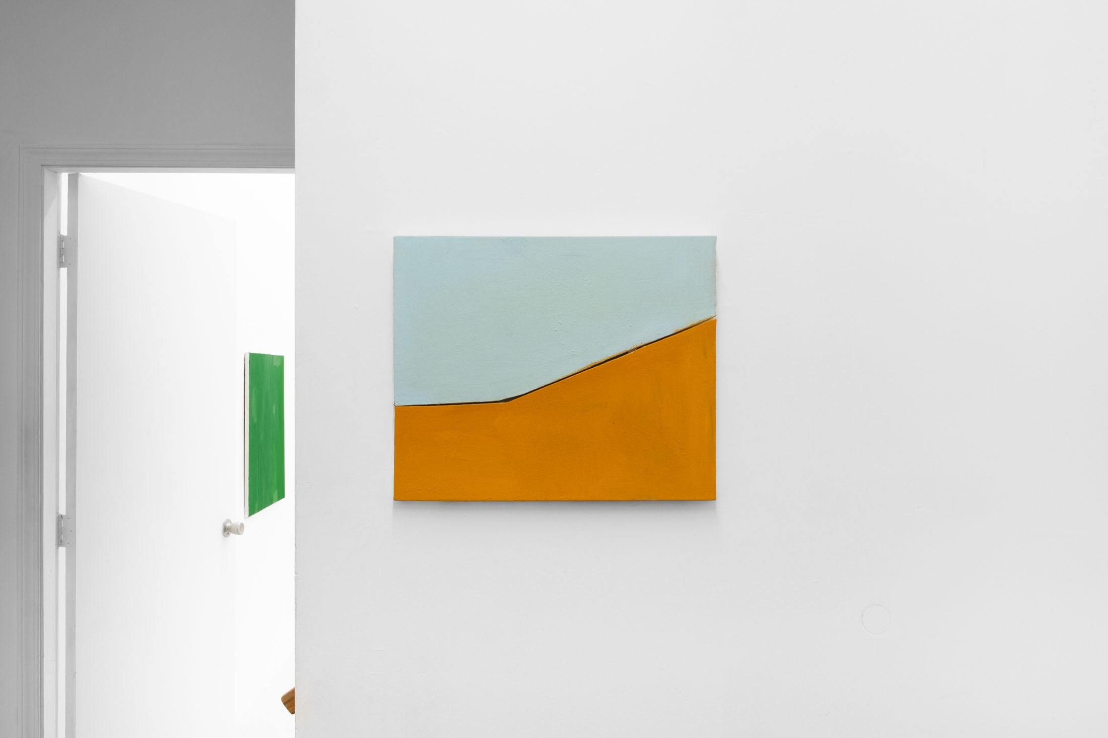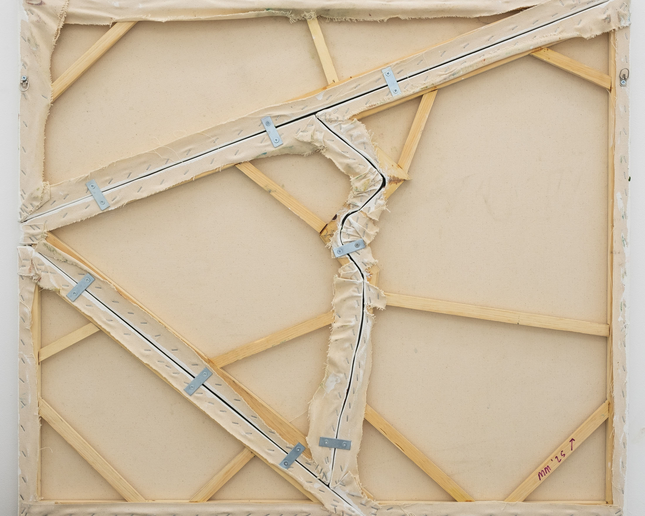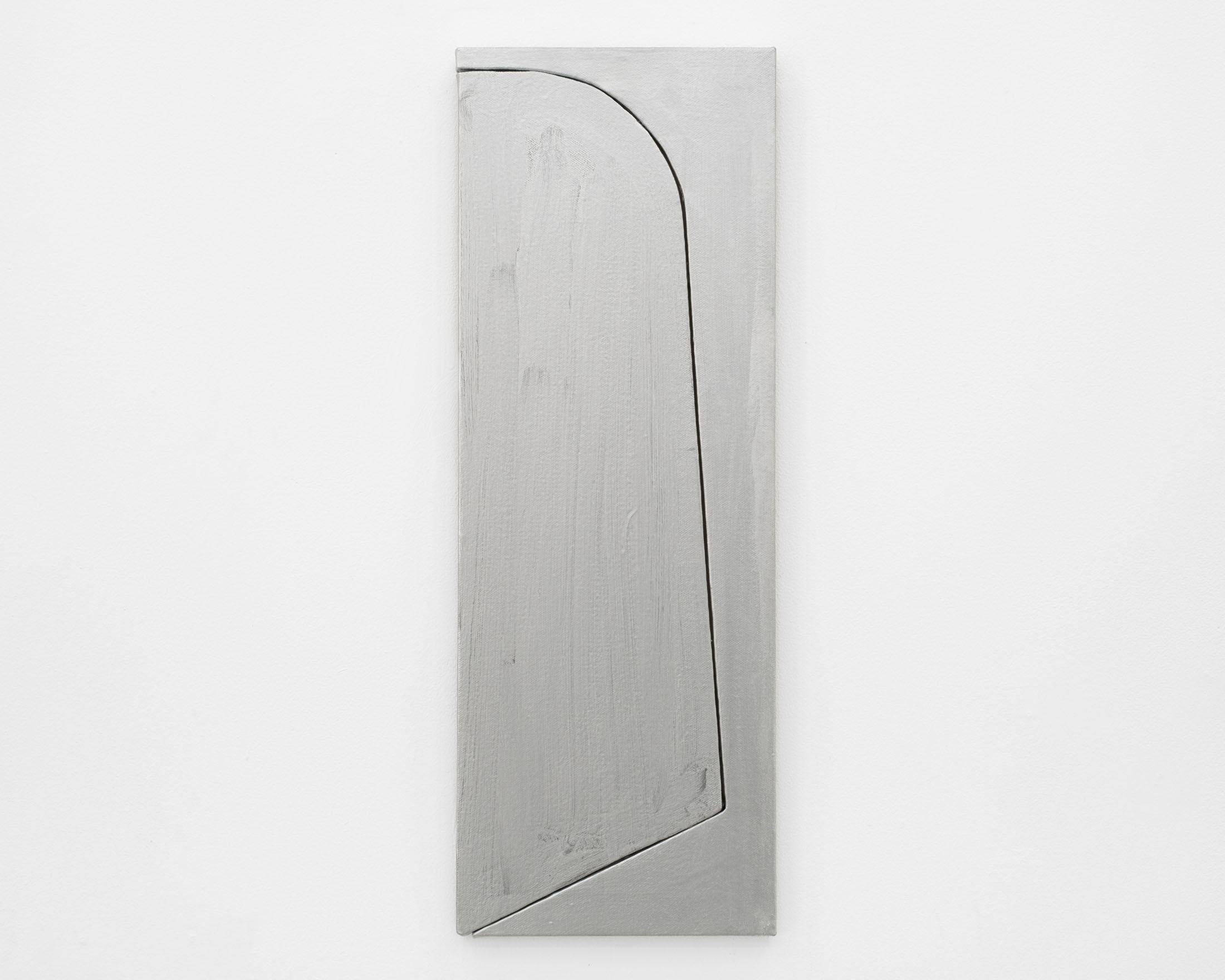 Doubt is a productive force in Montréal-based artist Malcolm McCormick’s practice, moving the process forward rather than halting it. One step forward, two steps forward, in built-up layers of abandoned iterations. The final simplicity of each painting is underlined by a history of marks and colours, sometimes visible through a fog of glazed-on paint, at other times invisibly informing the successive layers. As McCormick often builds his painting stretchers in separate interlocking ‘panels’, the layered surfaces are disrupted by constructed marks like hairlines, scarring and dividing the image plane. Visual space in the works is implied through these diagonals and arching curves, rather than through their painted surfaces; a paradox that further complicates painting’s status as both image and object. The permanent compositional lines serve as a guardrail against the artist’s desire to endlessly rework the surface, a countermeasure for the consuming doubt that drives the work. This process results in the storied, sculptural paintings present in ‘Protection Spells.’