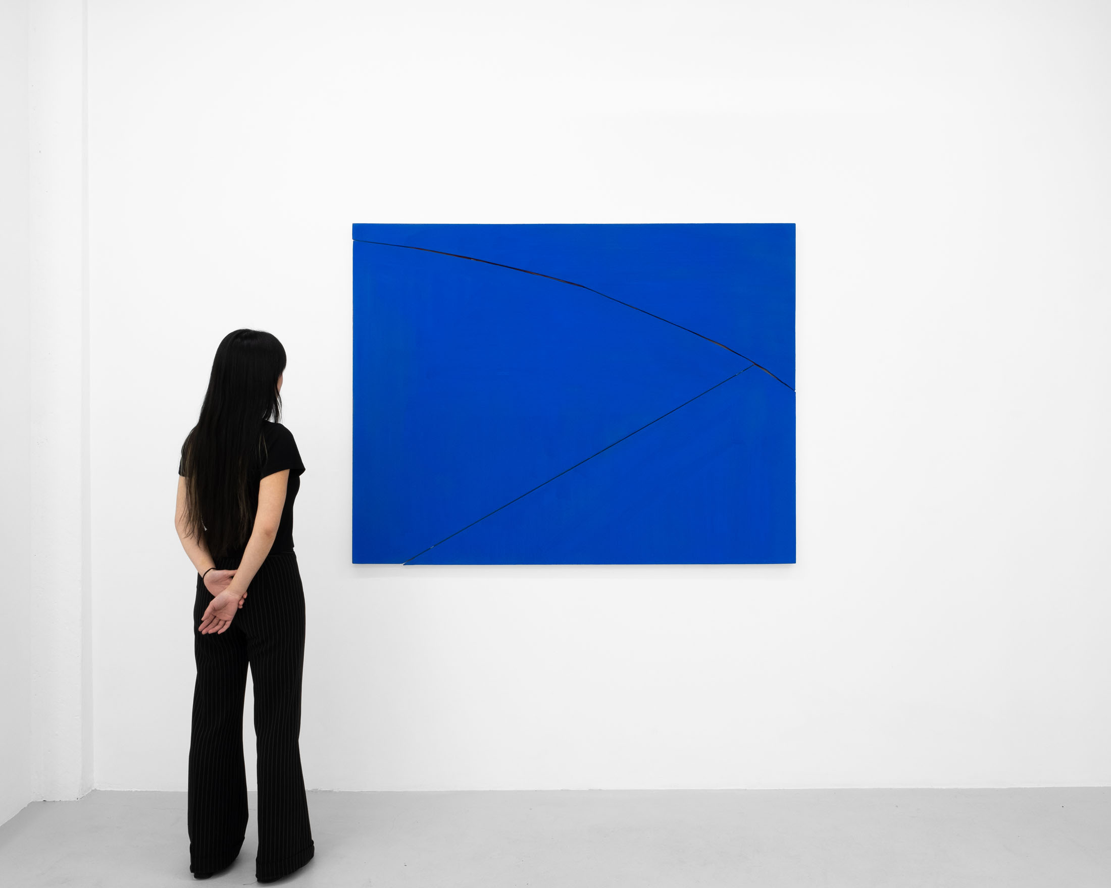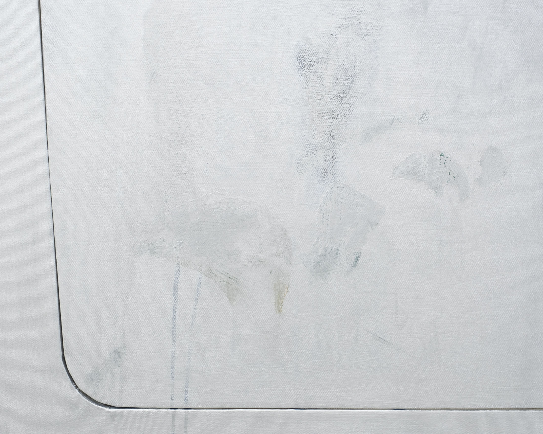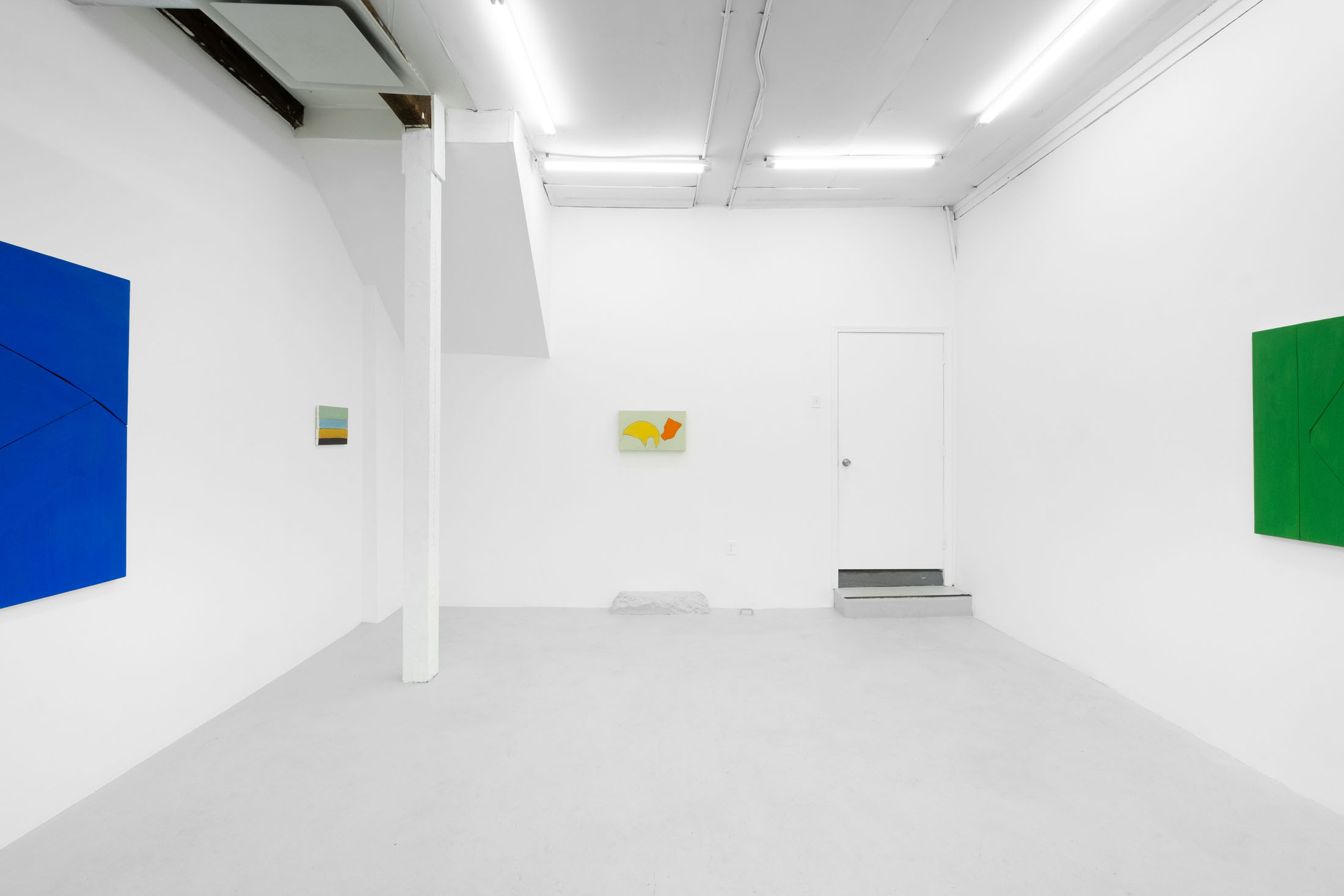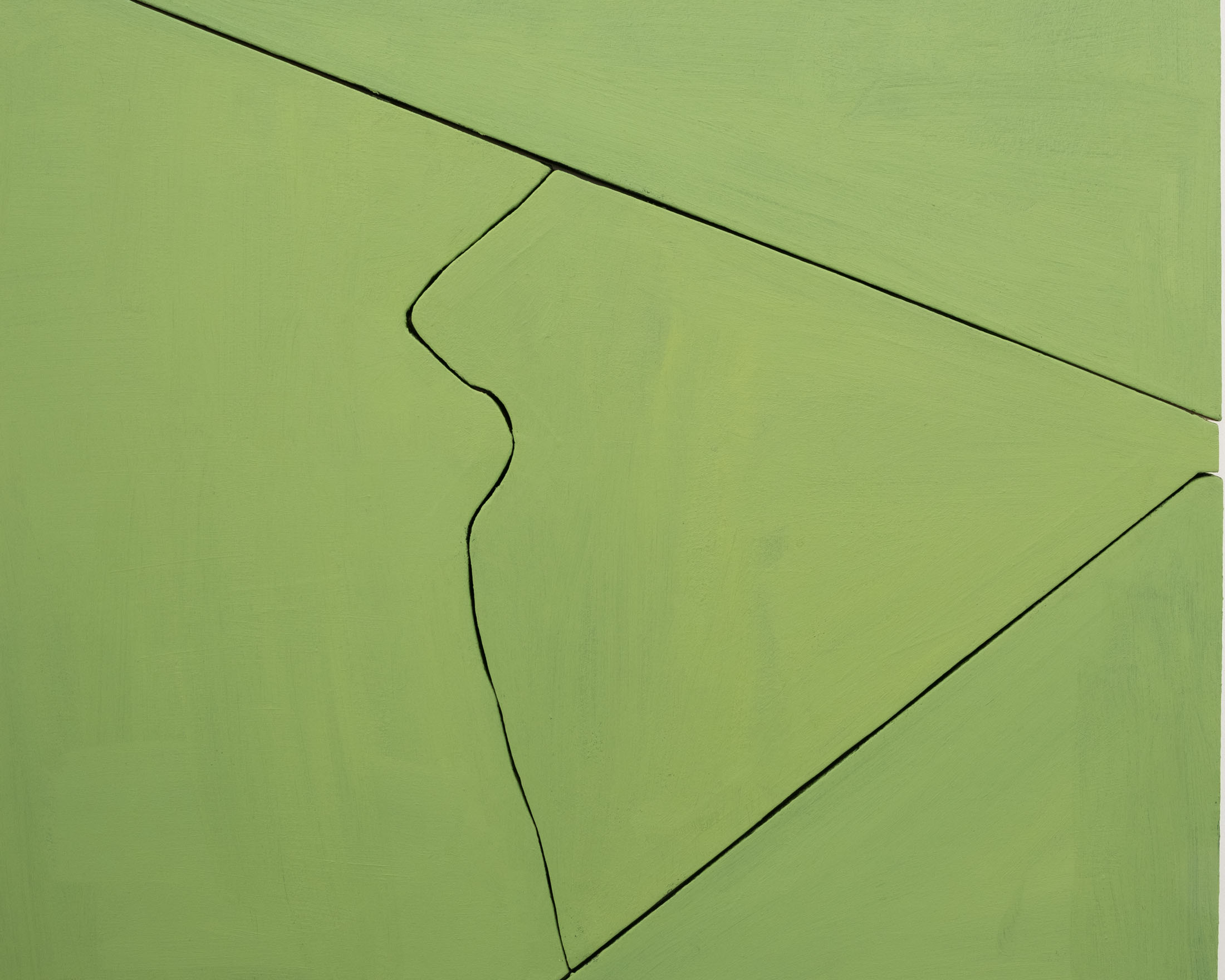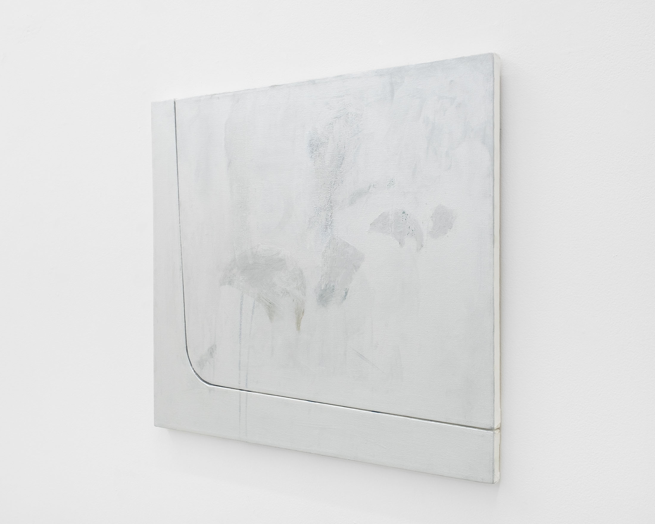 Doubt is a productive force in Montréal-based artist Malcolm McCormick’s practice, moving the process forward rather than halting it. One step forward, two steps forward, in built-up layers of abandoned iterations. The final simplicity of each painting is underlined by a history of marks and colours, sometimes visible through a fog of glazed-on paint, at other times invisibly informing the successive layers. As McCormick often builds his painting stretchers in separate interlocking ‘panels’, the layered surfaces are disrupted by constructed marks like hairlines, scarring and dividing the image plane. Visual space in the works is implied through these diagonals and arching curves, rather than through their painted surfaces; a paradox that further complicates painting’s status as both image and object. The permanent compositional lines serve as a guardrail against the artist’s desire to endlessly rework the surface, a countermeasure for the consuming doubt that drives the work. This process results in the storied, sculptural paintings present in ‘Protection Spells.’