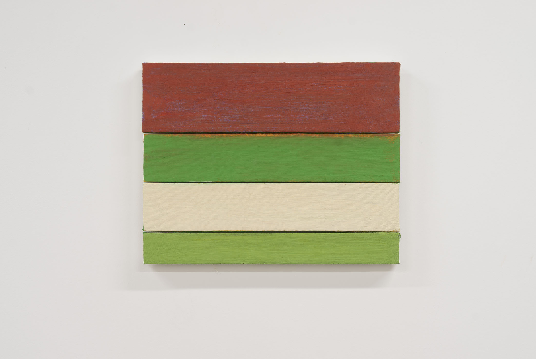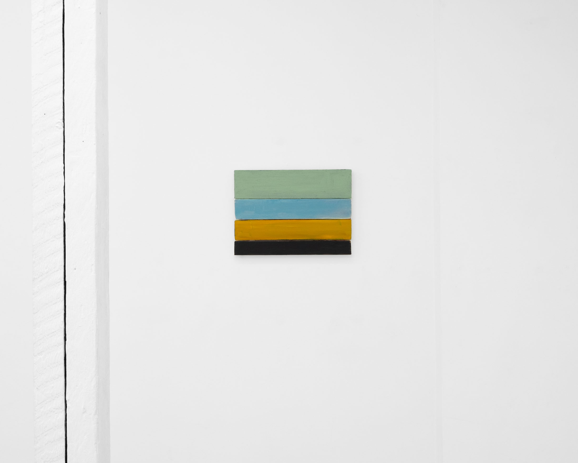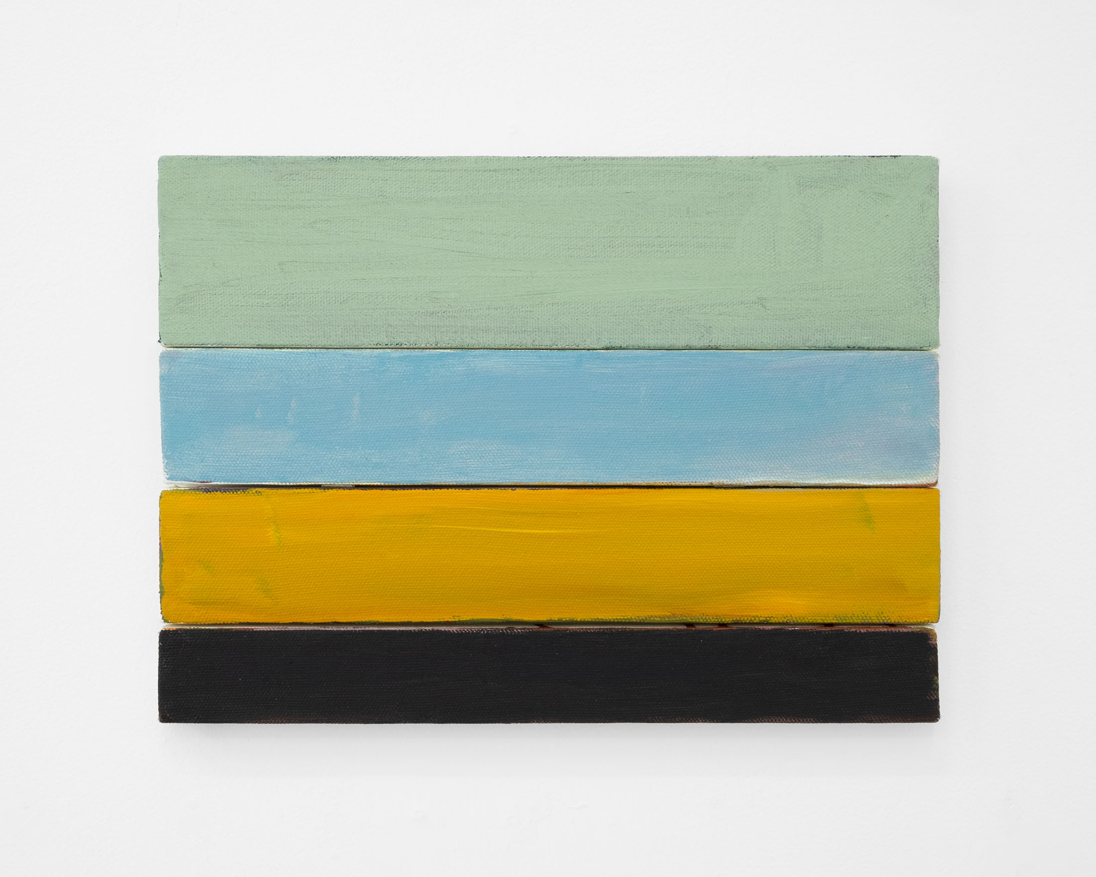 Individually, the paintings are quite simple, but taken together, they relate to each other and to the history of painting through a web of complex conversations. References to other paintings, both present and not (both the artist’s and not), are visible in their layered surfaces and constructed lines: one painting’s colour is chosen for that of its neighbour, an Impressionist painting’s composition is used as a template for a constructed painting, or an excerpt from another painting is abandoned and painted over.