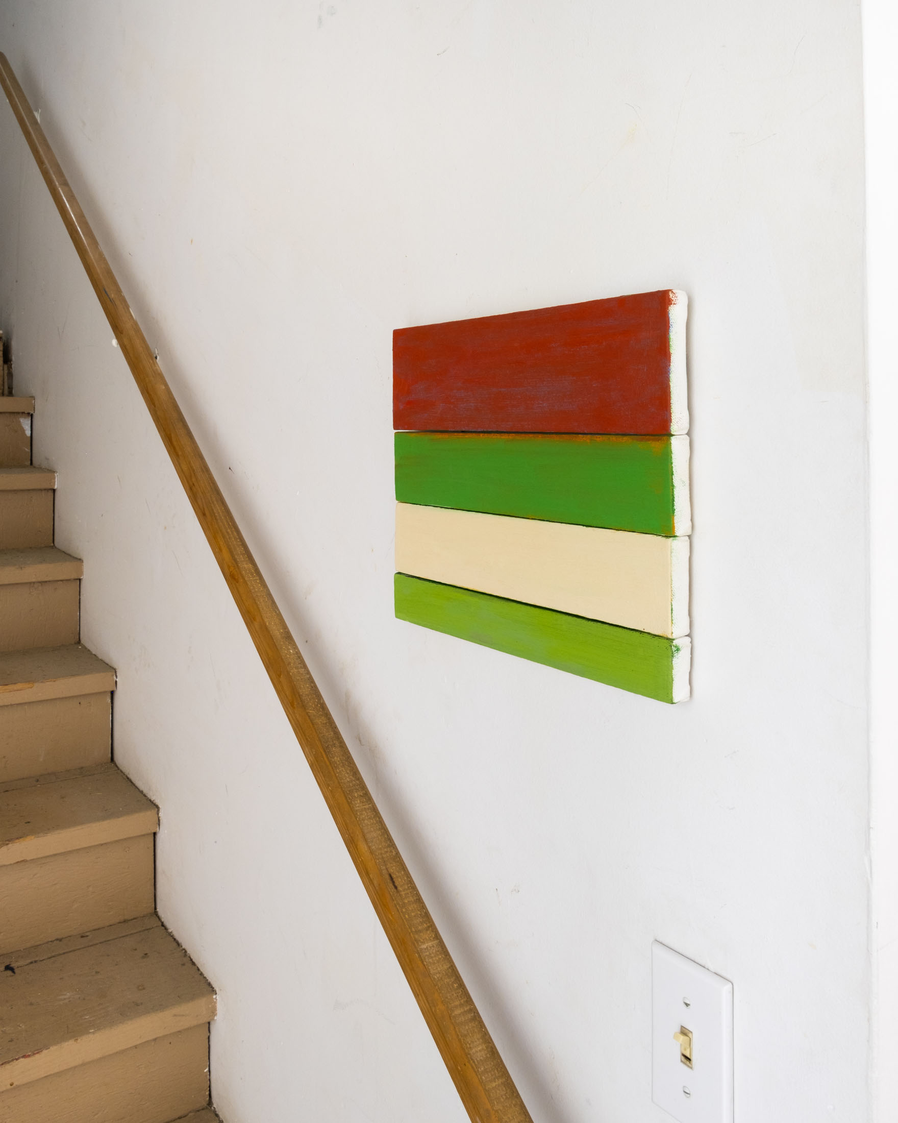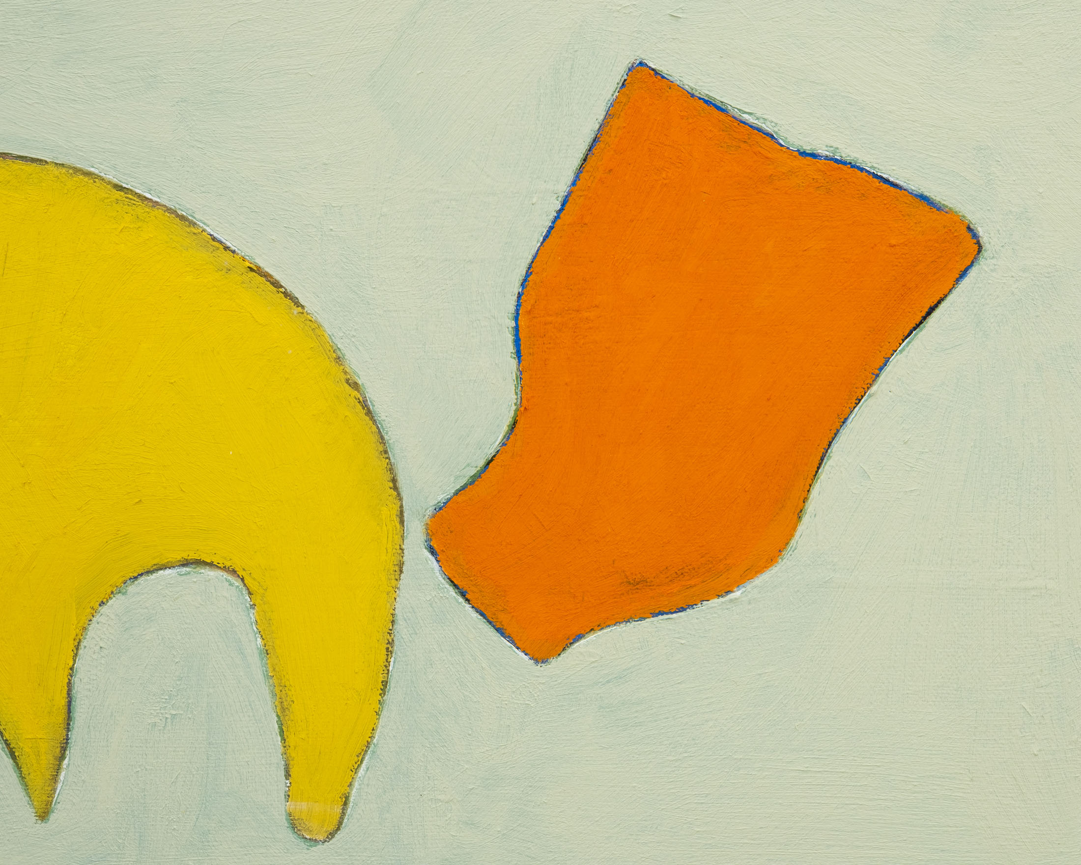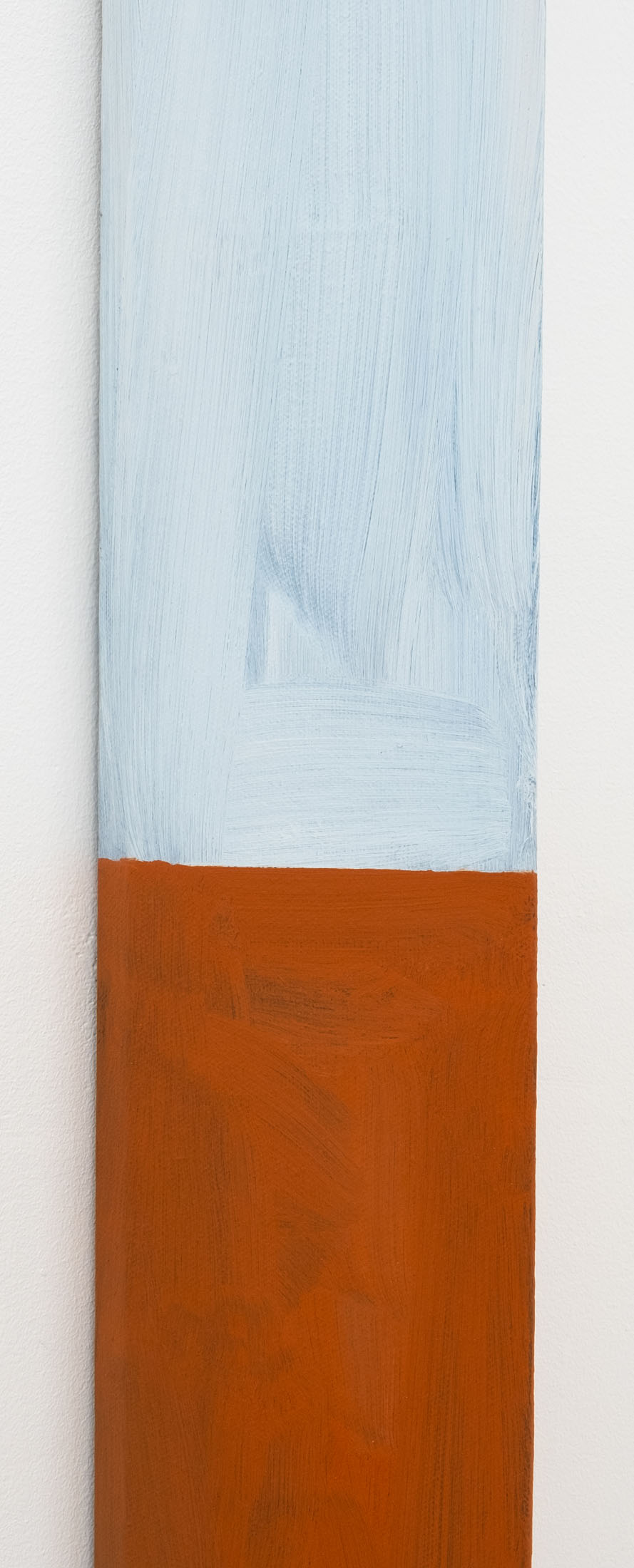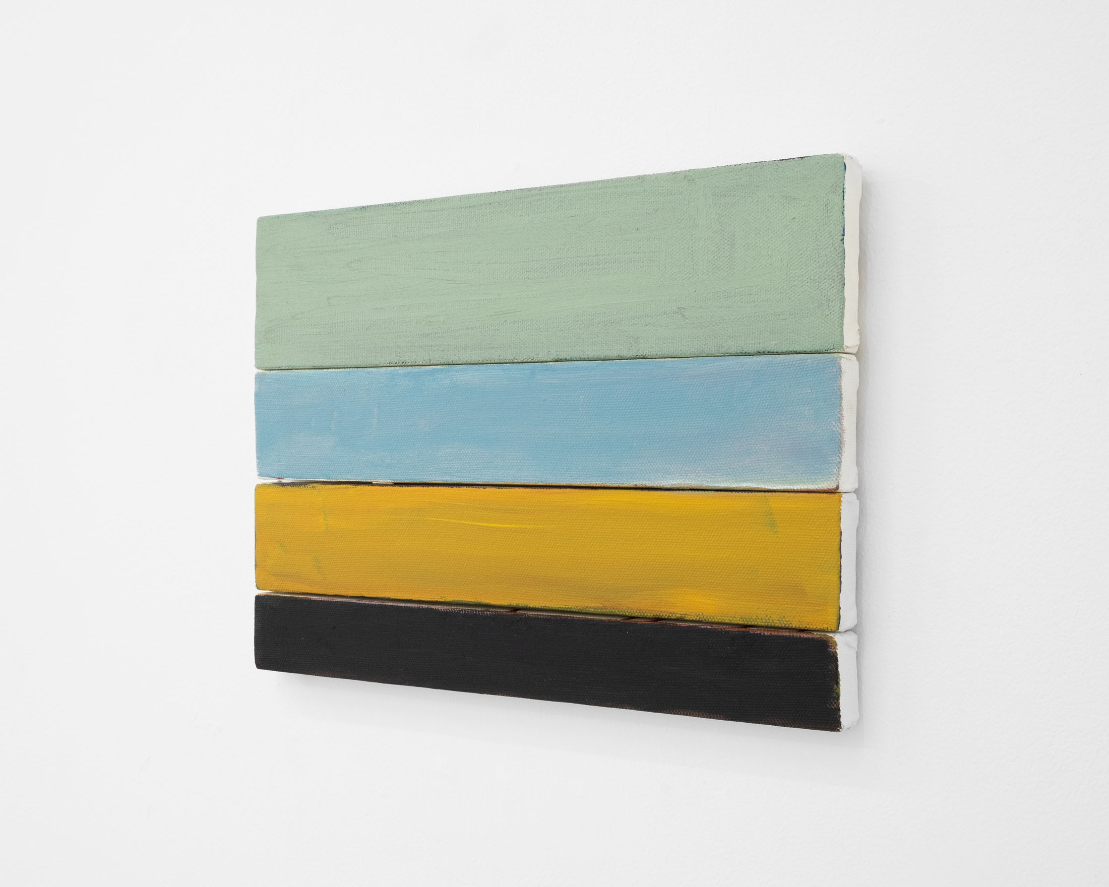 Individually, the paintings are quite simple, but taken together, they relate to each other and to the history of painting through a web of complex conversations. References to other paintings, both present and not (both the artist’s and not), are visible in their layered surfaces and constructed lines: one painting’s colour is chosen for that of its neighbour, an Impressionist painting’s composition is used as a template for a constructed painting, or an excerpt from another painting is abandoned and painted over.