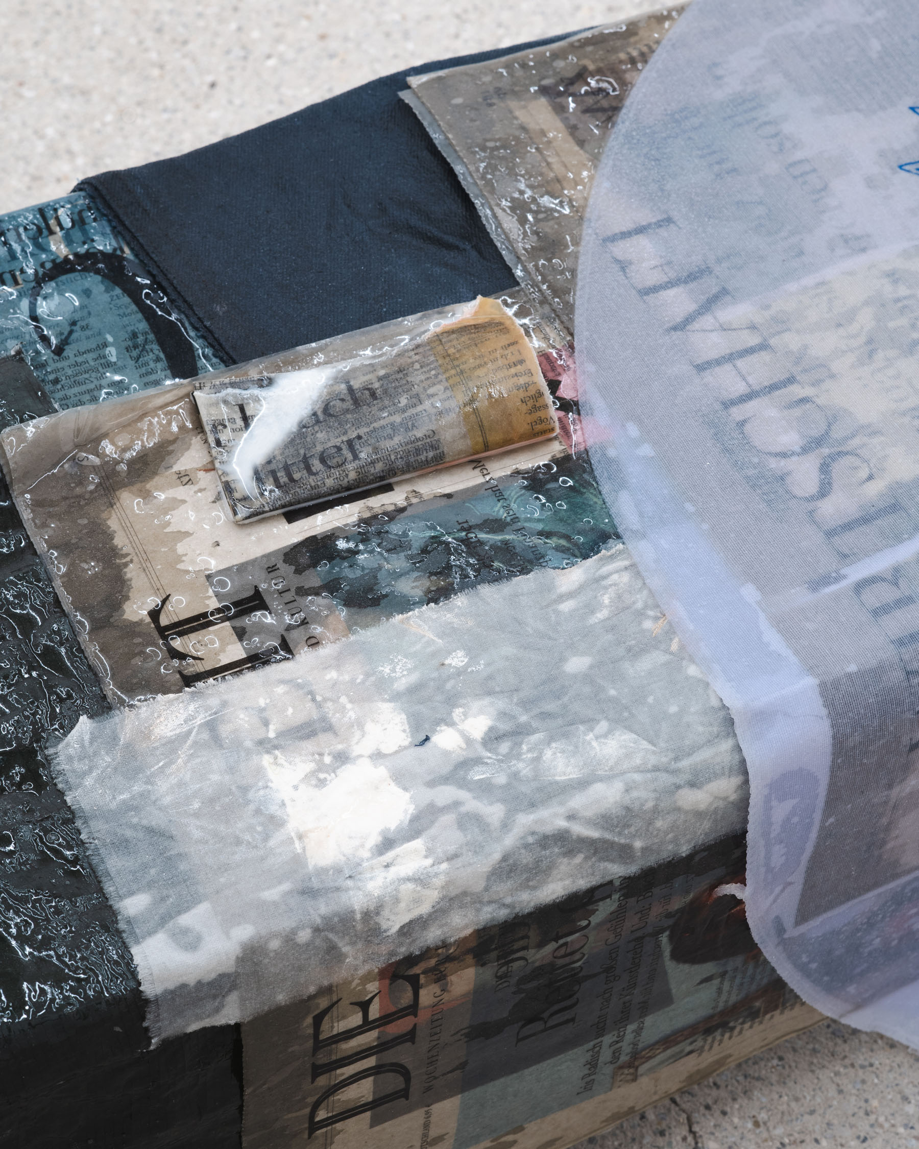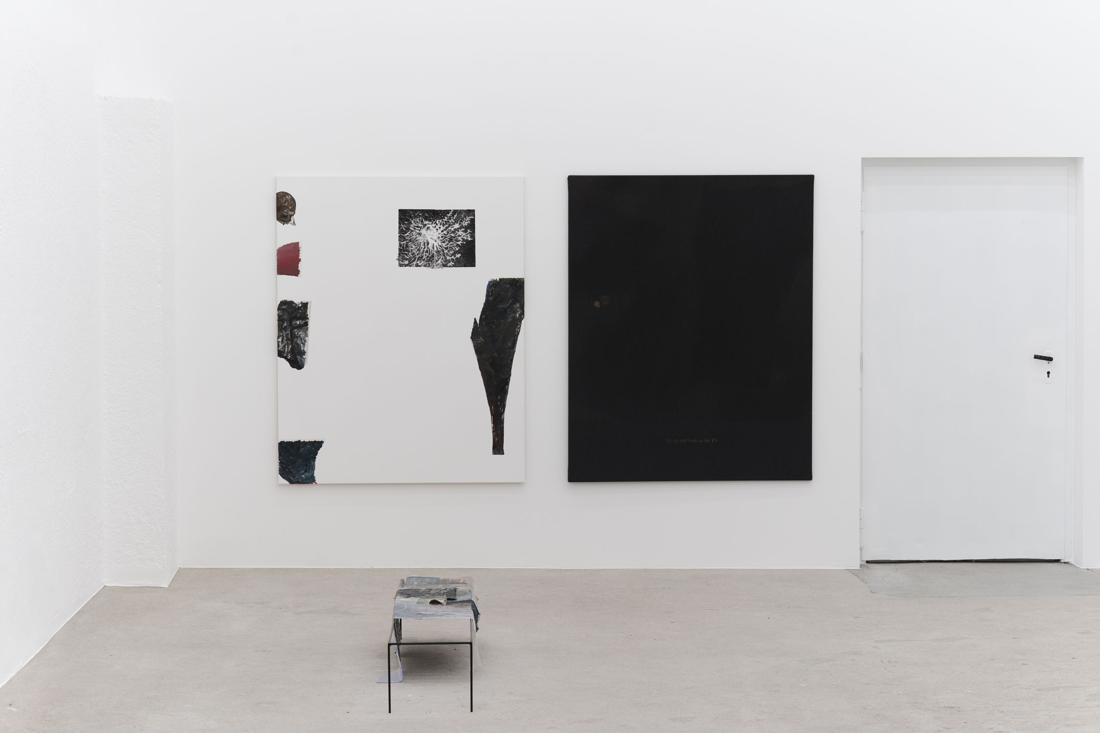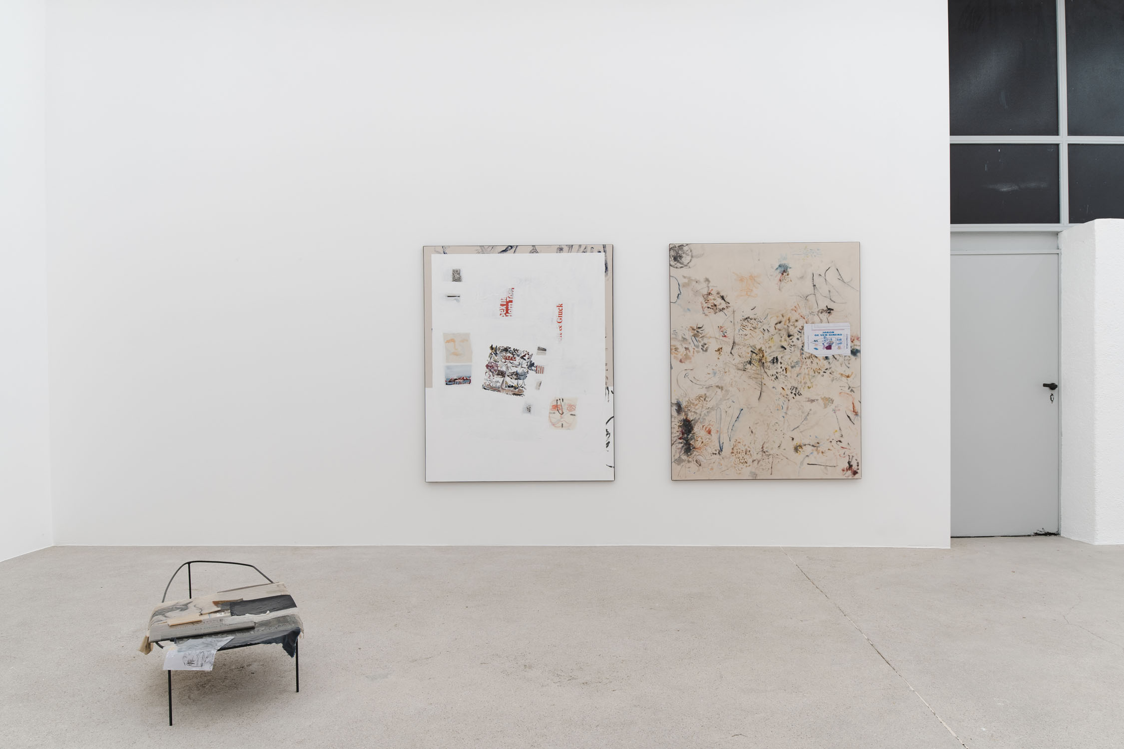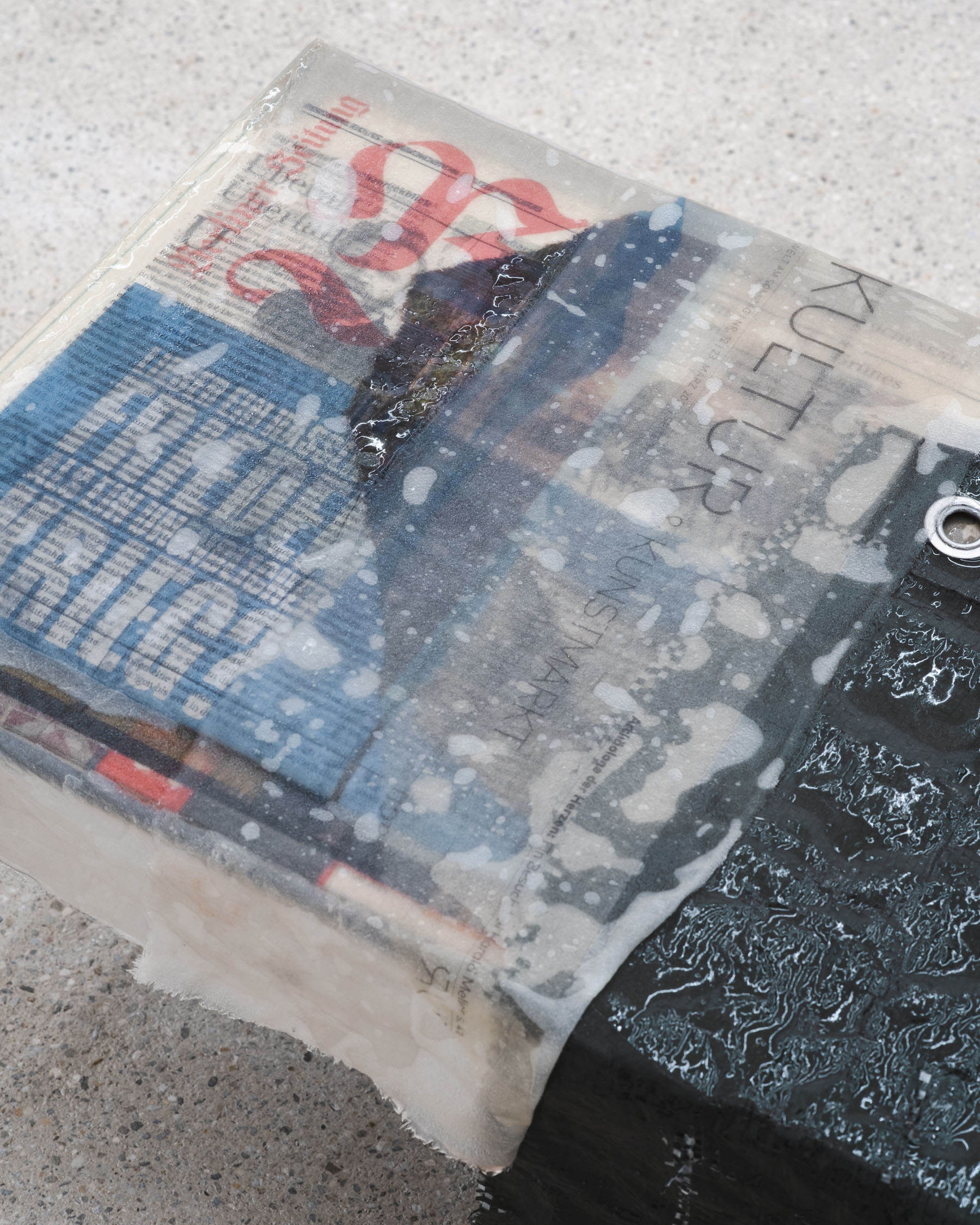 During our conversation, he referred to a small book with a green cover and the accompanying exhibition at Kunstverein Nürnberg as a defining moment in his artistic development: “in tyrannis”. With Zenses, I share an interest in the same term, which I would like to explore further: Anonymity. One of our similarities is that we both think, relate and engage by looking at streets, parks, the waste economy, hunger, poverty and possible forms of upcycling, sharing and connecting. His sculptural forms made from fabric and found materials reflect the uncanny positioning of figures in the gallery space. These forms, similar in size to human bodies, remind me of the silenced, muted and unseen crowds, the underdogs, the people on the street. One can identify with them when walking alone on windy nights in Berlin. In another of his paintings we read: “- Because that is what you are.”