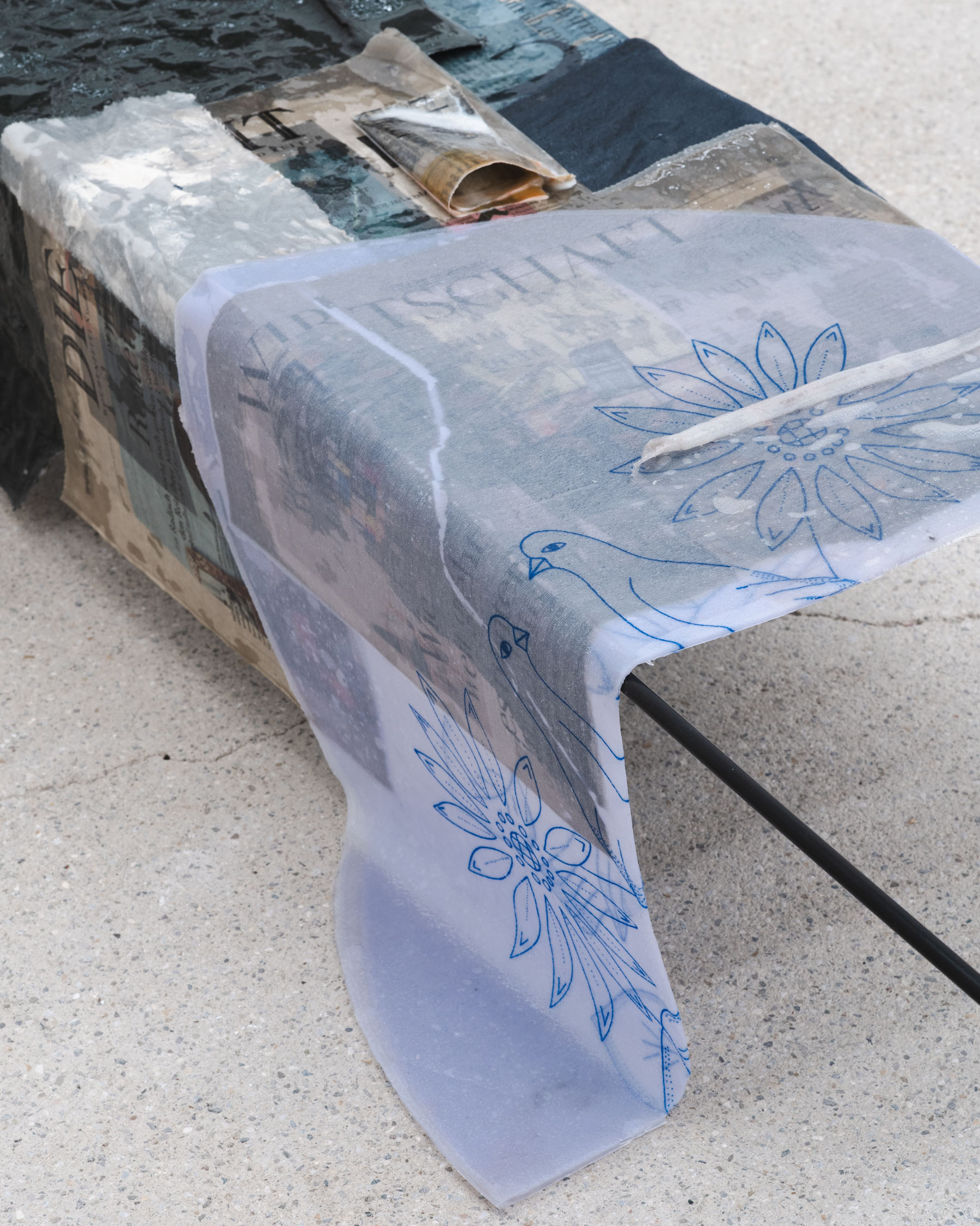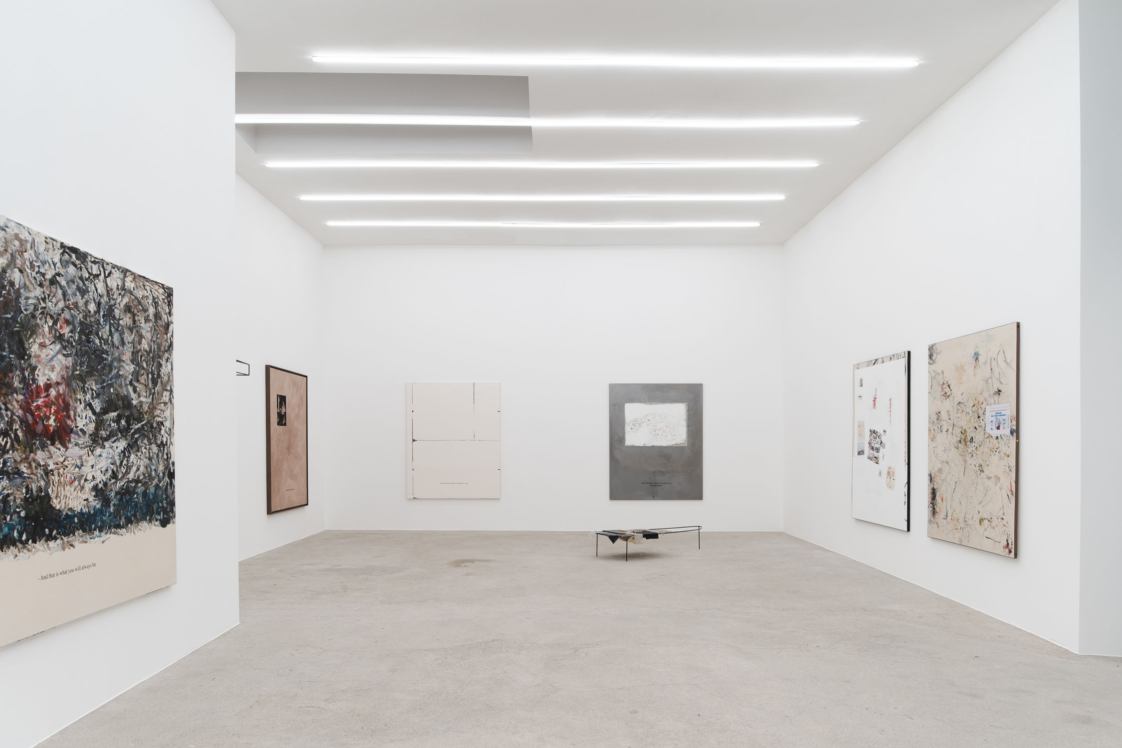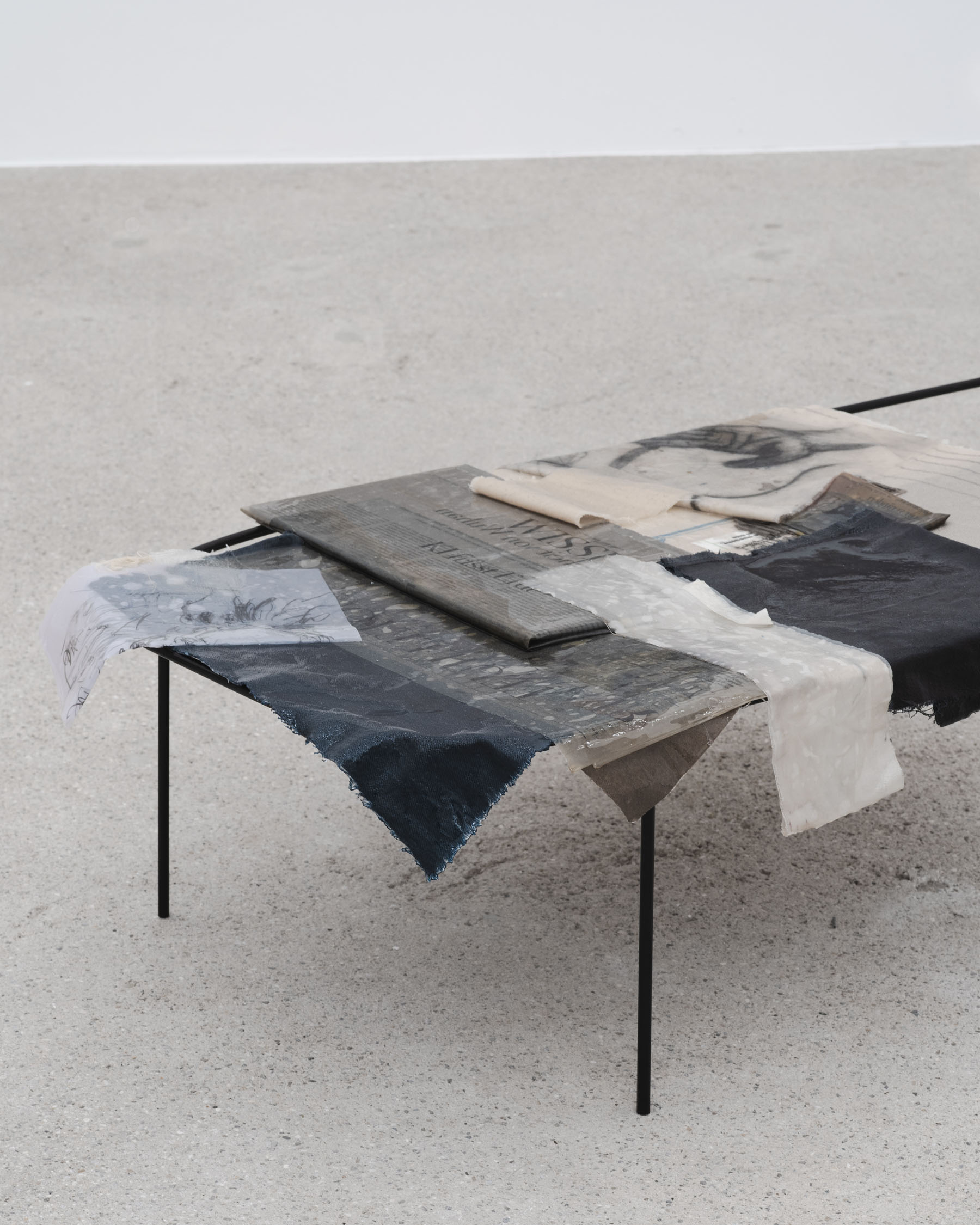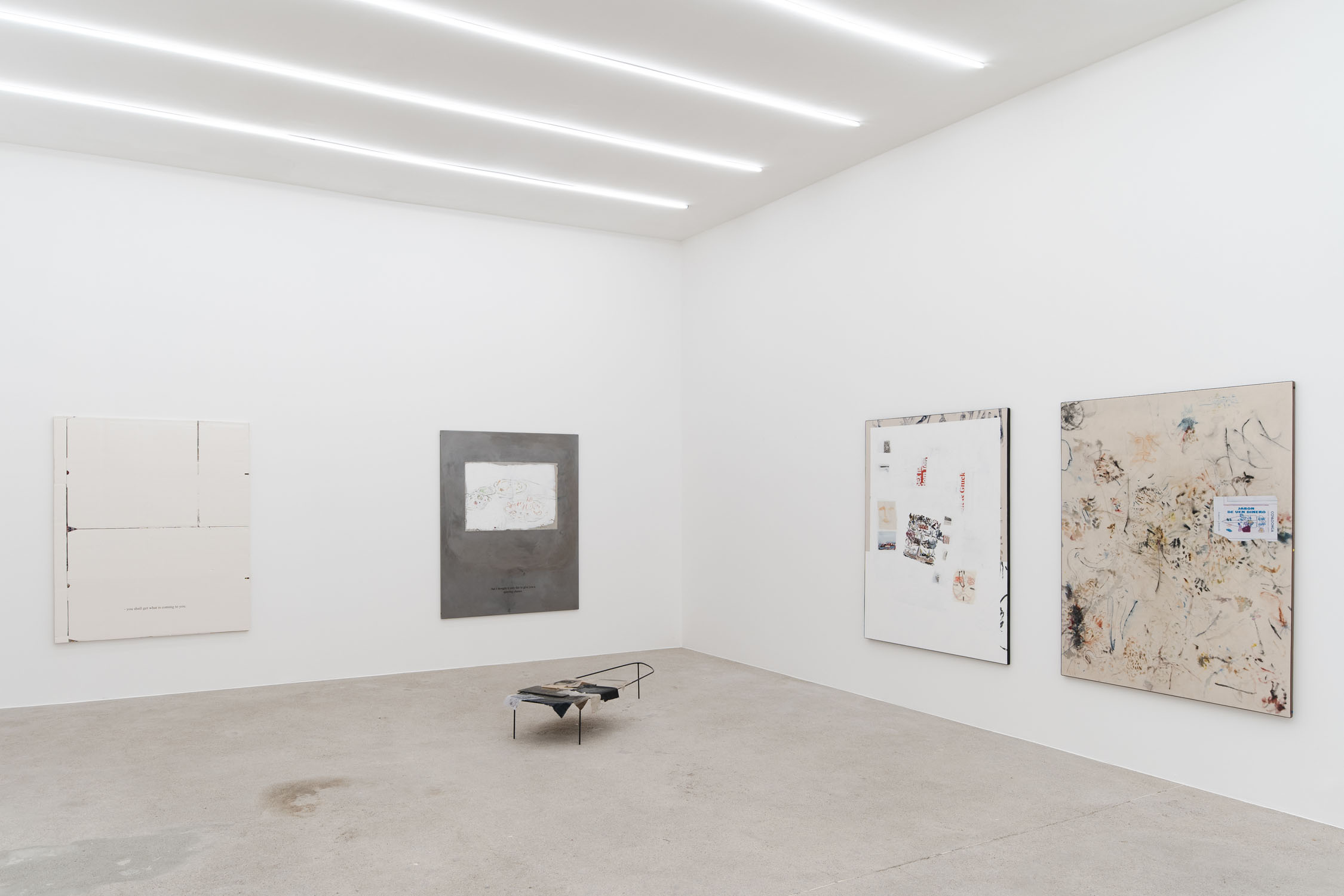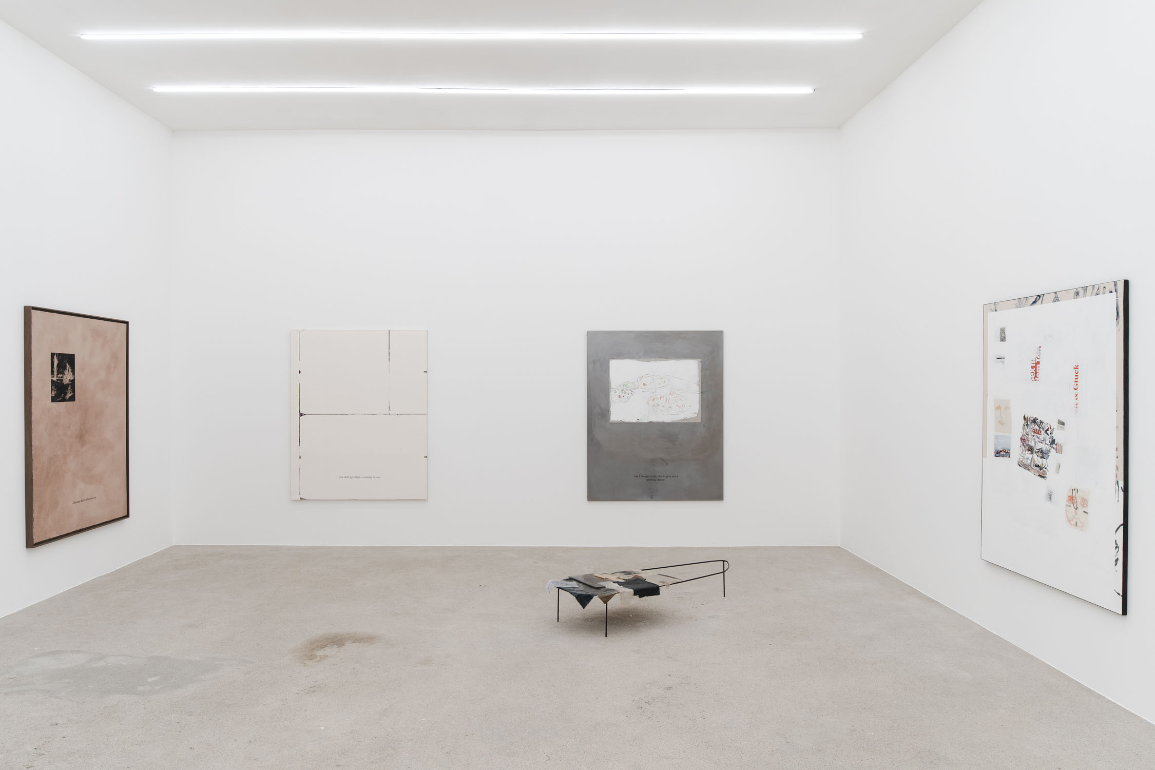 During our conversation, he referred to a small book with a green cover and the accompanying exhibition at Kunstverein Nürnberg as a defining moment in his artistic development: “in tyrannis”. With Zenses, I share an interest in the same term, which I would like to explore further: Anonymity. One of our similarities is that we both think, relate and engage by looking at streets, parks, the waste economy, hunger, poverty and possible forms of upcycling, sharing and connecting. His sculptural forms made from fabric and found materials reflect the uncanny positioning of figures in the gallery space. These forms, similar in size to human bodies, remind me of the silenced, muted and unseen crowds, the underdogs, the people on the street. One can identify with them when walking alone on windy nights in Berlin. In another of his paintings we read: “- Because that is what you are.”