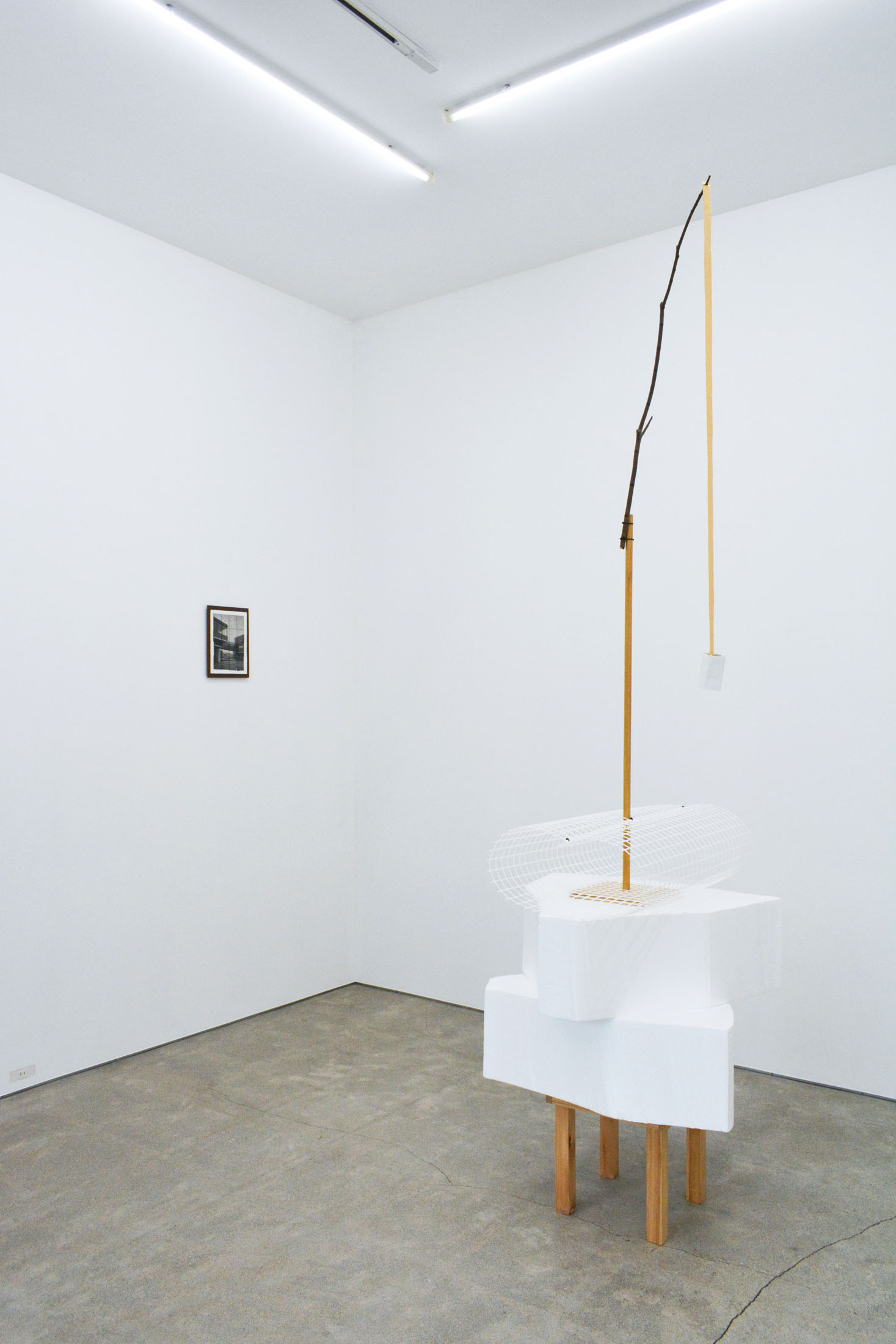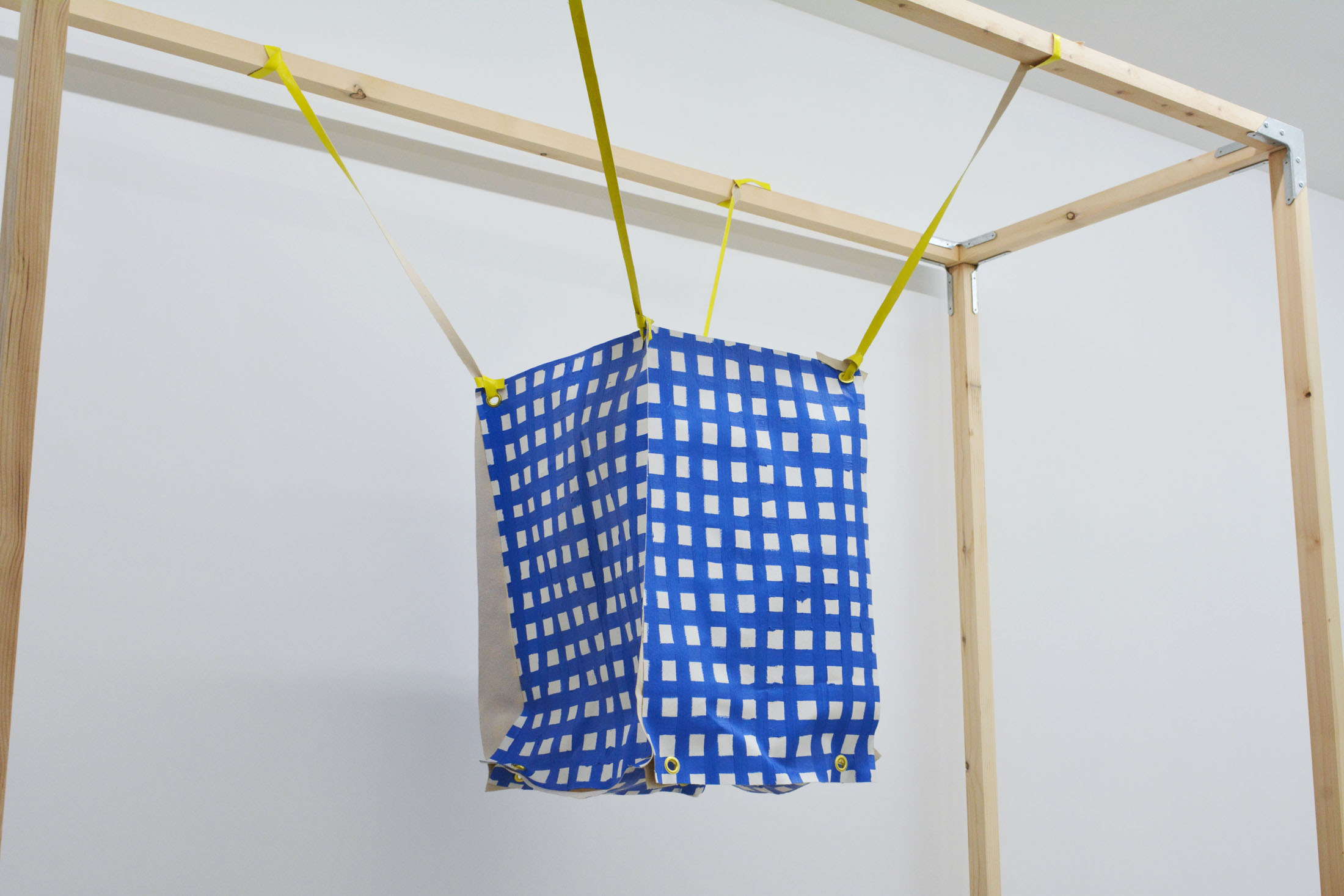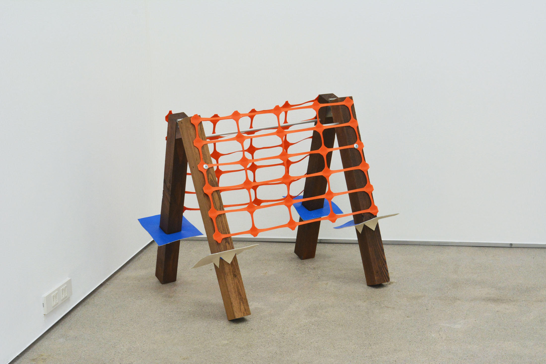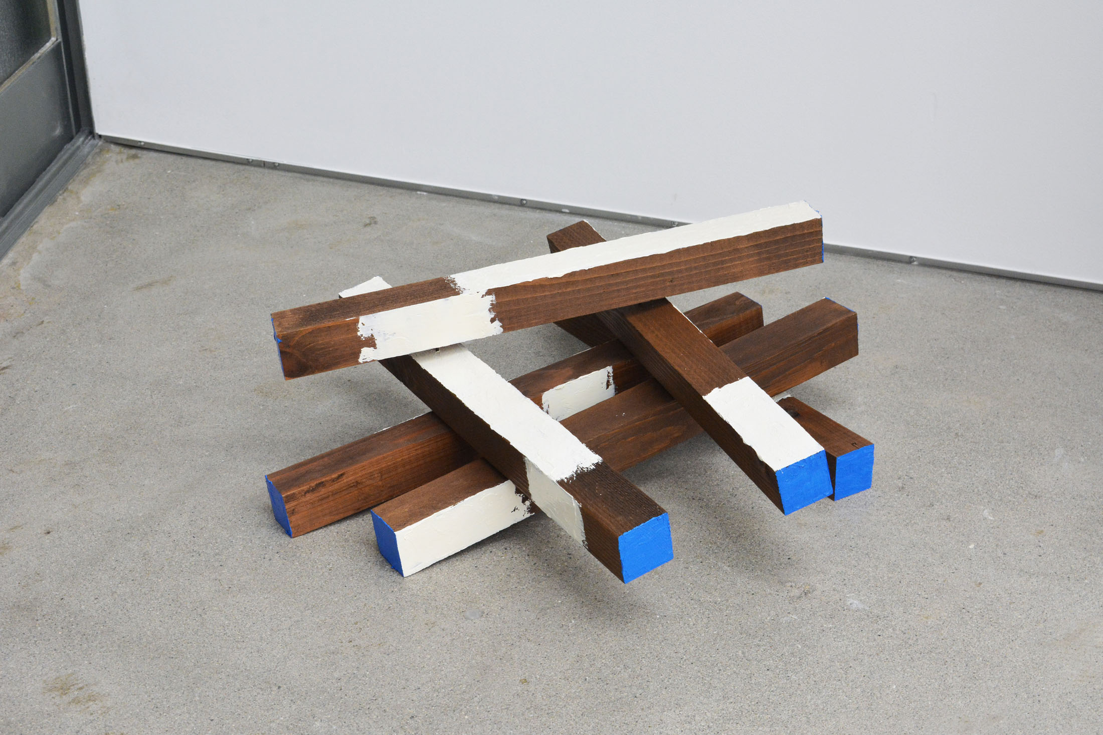 Maoya Kishi creates a wide range of works, including sculptures and installations, using materials such as timber, construction supplies, blue tarps, styrofoam, and LED signboards—elements that, on their own, have no inherent meaning. These materials are assembled with minimal alteration in a simple manner. As viewers, we instinctively attempt to discern the artist’ s intentions or decipher what the work is meant to represent, but such efforts often prove futile. Instead, we find ourselves simply dumbfounded, facing the work itself and wondering, “What exactly is this?”