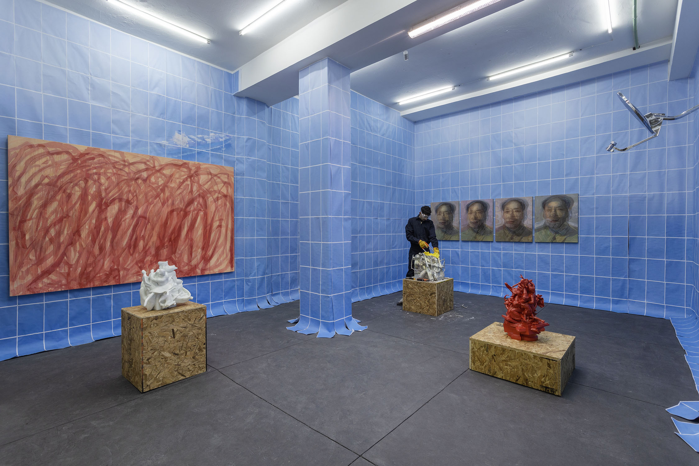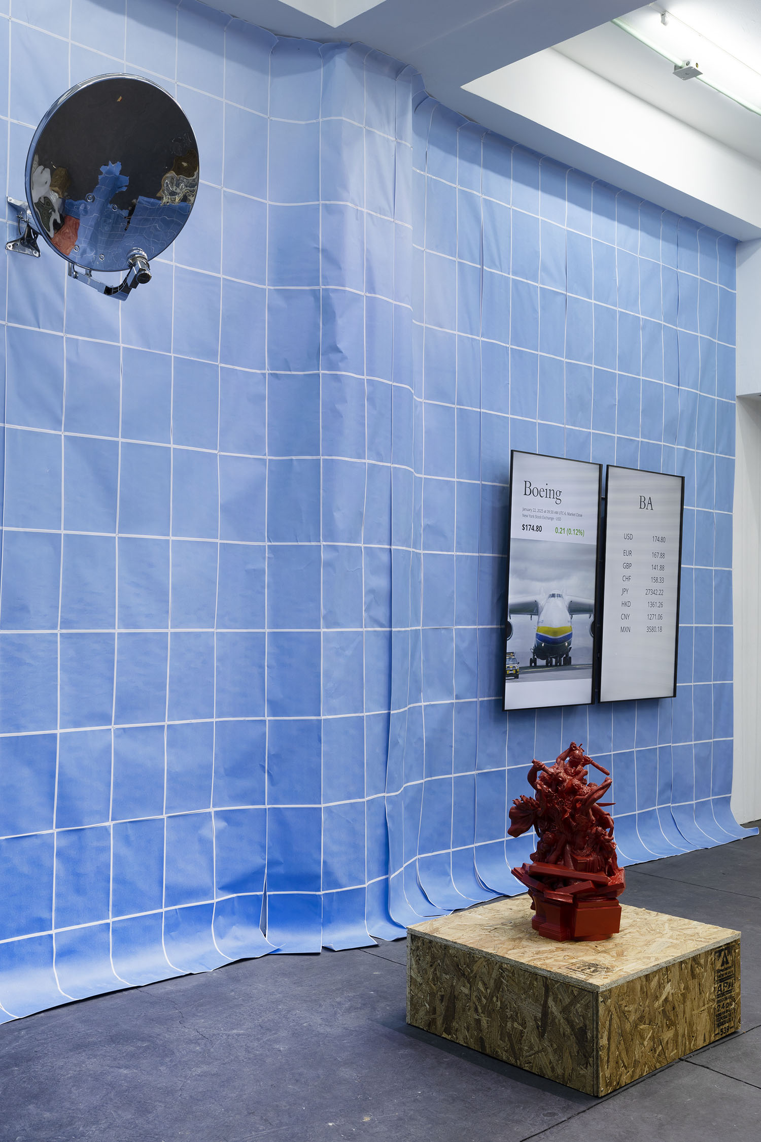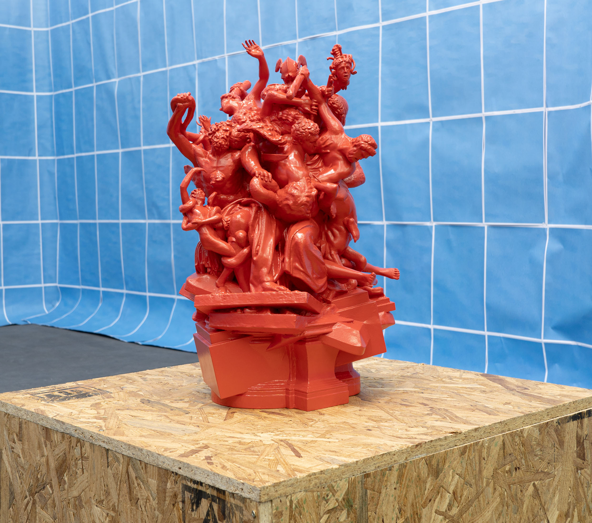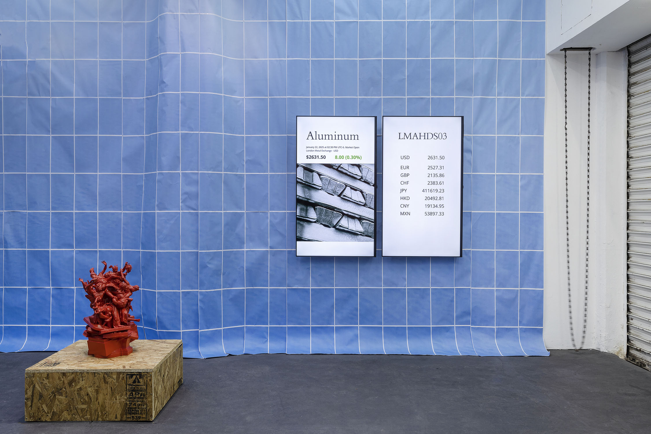 Wolfryd’s works are stacks of meaning, of techniques, mythologies and representations: they are modeled in software, outsourcing their manufacture while simulating manual labor, they embrace semantic multiplicity and ‘contextual collapse’. Their insistent repetition blurs the forms contained in them, they are as recognizable as they are elusive and absent, empty containers ready to be filled by ‘futures’. They float, prophetic, in the infinite blue sea of exchange, in which anything can happen: tariff war, nuclear war, the Chinese Century—all of the above.