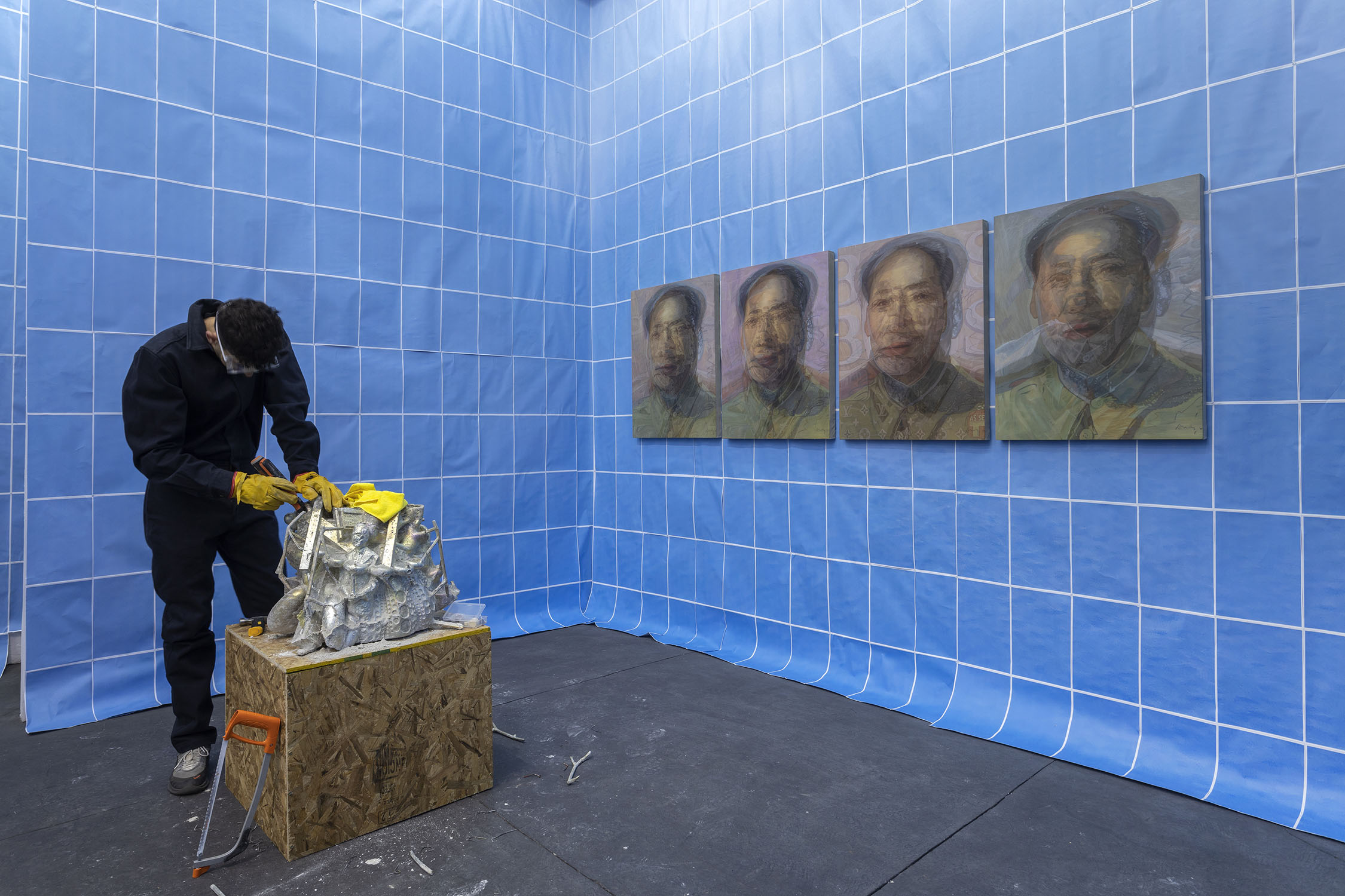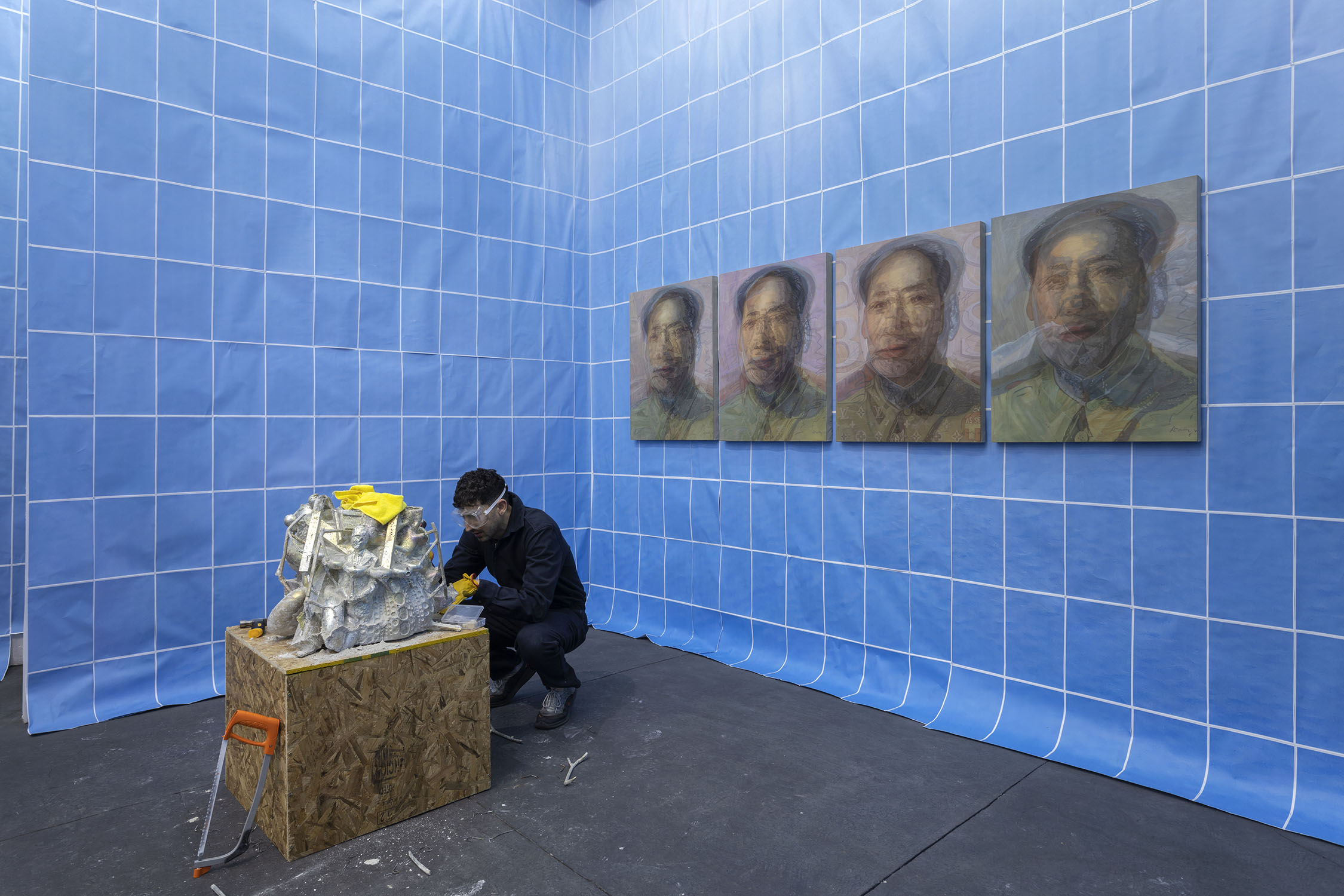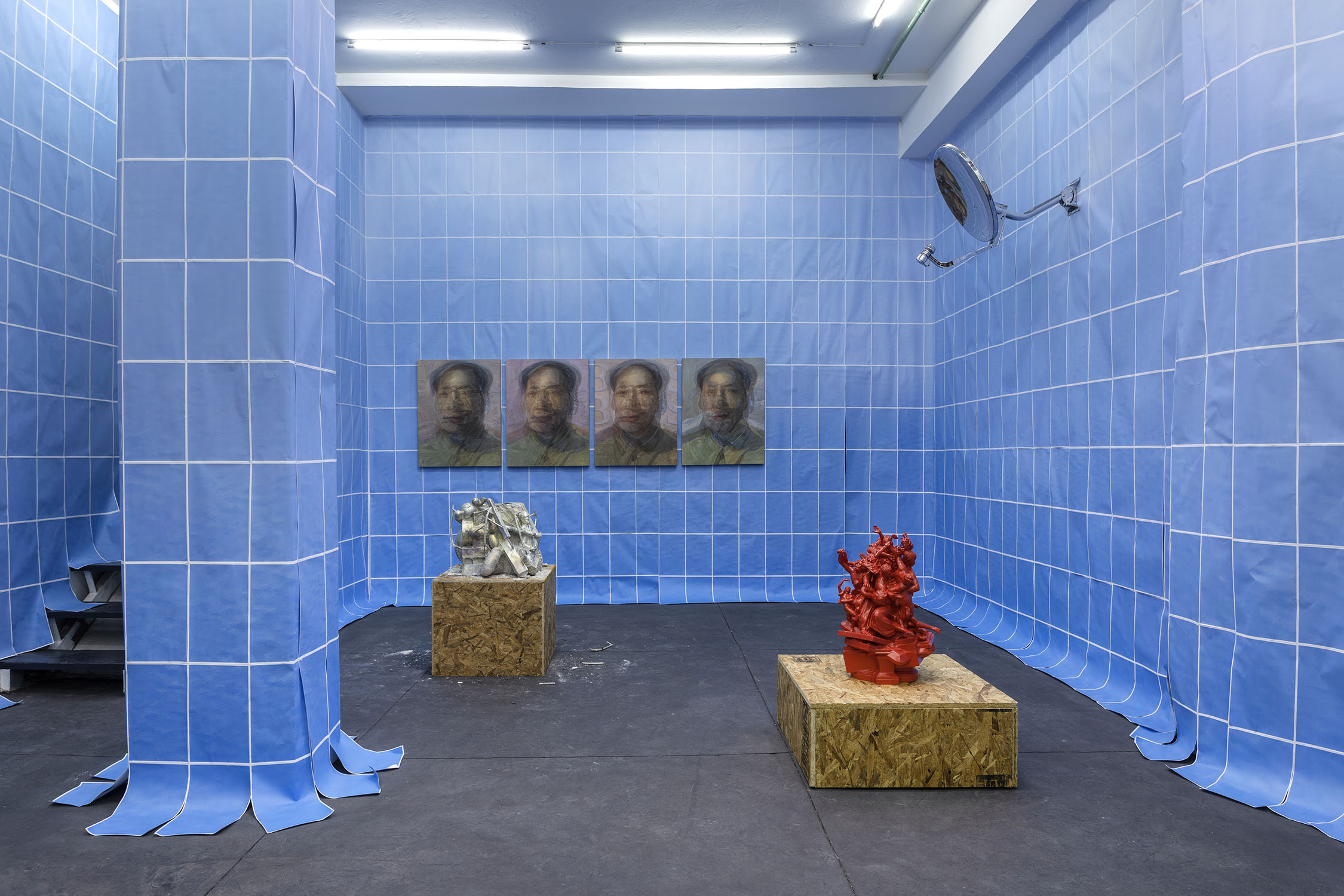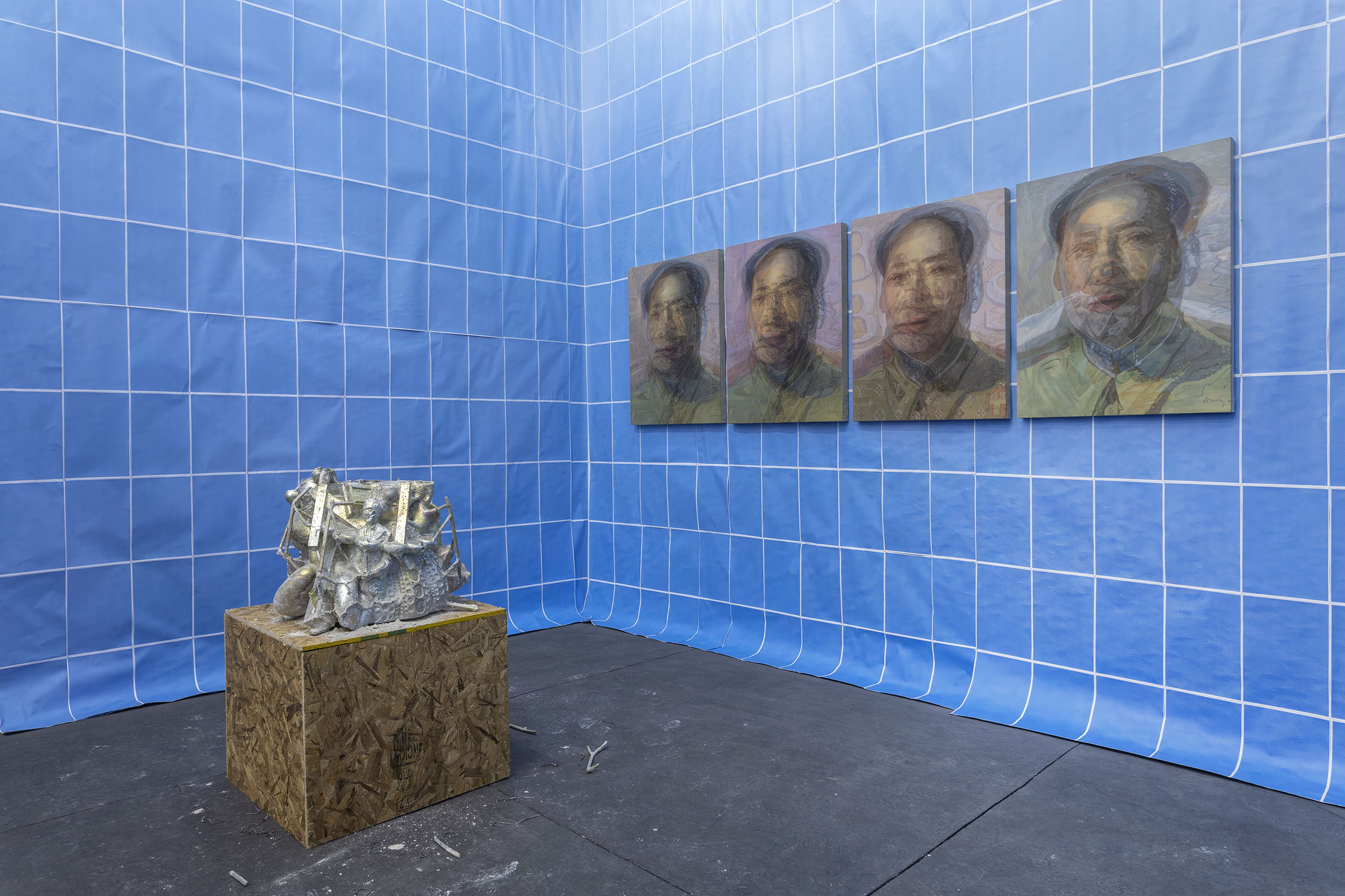Wolfryd’s works are stacks of meaning, of techniques, mythologies and representations: they are modeled in software, outsourcing their manufacture while simulating manual labor, they embrace semantic multiplicity and ‘contextual collapse’. Their insistent repetition blurs the forms contained in them, they are as recognizable as they are elusive and absent, empty containers ready to be filled by ‘futures’. They float, prophetic, in the infinite blue sea of exchange, in which anything can happen: tariff war, nuclear war, the Chinese Century—all of the above.