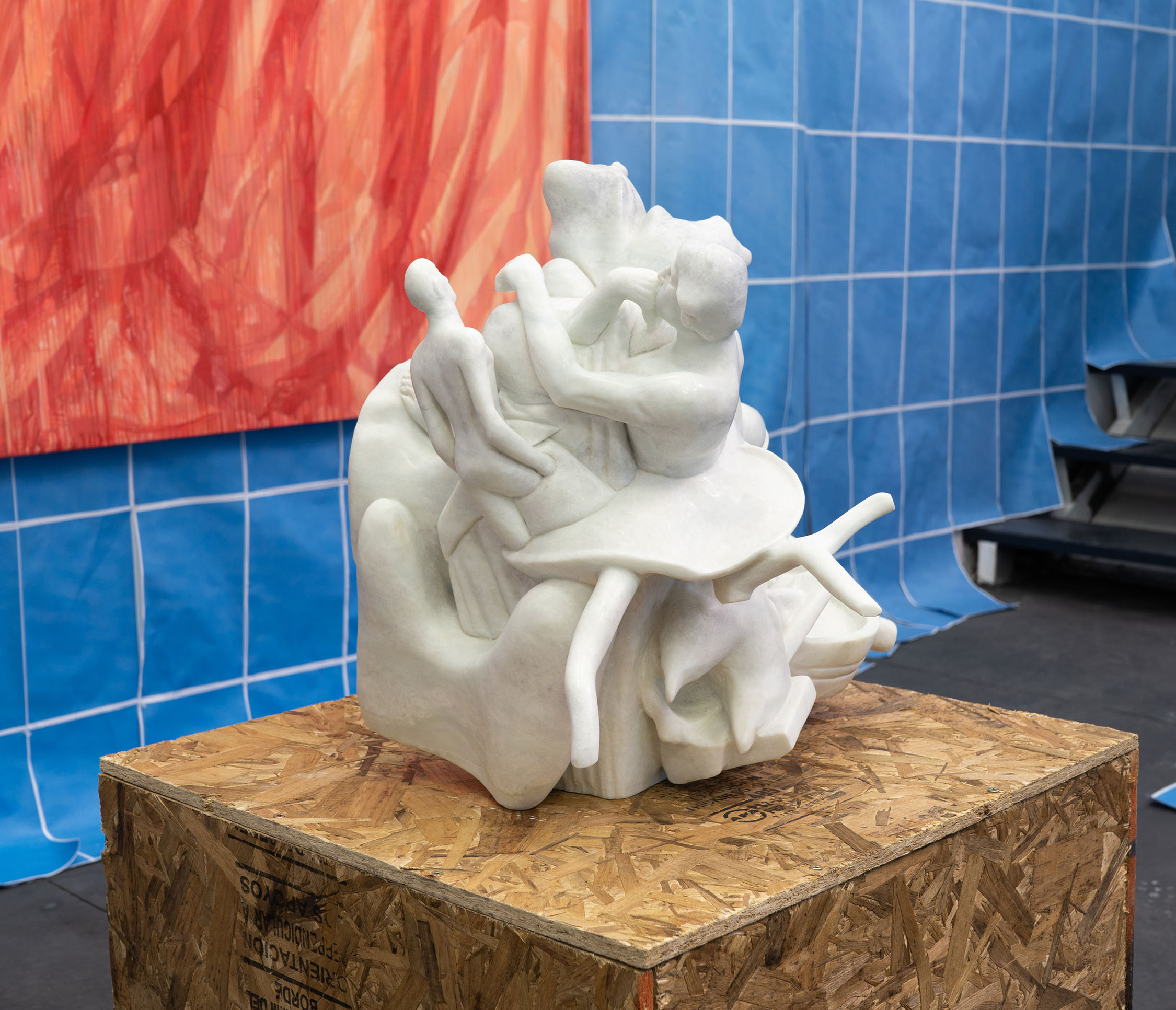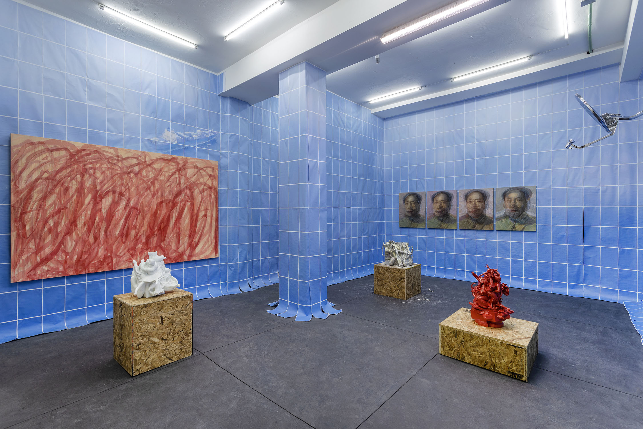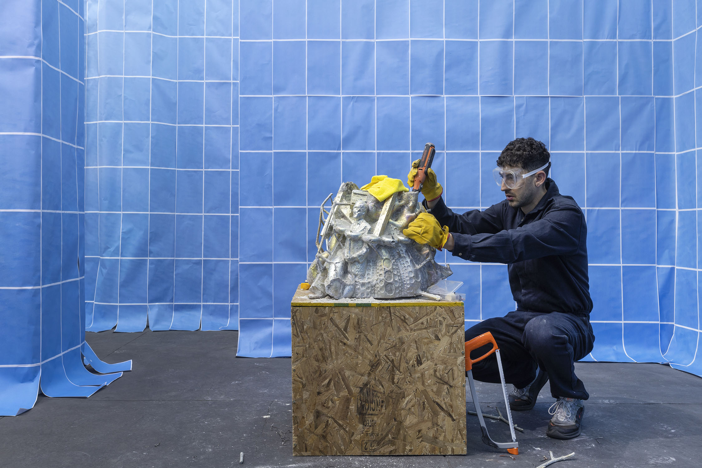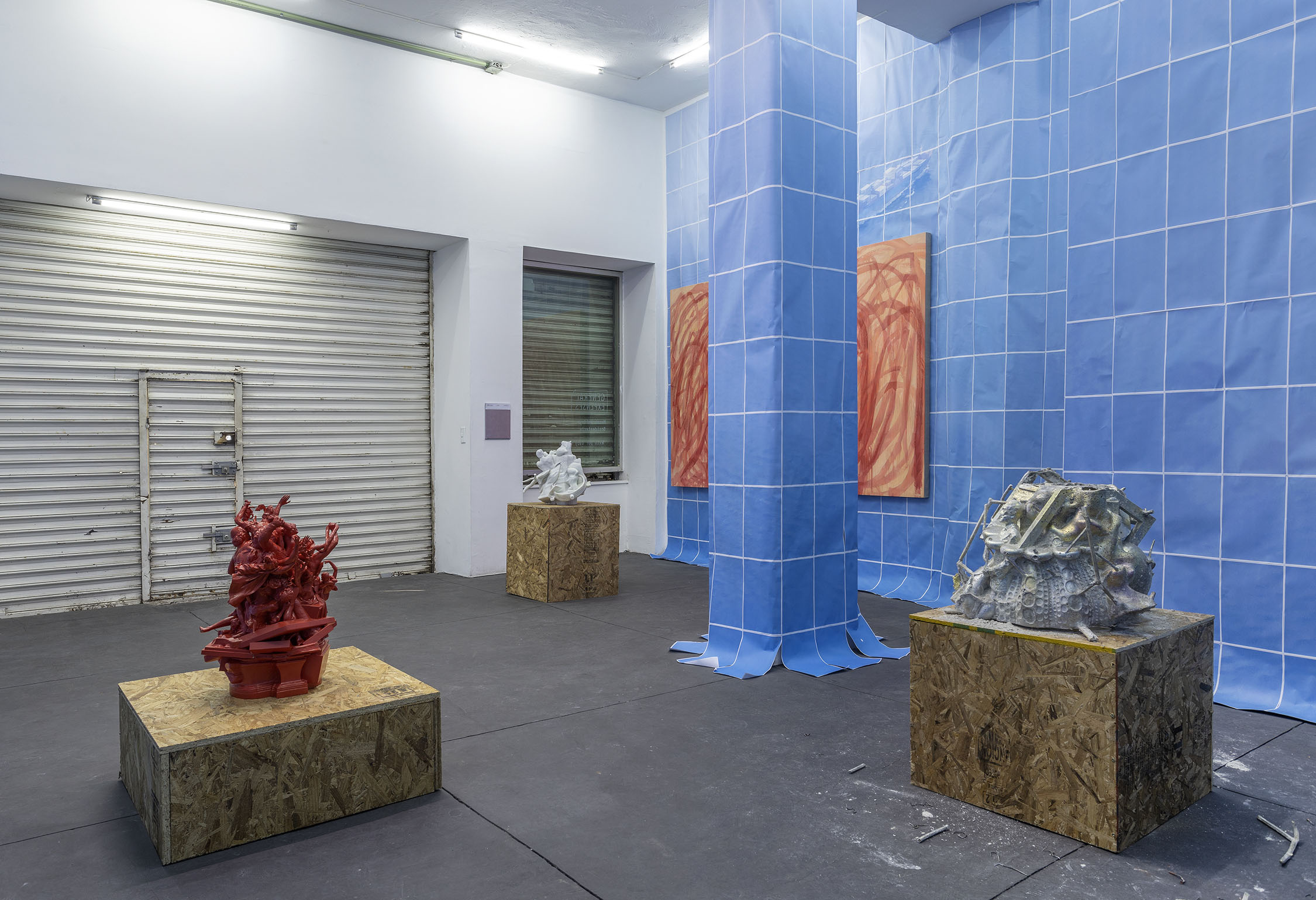 Wolfryd’s works are stacks of meaning, of techniques, mythologies and representations: they are modeled in software, outsourcing their manufacture while simulating manual labor, they embrace semantic multiplicity and ‘contextual collapse’. Their insistent repetition blurs the forms contained in them, they are as recognizable as they are elusive and absent, empty containers ready to be filled by ‘futures’. They float, prophetic, in the infinite blue sea of exchange, in which anything can happen: tariff war, nuclear war, the Chinese Century—all of the above.