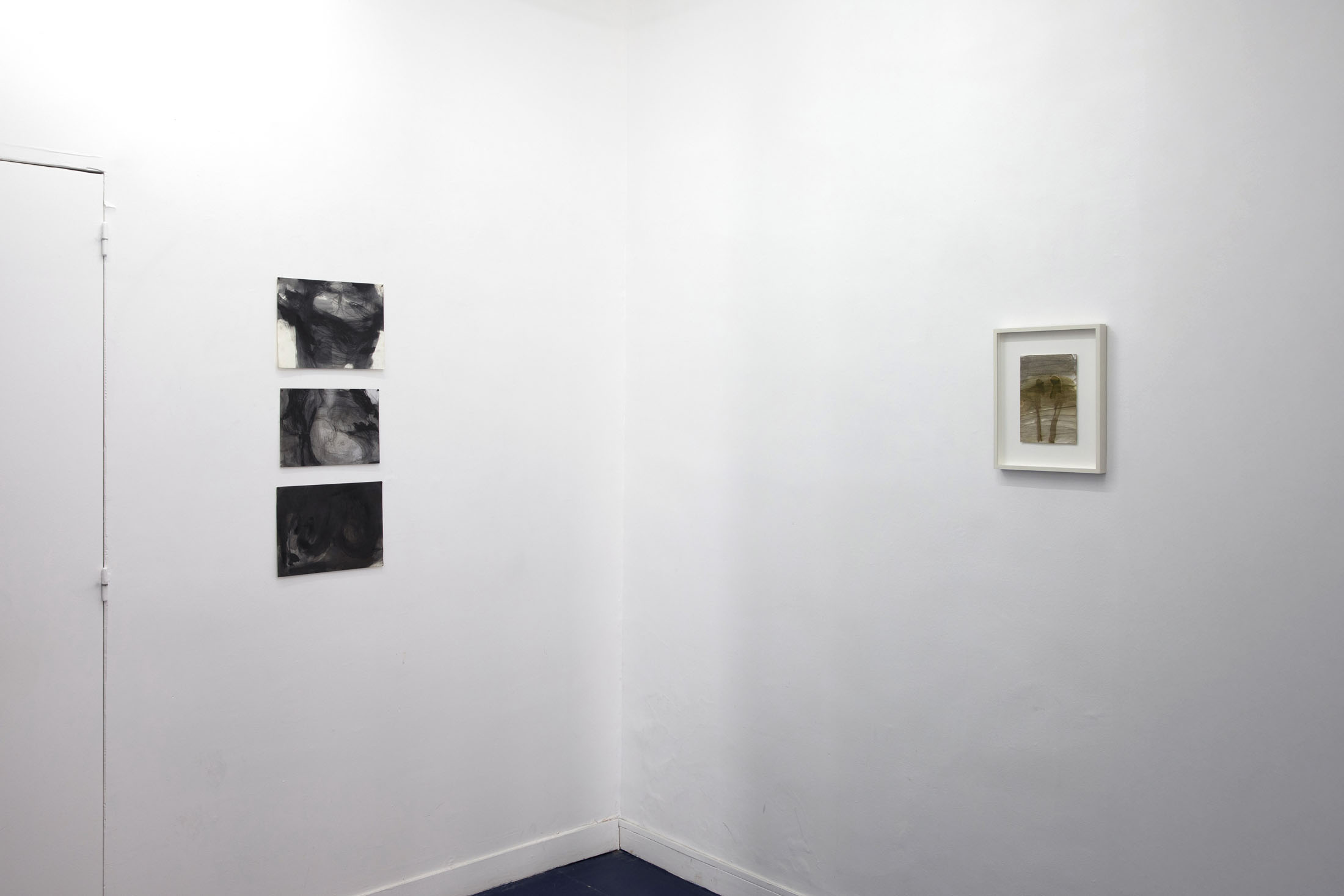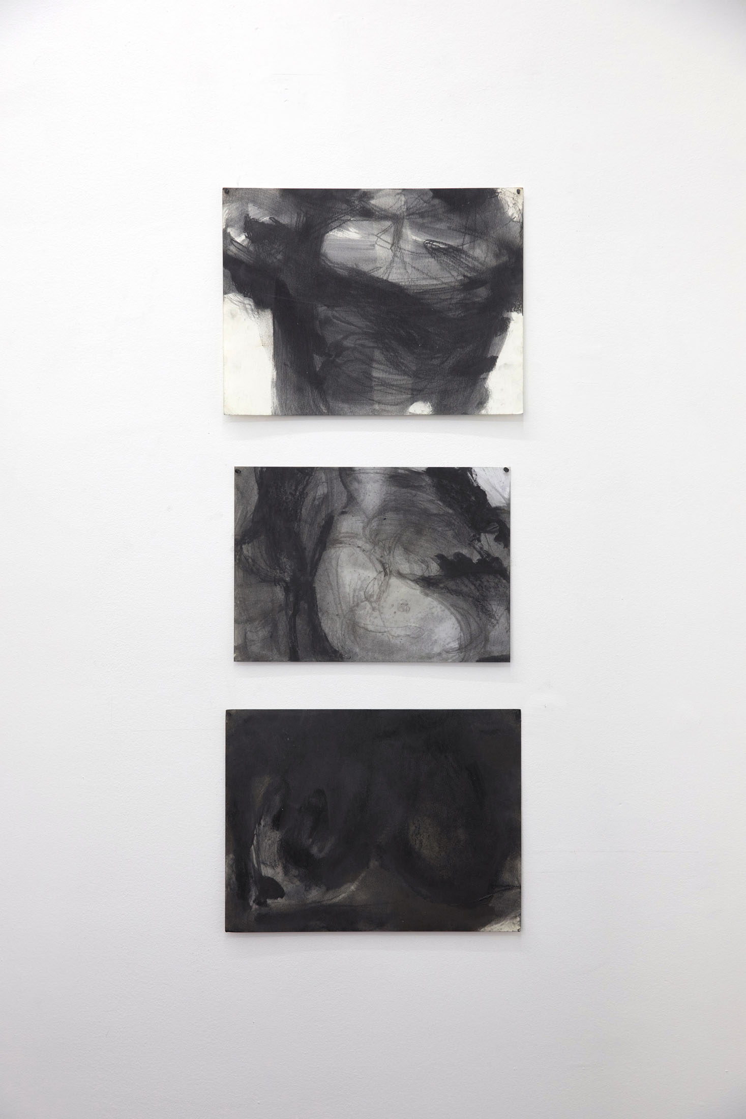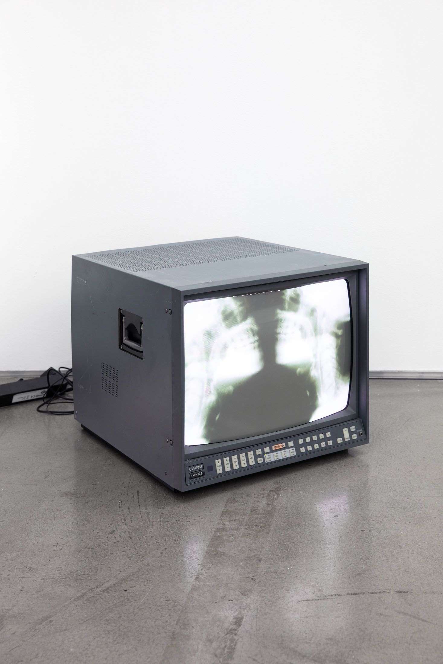 While Meyer depicts the fragility of organic and cellular systems, and Hammer preserves them by limiting herself to a “skeletal” representation, both artists nevertheless introduce the idea of fatality. Sixteen years after the making of Sanctus, Hammer was diagnosed with incurable ovarian cancer, raising questions about the harmful effects of radioactive imaging. Meyer’s paintings display bodies in perpetual mutation, inevitably evoking natural and biological cycles. The Pelvis series (nos. 30, 41, 33, 27, 52, Girl) conveys this (de)gradation through different states of the subject matter: while some papers perspire successive layers of oil, others are essentially carbonic (Girl). The exhibition thus introduces the image of the “carrion-body”, where the organic decays and only the carcass remains. Entitled Sanctus, the film evokes the duality between science and religion. For the medical field, sanctus means “in good health”, recalling the adage Mens sana in corpore sano. In the Book of Revelation, however, it becomes a call to prayer to the Lord Sabaoth, the celestial god of the night. This religious reference resonates with the analog score created by Neil Rolnick, which brings together the Sanctus section of five different composers. Like a danse macabre, skeletons move to the rhythm of experimental prayers. This mesmerizing and erotic choreography continues in Tarp, a work inspired by Holbein’s Death’s Apparitions (1785)2, where a skeleton, a funereal emissary, captures two lovers in an embrace with the sweep of a sheet.