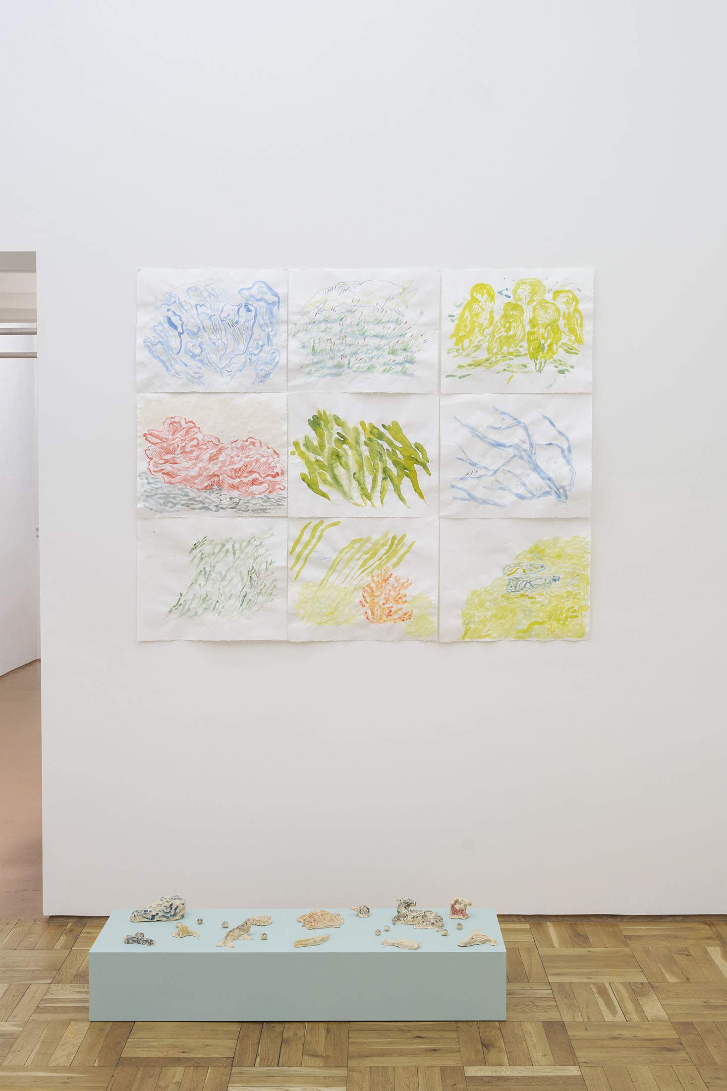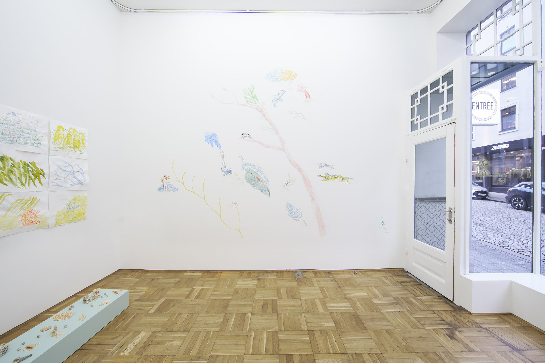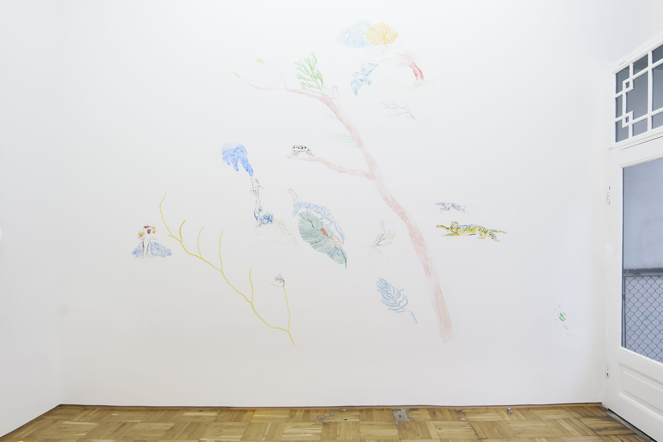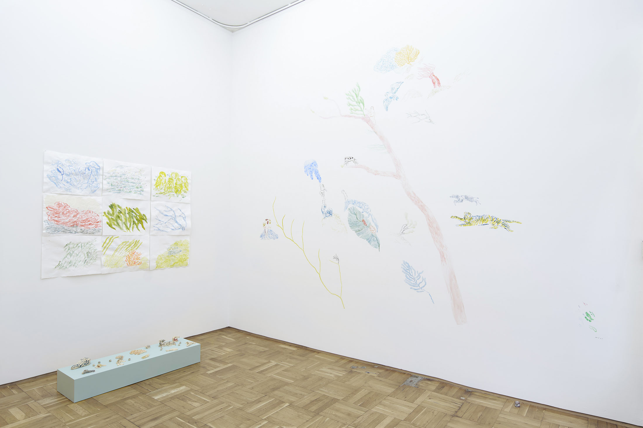 Through pencil drawings and watercolours, wall paintings and ceramic figures, she lets improvisation and the flow of drawing shape intricate universes that one can dive into – and lose oneself within. The works consists of organic compositions that address the loss of nature and belonging, both for animals and humans.