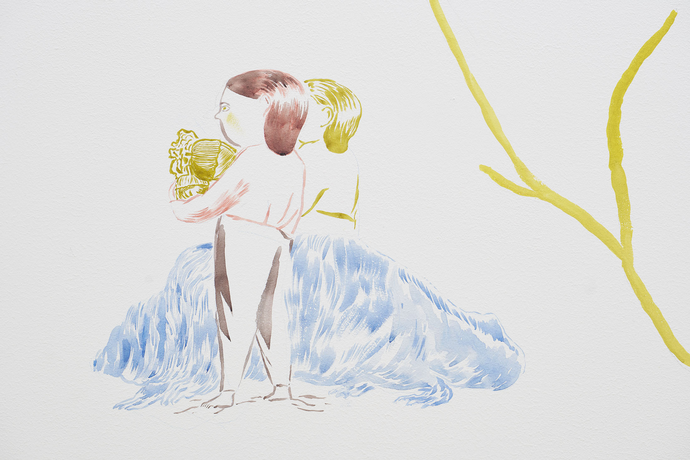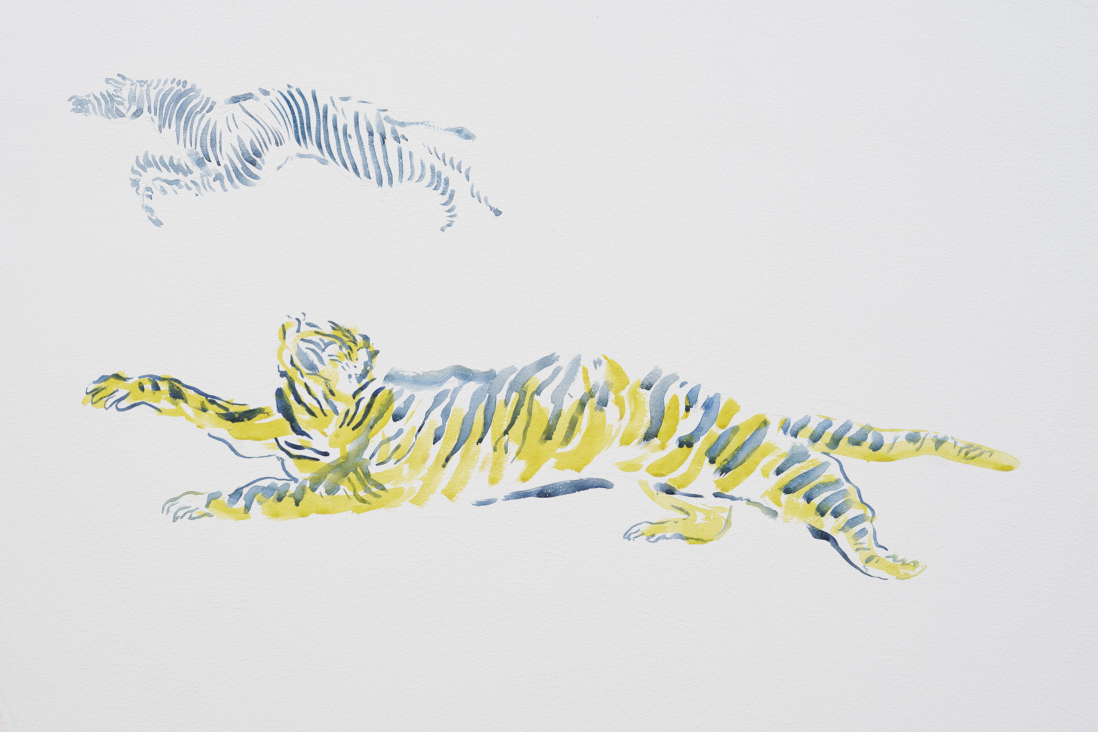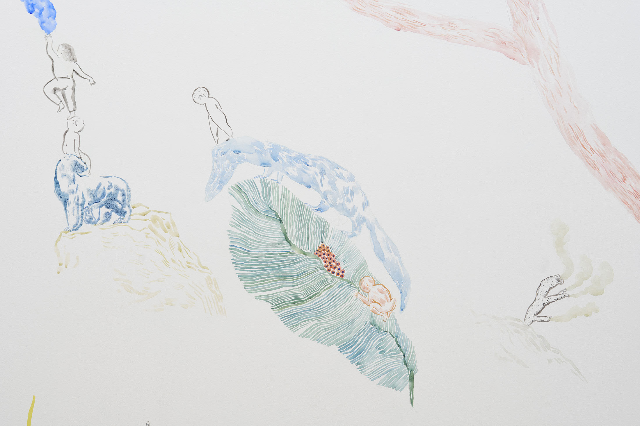 Through pencil drawings and watercolours, wall paintings and ceramic figures, she lets improvisation and the flow of drawing shape intricate universes that one can dive into – and lose oneself within. The works consists of organic compositions that address the loss of nature and belonging, both for animals and humans.