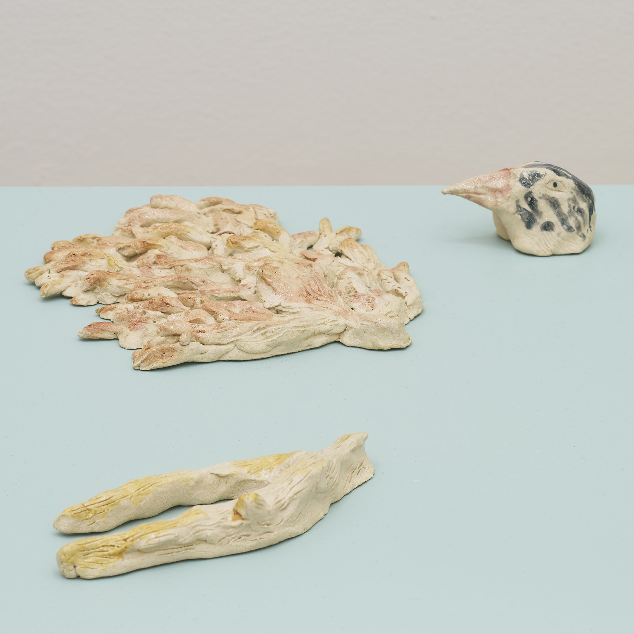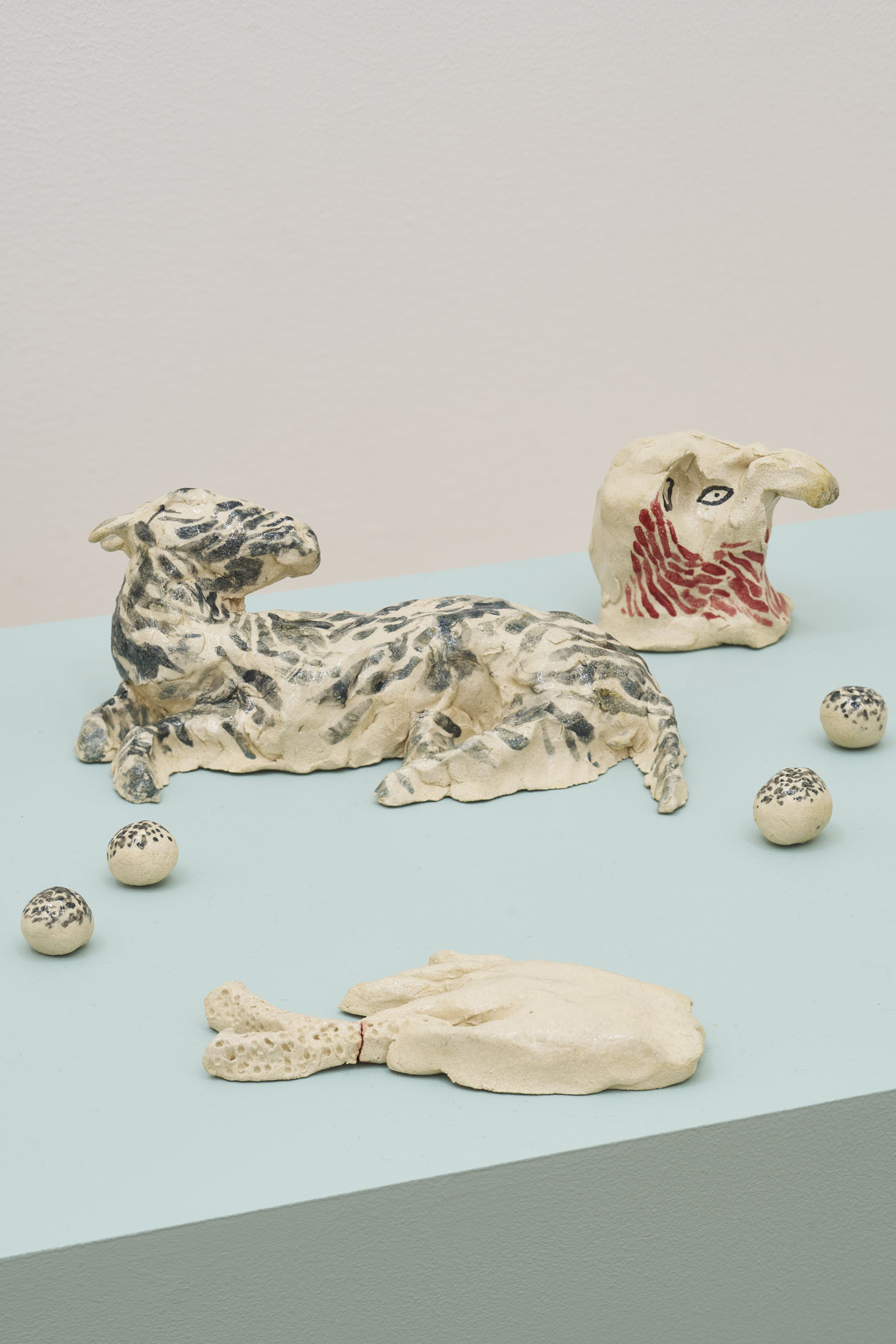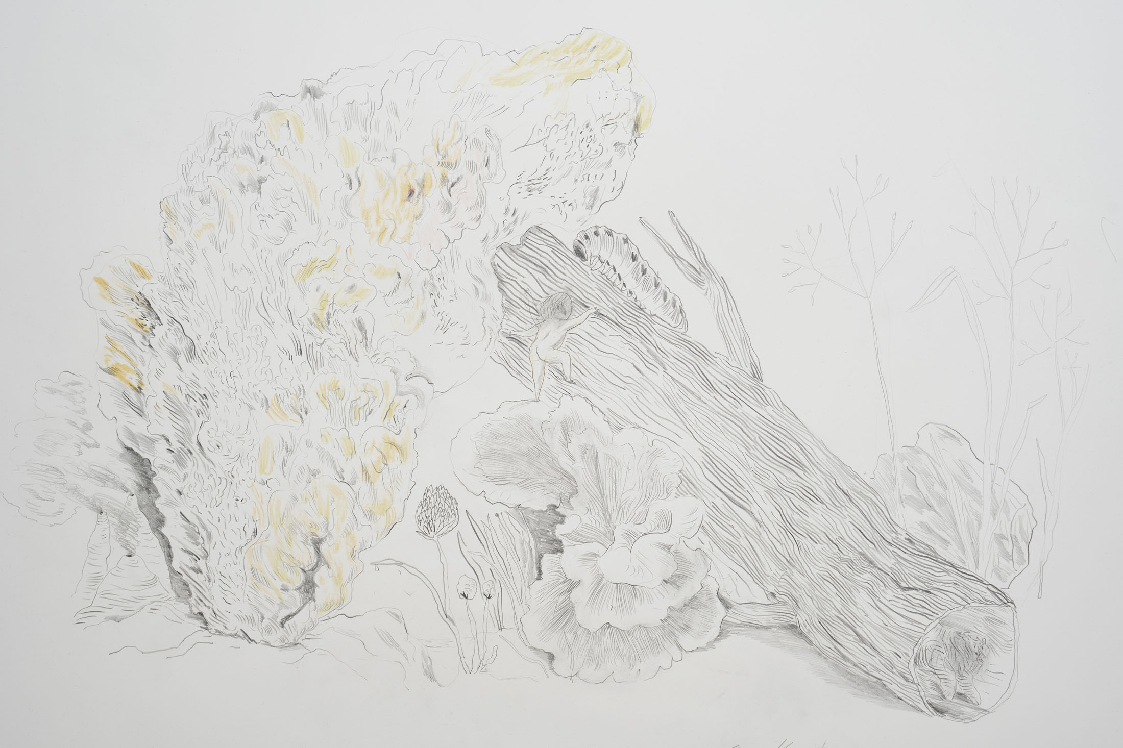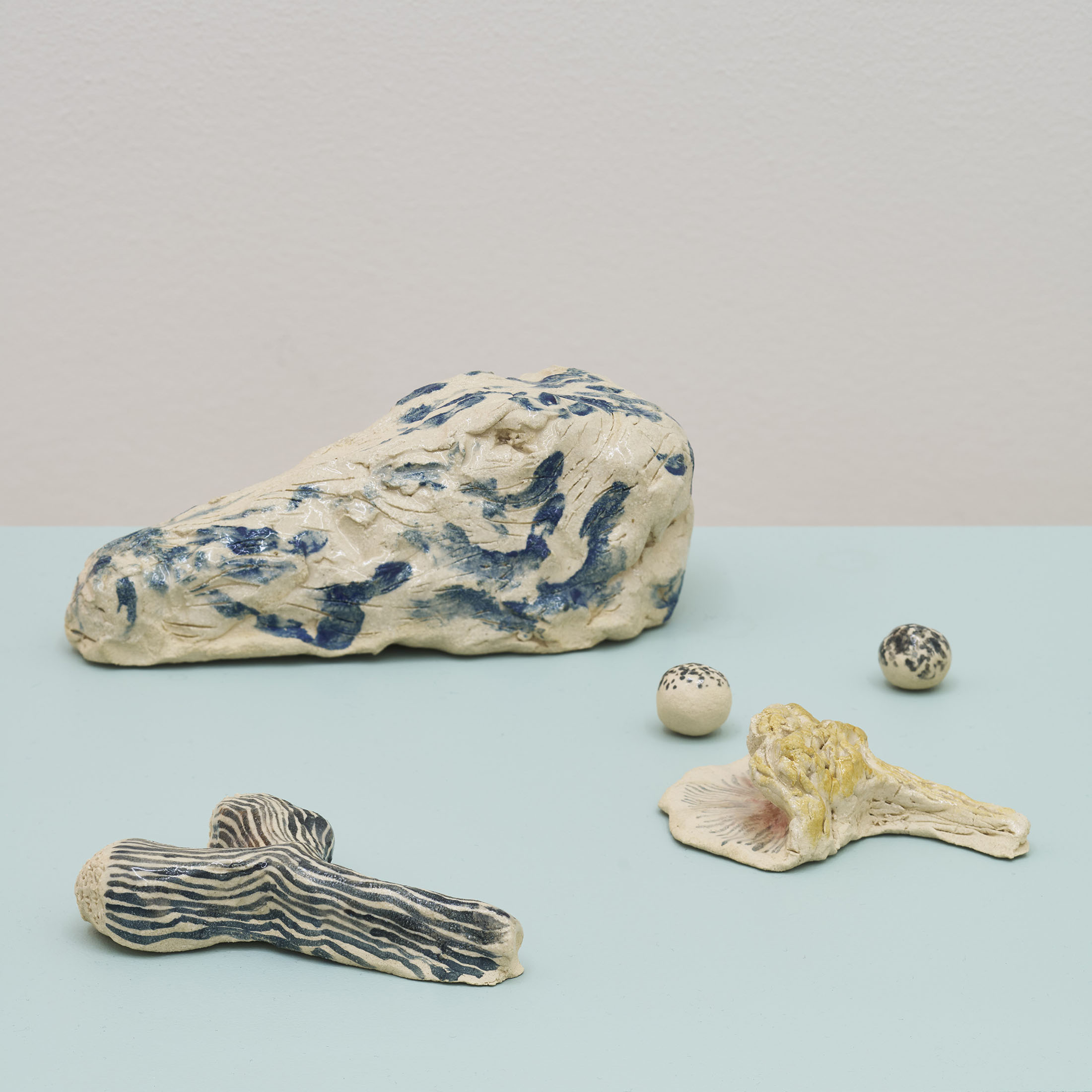Through pencil drawings and watercolours, wall paintings and ceramic figures, she lets improvisation and the flow of drawing shape intricate universes that one can dive into – and lose oneself within. The works consists of organic compositions that address the loss of nature and belonging, both for animals and humans.