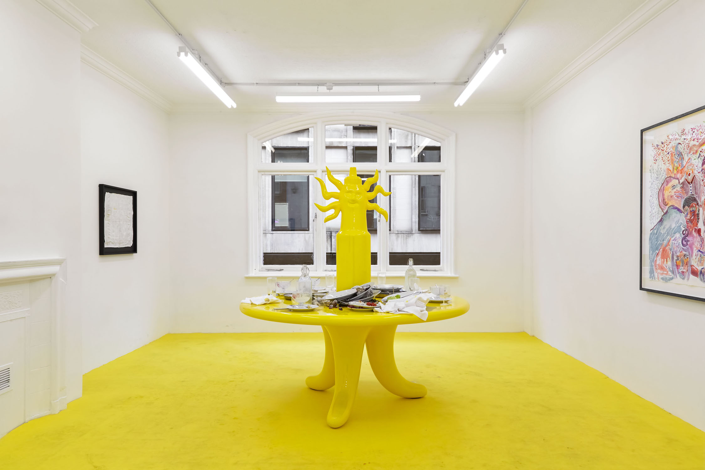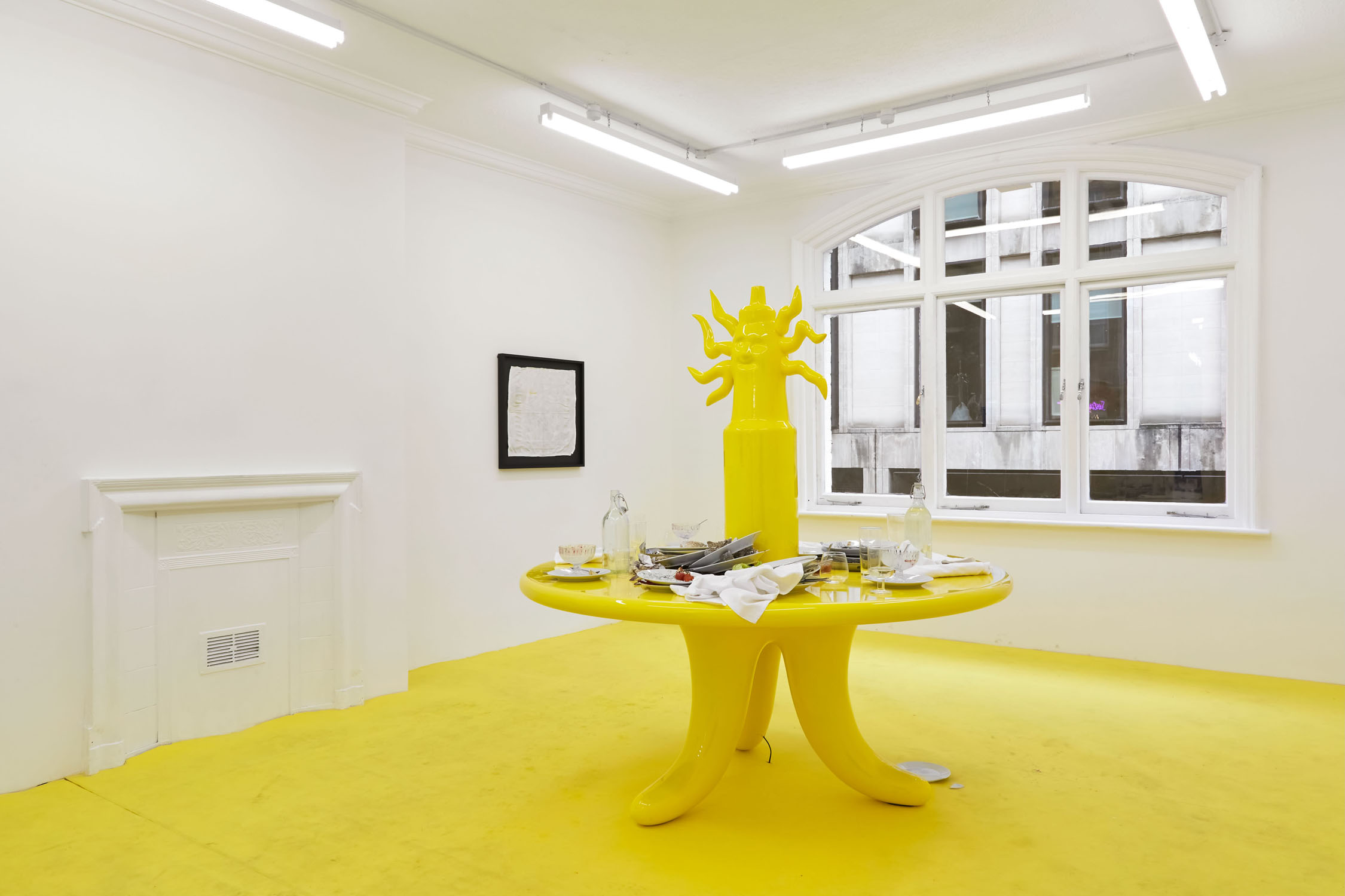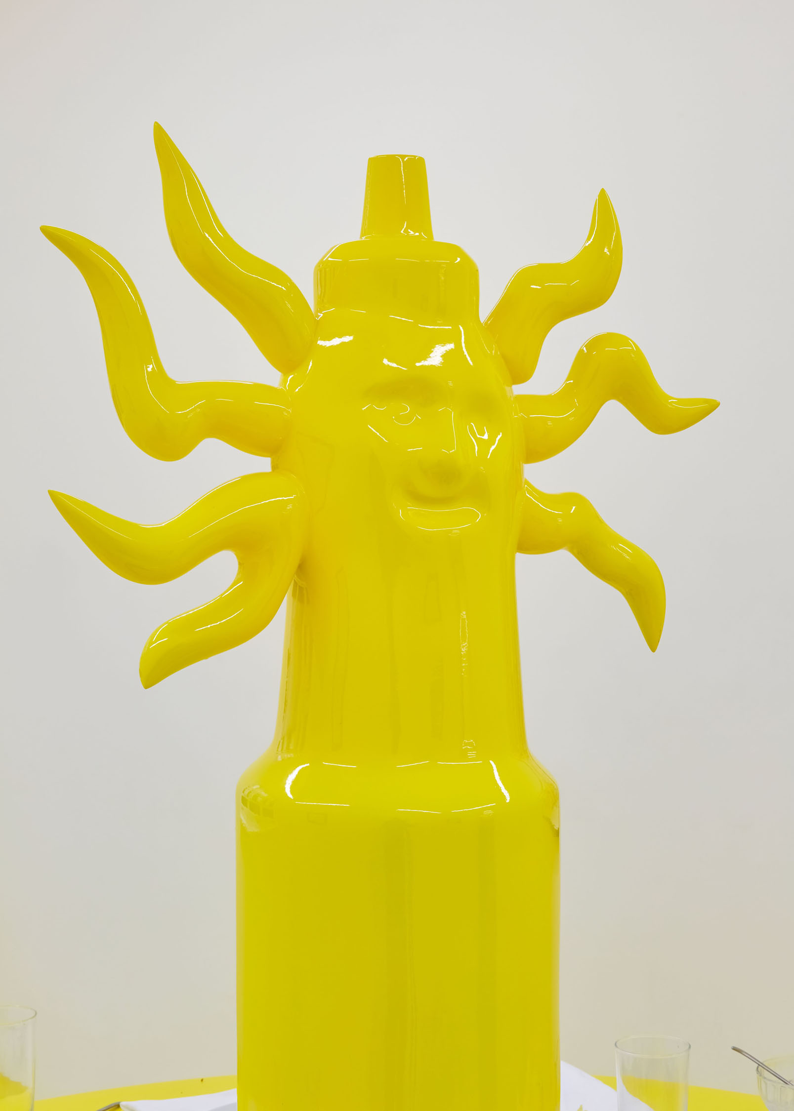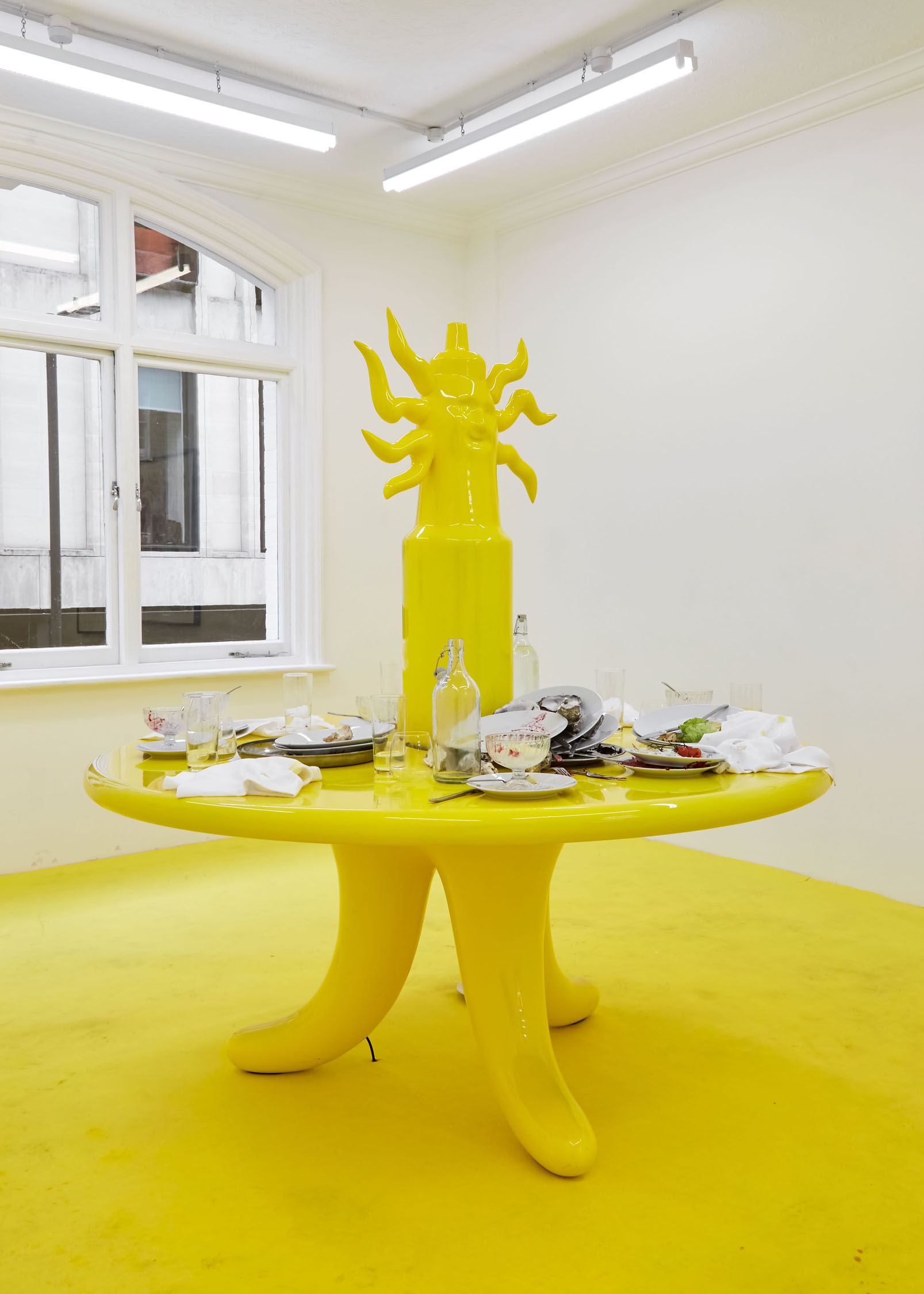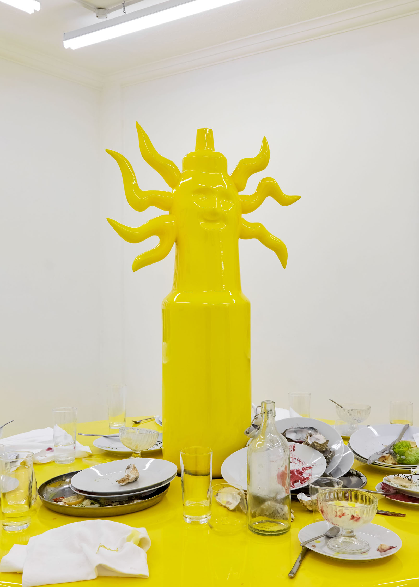 Maria Metsalu gives TINA and its London audience a new iteration of Kultuur, an ongoing performance work that animates a dialogue with the sun. Kultuur presents an anthropomorphised wildflower as an object of spectacle, while at the same time illuminating and complexifying some universal paradoxes of existence; the sun as something that gives life and energy, but something that can burn right through it. Metsalu confronts audiences in such a way that also scorns this spectacle, and the performance offers a moment of reflection, for all involved, on participation and complicity – a collective assemblage of exchange, of ritual, of unexpected and unknowable participation. The performance begins in the street, where people witness the artist’s interactions with a ubiquitous element of urban life, the hotdog vendor. With a hypnotic candour, and with intensities varying between states of pleasure, indifference, suffering and hope, audiences are led, pied piper-like, to TINA. Here, the collective body of the audience orbit the sun – an environment collaboratively made by Metsalu and Boumjimar in the gallery space. Kultuur includes the collaboration of various other artists in its conception and production; a text written by Jaakko Pallasvuo, sound design by Artjom Astrov, outfits designed by Kris Lemsalu together with Lotte Jürjendal and CRUDACRUDA, and a range of artefacts designed and built by Nikola Knezevic and Bruno Lillemets. While Karim Boumjimar creates the food as part of Kultuur, for TINA’s edition, Boumjimar presents drawings and ceramics to accompany the event and exhibition. The invited collaborators and the audience of Kultuur are a collective body that is fed, entertained and questioned. At TINA, the performance is divided into two parts – the parade at the hot dog cart and the devouring of the Sun, table d’hôte. Kultuur is a celebration of life and its dualities – a celebration of its fleeting and sensual nature.